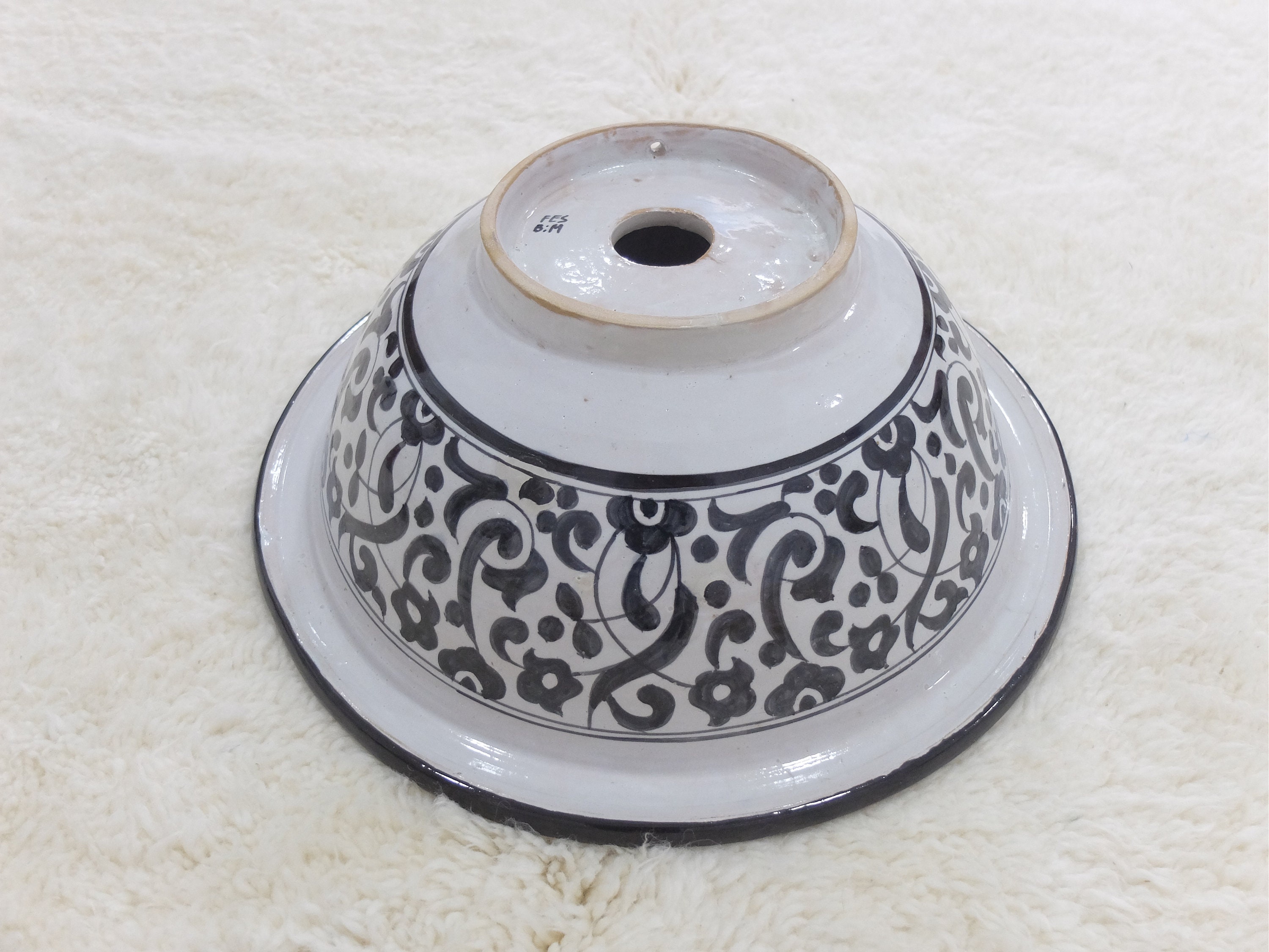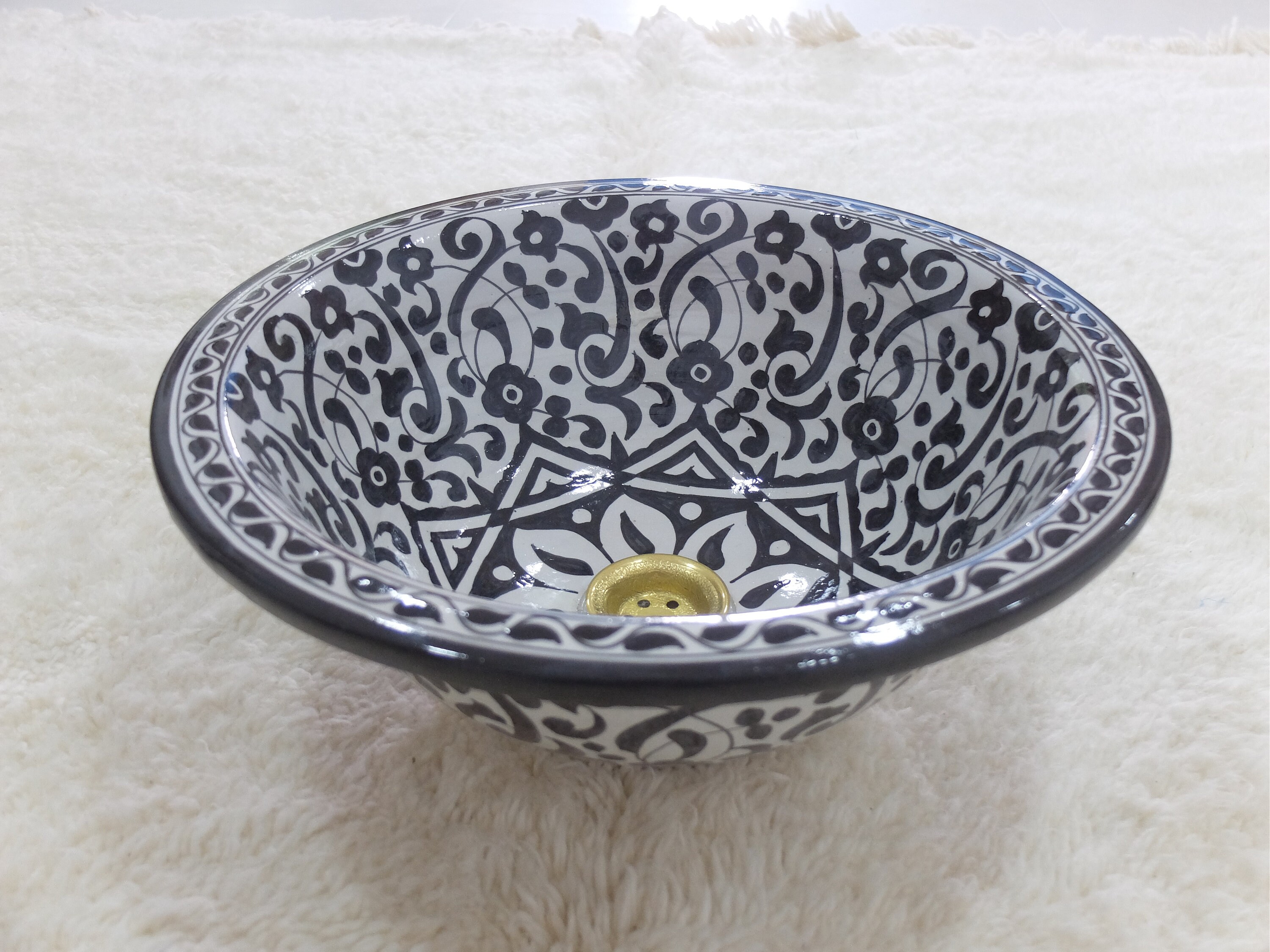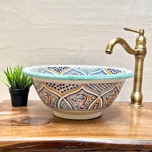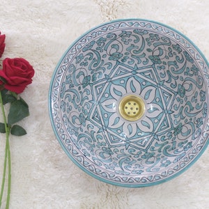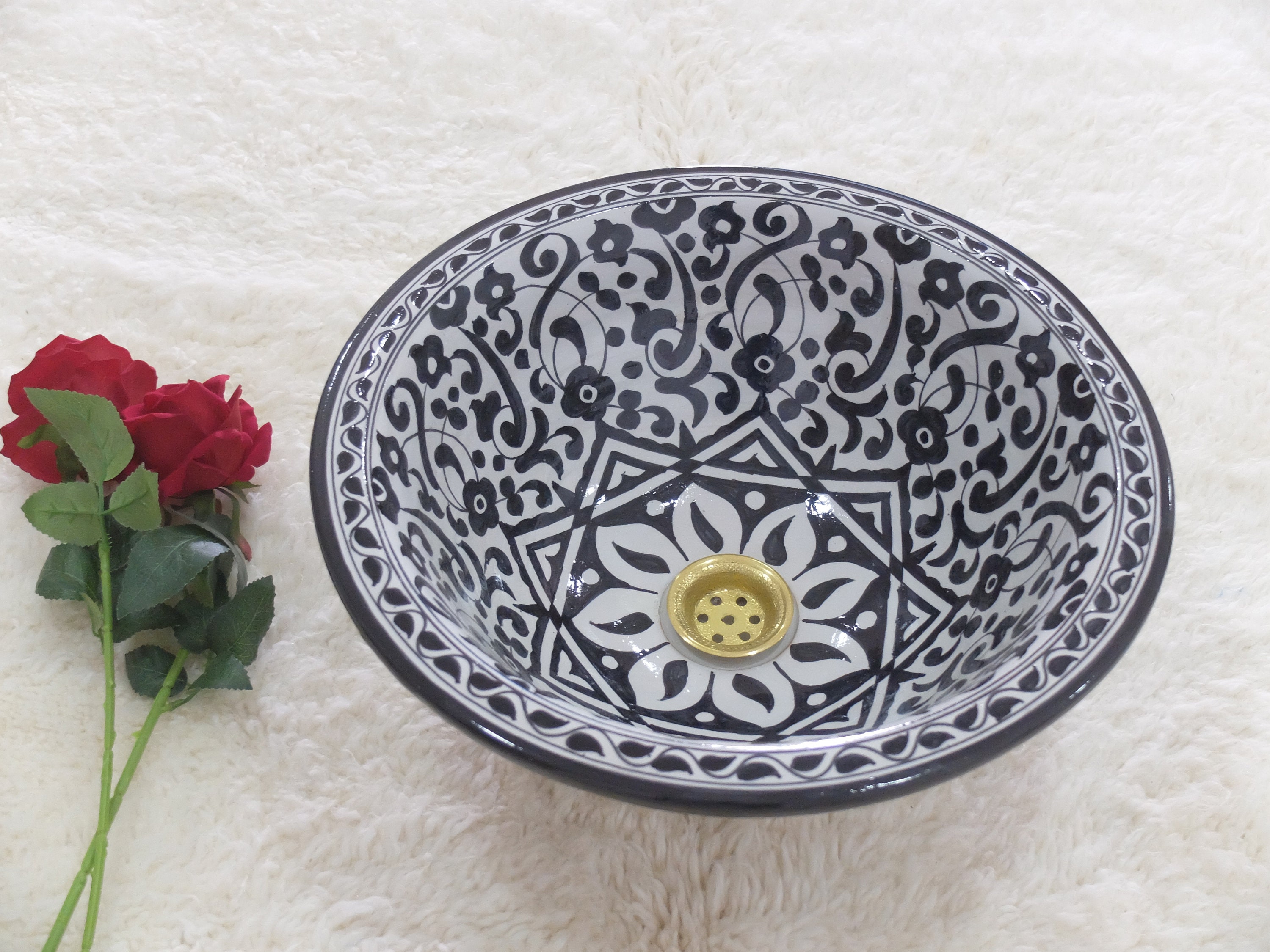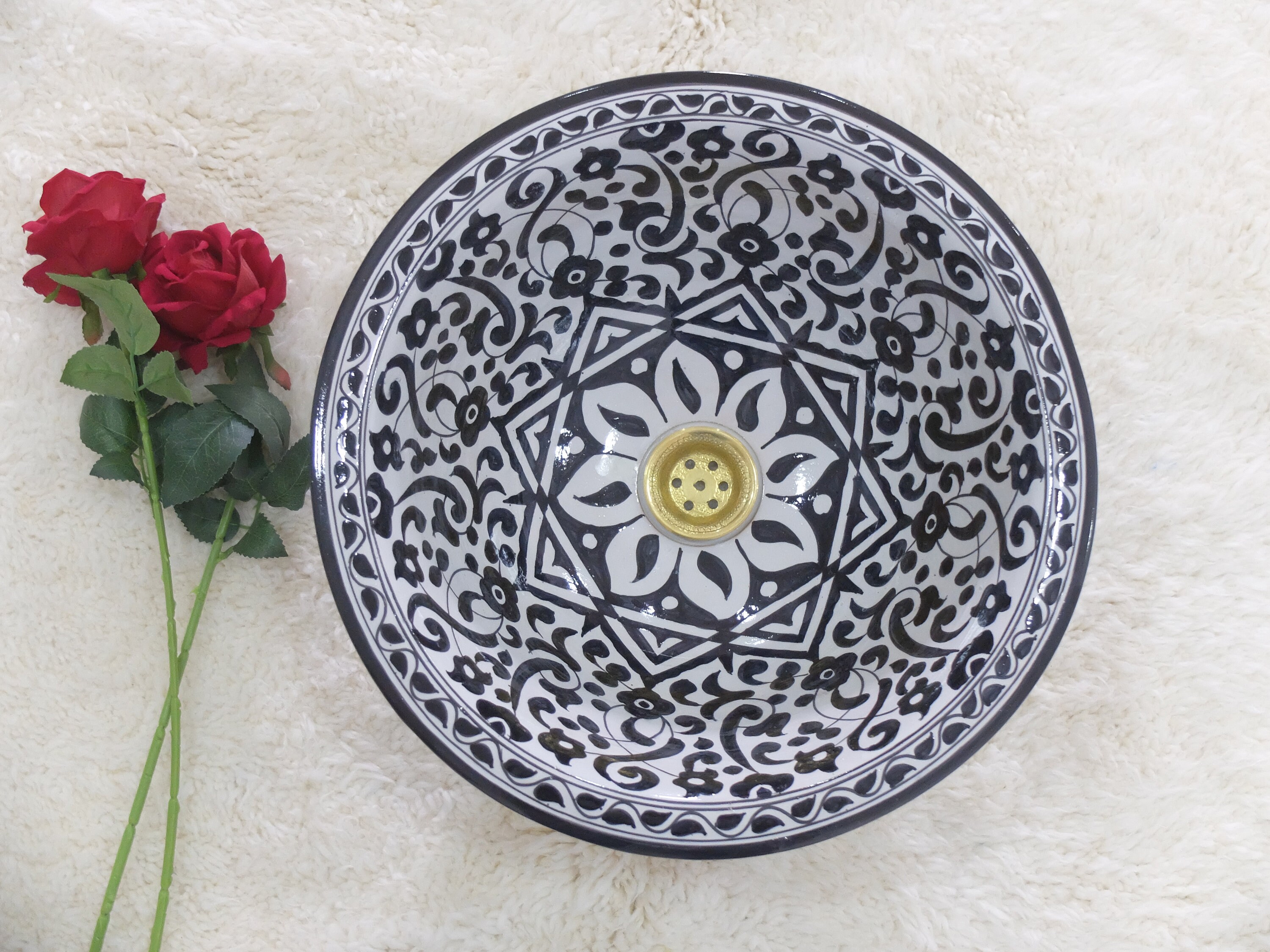 This beautiful Moroccan round ceramic sink is handcrafted by skilled artisans in Fes, made from high-quality clay, and features intricate hand-painted designs with a smooth glazed finish. Made from high-quality ceramic, it is durable, easy to clean, and perfect for bathrooms, kitchens, or powder rooms. Its timeless design adds a touch of Moroccan elegance to any space. The sink comes with both silver and copper drains included for free. Each piece is truly unique, and as a result, minor imperfections are to be expected. If you need a different size, feel free to contact us.