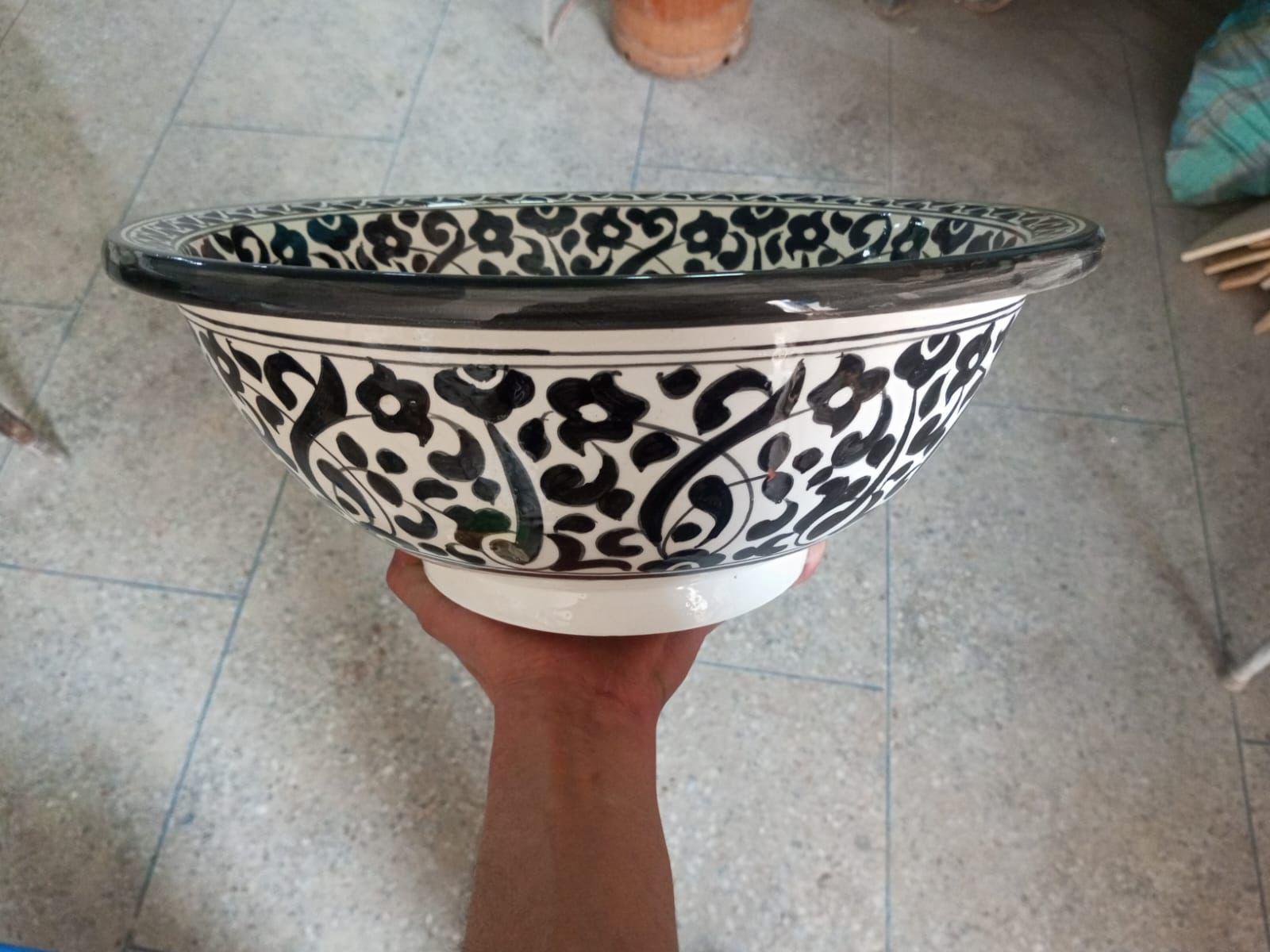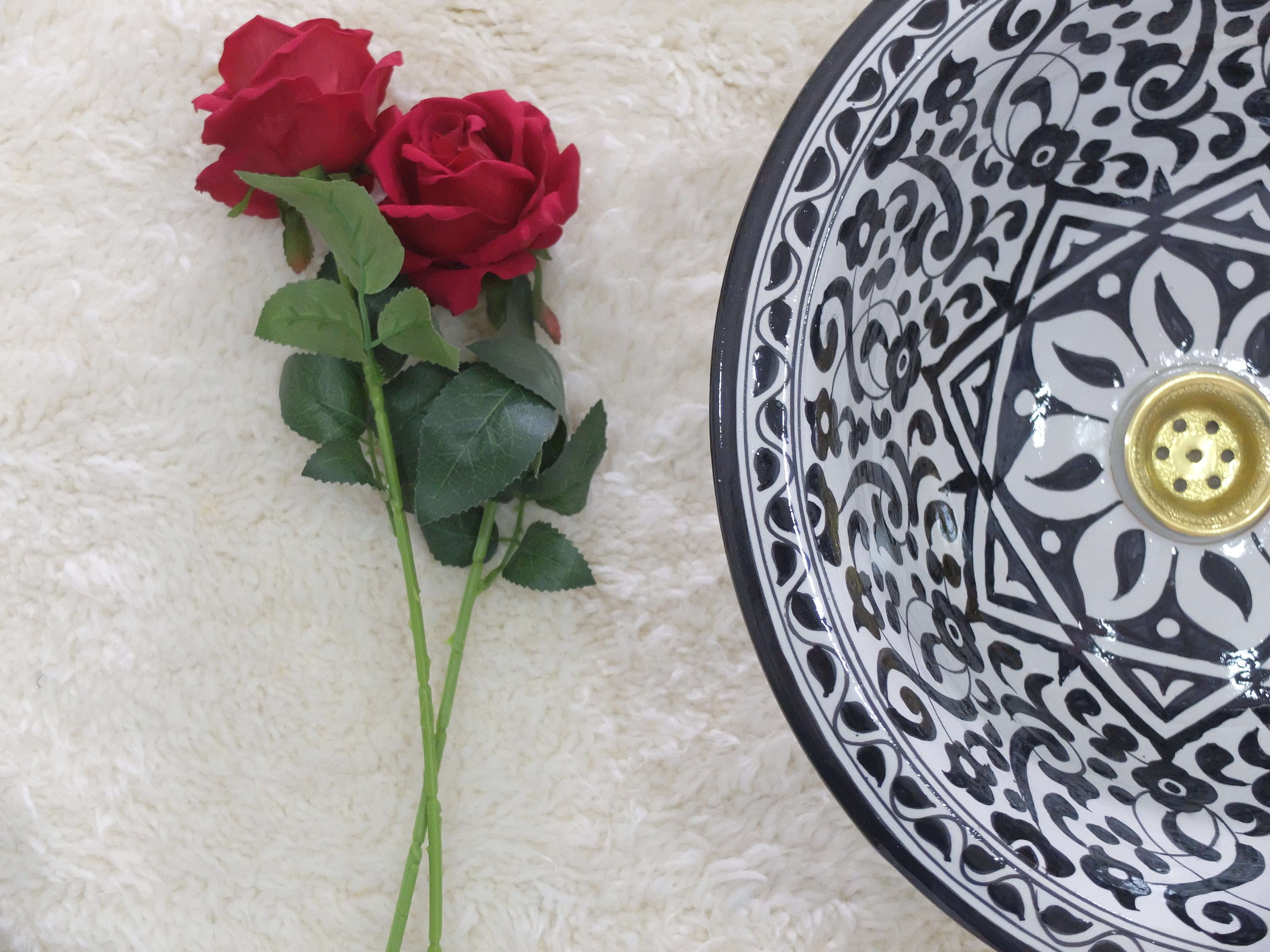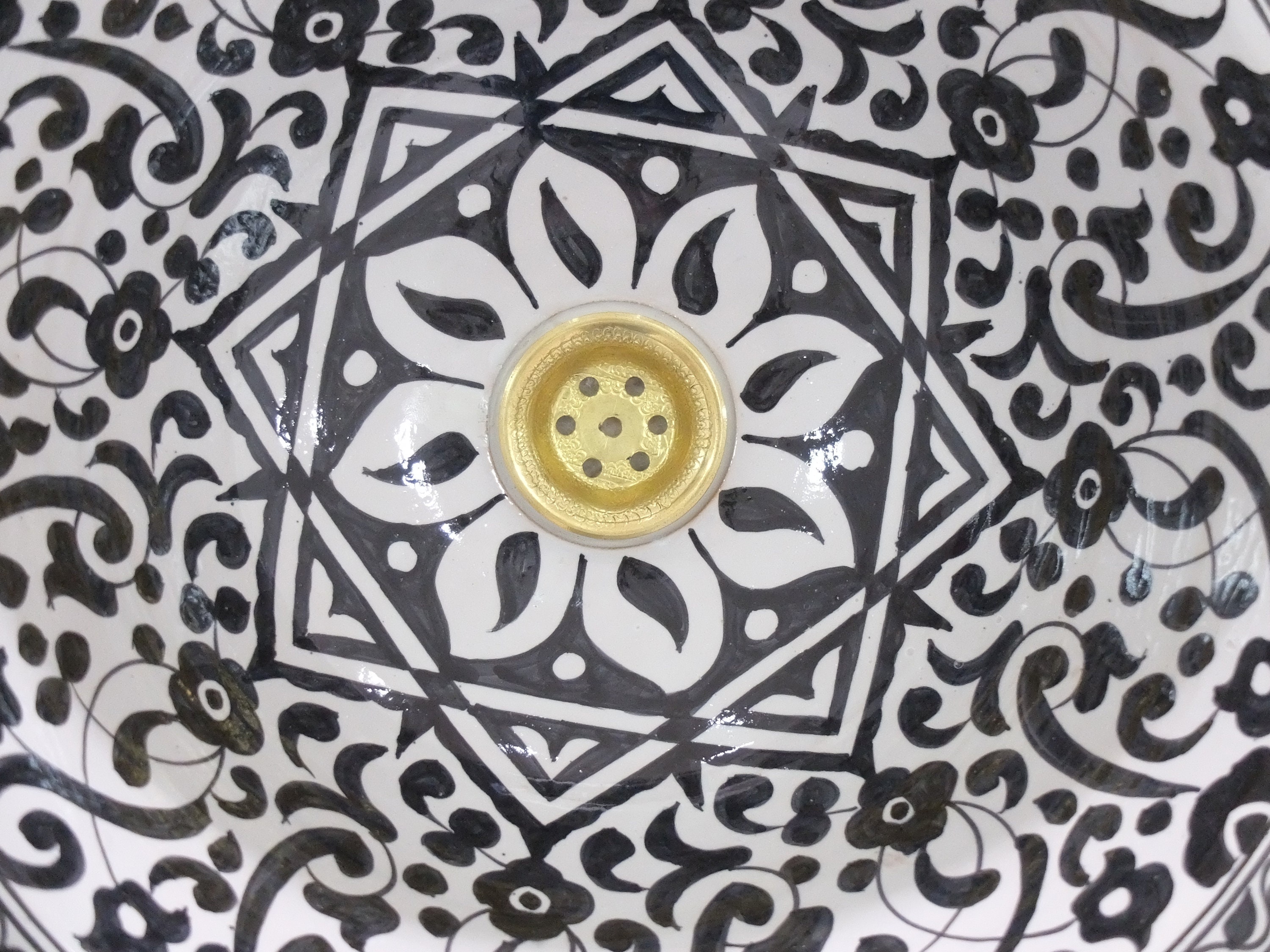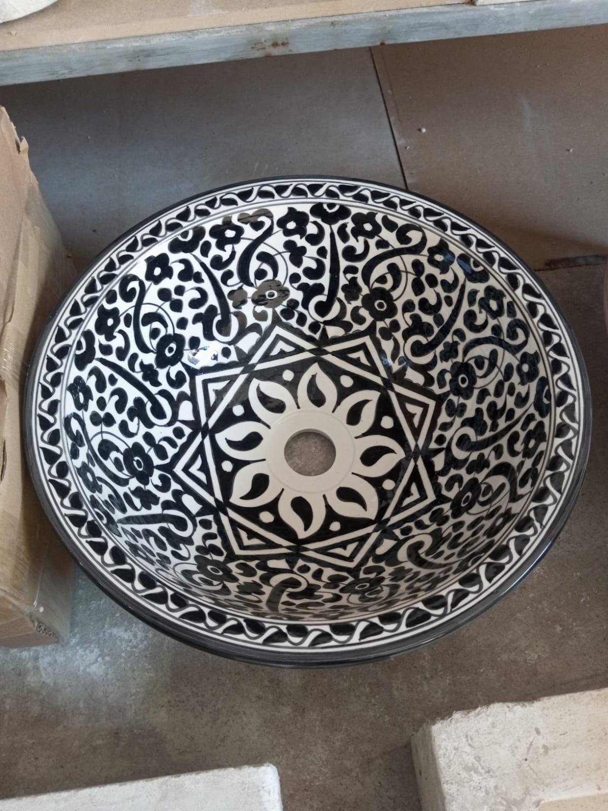 This beautiful Moroccan round ceramic sink is handcrafted by skilled artisans in Fes, made from high-quality clay, and features intricate hand-painted designs with a smooth glazed finish. Made from high-quality ceramic, it is durable, easy to clean, and perfect for bathrooms, kitchens, or powder rooms. Its timeless design adds a touch of Moroccan elegance to any space. The sink comes with both silver and copper drains included for free. Each piece is truly unique, and as a result, minor imperfections are to be expected. If you need a different size, feel free to contact us.