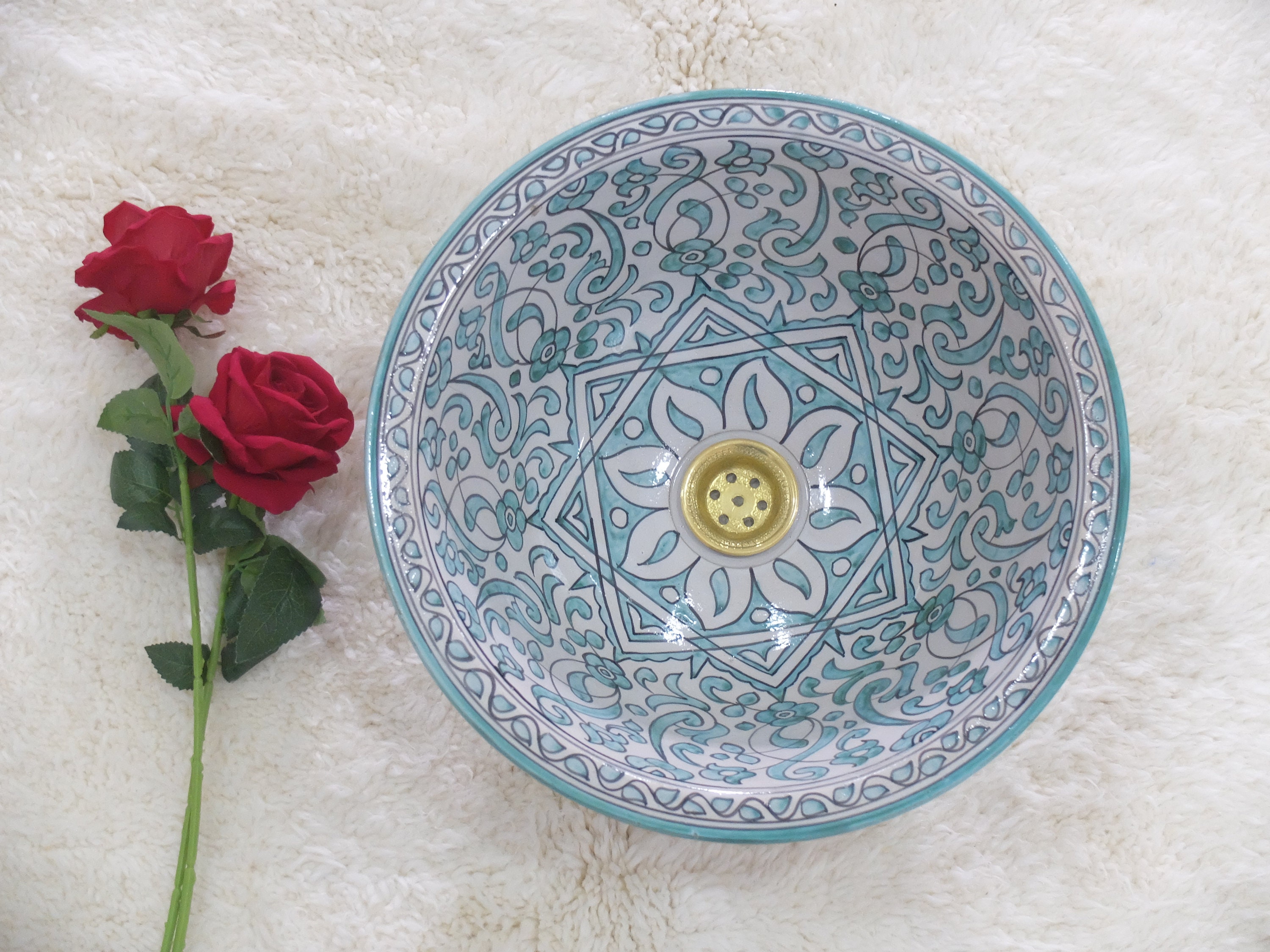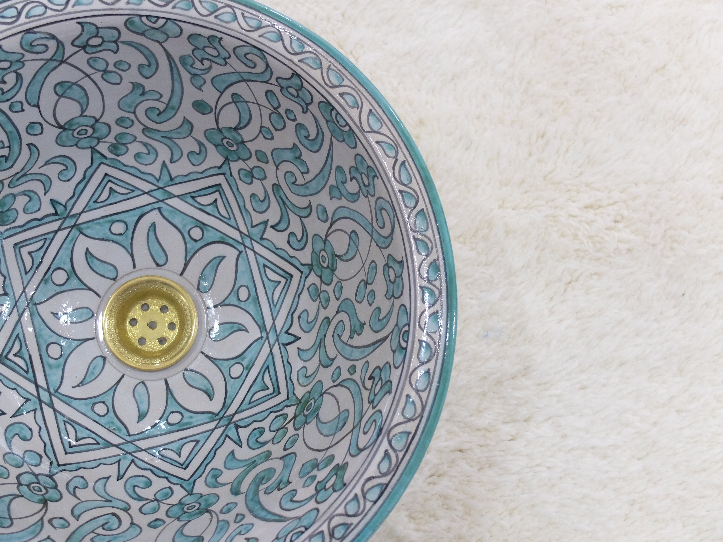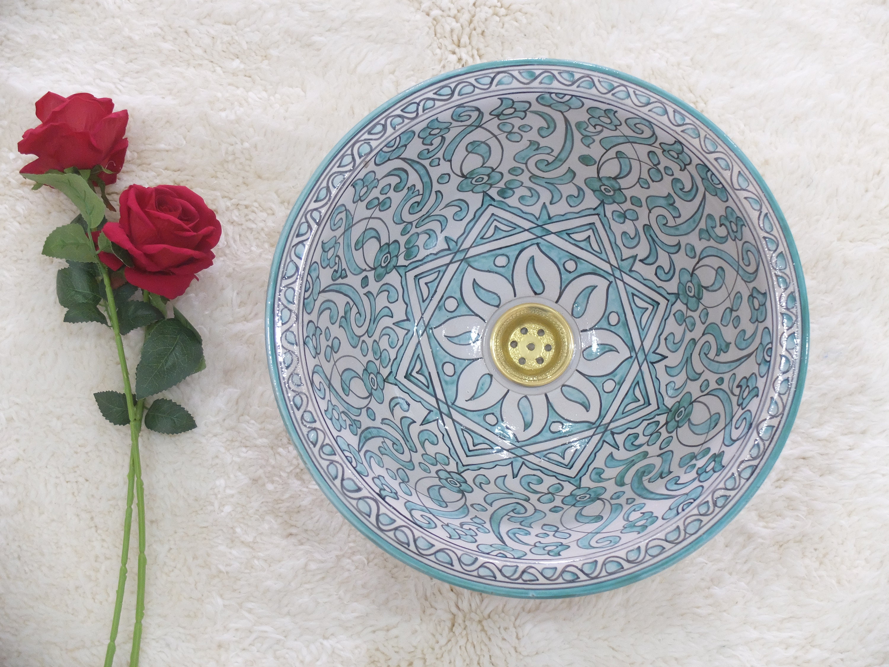 This beautiful Moroccan round ceramic sink is handcrafted by skilled artisans in Fes, made from high-quality clay, and features intricate hand-painted designs with a smooth glazed finish. Made from high-quality ceramic, it is durable, easy to clean, and perfect for bathrooms, kitchens, or powder rooms. Its timeless design adds a touch of Moroccan elegance to any space. The sink comes with both silver and copper drains included for free. Each piece is truly unique, and as a result, minor imperfections are to be expected. If you need a different size, feel free to contact us.