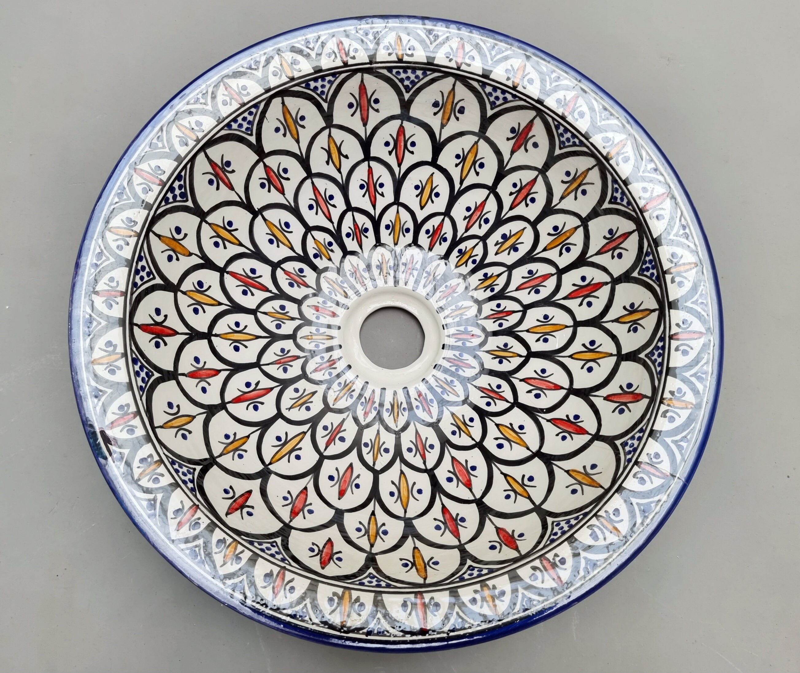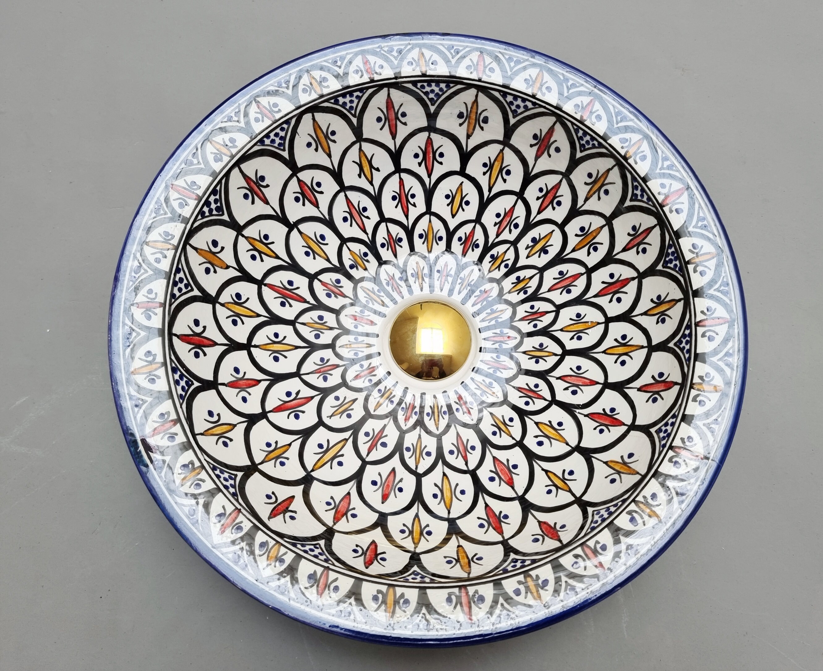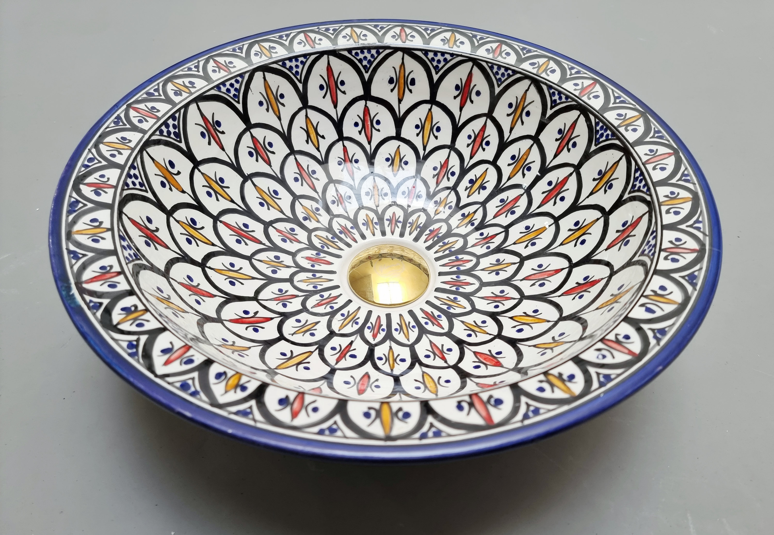 This beautiful Moroccan round ceramic sink is handcrafted by skilled artisans in Fes, made from high-quality clay, and features intricate hand-painted designs with a smooth glazed finish. Made from high-quality ceramic, it is durable, easy to clean, and perfect for bathrooms, kitchens, or powder rooms. Its timeless design adds a touch of Moroccan elegance to any space. The sink comes with both silver and copper drains included for free. Each piece is truly unique, and as a result, minor imperfections are to be expected. If you need a different size, feel free to contact us.