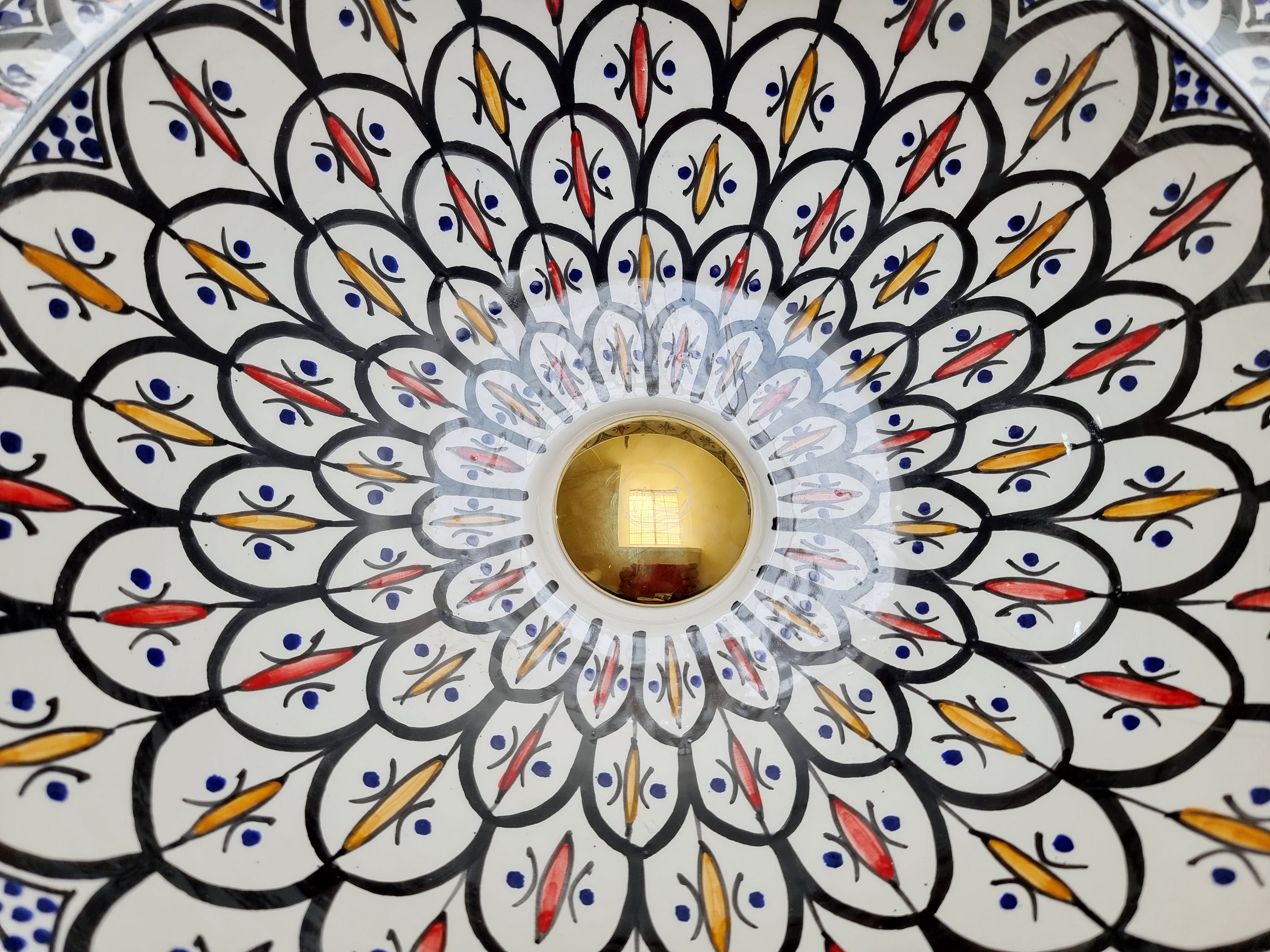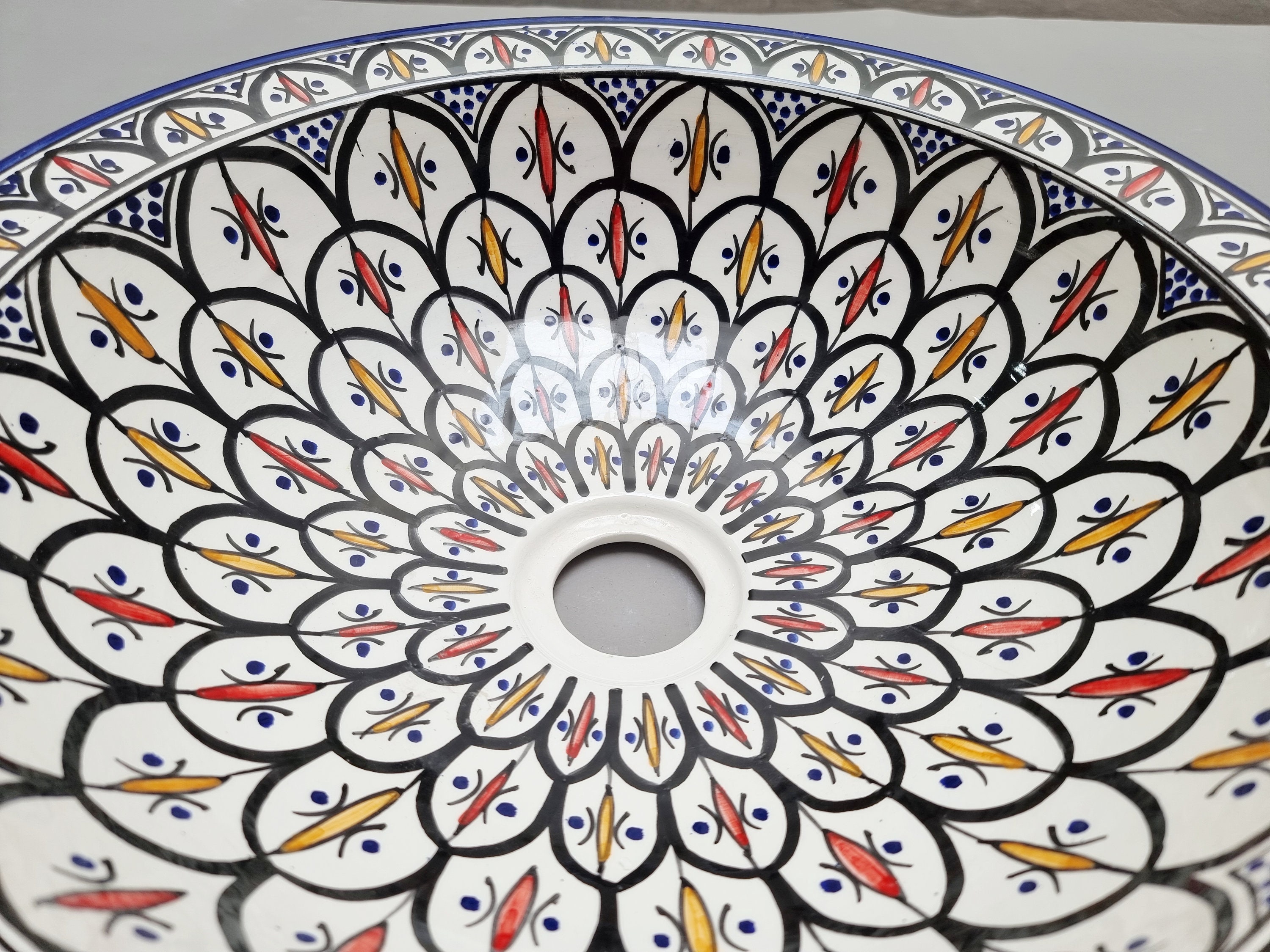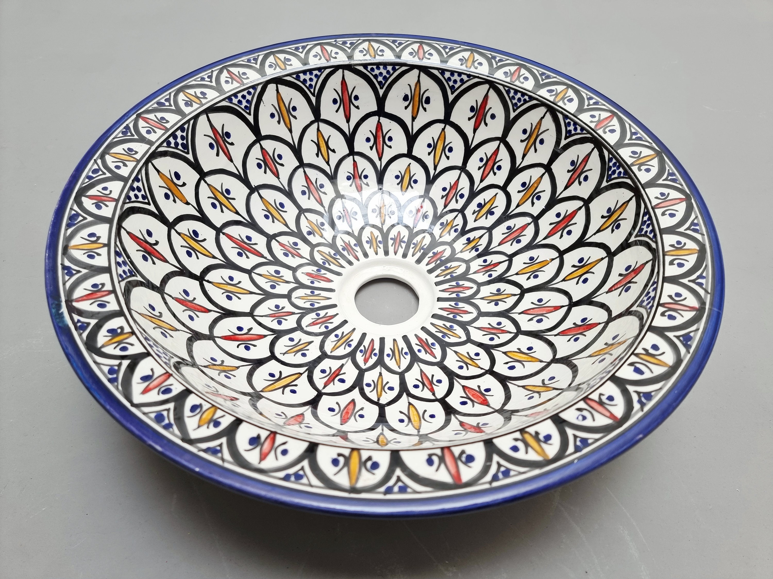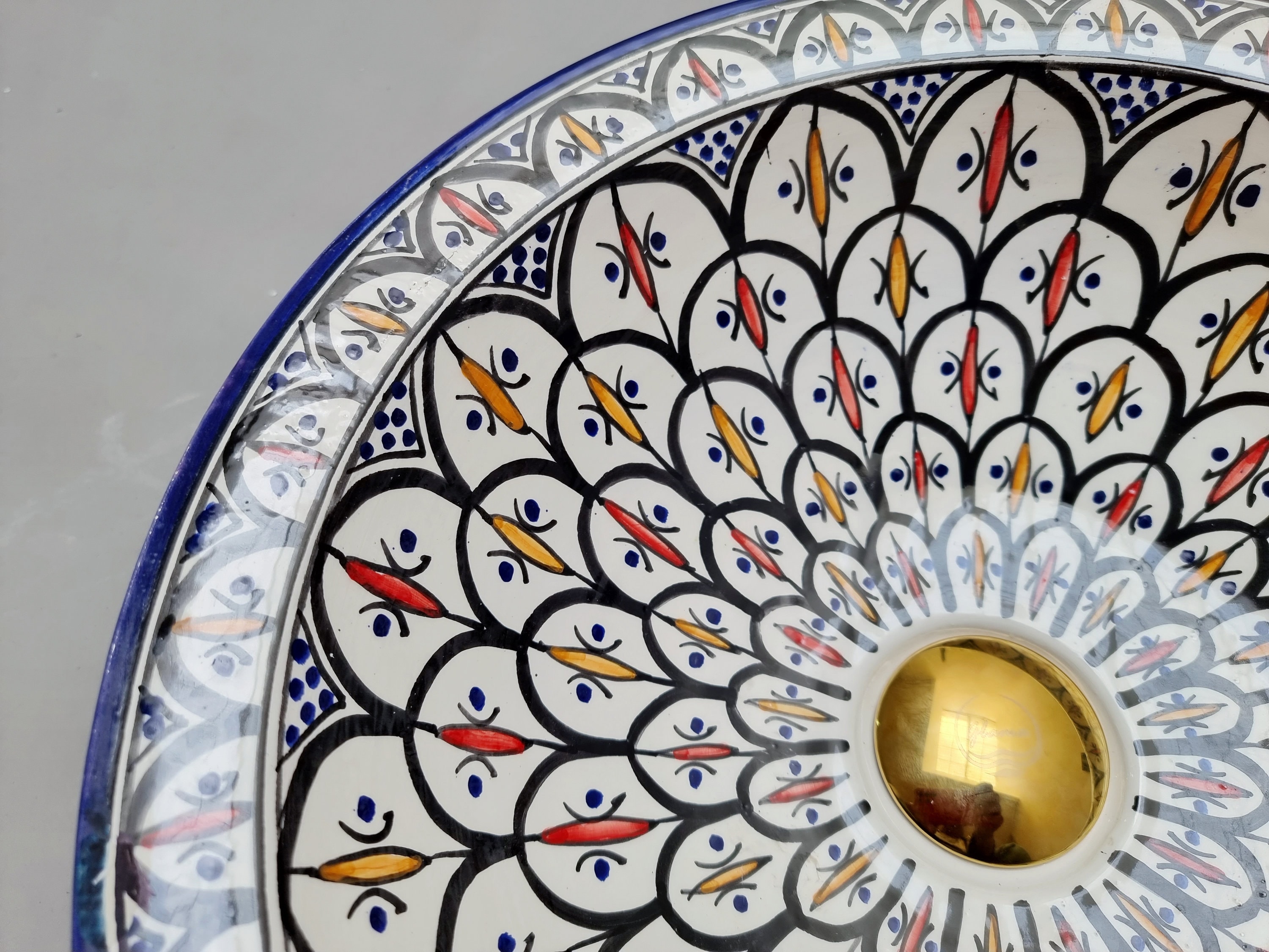 This beautiful Moroccan round ceramic sink is handcrafted by skilled artisans in Fes, made from high-quality clay, and features intricate hand-painted designs with a smooth glazed finish. Made from high-quality ceramic, it is durable, easy to clean, and perfect for bathrooms, kitchens, or powder rooms. Its timeless design adds a touch of Moroccan elegance to any space. The sink comes with both silver and copper drains included for free. Each piece is truly unique, and as a result, minor imperfections are to be expected. If you need a different size, feel free to contact us.