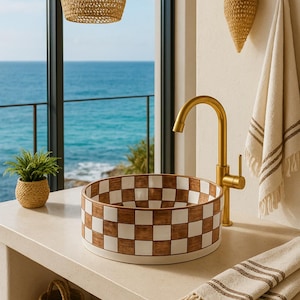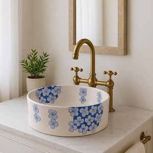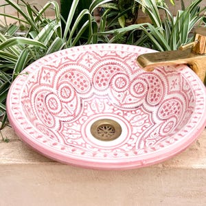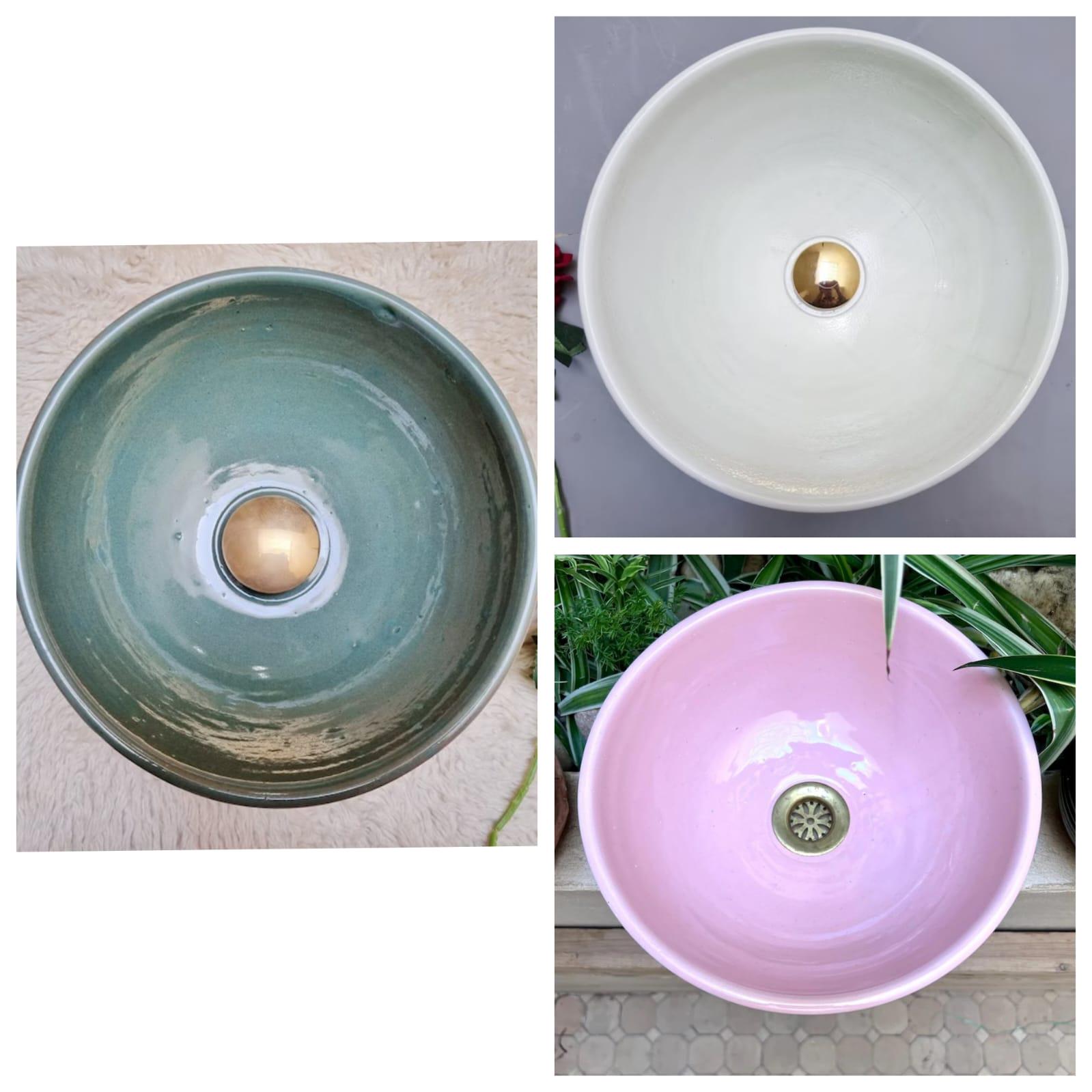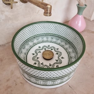 This beautiful Moroccan round ceramic sink is handcrafted by skilled artisans in Fes, made from high-quality clay, and features intricate hand-painted designs with a smooth glazed finish. Made from high-quality ceramic, it is durable, easy to clean, and perfect for bathrooms, kitchens, or powder rooms. Its timeless design adds a touch of Moroccan elegance to any space. The sink comes with both silver and copper drains included for free. Each piece is truly unique, and as a result, minor imperfections are to be expected. If you need a different size, feel free to contact us.