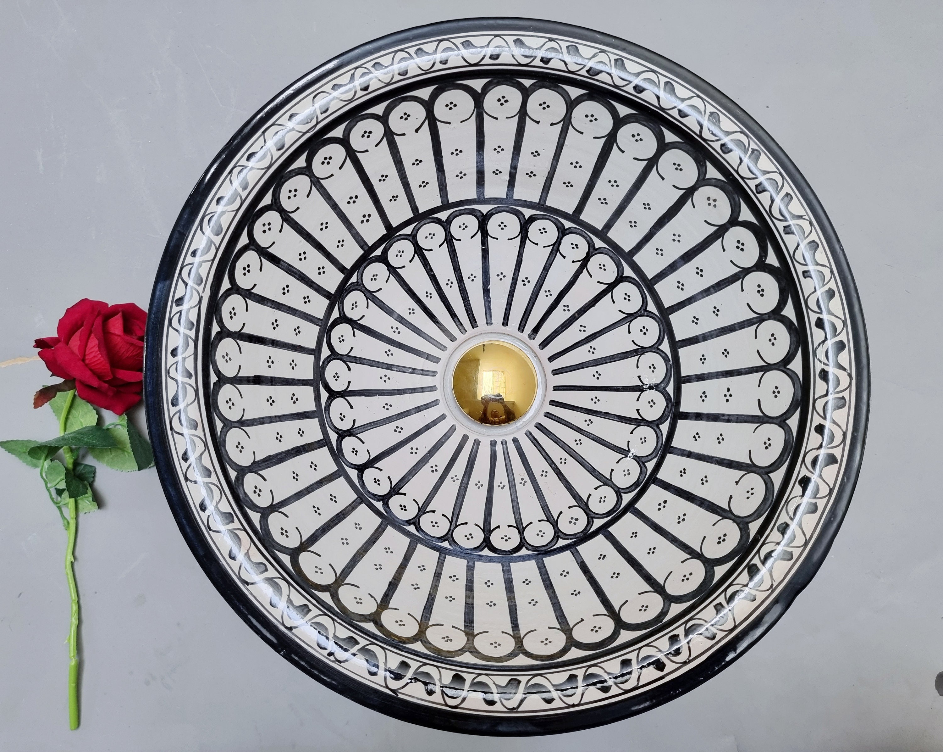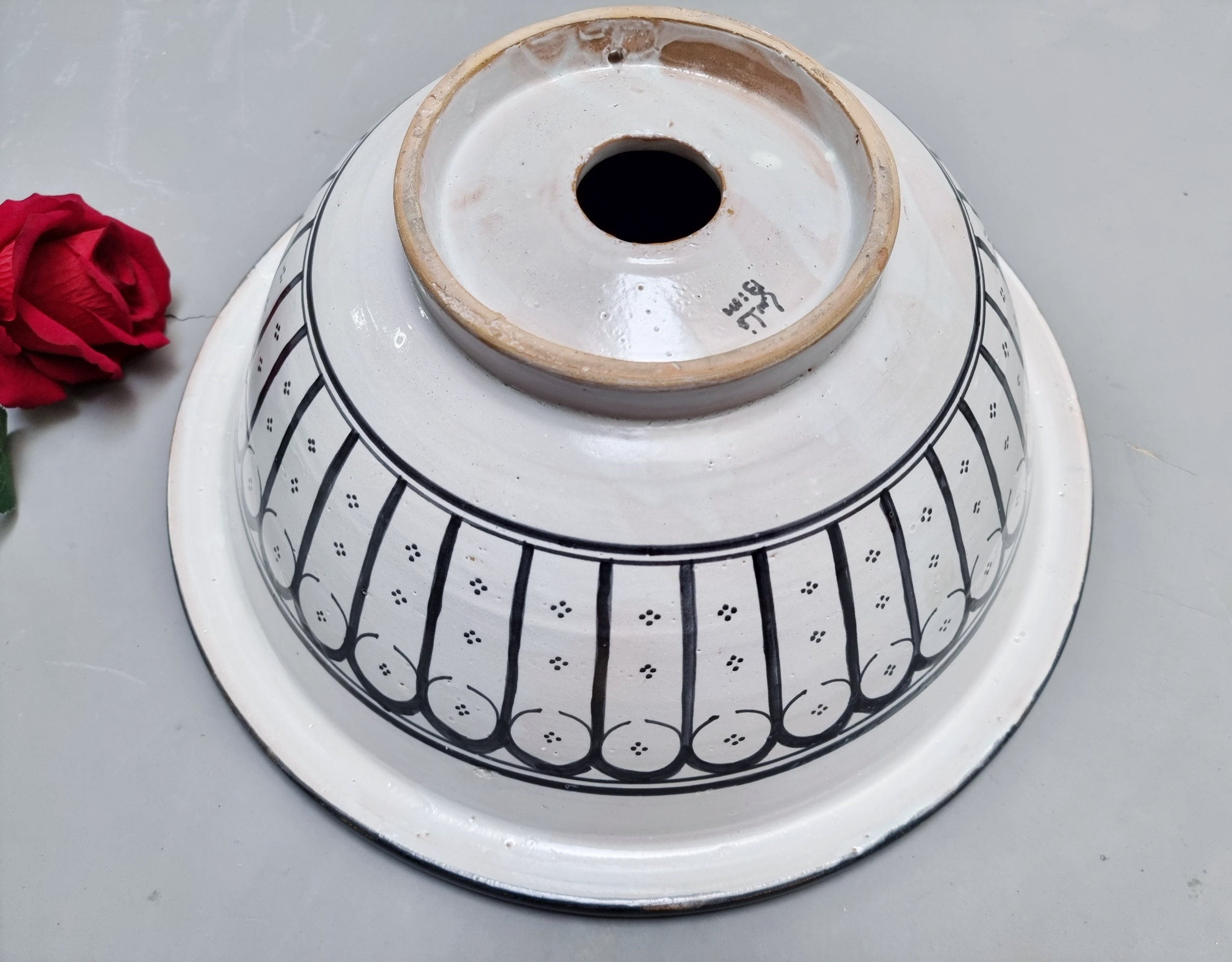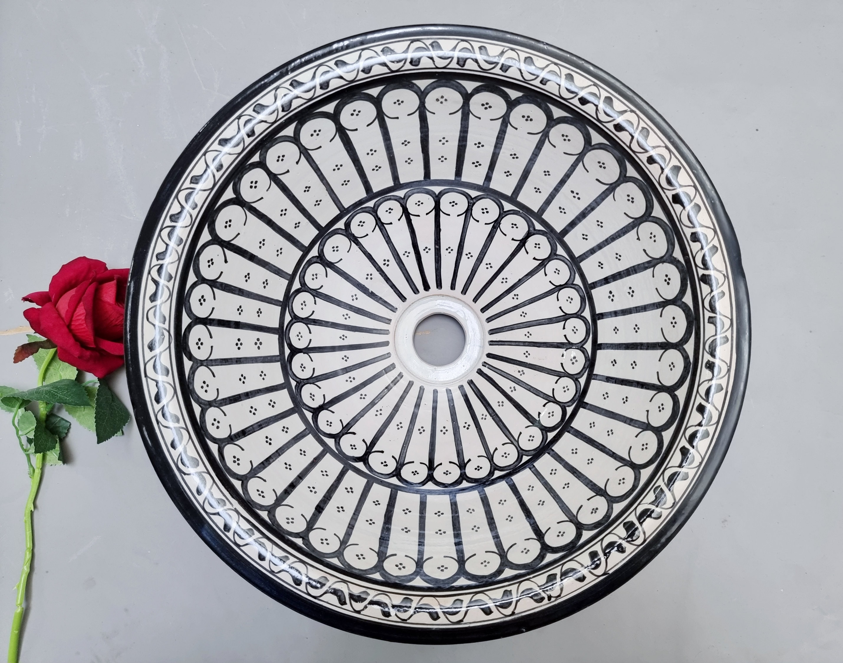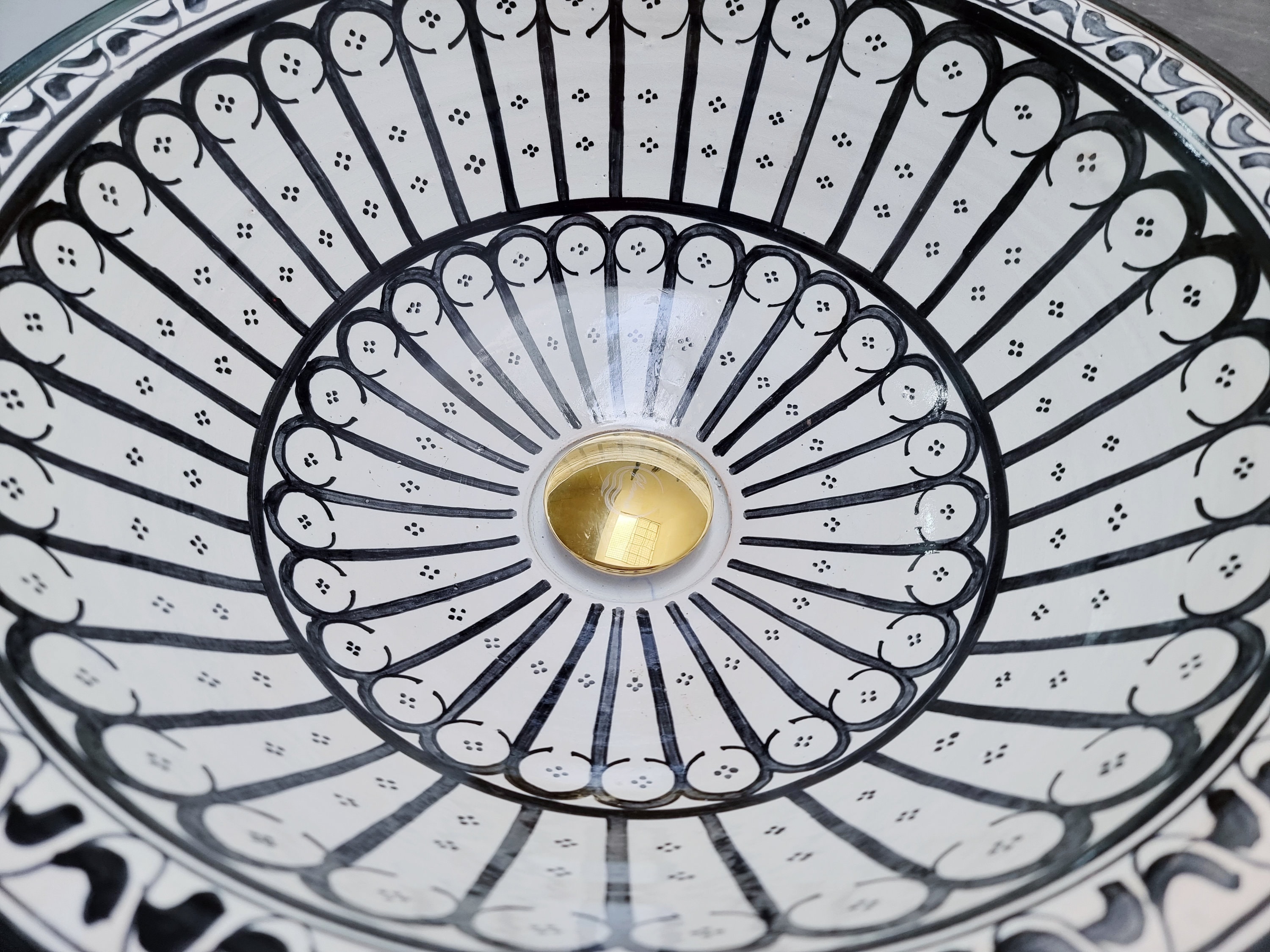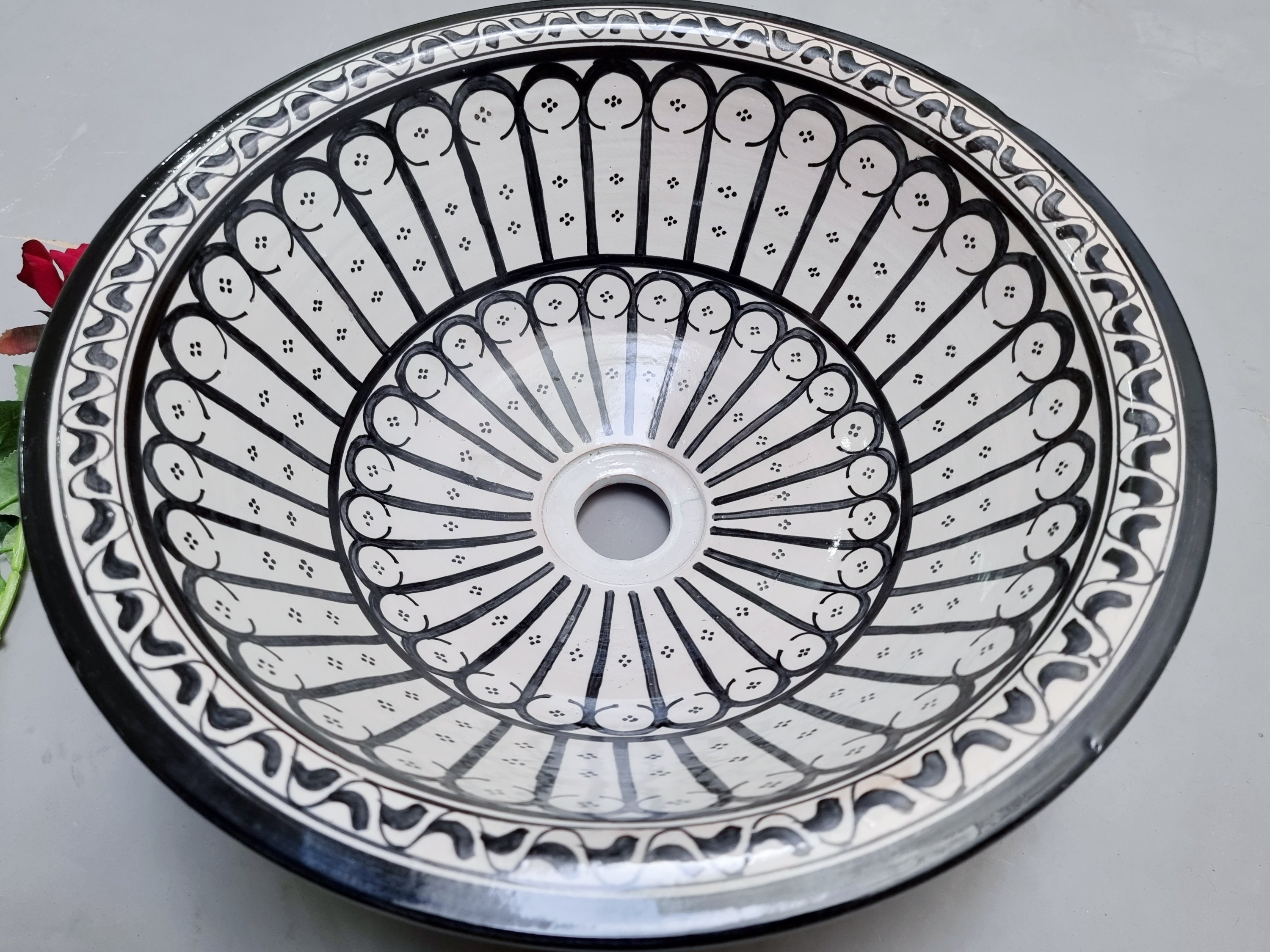 This beautiful Moroccan round ceramic sink is handcrafted by skilled artisans in Fes, made from high-quality clay, and features intricate hand-painted designs with a smooth glazed finish. Made from high-quality ceramic, it is durable, easy to clean, and perfect for bathrooms, kitchens, or powder rooms. Its timeless design adds a touch of Moroccan elegance to any space. The sink comes with both silver and copper drains included for free. Each piece is truly unique, and as a result, minor imperfections are to be expected. If you need a different size, feel free to contact us.