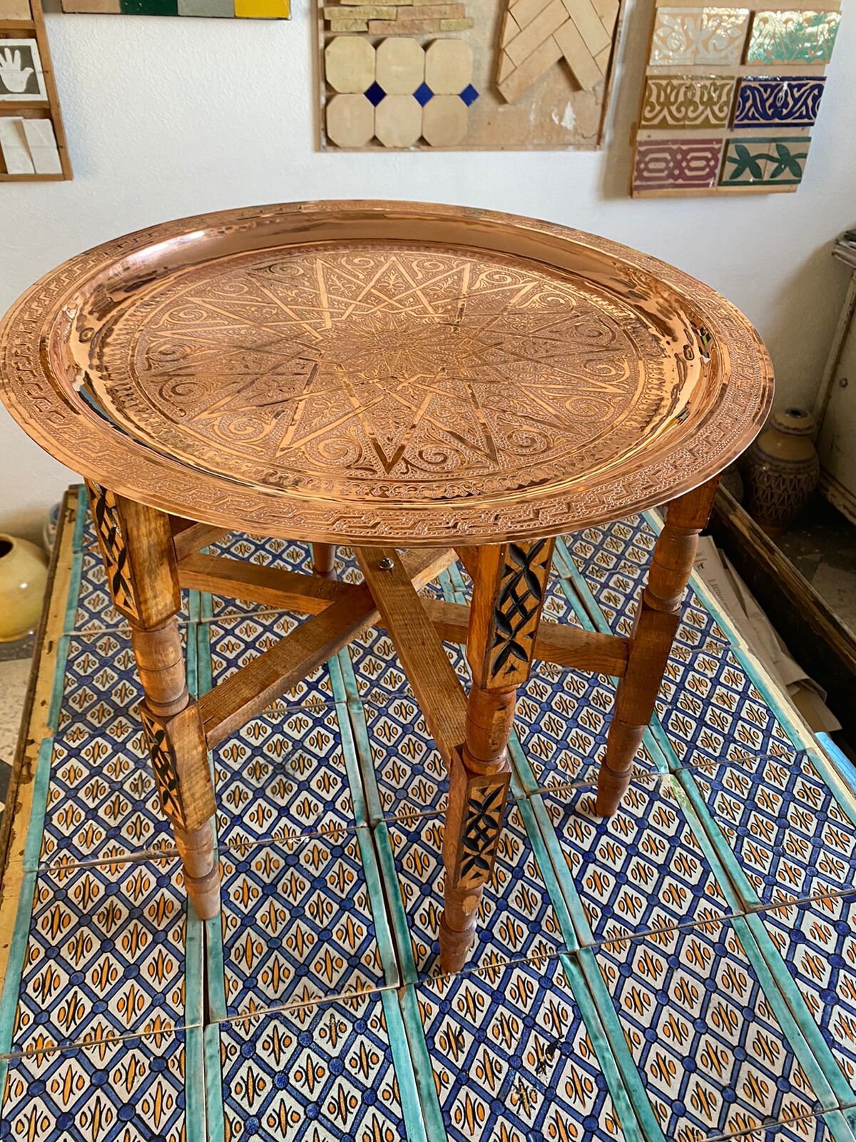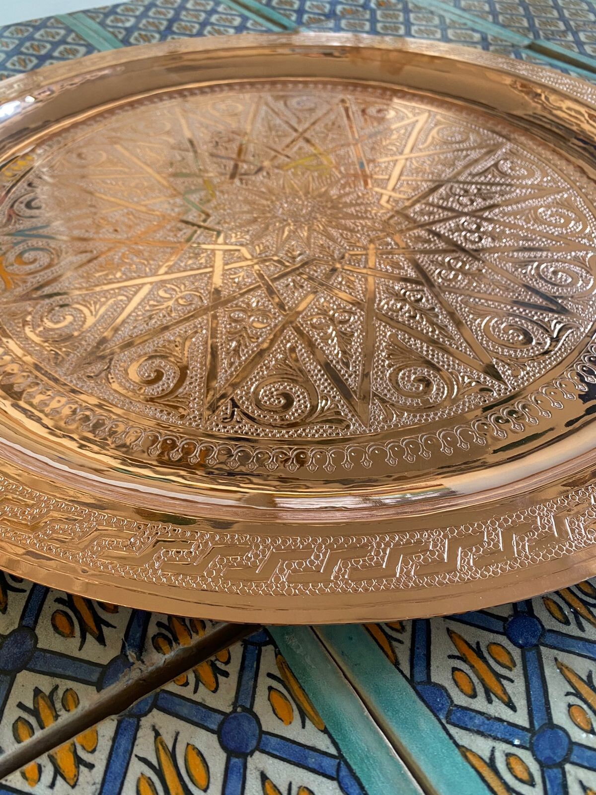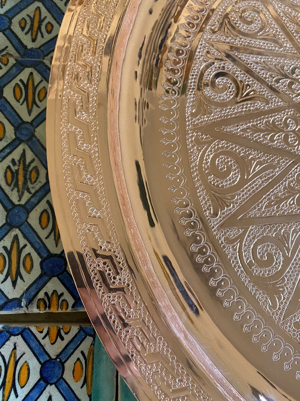 We all know and are certain that Moroccan tea is one of the most delicious types of tea that exist in the world, and when we say Moroccan tea we mean family, friends, lovers, and a hand-carved copper tea tray table like the one we offer because you have a golden copper tray engraved by the most skilled craftsmen, with Table Wood Stand Support Legs and each inscription means something from Moroccan traditions makes your home look like a palace or a castle, especially if you collect some of the beautiful copper decorations such as trays, candle holders, authentic Berber rugs and a beautiful teapot. It's just like u are in some berber Mountains