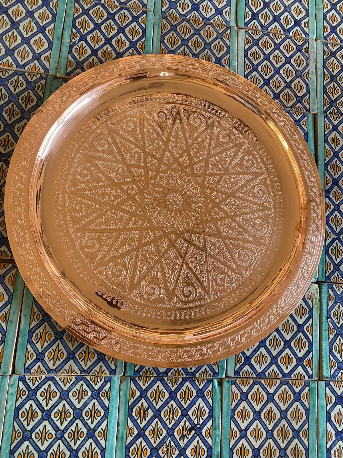 Perfect as a side table, serving tray, and a decorative function... Moroccan polished brass tray, hand-hammered and decorated with a traditional geometric arabesque pattern. Use the copper tray as a serving dish. Large geometric designs engraved on brass. Indoor and outdoor tools. This large brass carved metal texture tray can be hung on the wall.