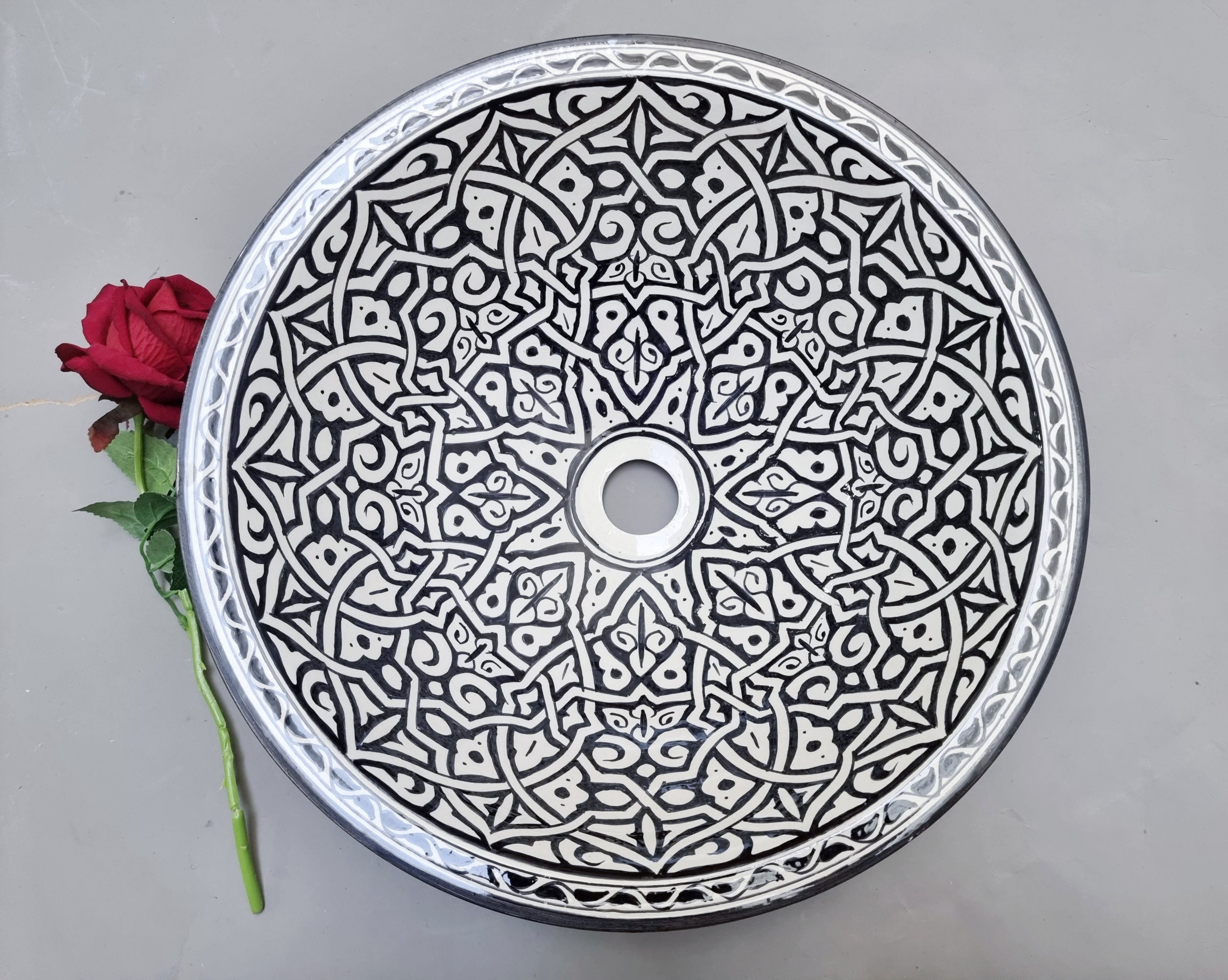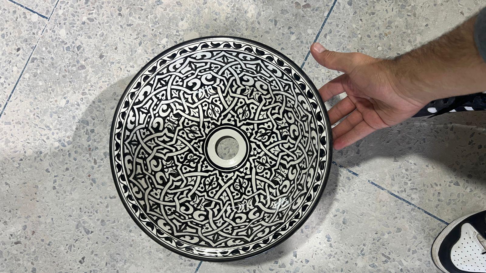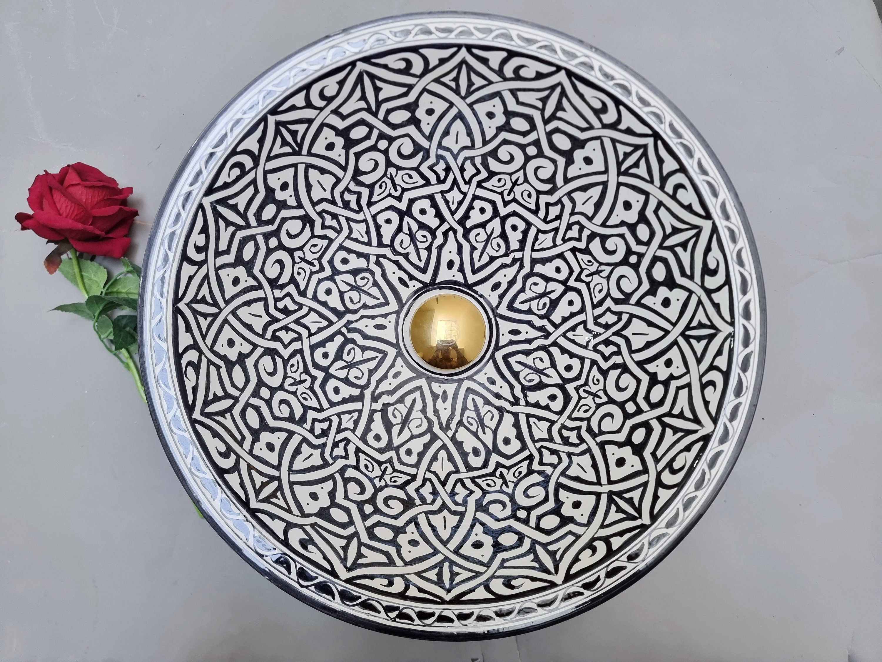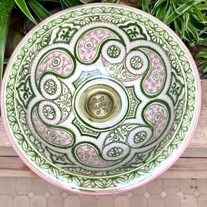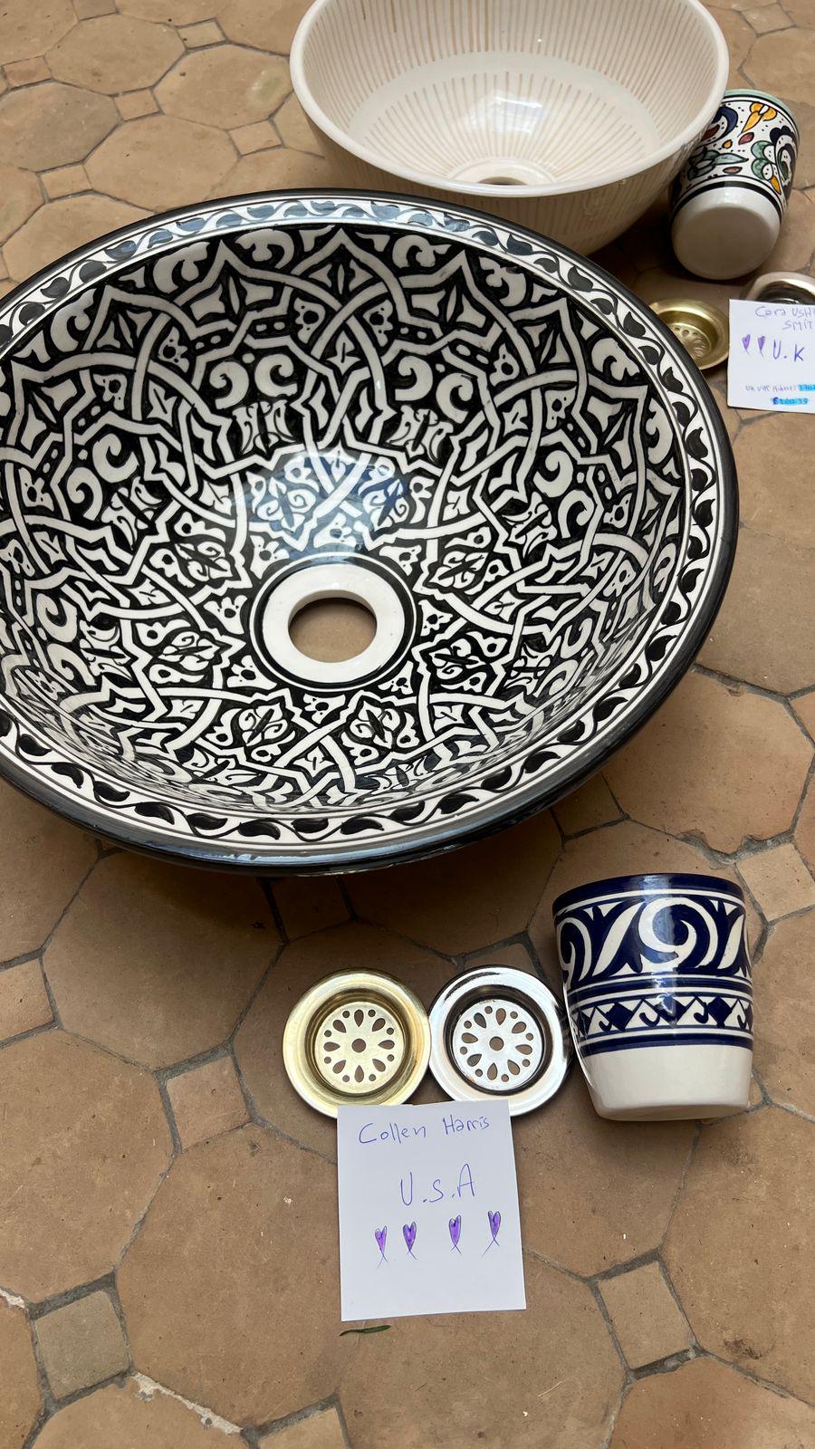 This beautiful Moroccan round ceramic sink is handcrafted by skilled artisans in Fes, made from high-quality clay, and features intricate hand-painted designs with a smooth glazed finish. Made from high-quality ceramic, it is durable, easy to clean, and perfect for bathrooms, kitchens, or powder rooms. Its timeless design adds a touch of Moroccan elegance to any space. The sink comes with both silver and copper drains included for free. Each piece is truly unique, and as a result, minor imperfections are to be expected. If you need a different size, feel free to contact us.