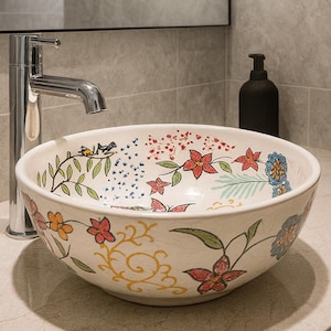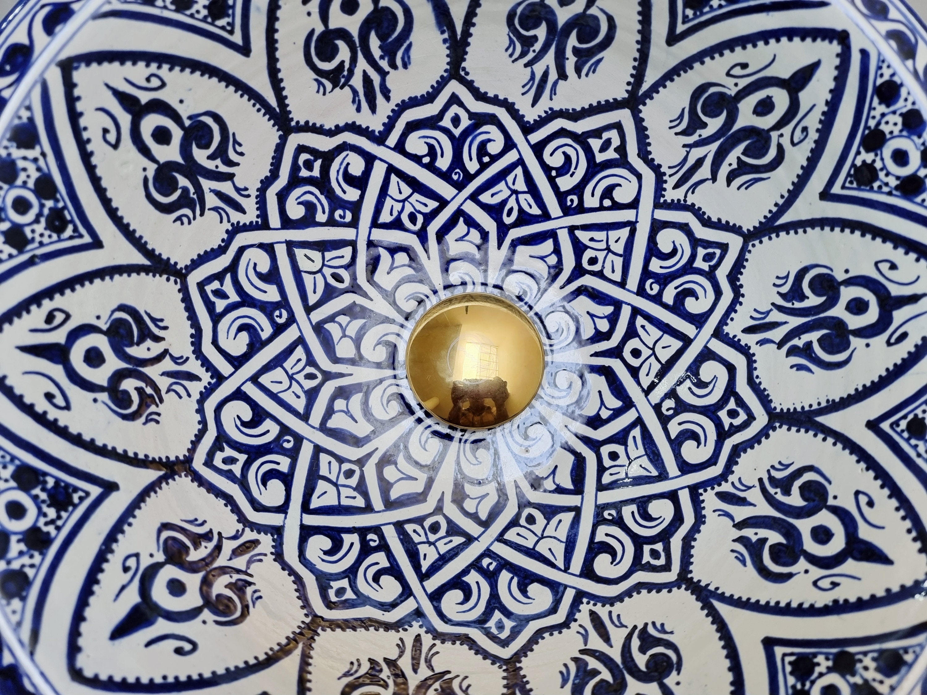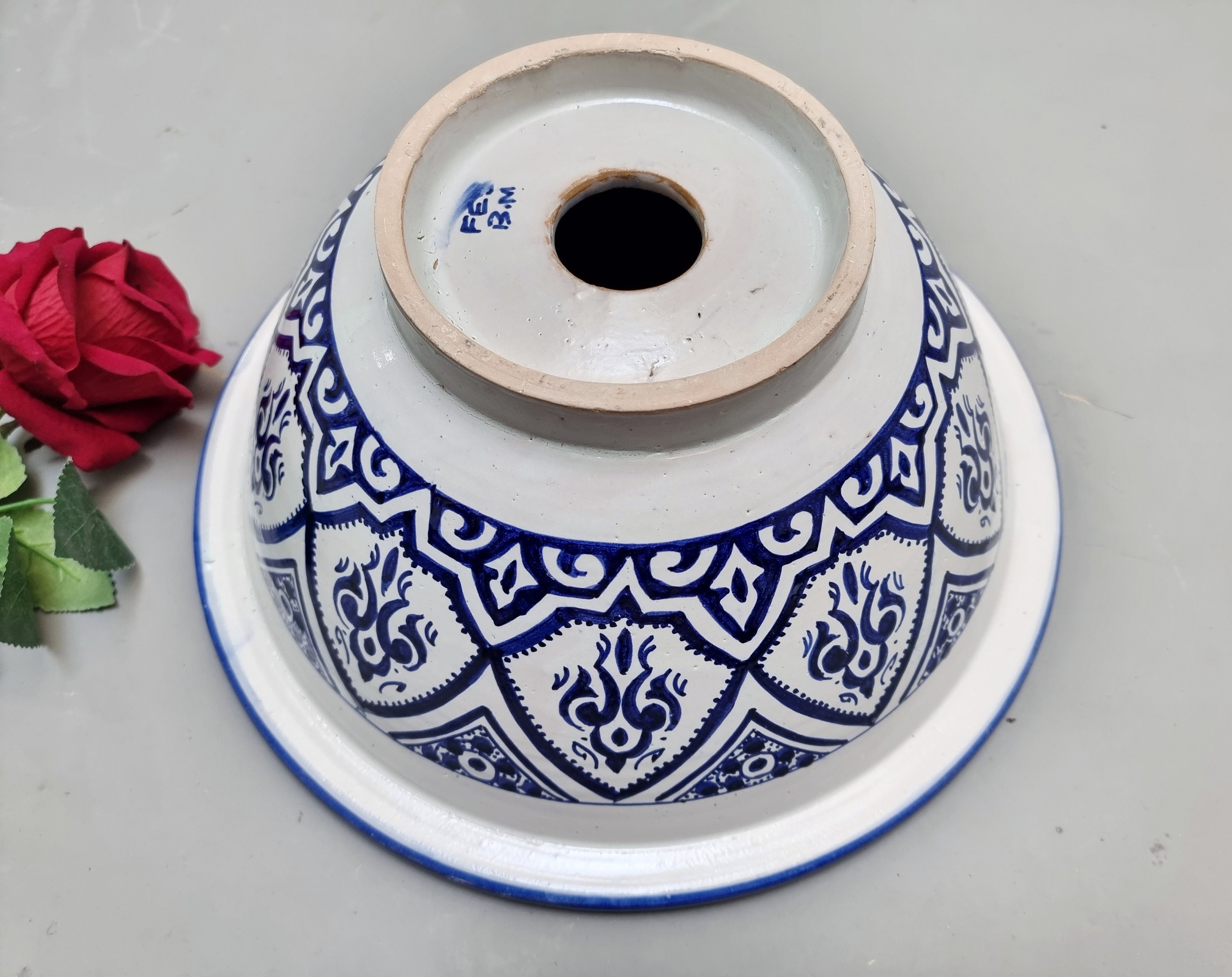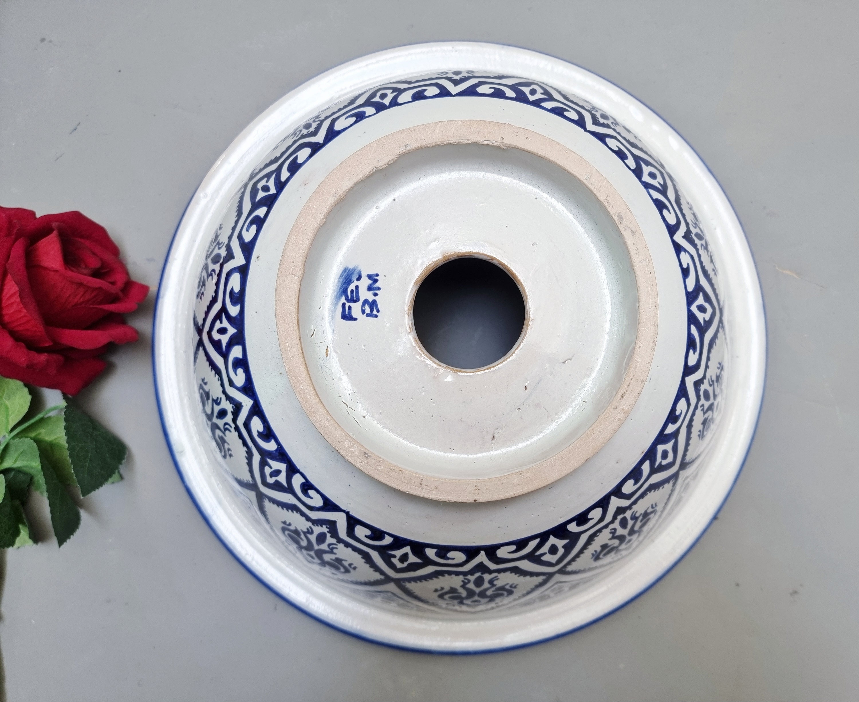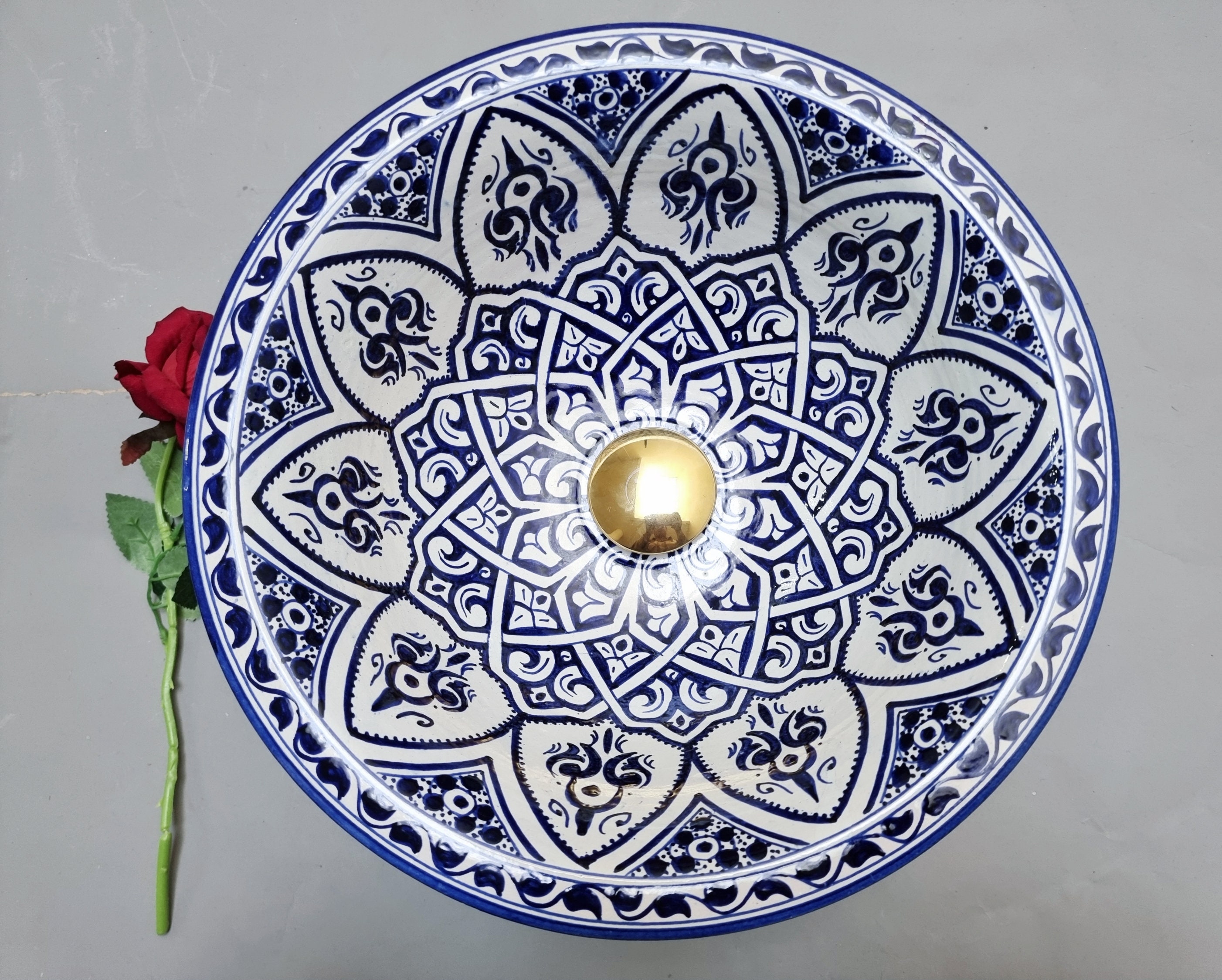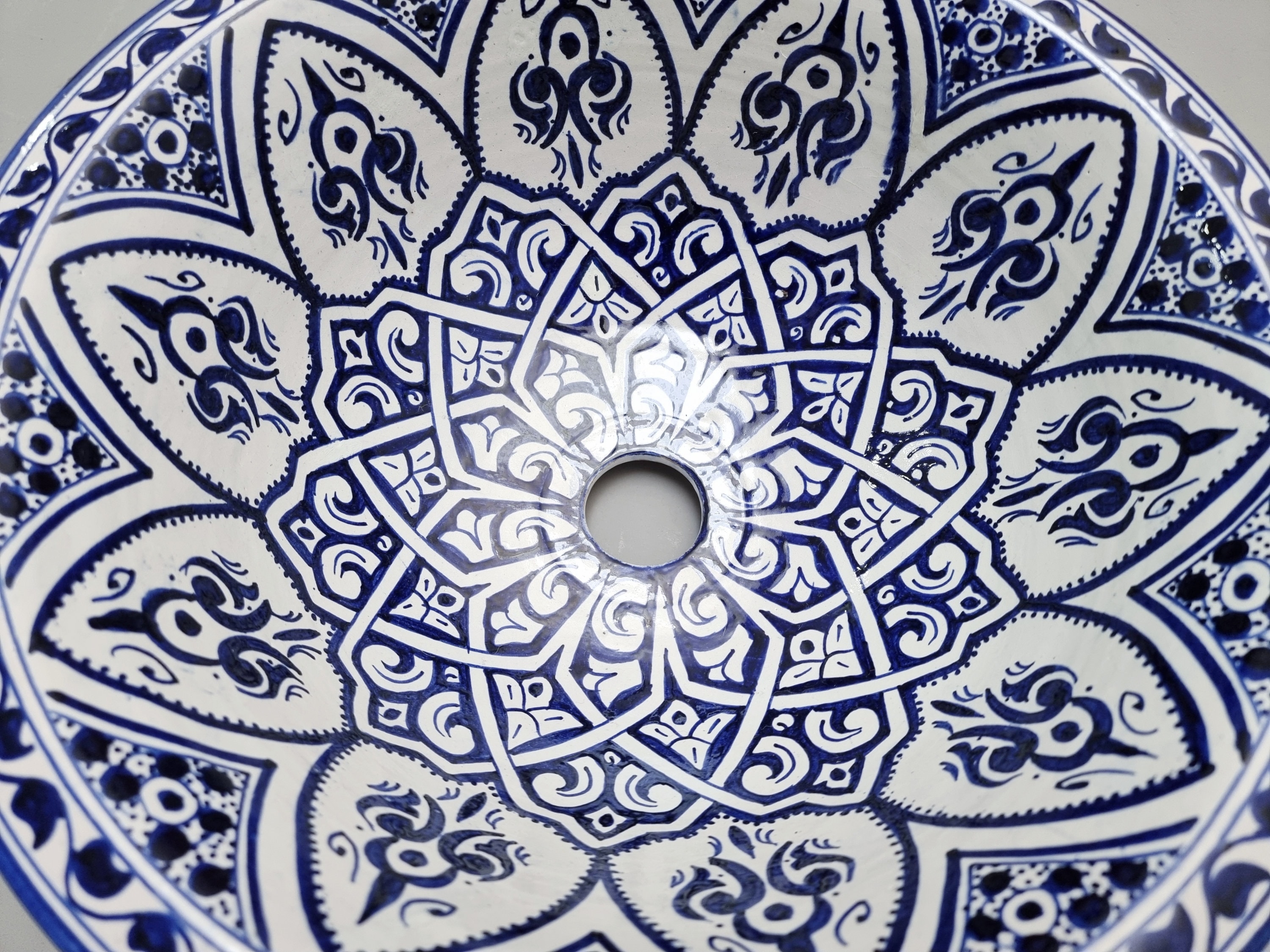 This beautiful Moroccan round ceramic sink is handcrafted by skilled artisans in Fes, made from high-quality clay, and features intricate hand-painted designs with a smooth glazed finish. Made from high-quality ceramic, it is durable, easy to clean, and perfect for bathrooms, kitchens, or powder rooms. Its timeless design adds a touch of Moroccan elegance to any space. The sink comes with both silver and copper drains included for free. Each piece is truly unique, and as a result, minor imperfections are to be expected. If you need a different size, feel free to contact us.