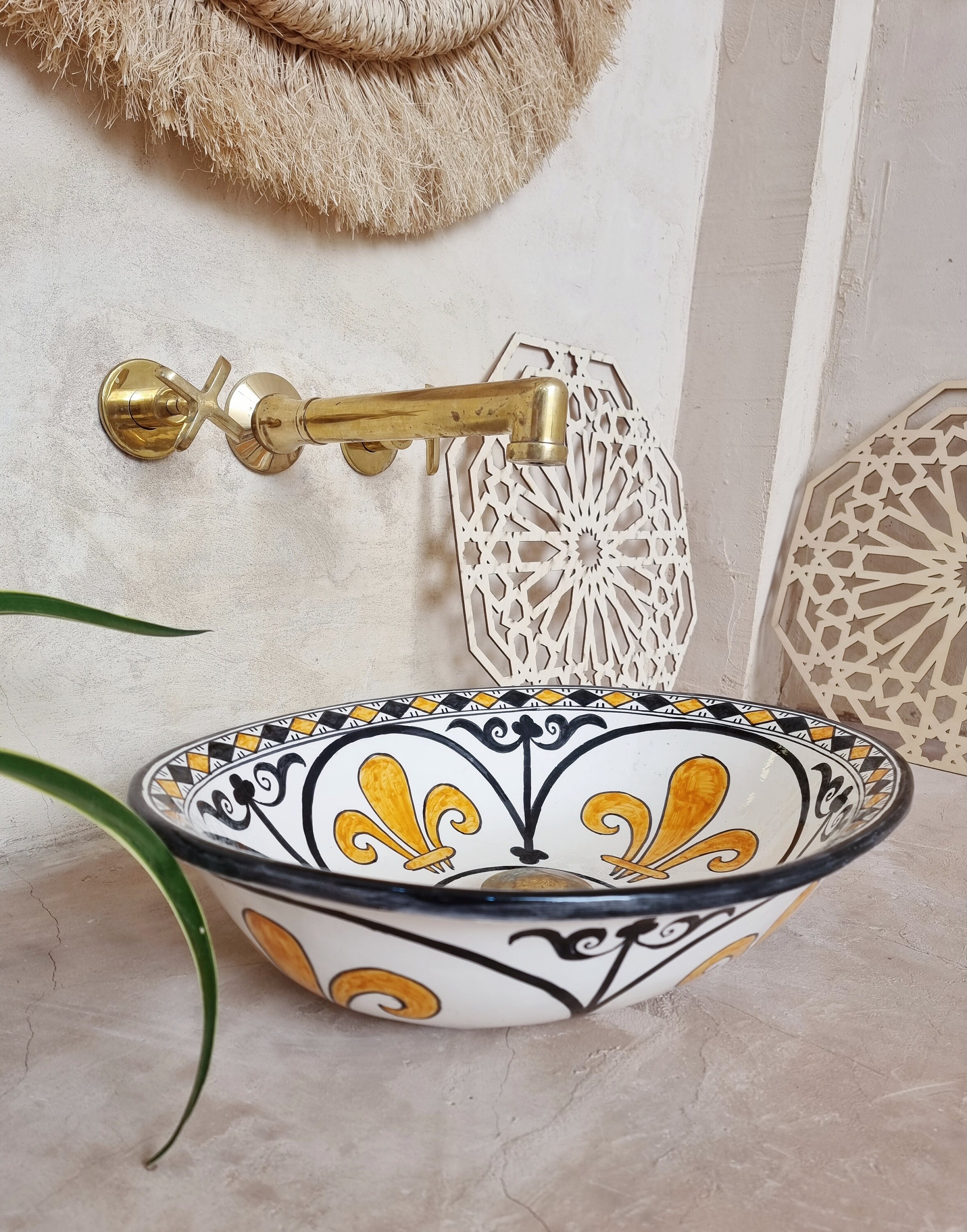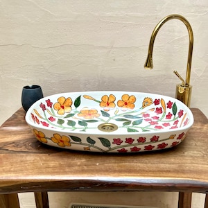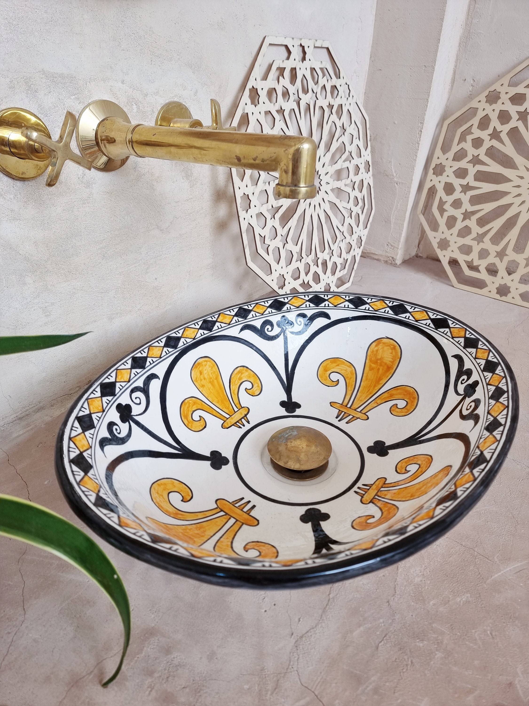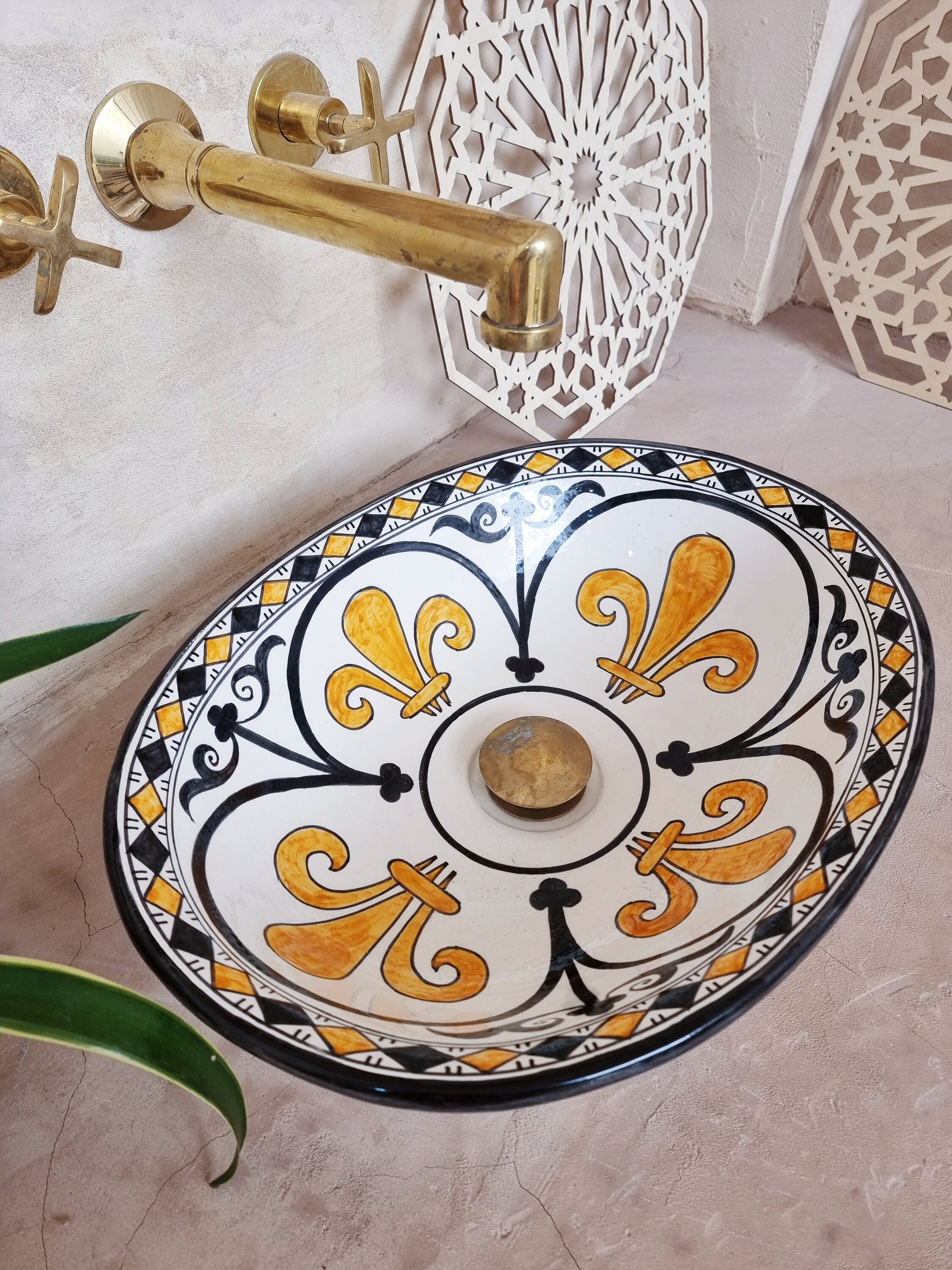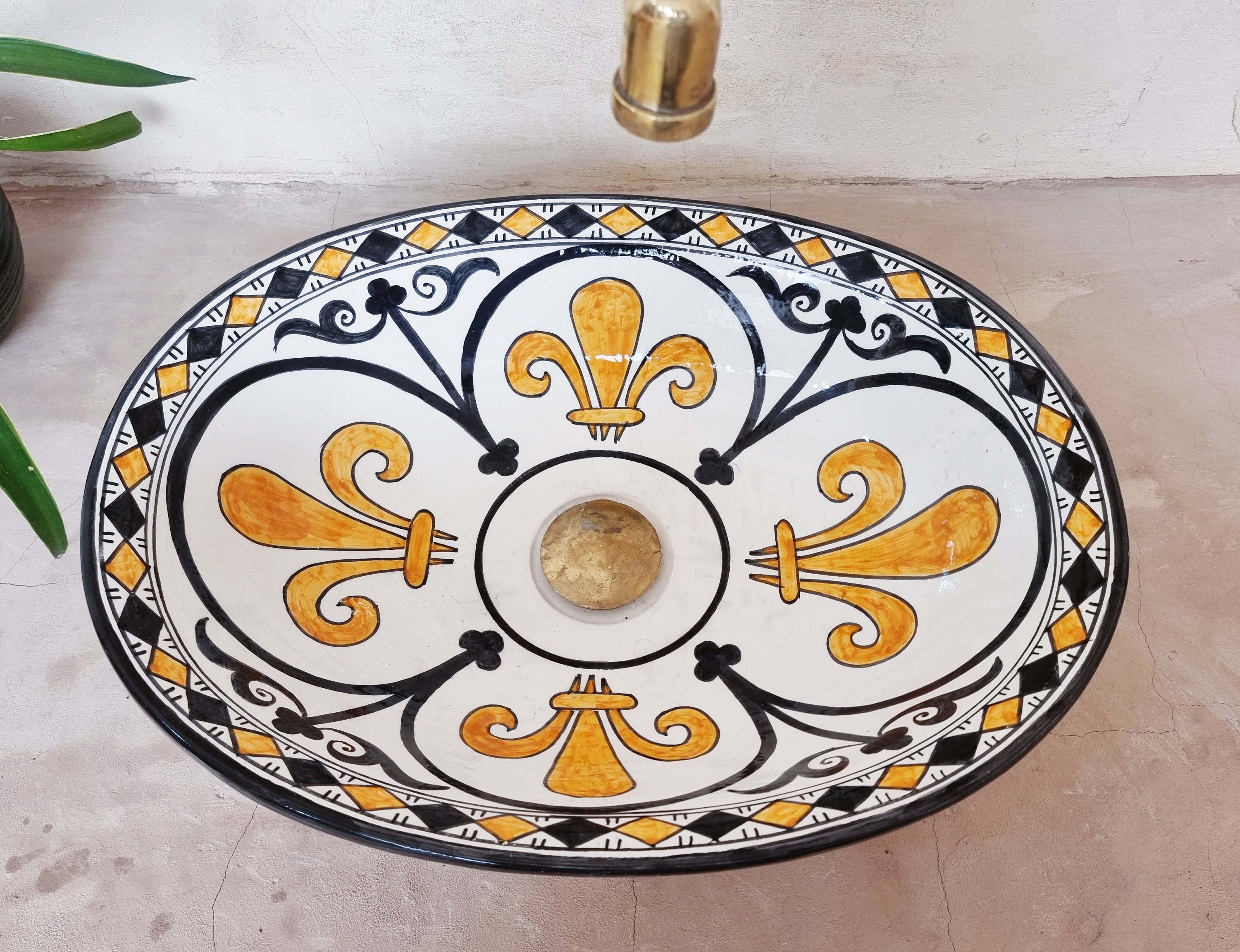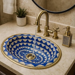 This beautiful Moroccan Oval ceramic sink is handcrafted by skilled artisans in Fes, made from high-quality clay, and features intricate hand-painted designs with a smooth glazed finish. Made from high-quality ceramic, it is durable, easy to clean, and perfect for bathrooms, kitchens, or powder rooms. Its timeless design adds a touch of Moroccan elegance to any space. The sink comes with both silver and copper drains included for free. Each piece is truly unique, and as a result, minor imperfections are to be expected. If you need a different size, feel free to contact us.