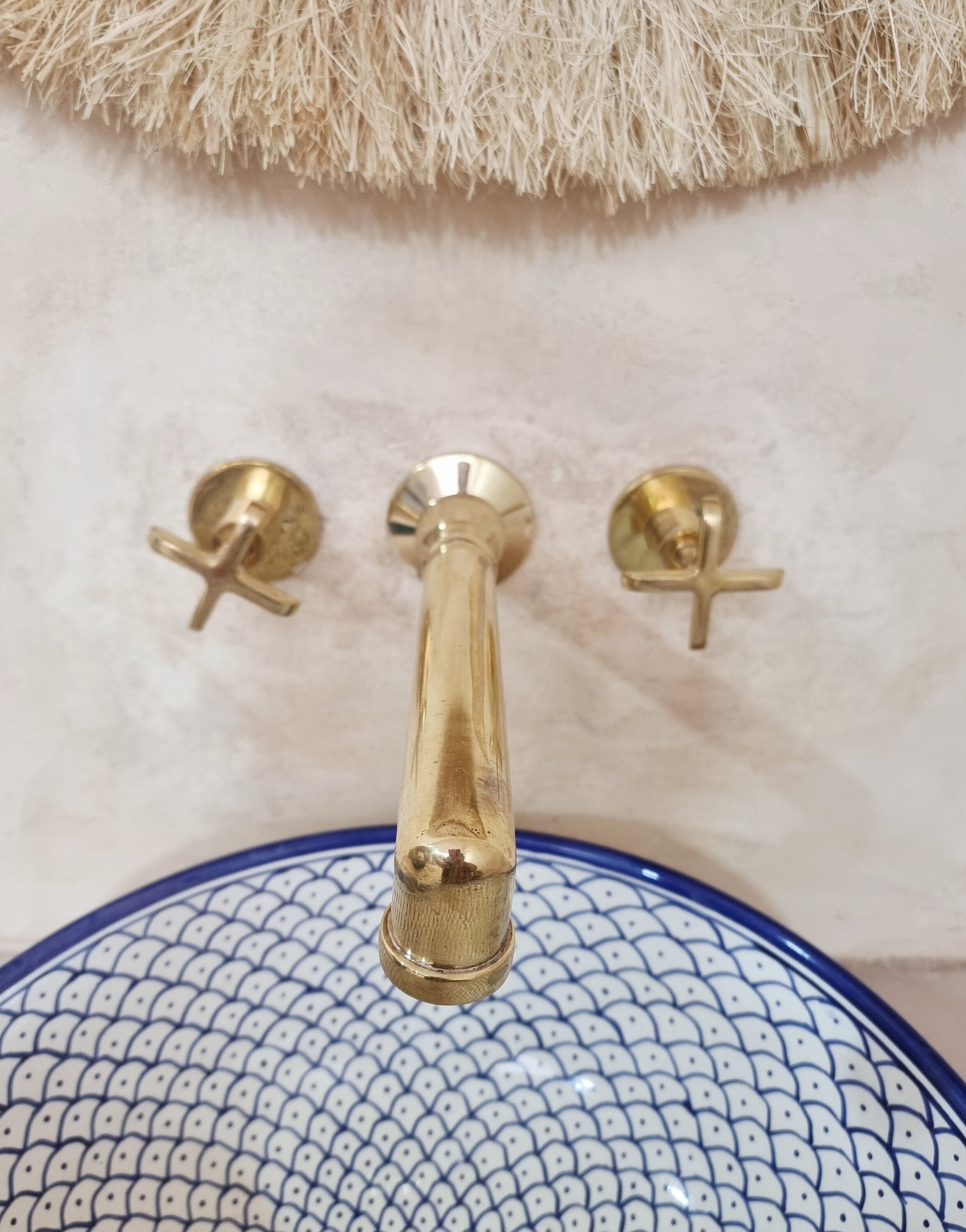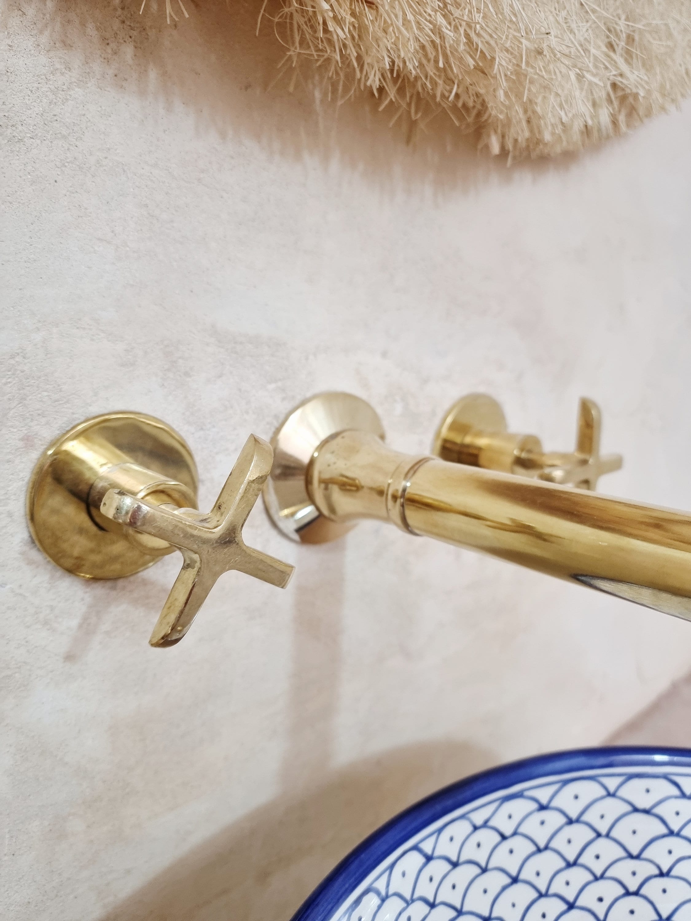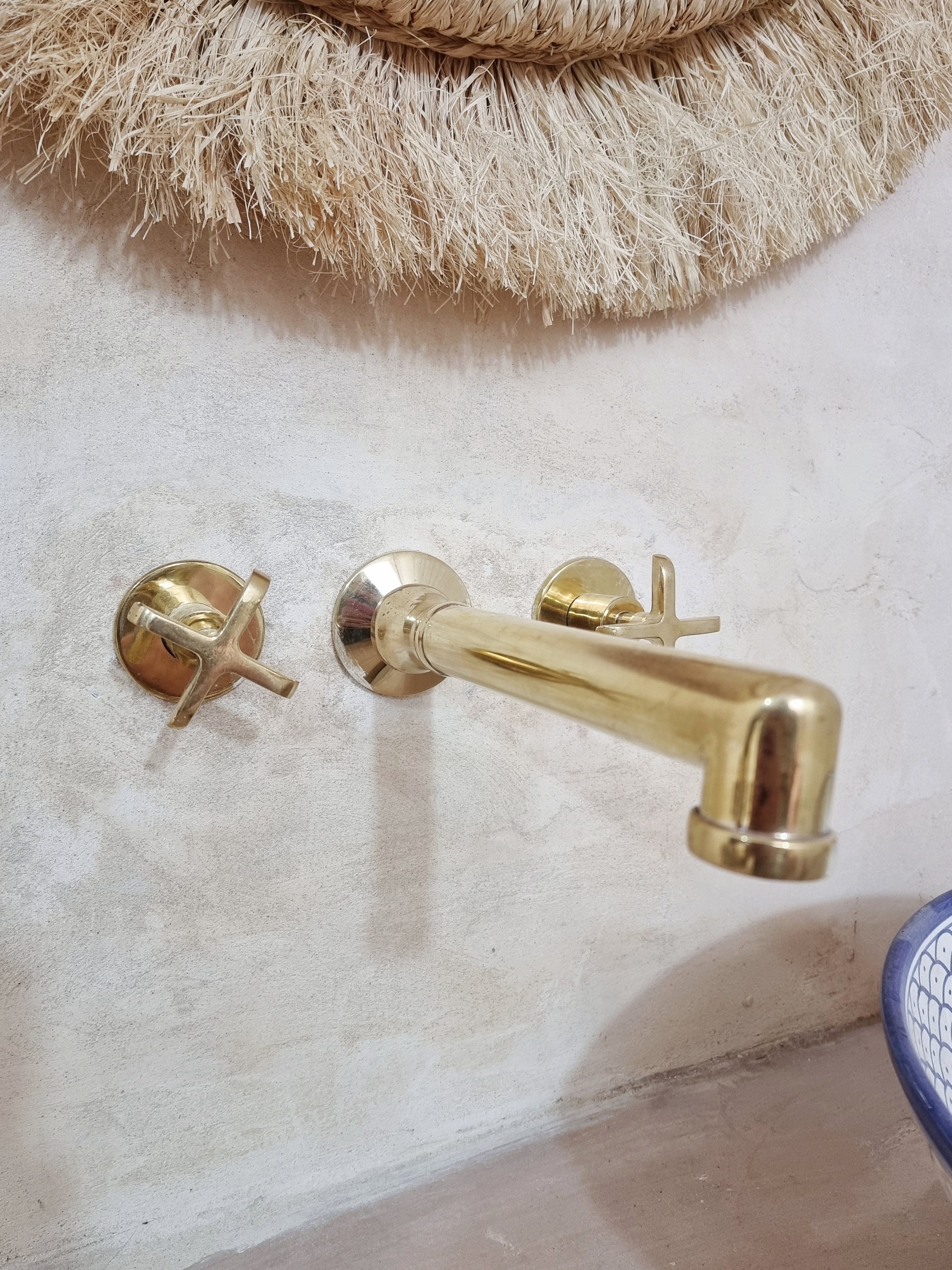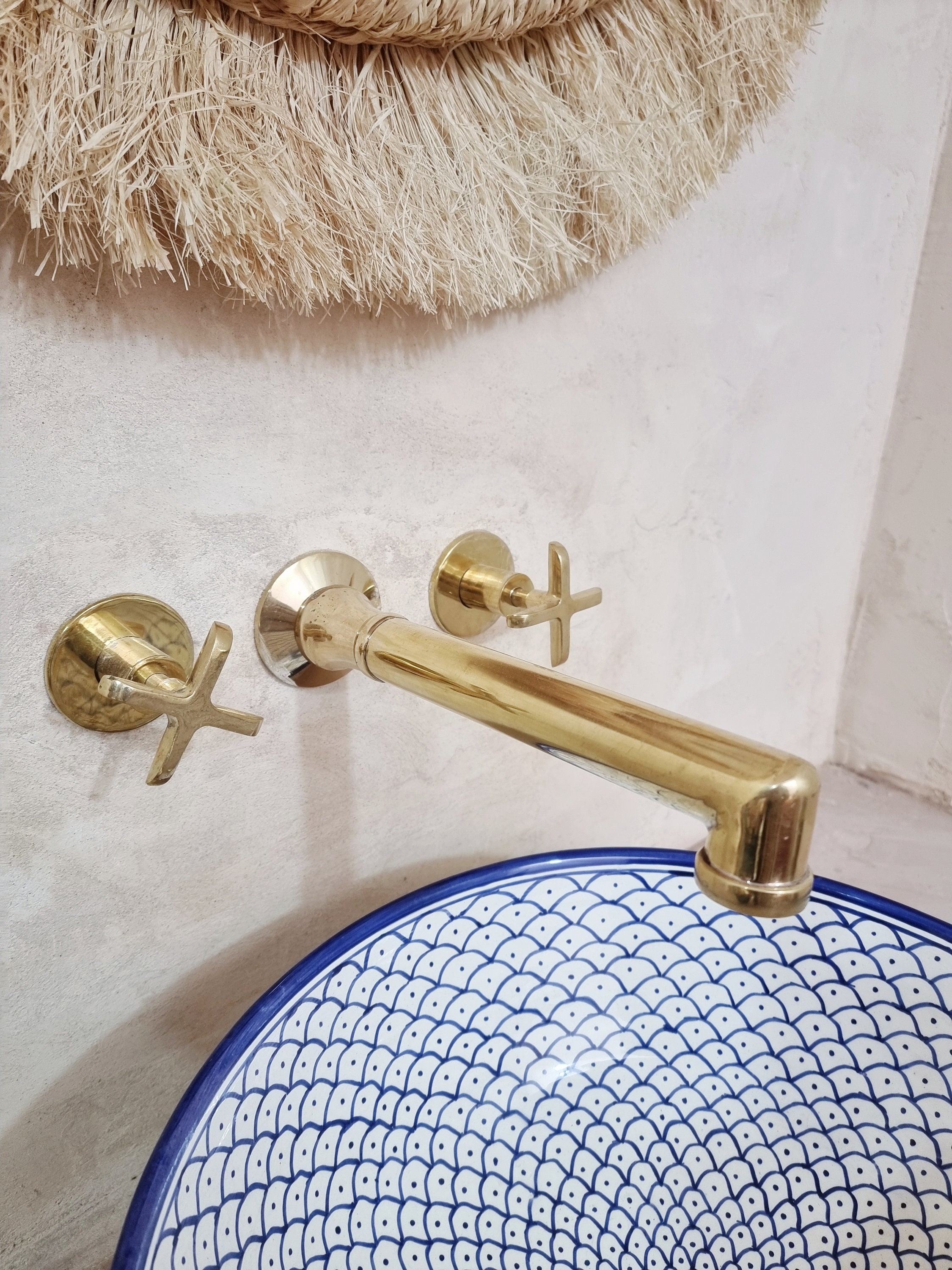 A Moroccan brass wall-mounted faucet with two handles is a stunning and practical addition to any bathroom or kitchen, combining timeless style with exceptional durability. Crafted from high-quality brass, these faucets are resistant to corrosion and built to last. The wall-mounted design adds a sleek and modern touch while saving countertop space.