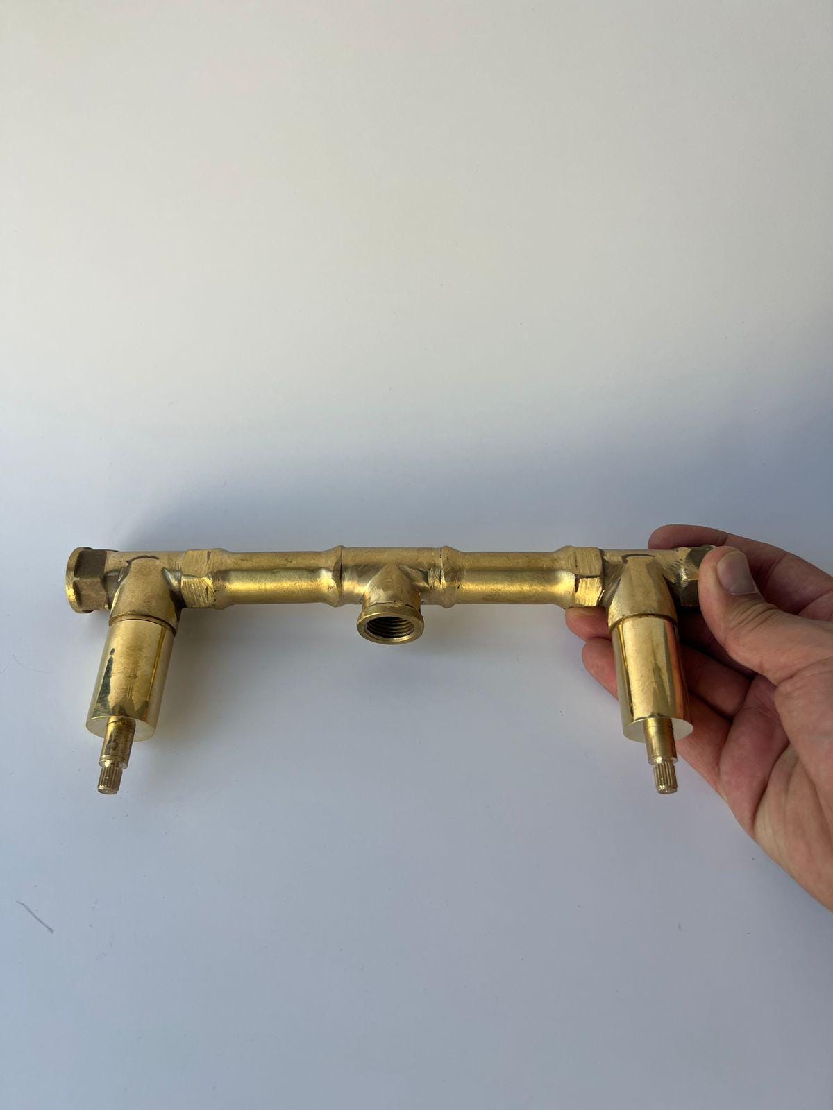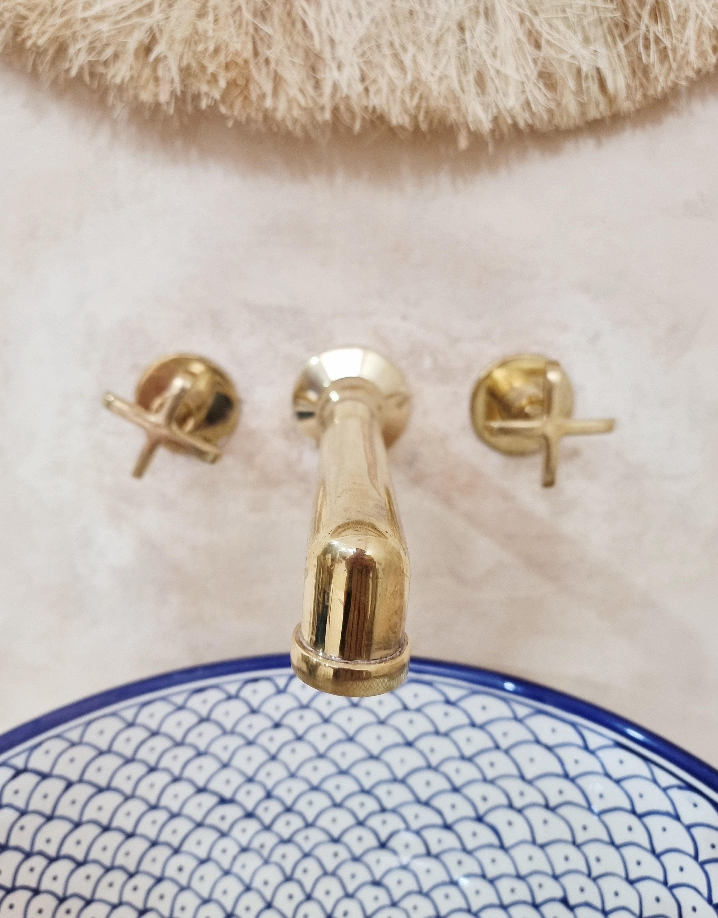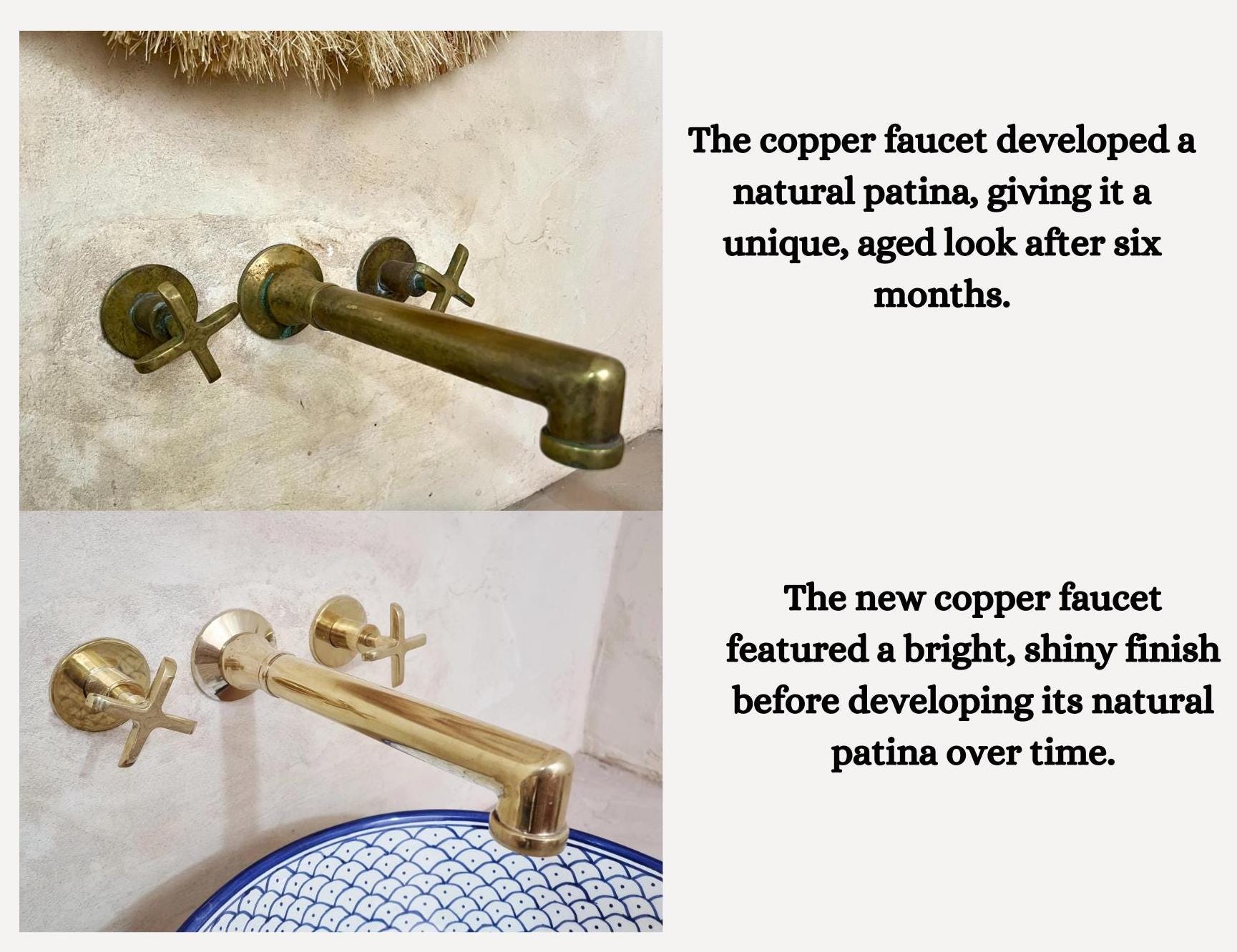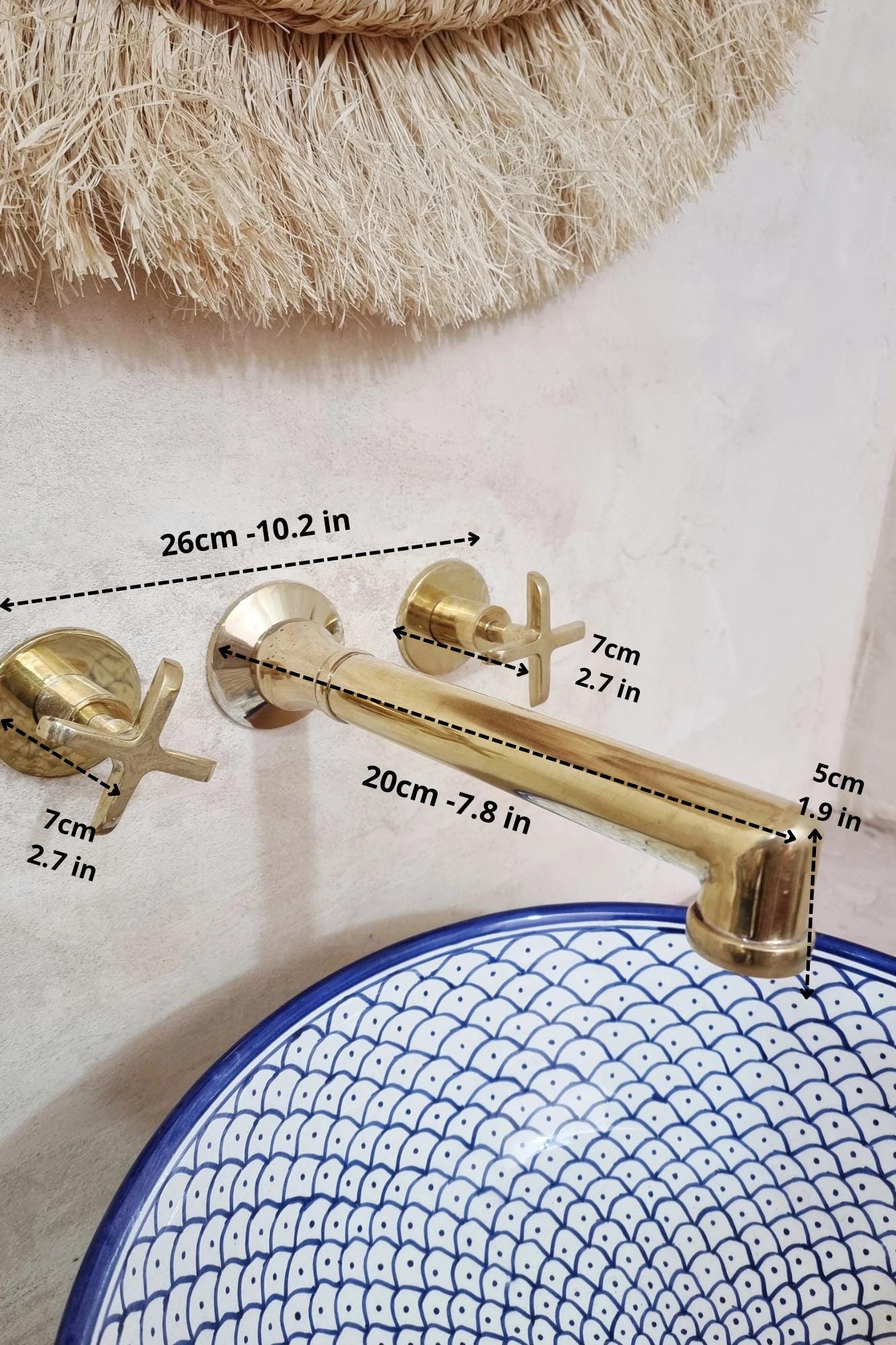 - Place Origin: Morocco ( FEZ ) - Materials: Solid brass ( Copper ) - Color: Brass - Valve ( Put inside wall ) Included - Size: ( Between Handles ) 26 cm / 10.2 inche. ( Faucet Length ) 20 cm / 7.8 inches - Please which handle style you prefer for your Faucet : 1, 2, or 3.