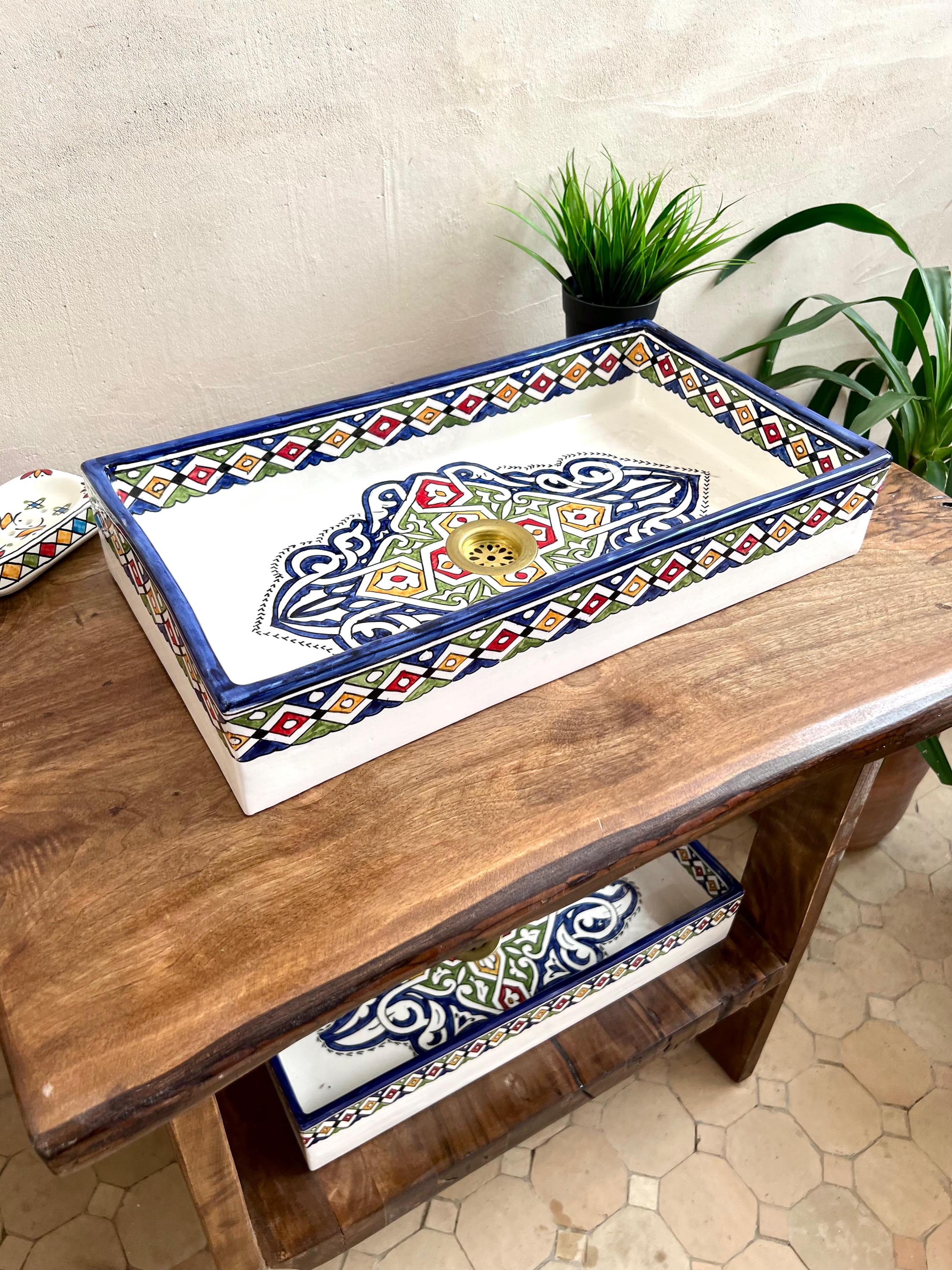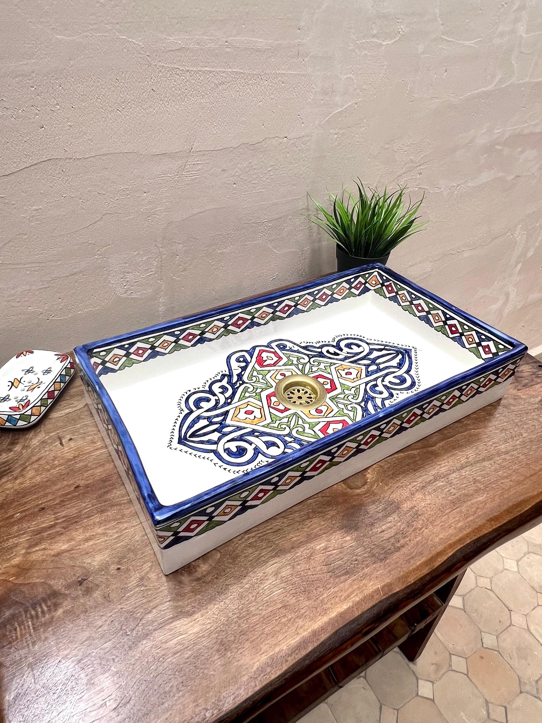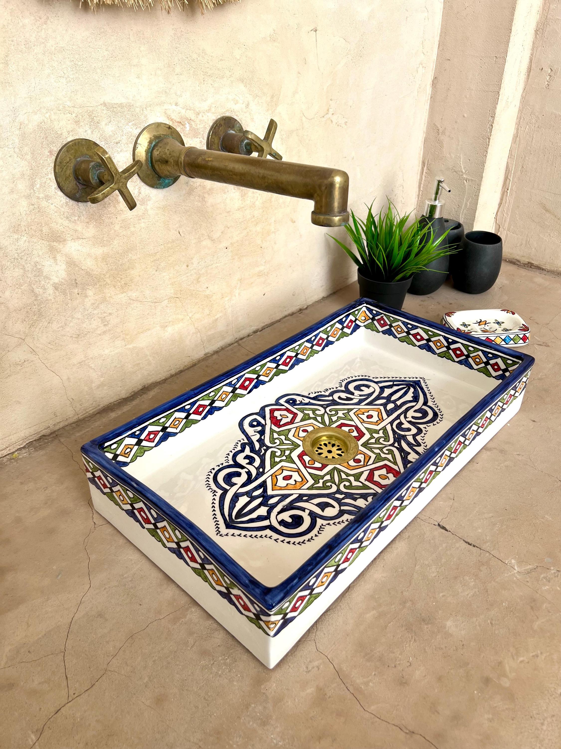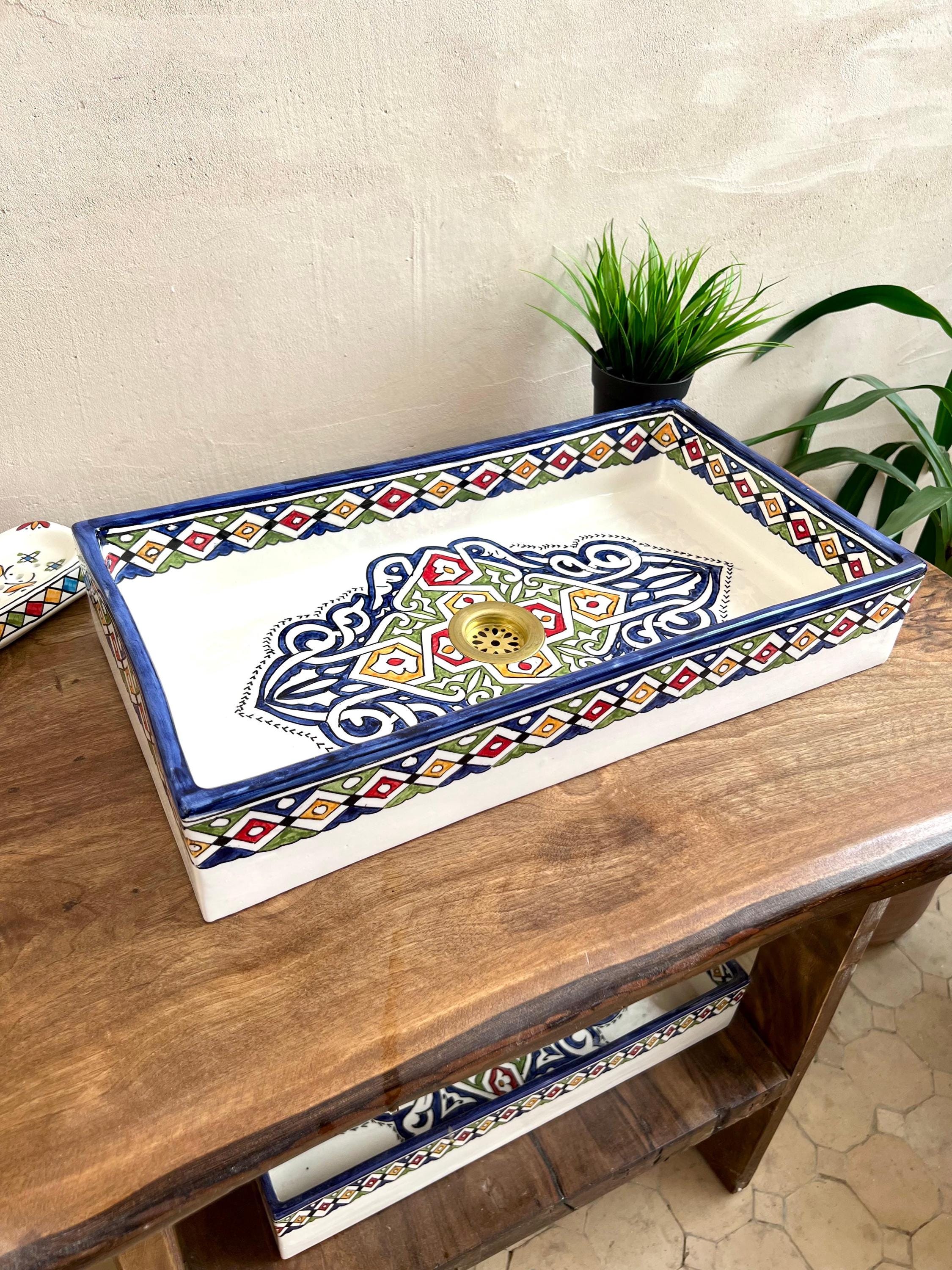 This beautiful Moroccan rectangular sink is handmade by skilled artisans using high-quality ceramic. Featuring traditional hand-painted designs and a smooth glazed finish, it is both durable and easy to clean. Perfect for kitchens, bathrooms, or powder rooms, it adds a unique touch of Moroccan charm to any space. The sink comes with both silver and copper drains included for free. If you need a different size, feel free to contact us.