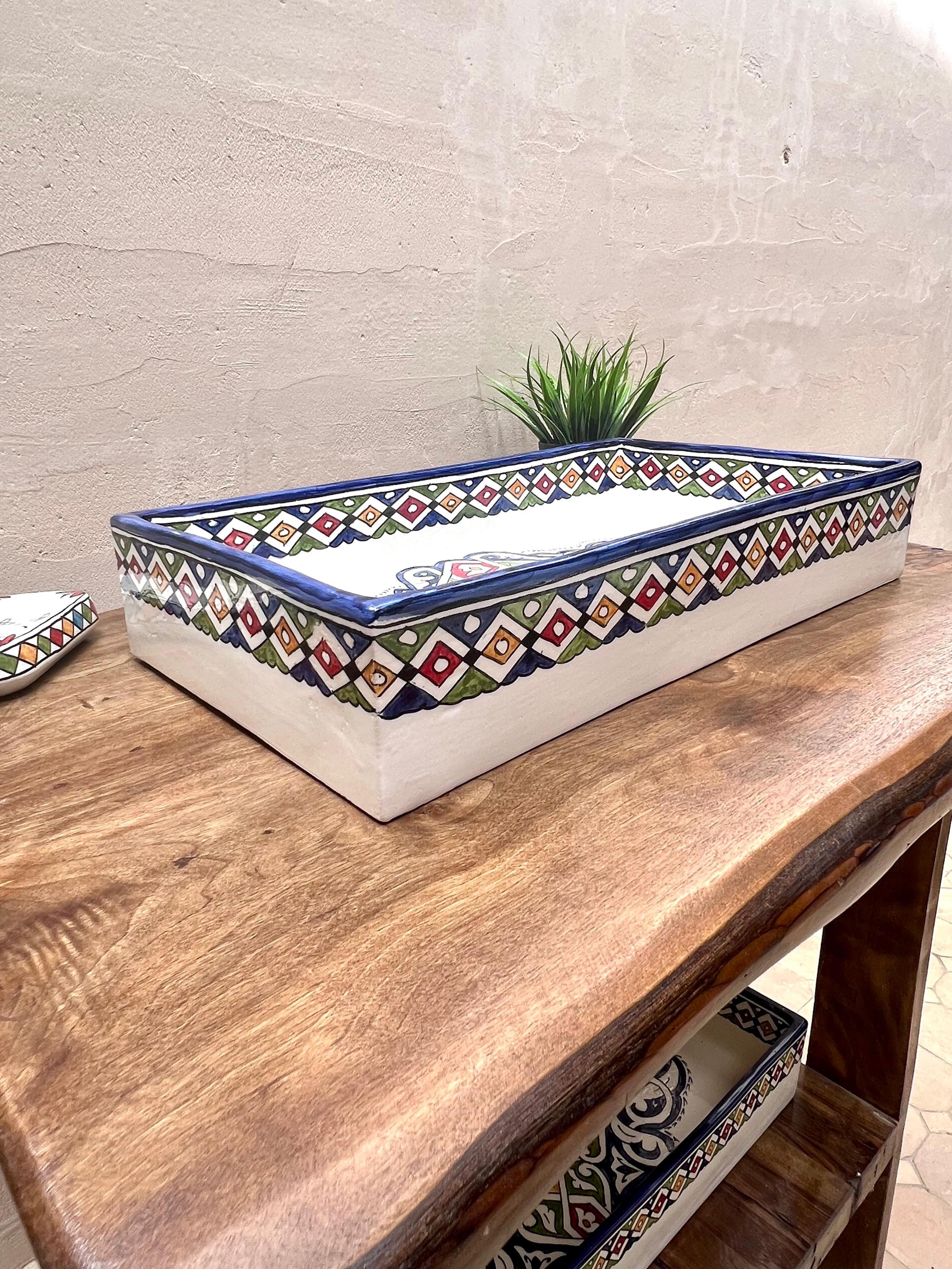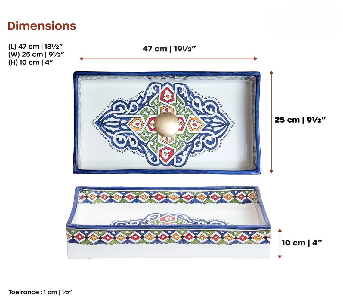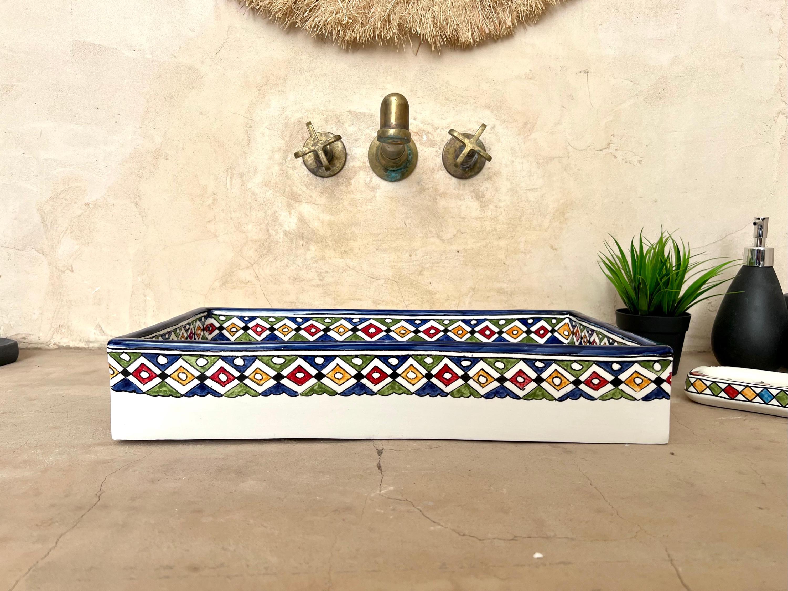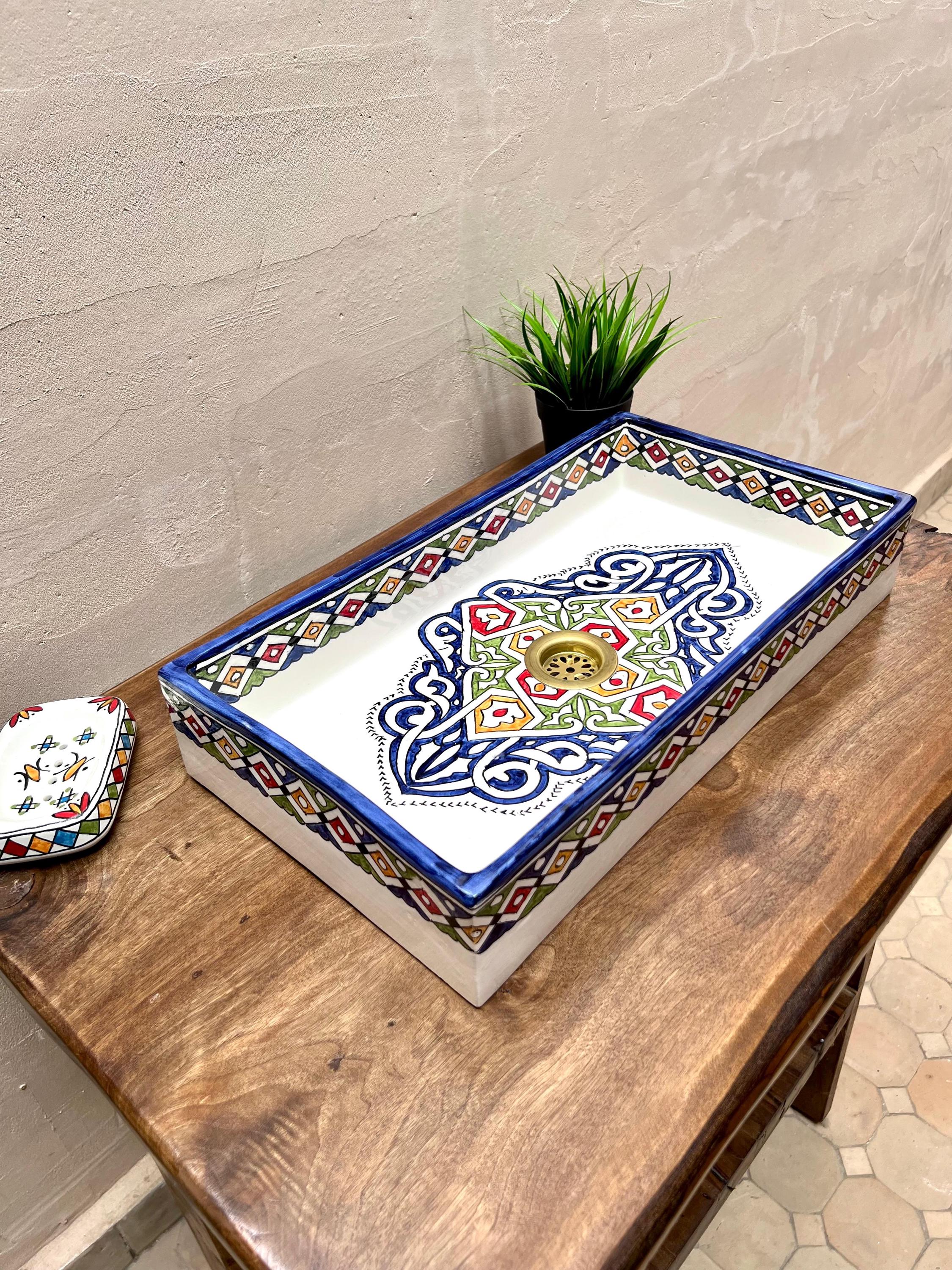 This beautiful Moroccan rectangular sink is handmade by skilled artisans using high-quality ceramic. Featuring traditional hand-painted designs and a smooth glazed finish, it is both durable and easy to clean. Perfect for kitchens, bathrooms, or powder rooms, it adds a unique touch of Moroccan charm to any space. The sink comes with both silver and copper drains included for free. If you need a different size, feel free to contact us.