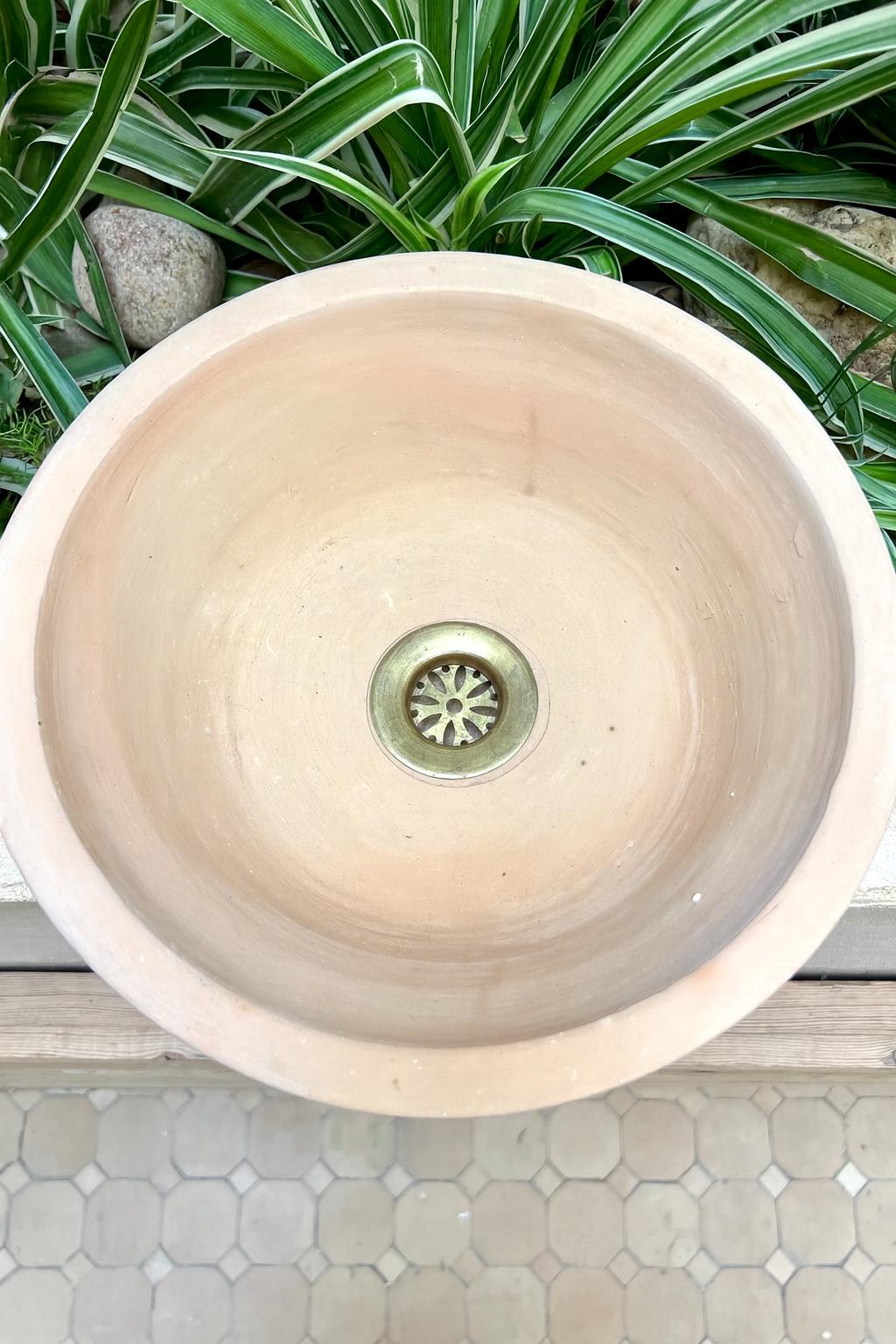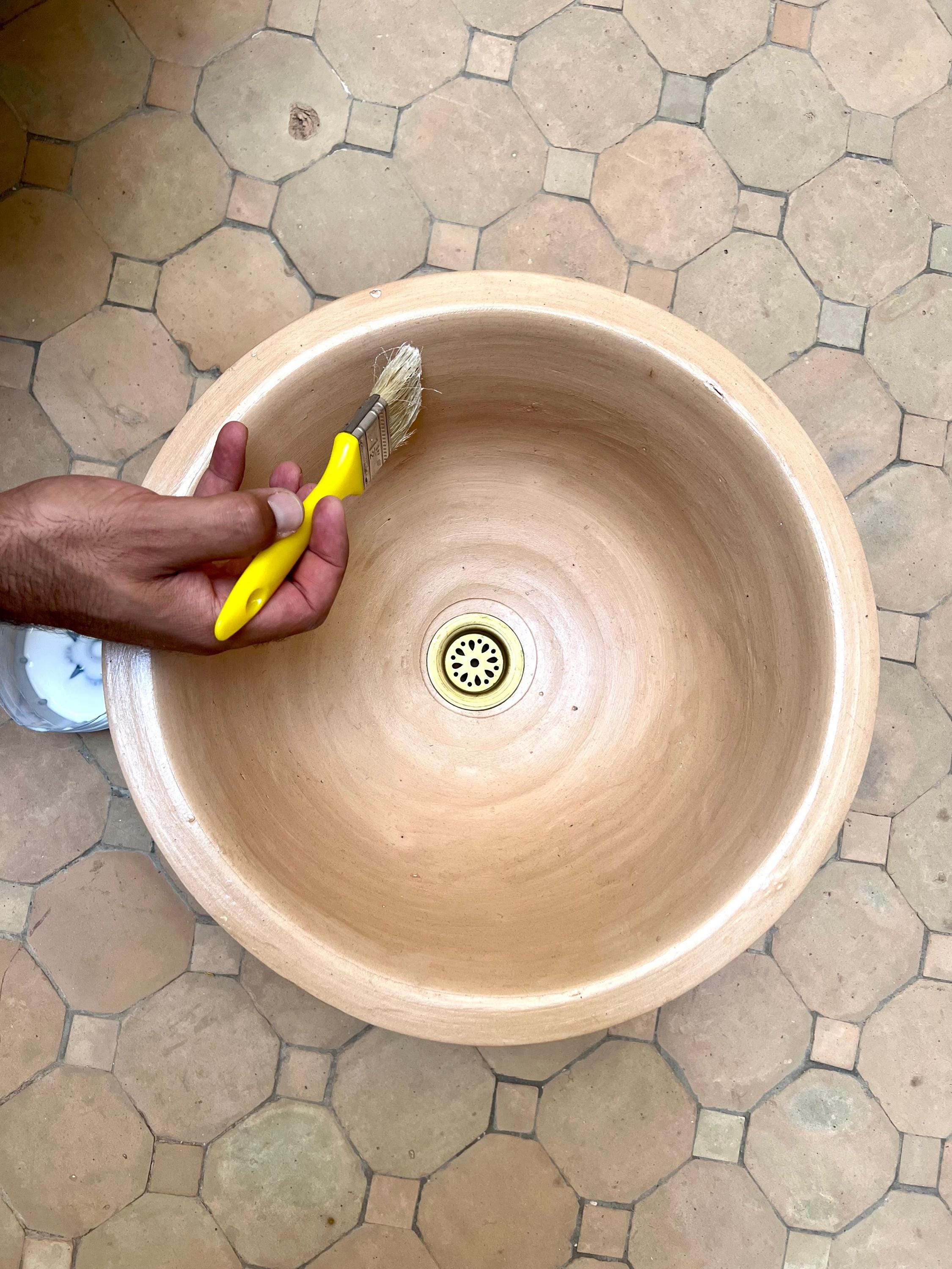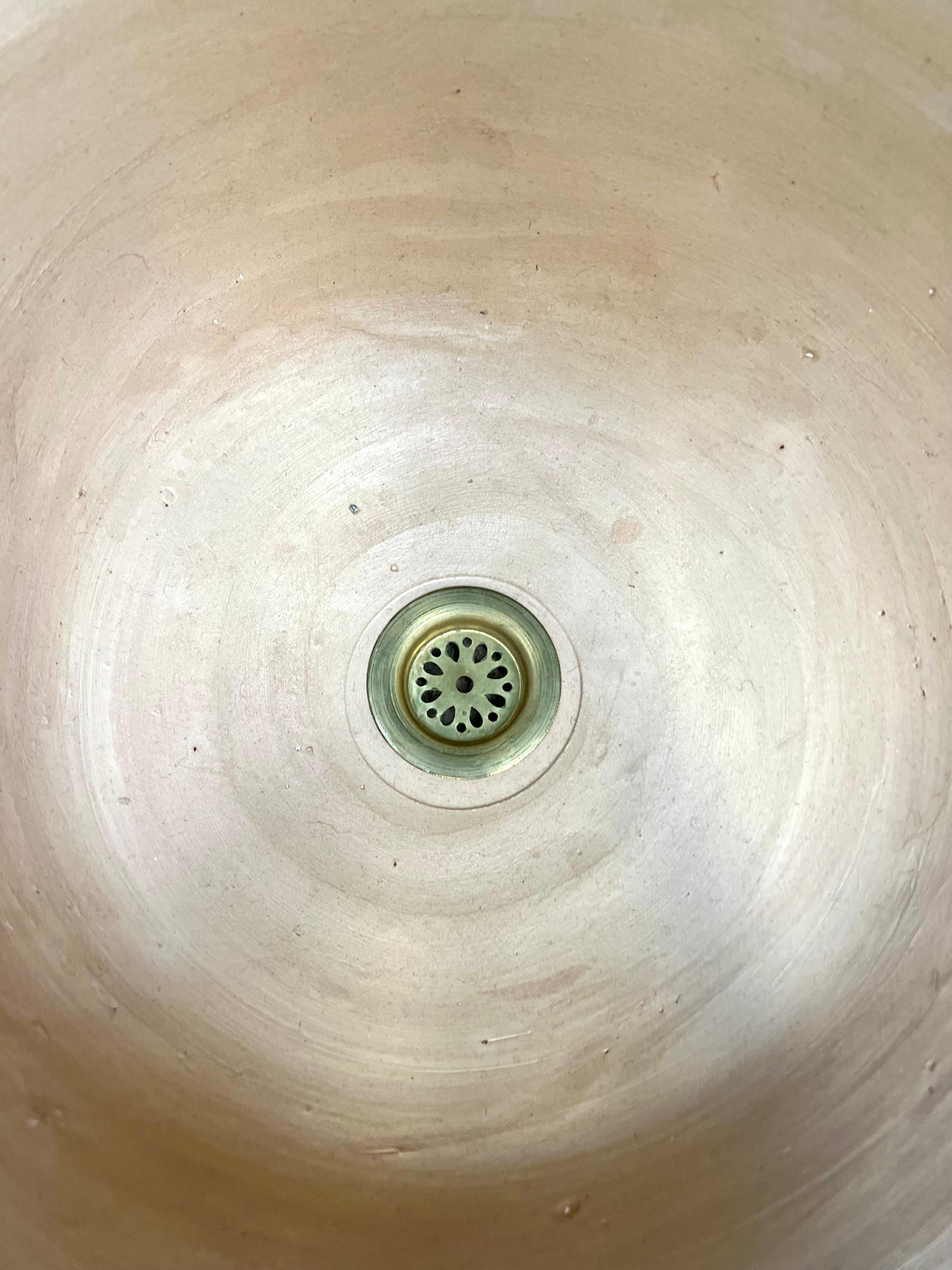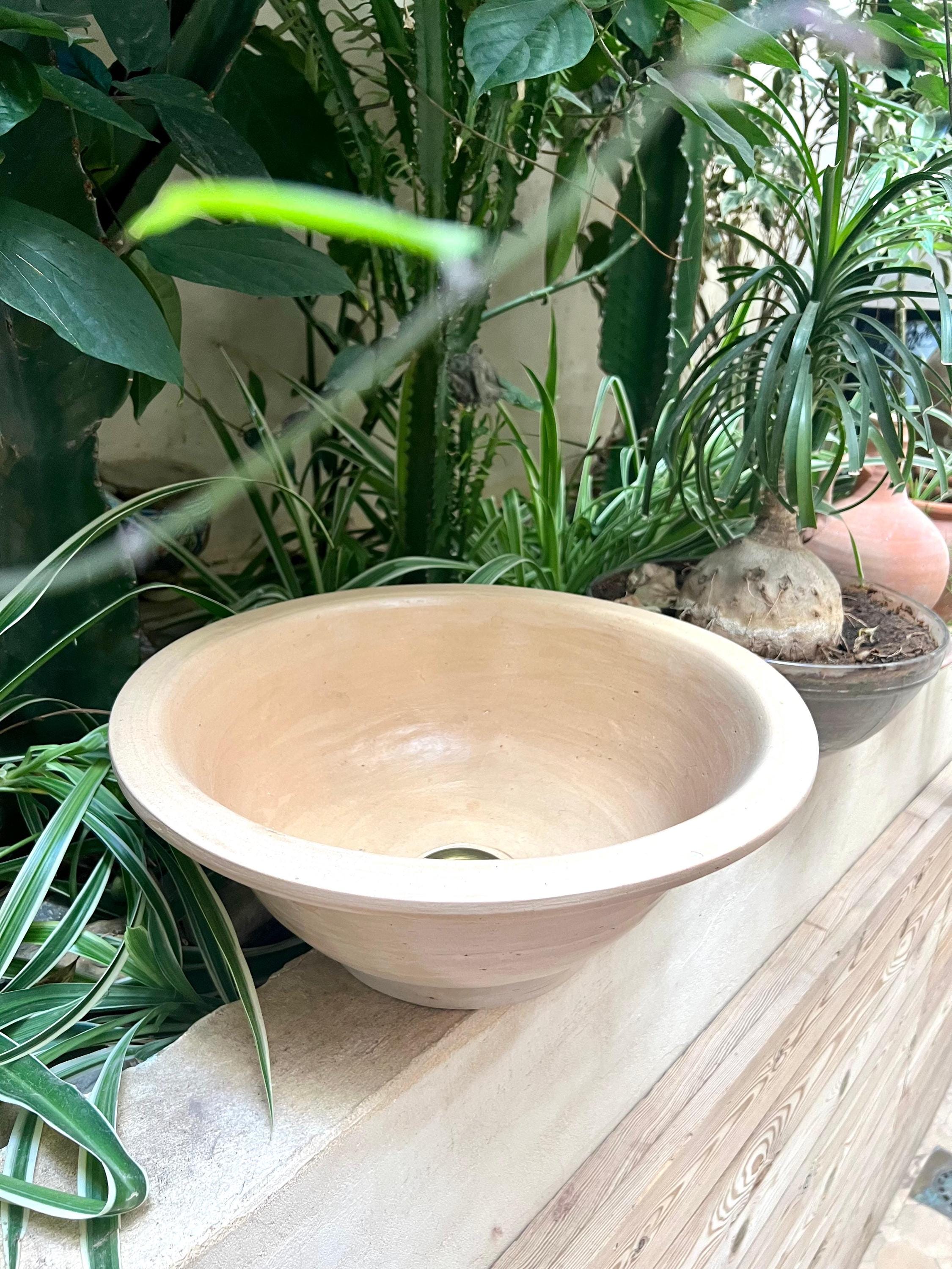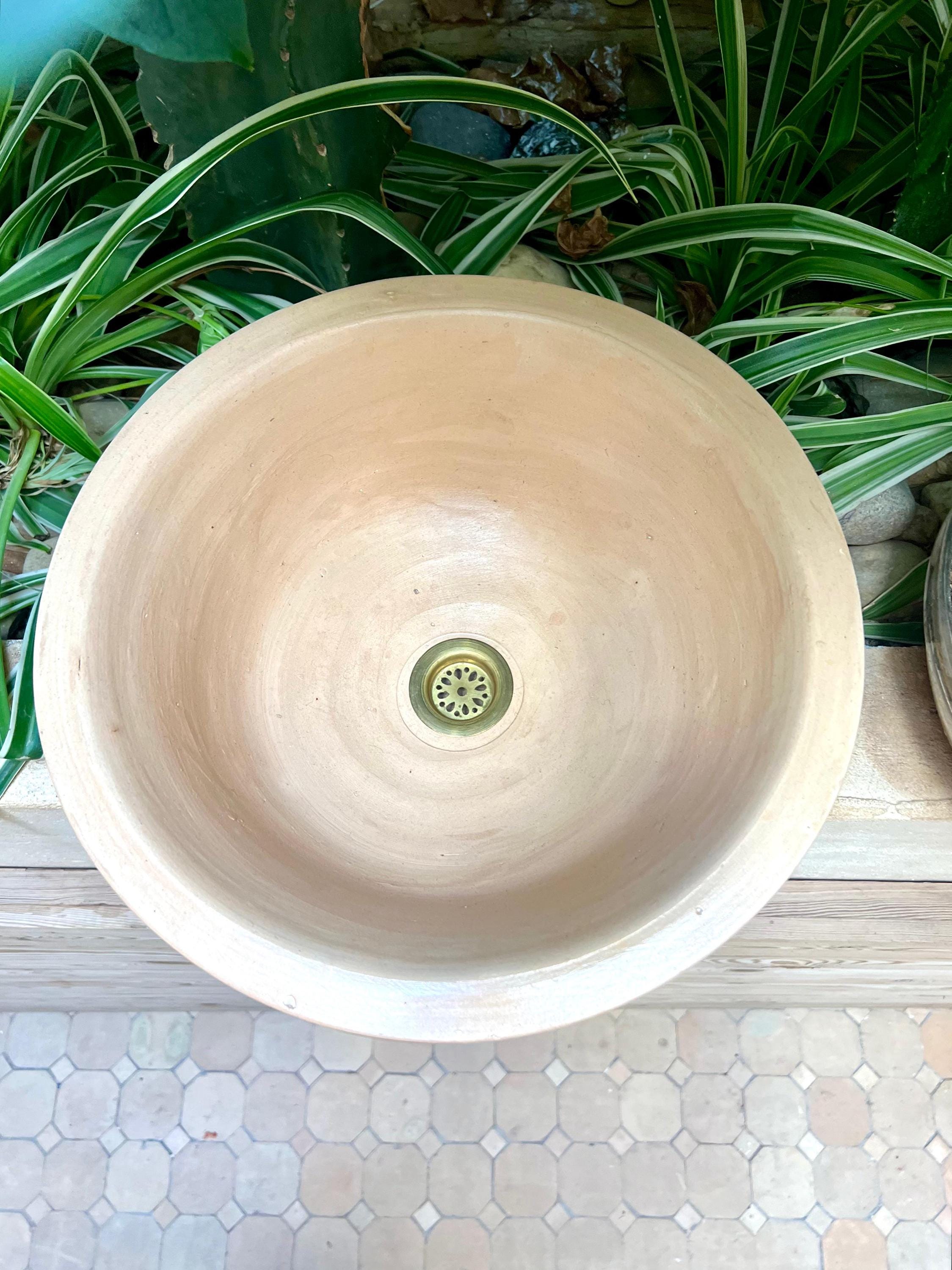This beautiful Moroccan round ceramic sink is handcrafted by skilled artisans in Fes, made from high-quality clay, and features intricate designs with a smooth terracota. Made from high-quality Clay, it is durable, easy to clean, and perfect for bathrooms, kitchens, or powder rooms. Its timeless design adds a touch of Moroccan elegance to any space. The sink comes with both silver and copper drains included for free. Each piece is truly unique, and as a result, minor imperfections are to be expected. If you need a different size, feel free to contact us.