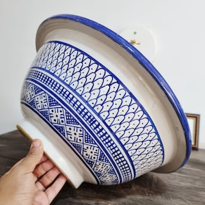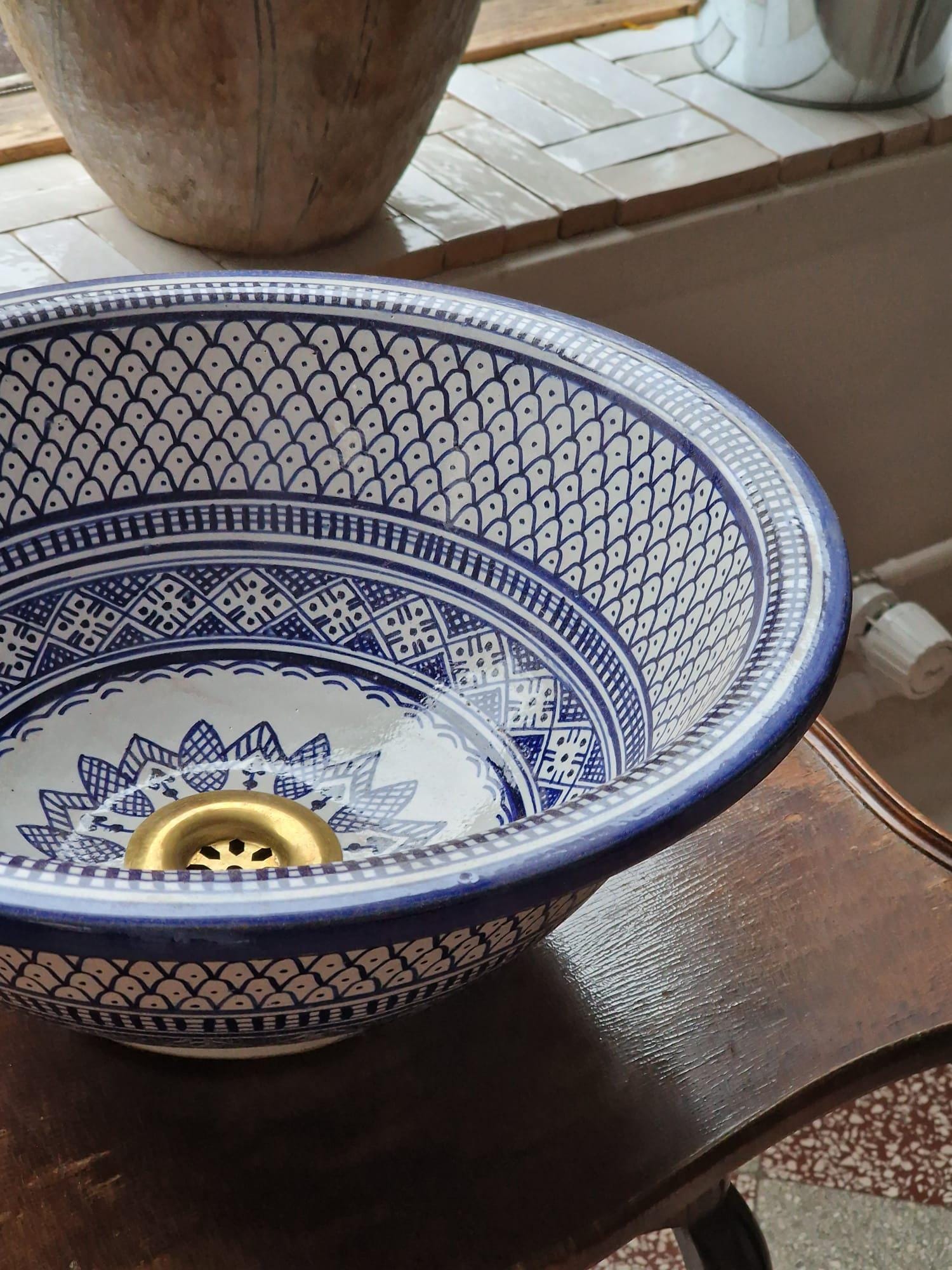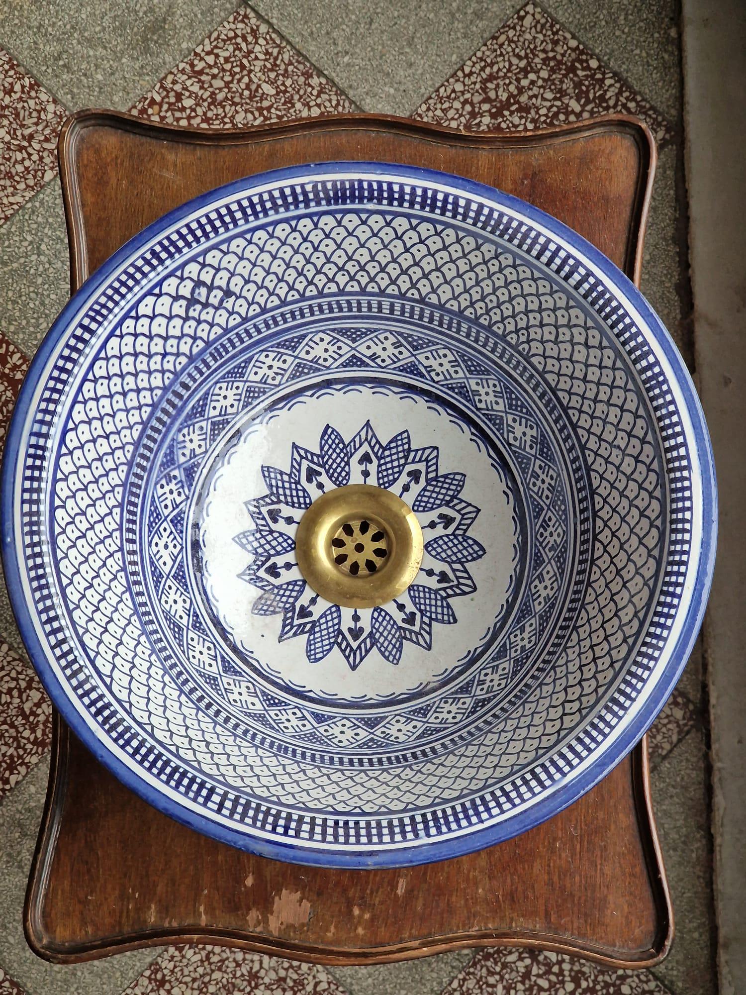 This beautiful Moroccan round ceramic sink is handcrafted by skilled artisans in Fes, made from high-quality clay, and features intricate hand-painted designs with a smooth glazed finish. Made from high-quality ceramic, it is durable, easy to clean, and perfect for bathrooms, kitchens, or powder rooms. Its timeless design adds a touch of Moroccan elegance to any space. The sink comes with both silver and copper drains included for free. Each piece is truly unique, and as a result, minor imperfections are to be expected. If you need a different size, feel free to contact us.
