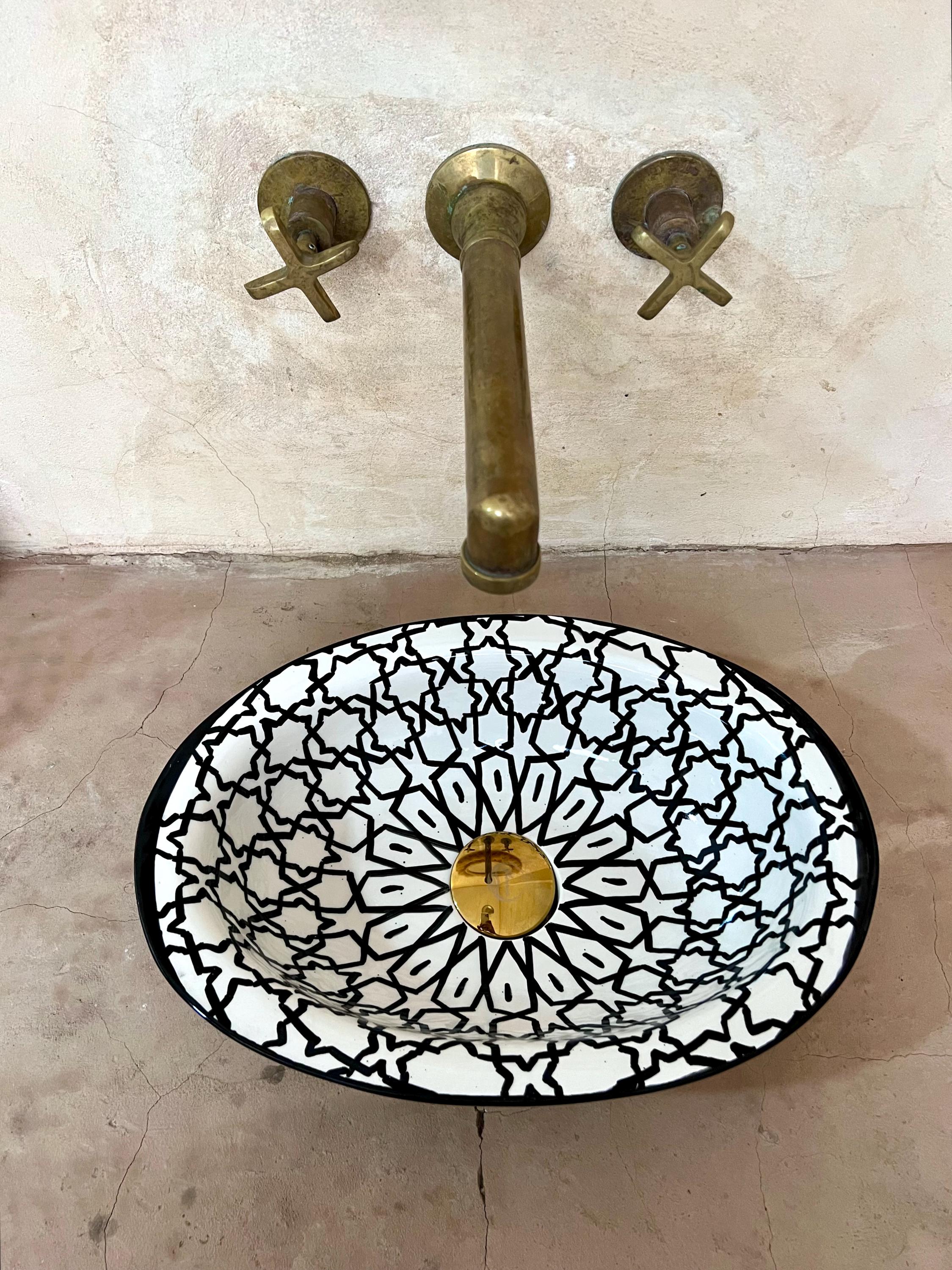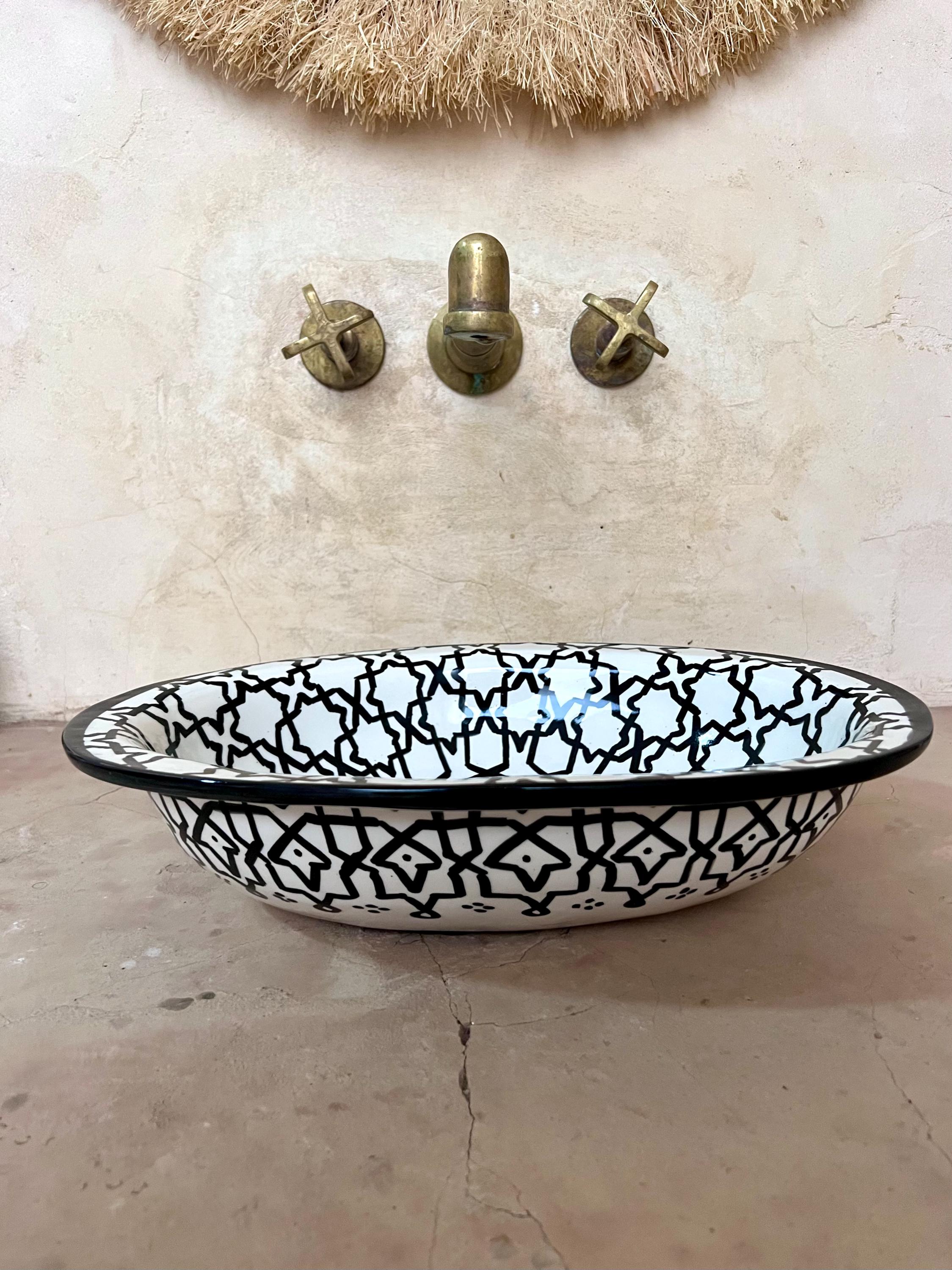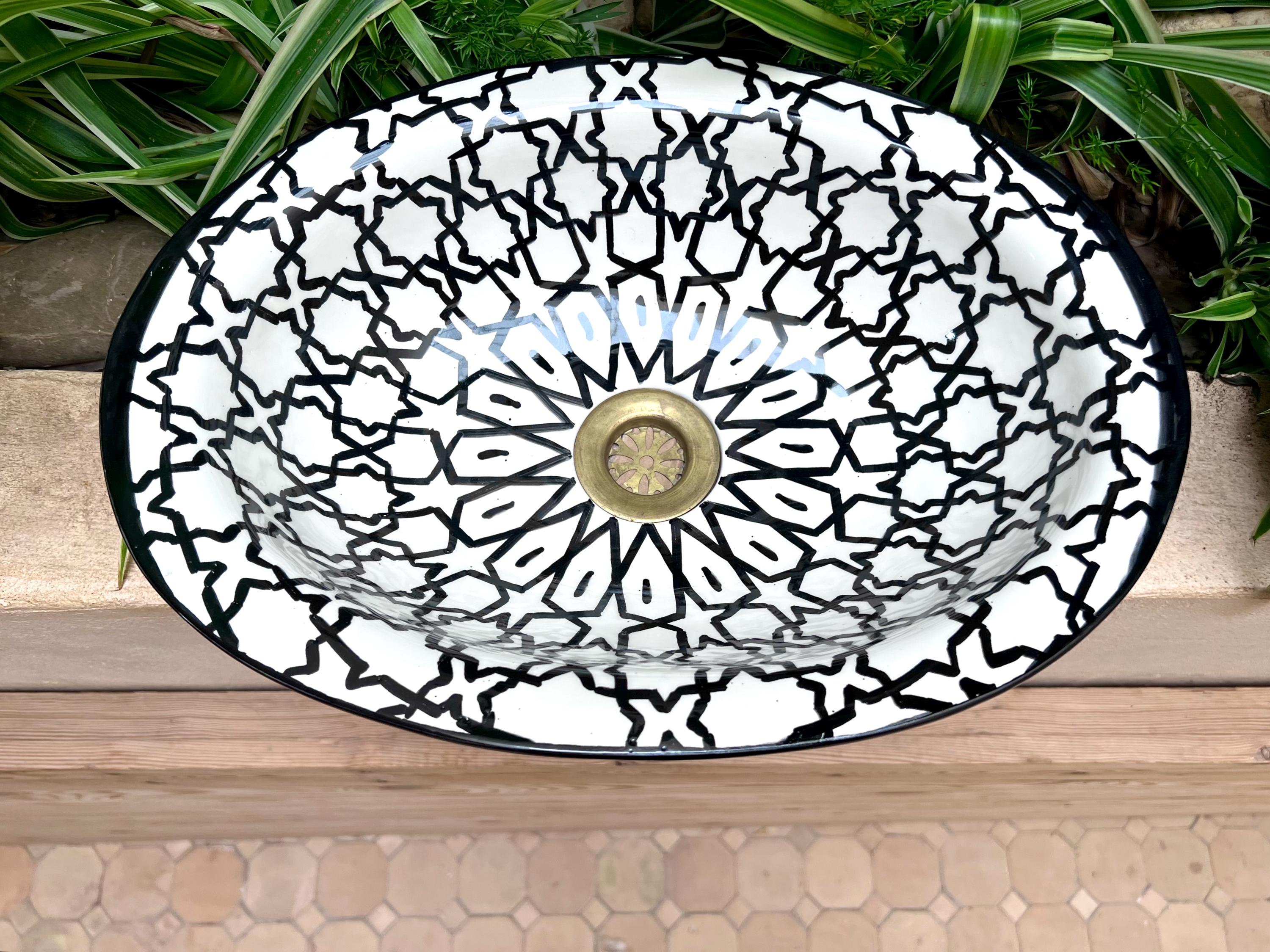 This beautiful Moroccan Oval ceramic sink is handcrafted by skilled artisans in Fes, made from high-quality clay, and features intricate hand-painted designs with a smooth glazed finish. Made from high-quality ceramic, it is durable, easy to clean, and perfect for bathrooms, kitchens, or powder rooms. Its timeless design adds a touch of Moroccan elegance to any space. The sink comes with both silver and copper drains included for free. Each piece is truly unique, and as a result, minor imperfections are to be expected. If you need a different size, feel free to contact us.