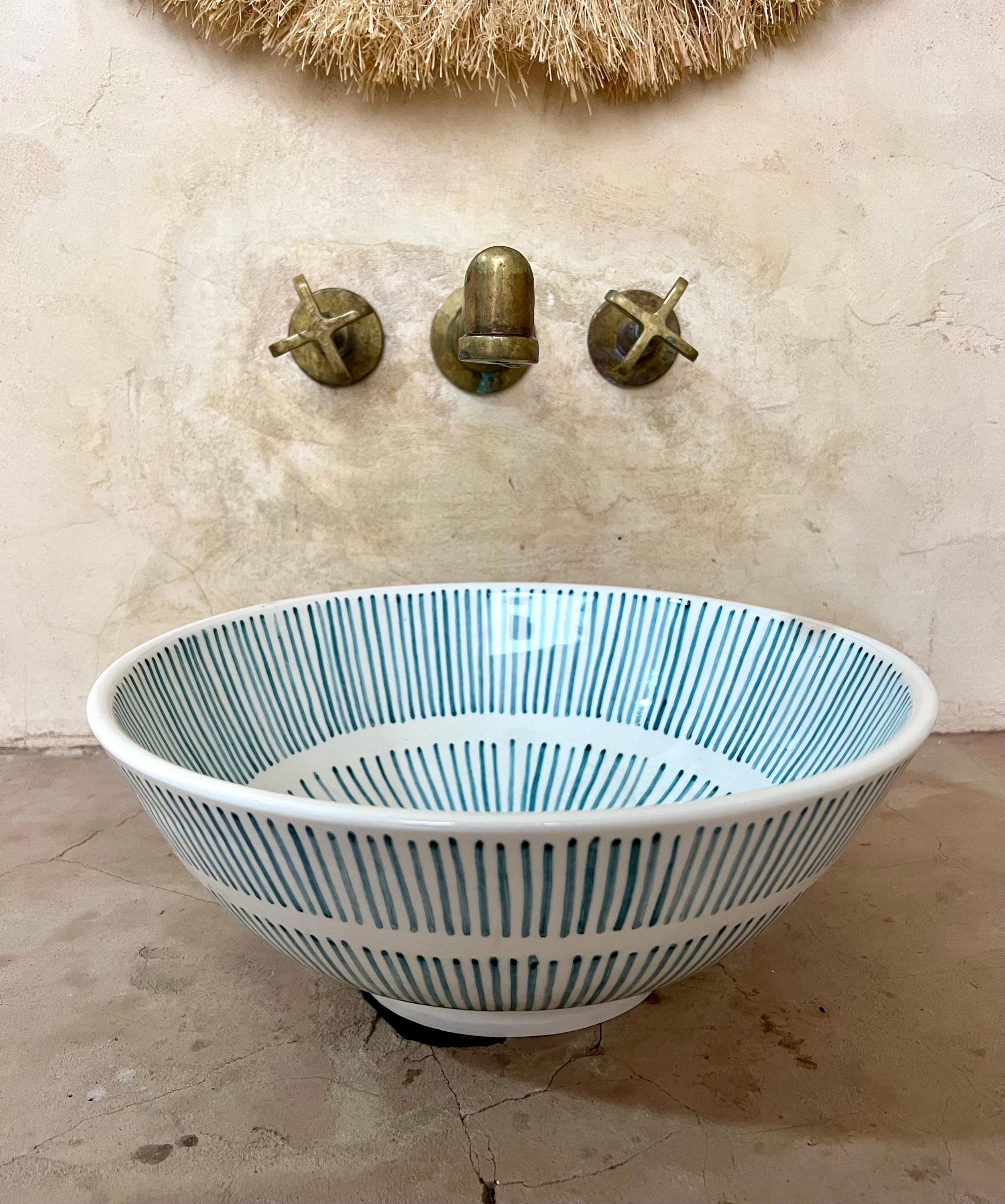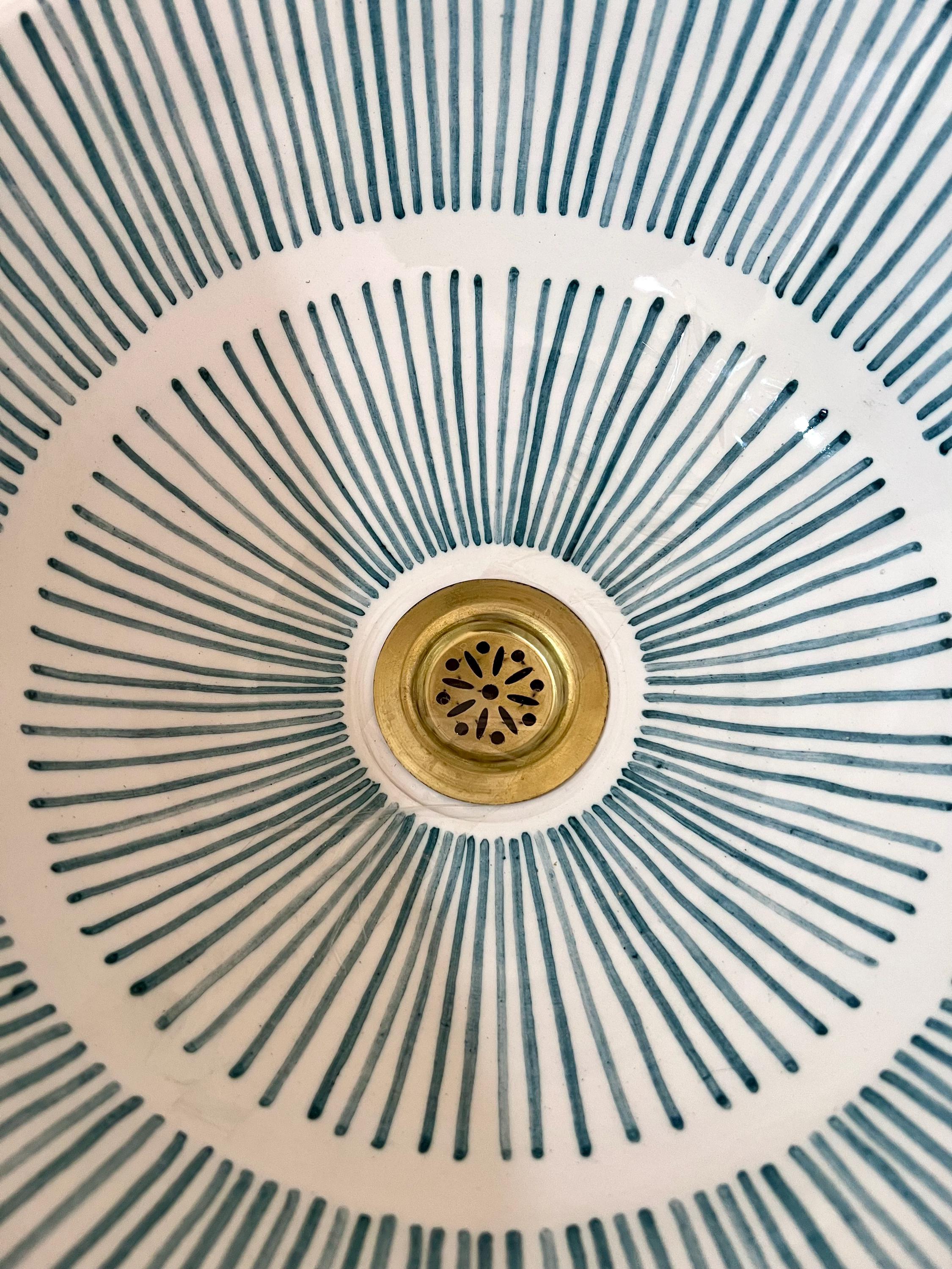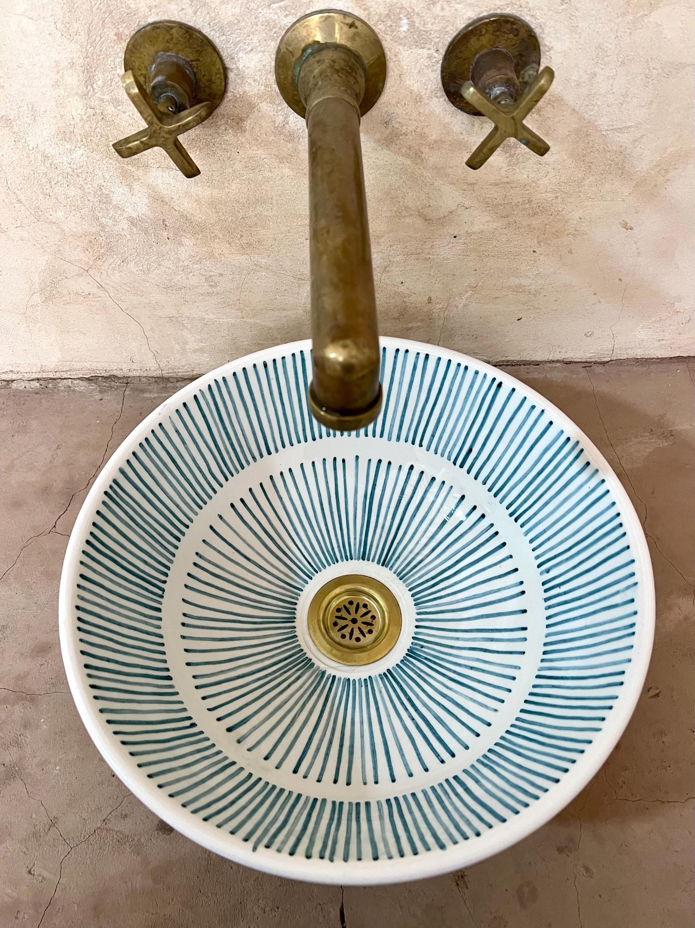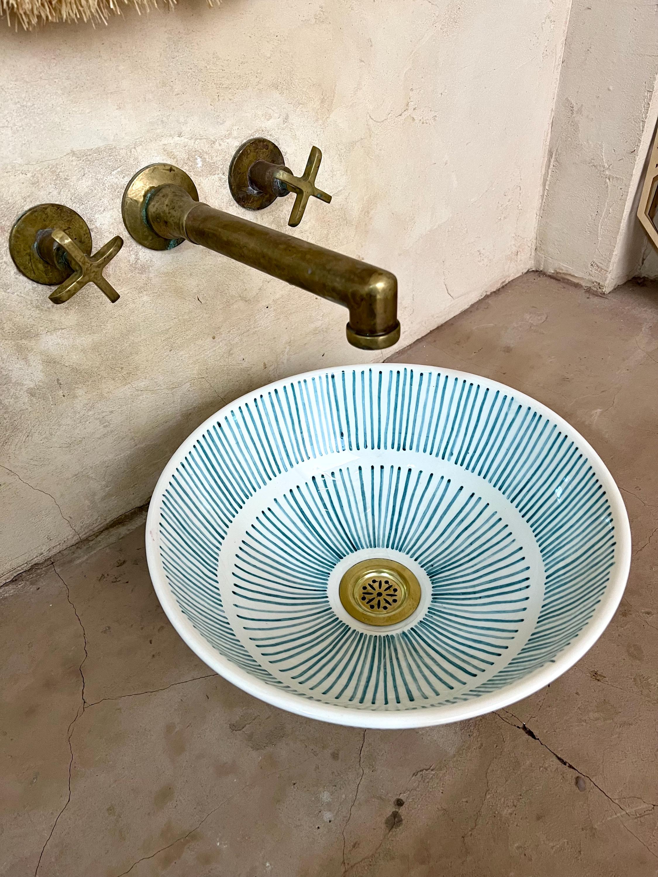 This beautiful Moroccan round ceramic sink is handcrafted by skilled artisans in Fes, made from high-quality clay, and features intricate hand-painted designs with a smooth glazed finish. Made from high-quality ceramic, it is durable, easy to clean, and perfect for bathrooms, kitchens, or powder rooms. Its timeless design adds a touch of Moroccan elegance to any space. The sink comes with both silver and copper drains included for free. Each piece is truly unique, and as a result, minor imperfections are to be expected. If you need a different size, feel free to contact us.
