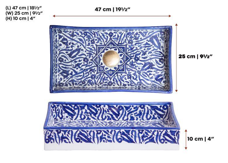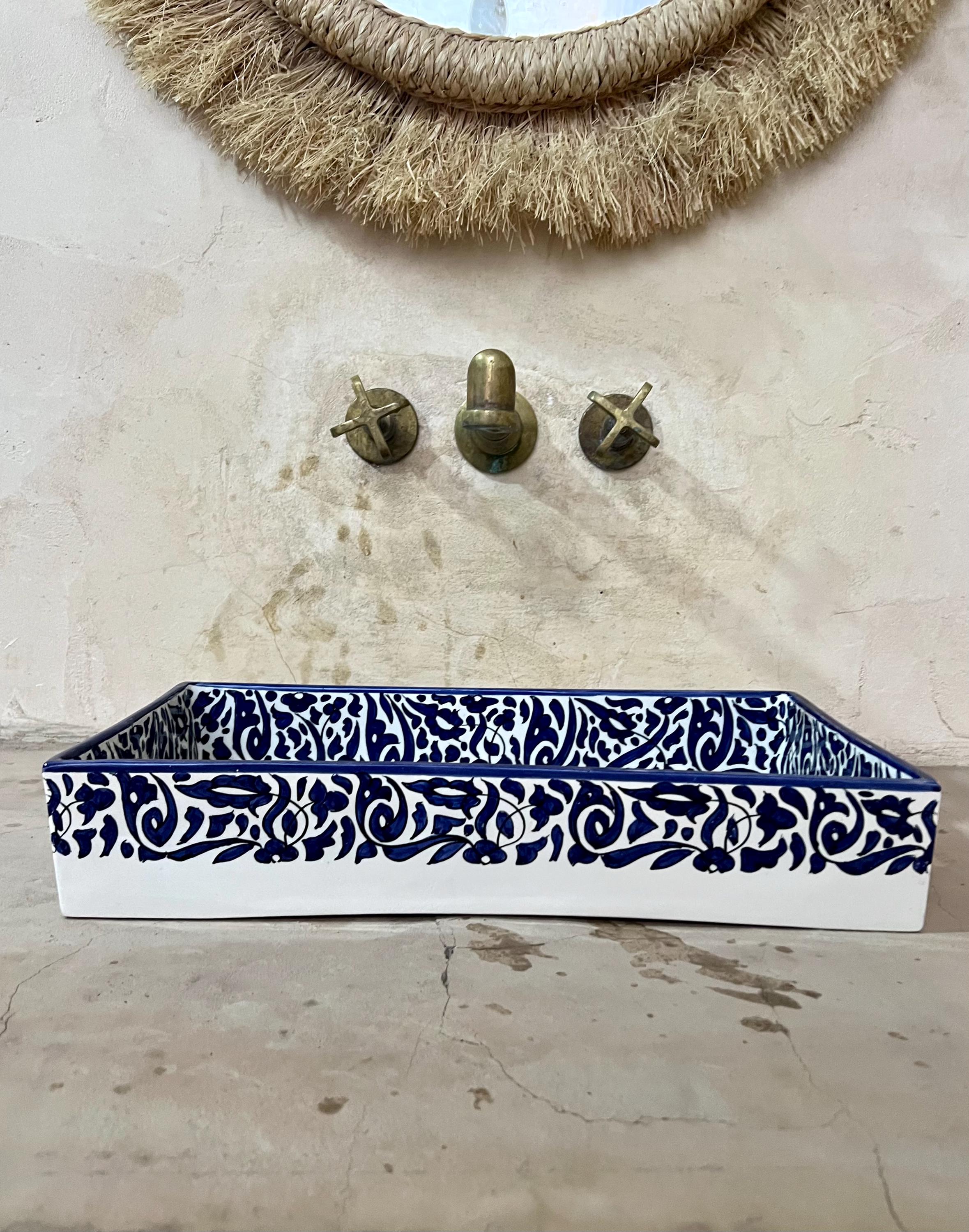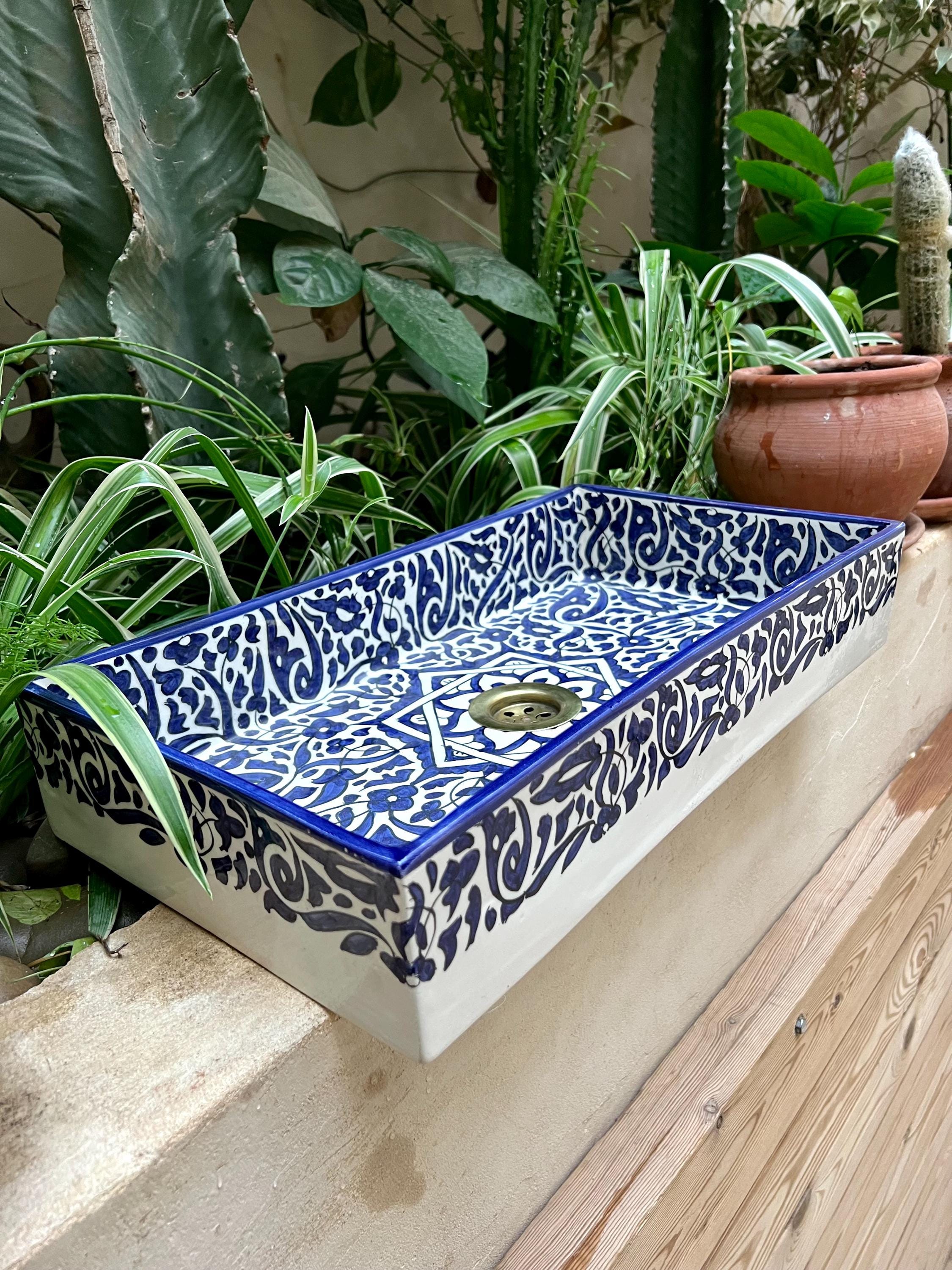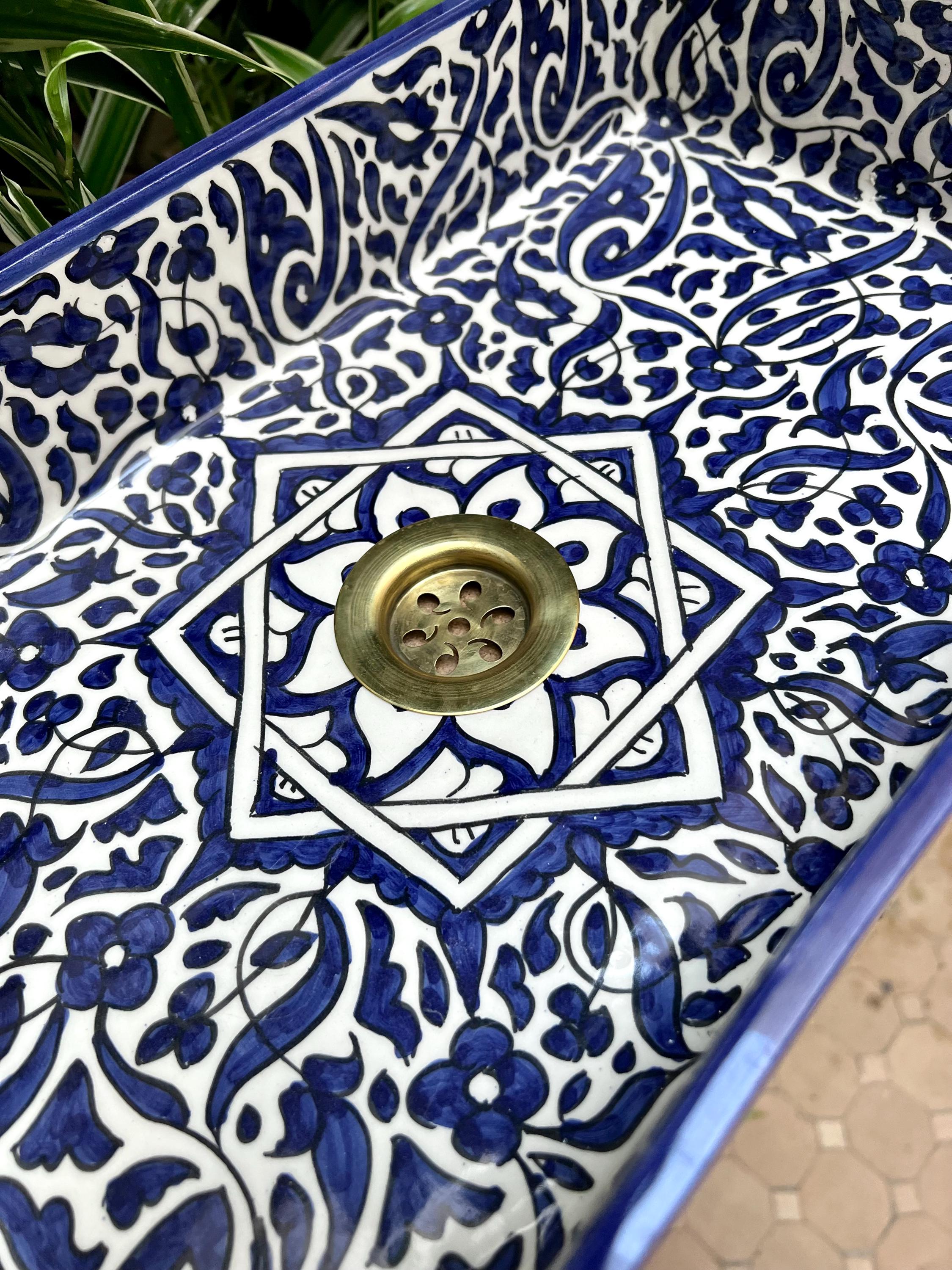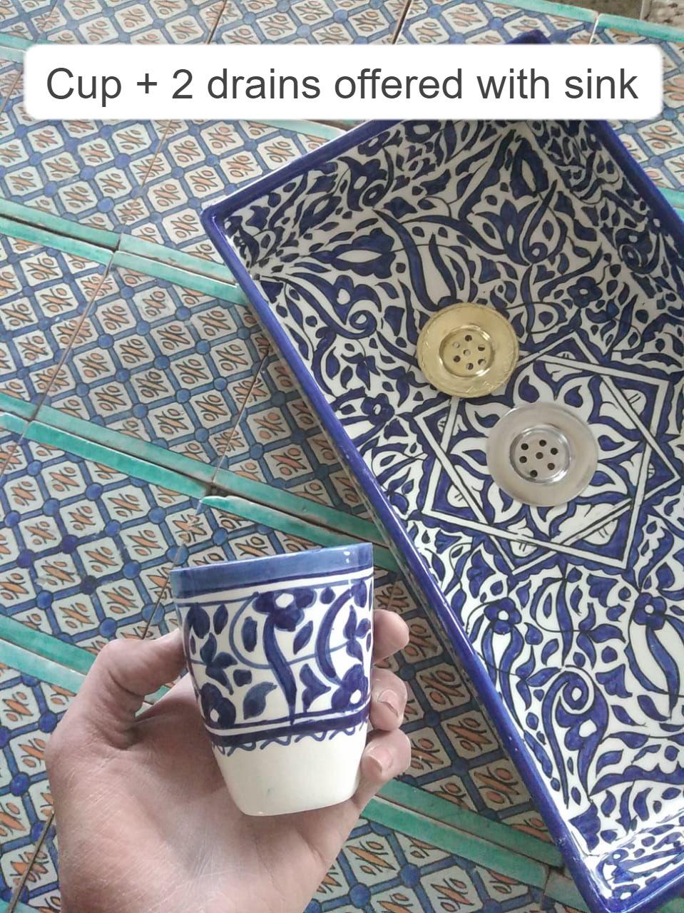 This beautiful Moroccan rectangular sink is handmade by skilled artisans using high-quality ceramic. Featuring traditional hand-painted designs and a smooth glazed finish, it is both durable and easy to clean. Perfect for kitchens, bathrooms, or powder rooms, it adds a unique touch of Moroccan charm to any space. The sink comes with both silver and copper drains included for free. If you need a different size, feel free to contact us.