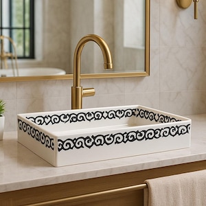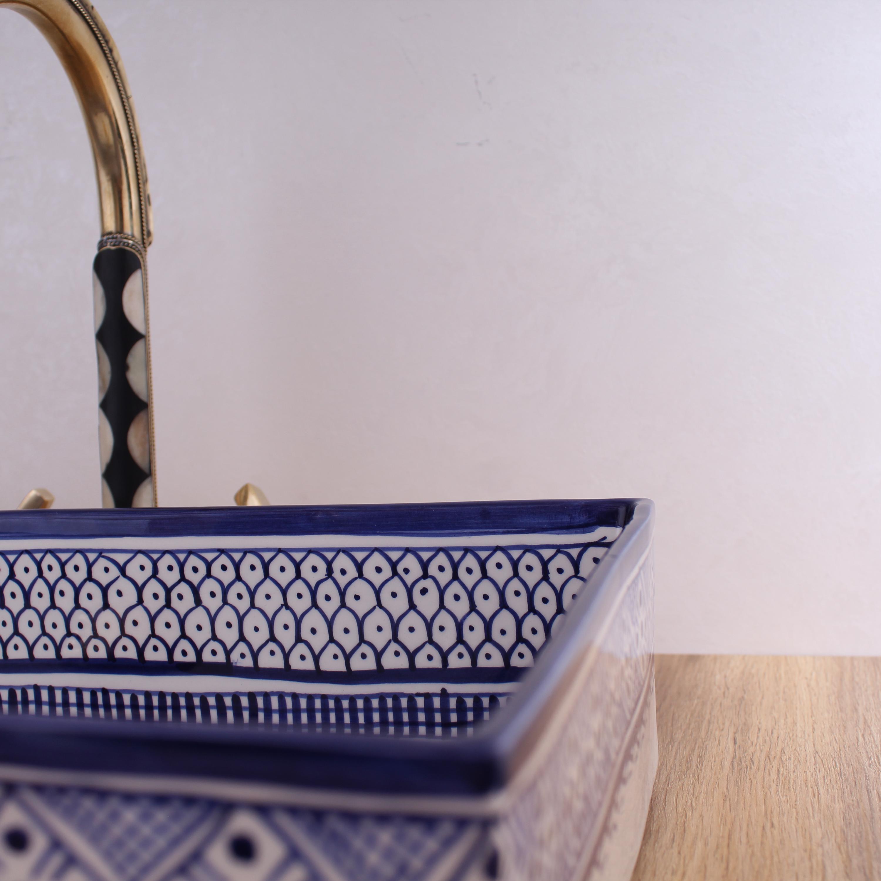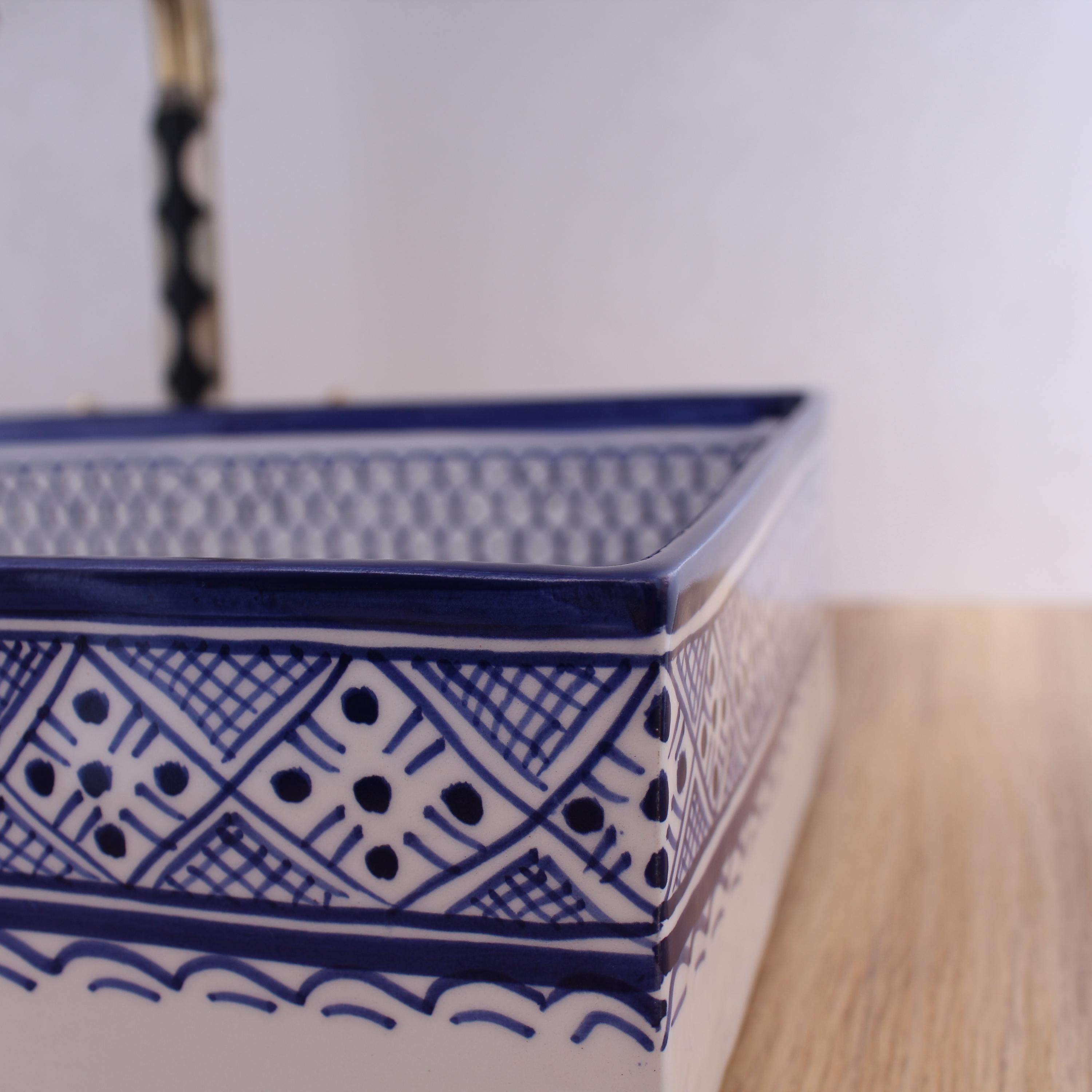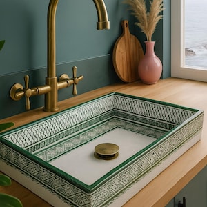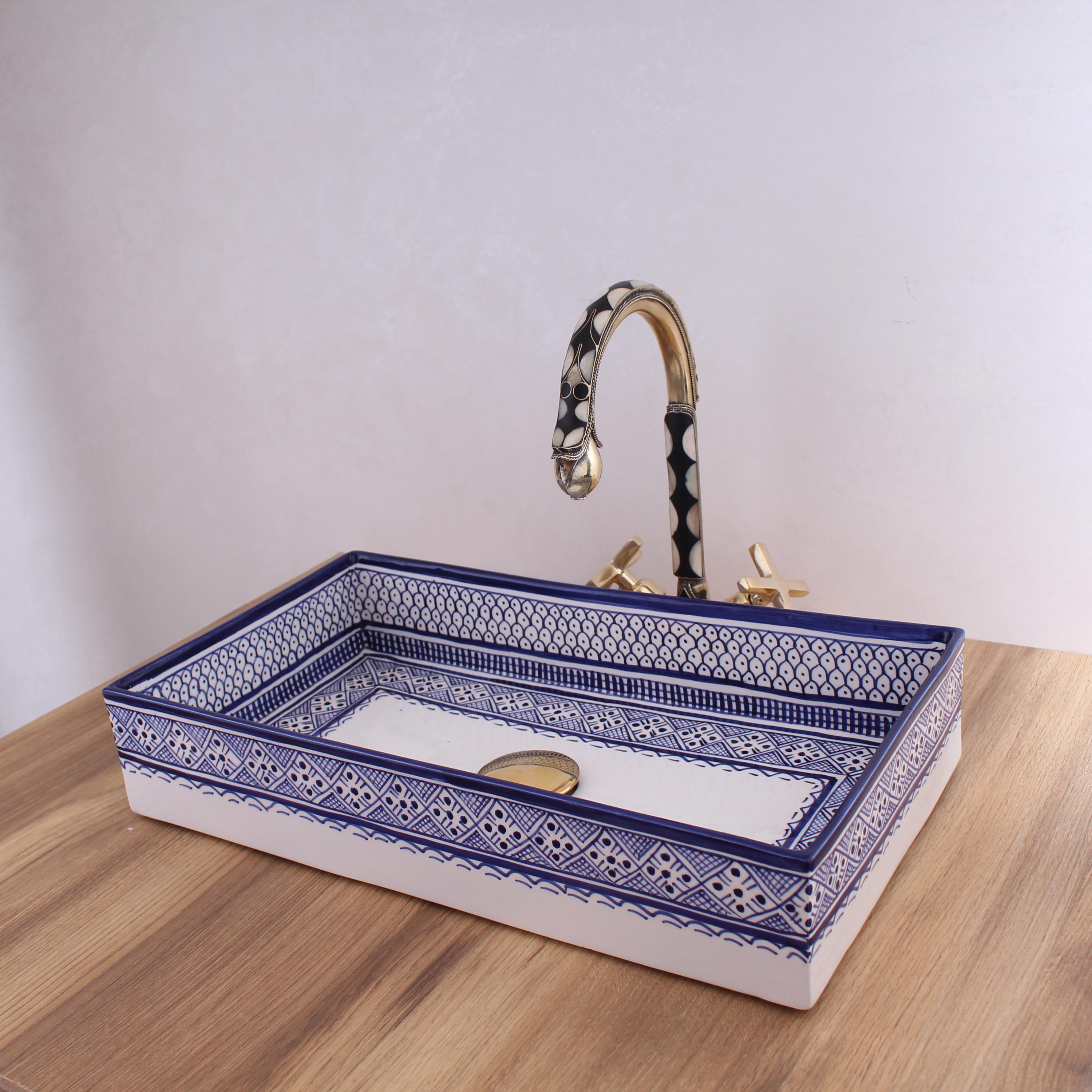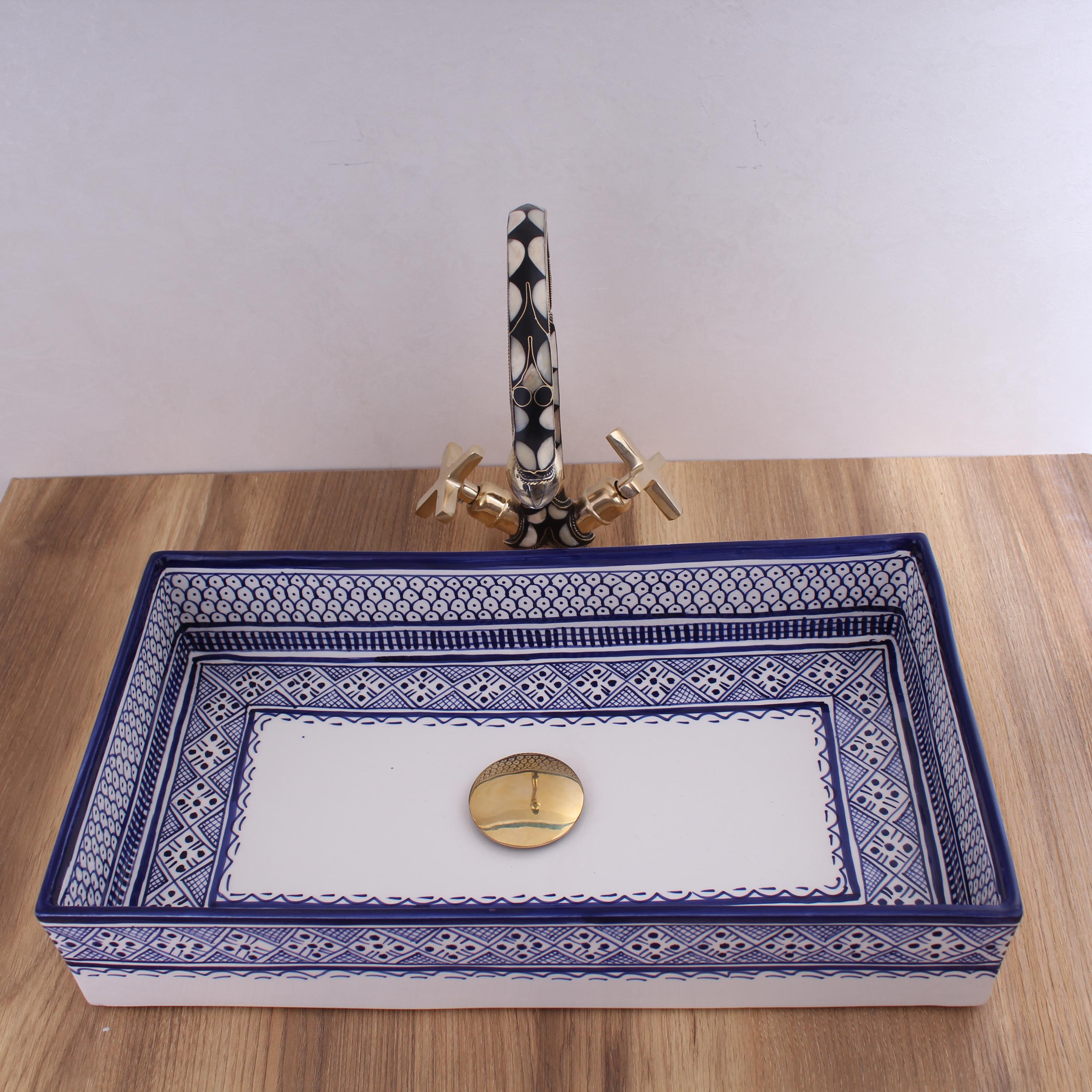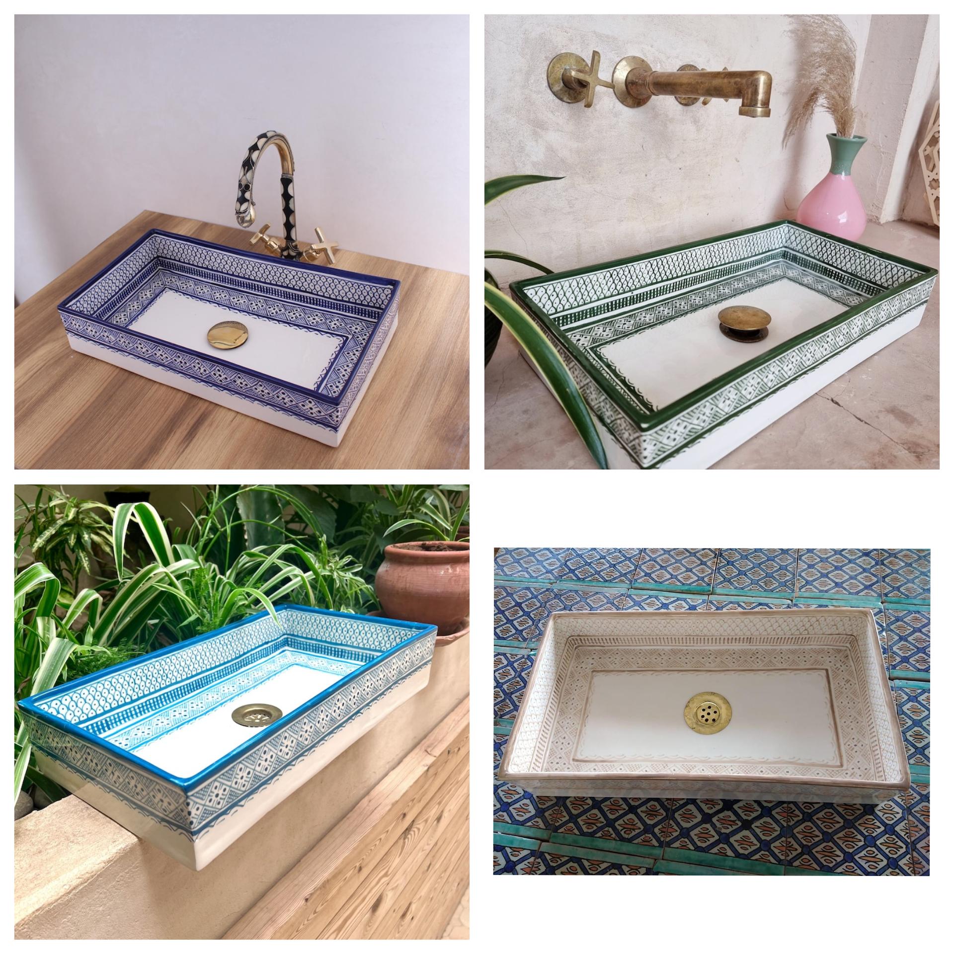 This beautiful Moroccan rectangular sink is handmade by skilled artisans using high-quality ceramic. Featuring traditional hand-painted designs and a smooth glazed finish, it is both durable and easy to clean. Perfect for kitchens, bathrooms, or powder rooms, it adds a unique touch of Moroccan charm to any space. The sink comes with both silver and copper drains included for free. If you need a different size, feel free to contact us.