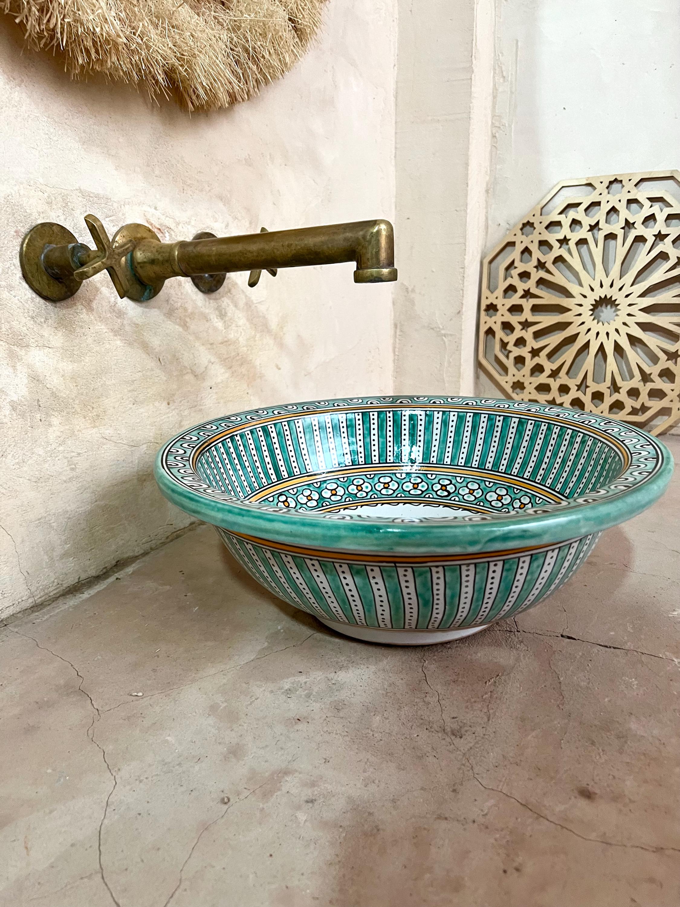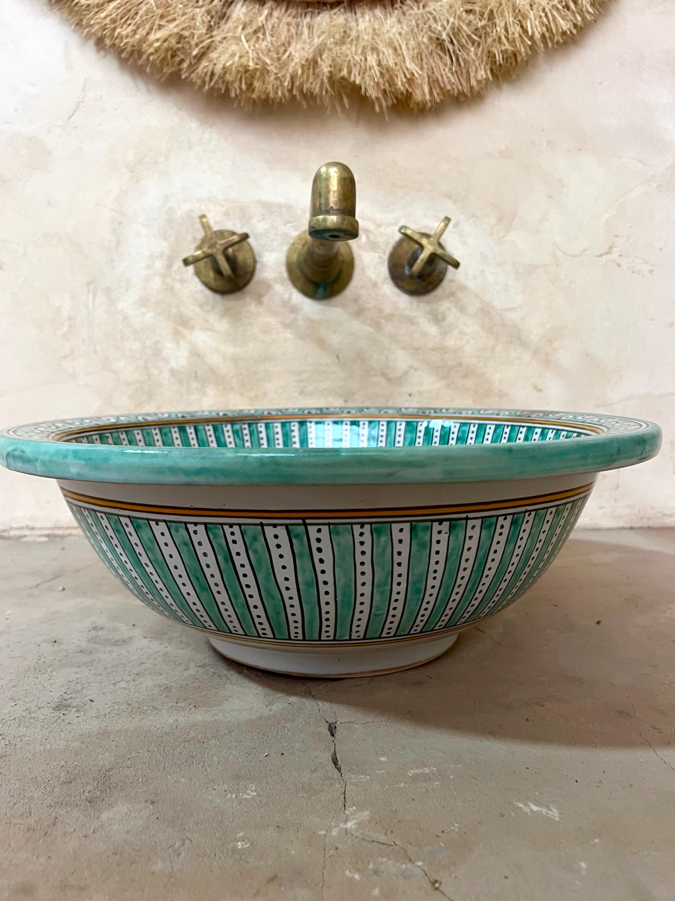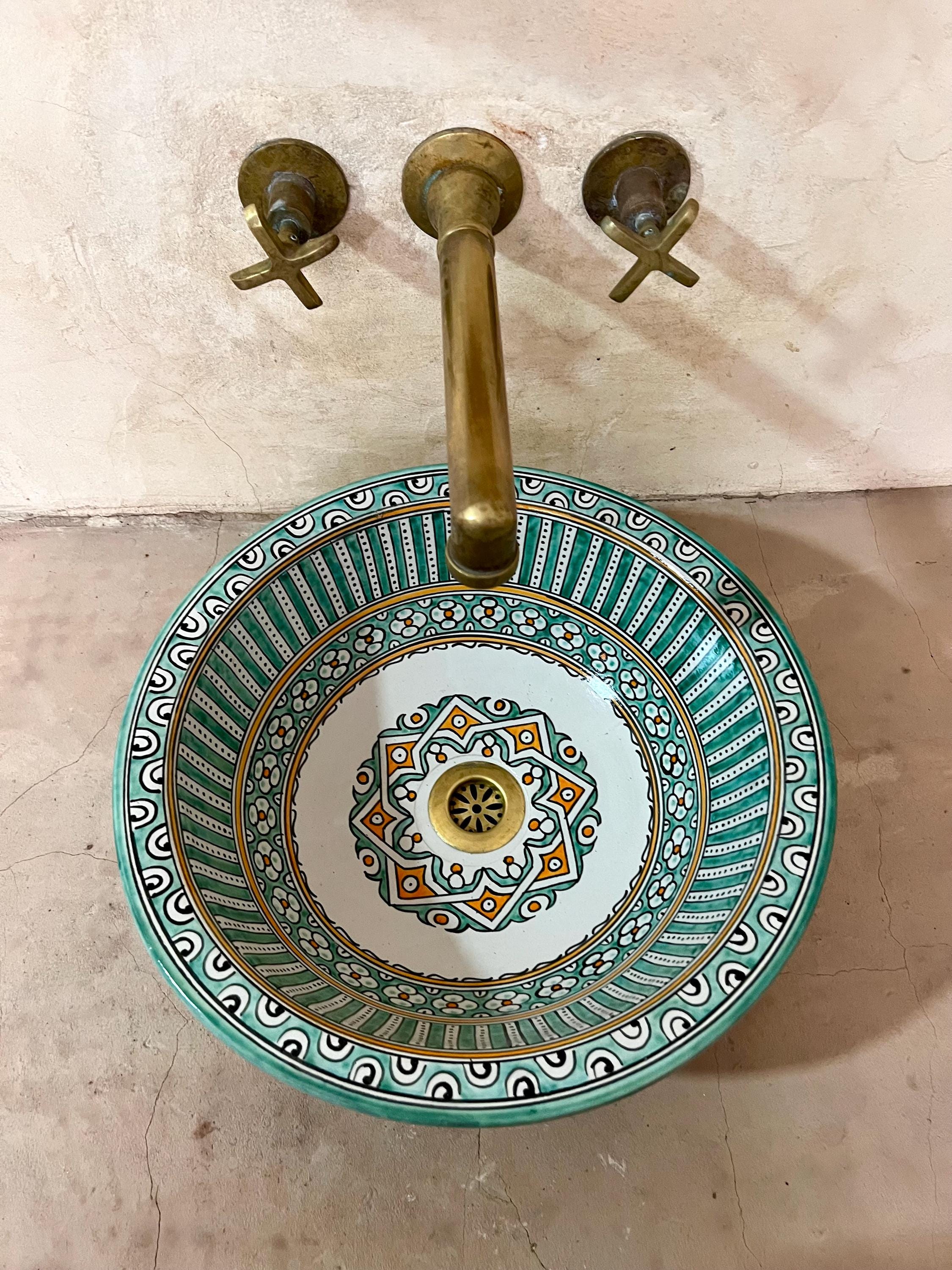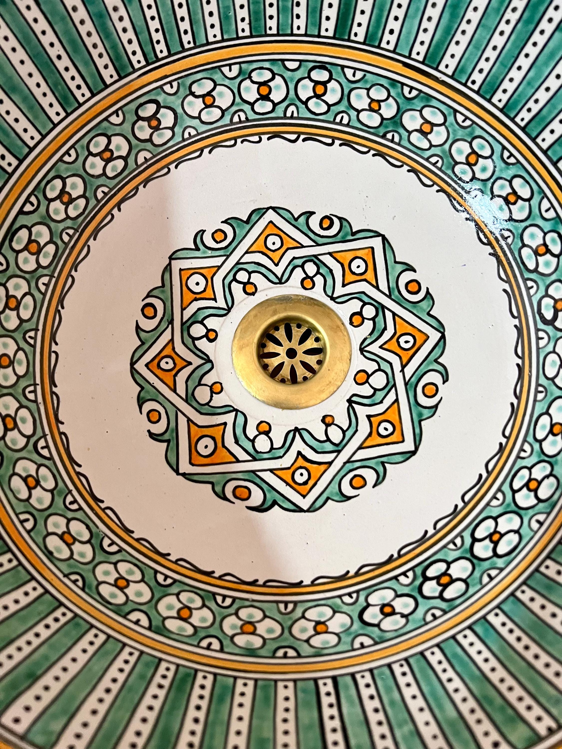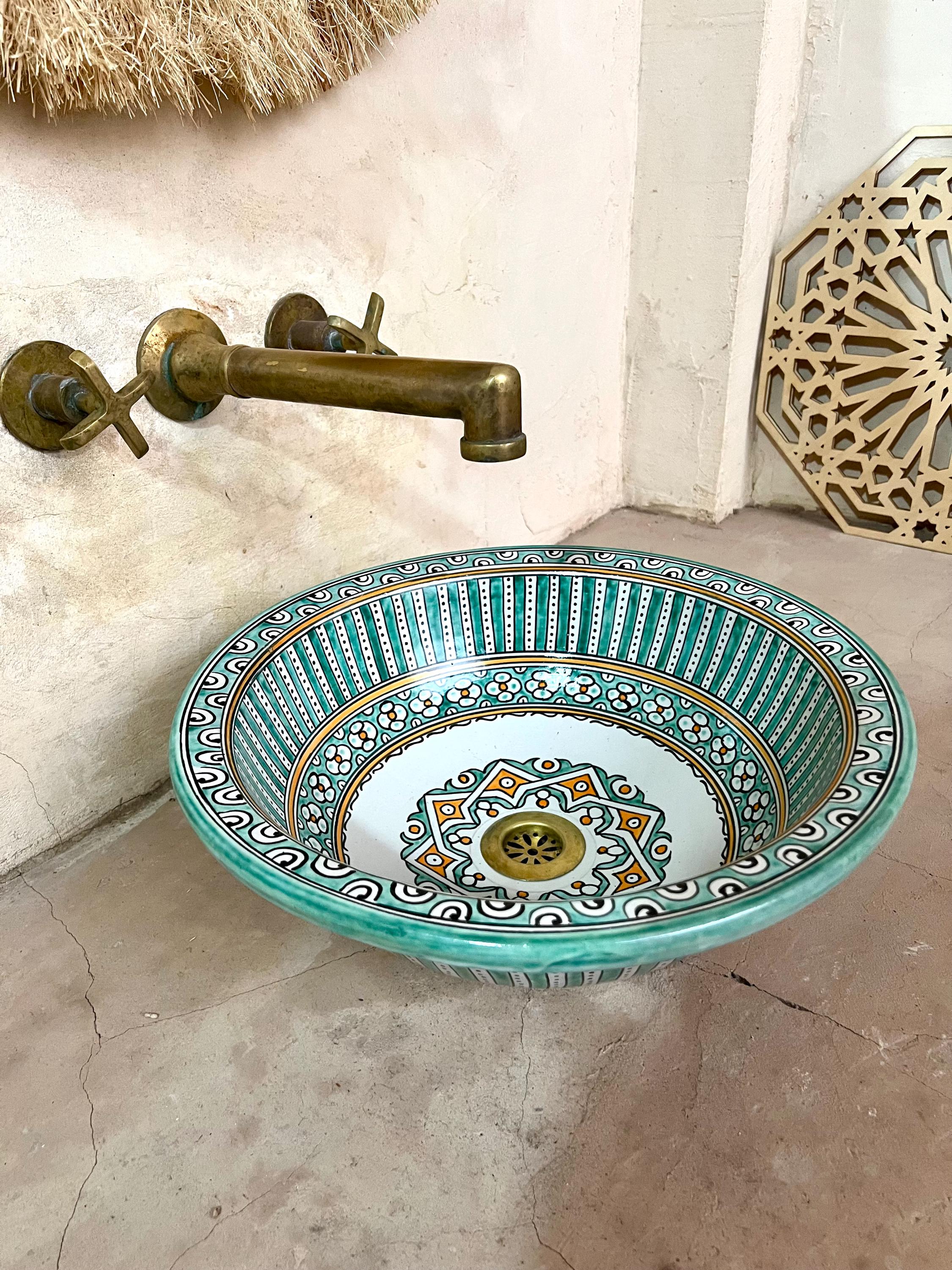 This beautiful Moroccan round ceramic sink is handcrafted by skilled artisans in Fes, made from high-quality clay, and features intricate hand-painted designs with a smooth glazed finish. Made from high-quality ceramic, it is durable, easy to clean, and perfect for bathrooms, kitchens, or powder rooms. Its timeless design adds a touch of Moroccan elegance to any space. The sink comes with both silver and copper drains included for free. Each piece is truly unique, and as a result, minor imperfections are to be expected. If you need a different size, feel free to contact us.