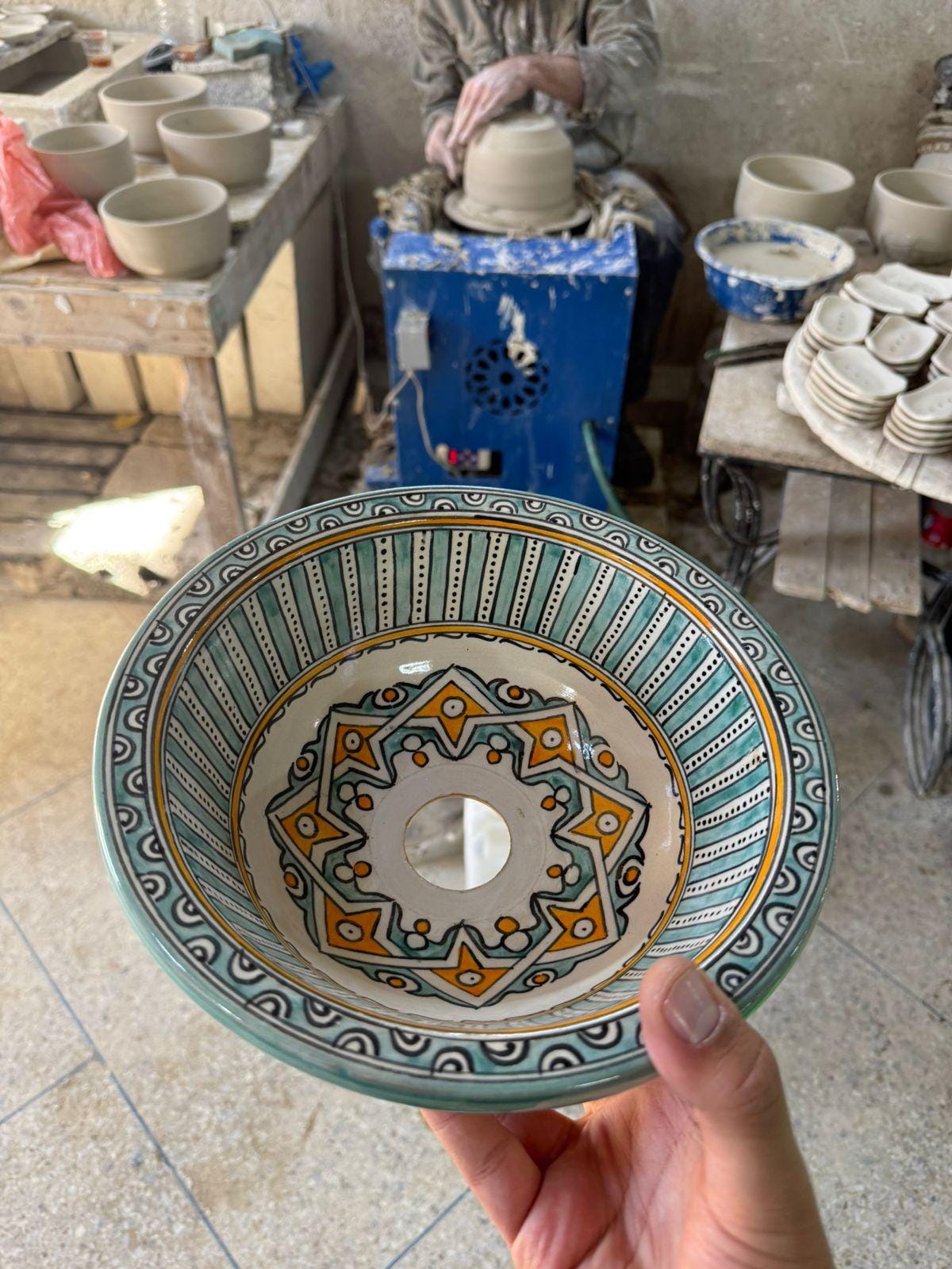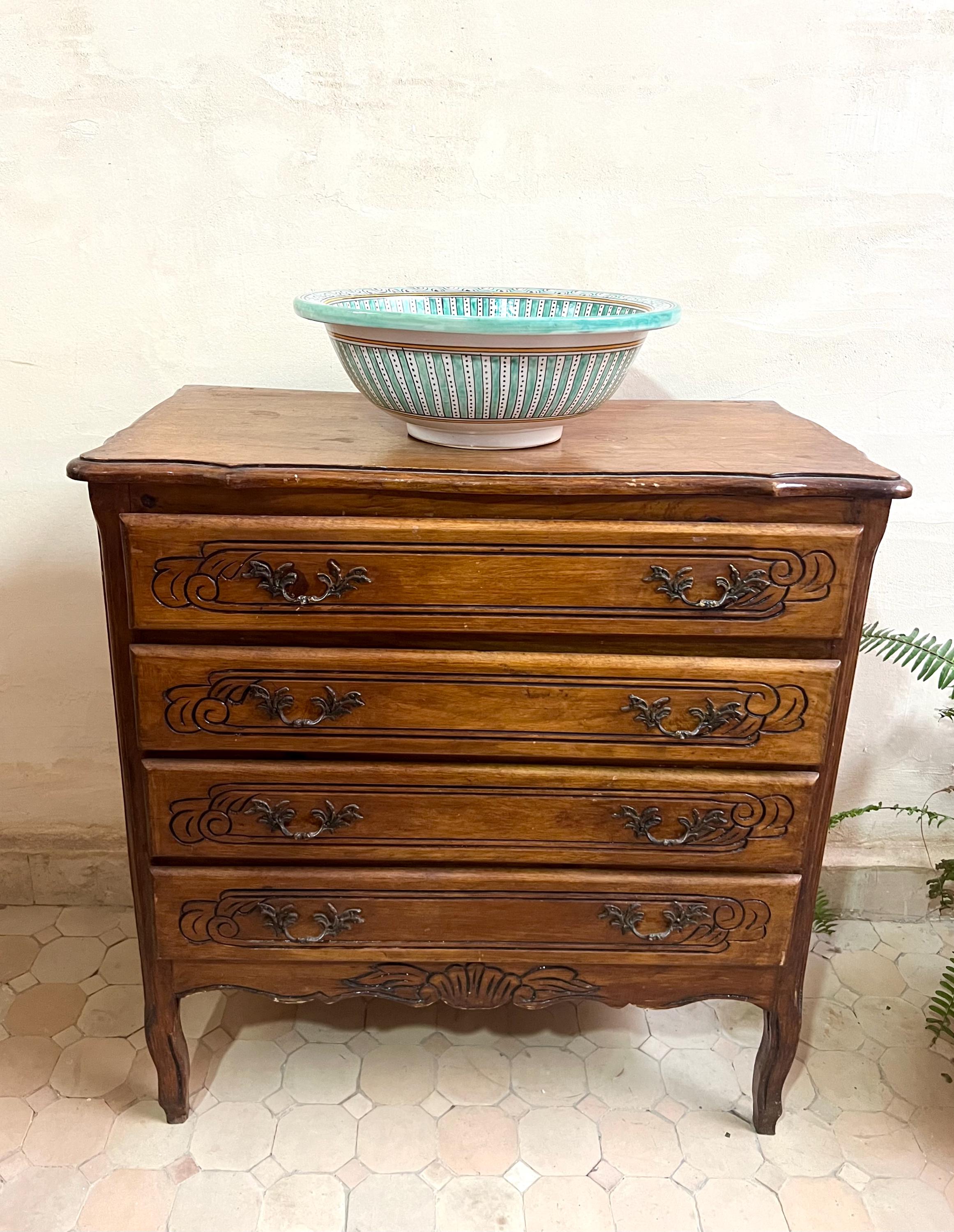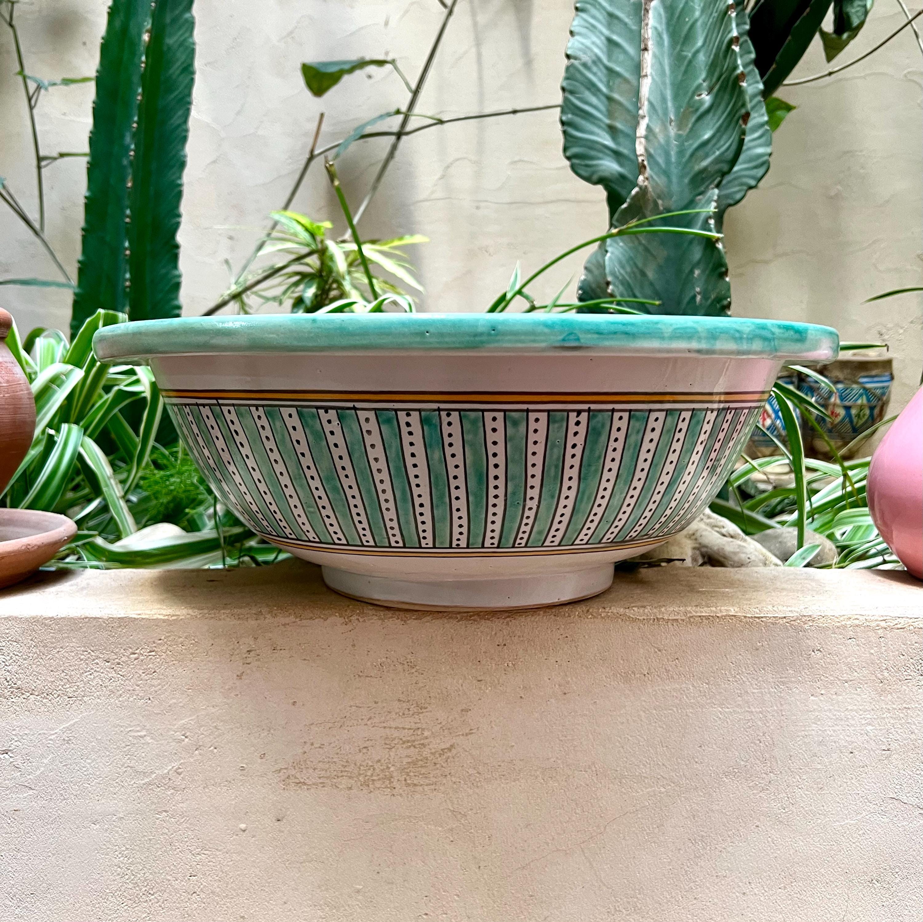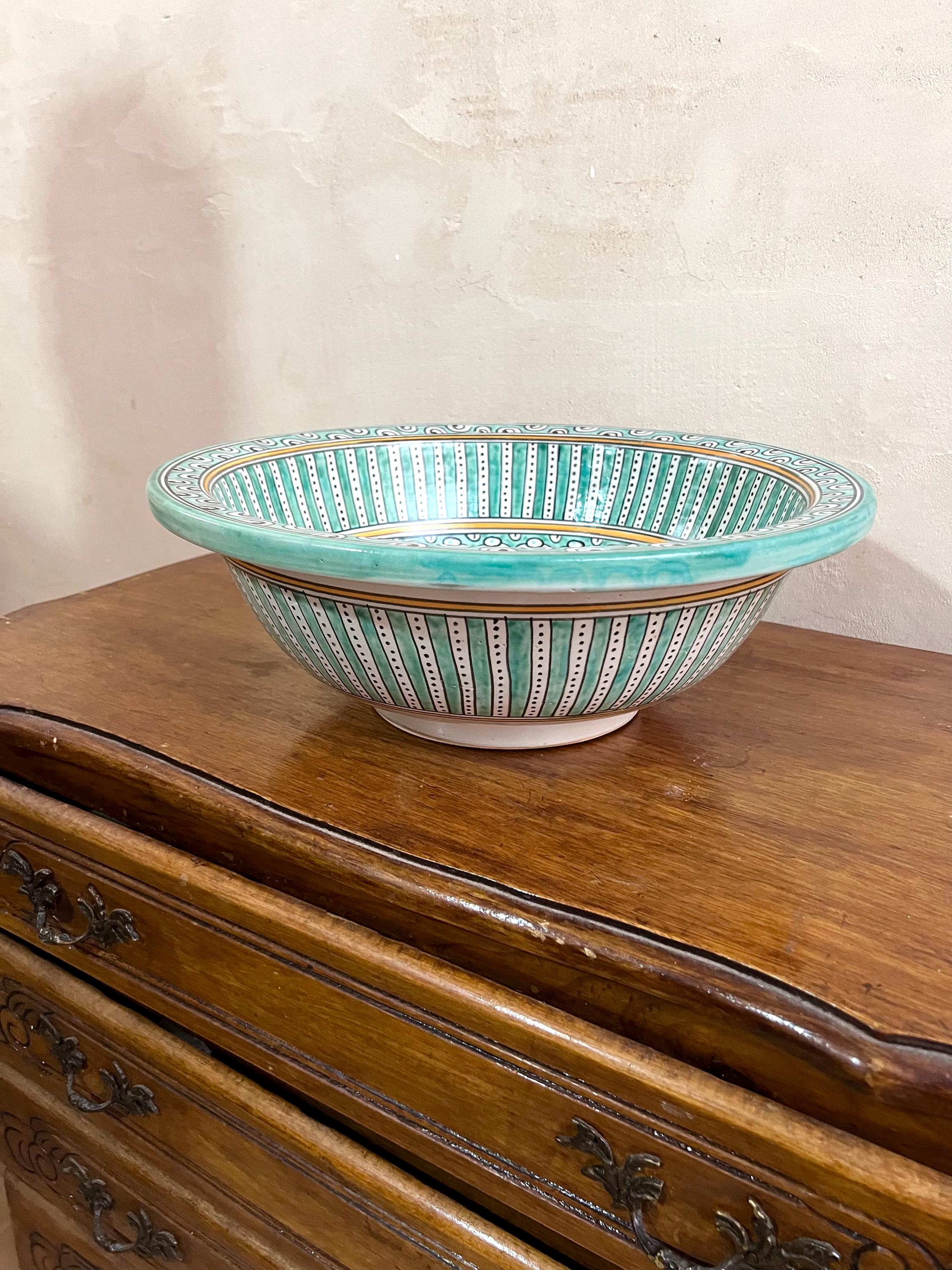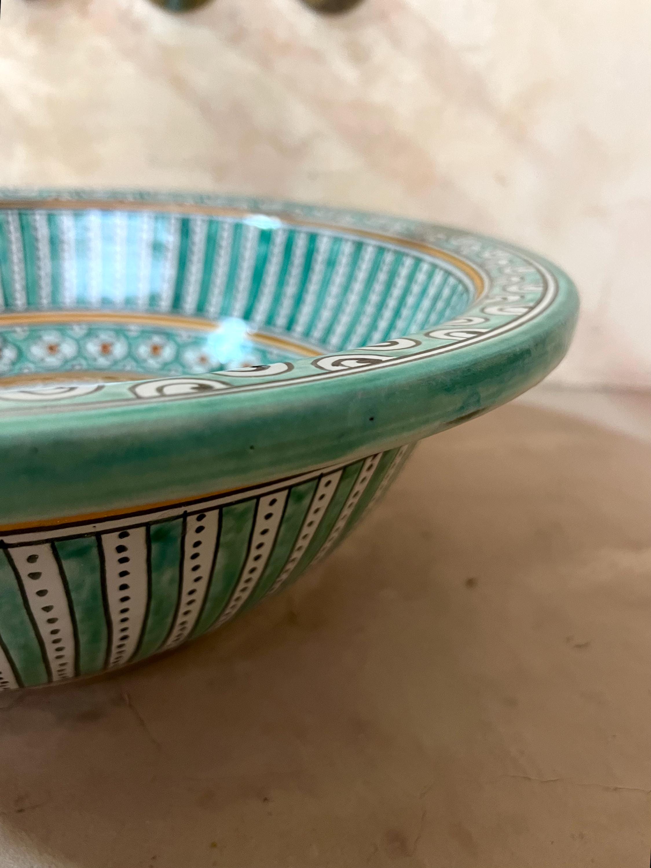 This beautiful Moroccan round ceramic sink is handcrafted by skilled artisans in Fes, made from high-quality clay, and features intricate hand-painted designs with a smooth glazed finish. Made from high-quality ceramic, it is durable, easy to clean, and perfect for bathrooms, kitchens, or powder rooms. Its timeless design adds a touch of Moroccan elegance to any space. The sink comes with both silver and copper drains included for free. Each piece is truly unique, and as a result, minor imperfections are to be expected. If you need a different size, feel free to contact us.