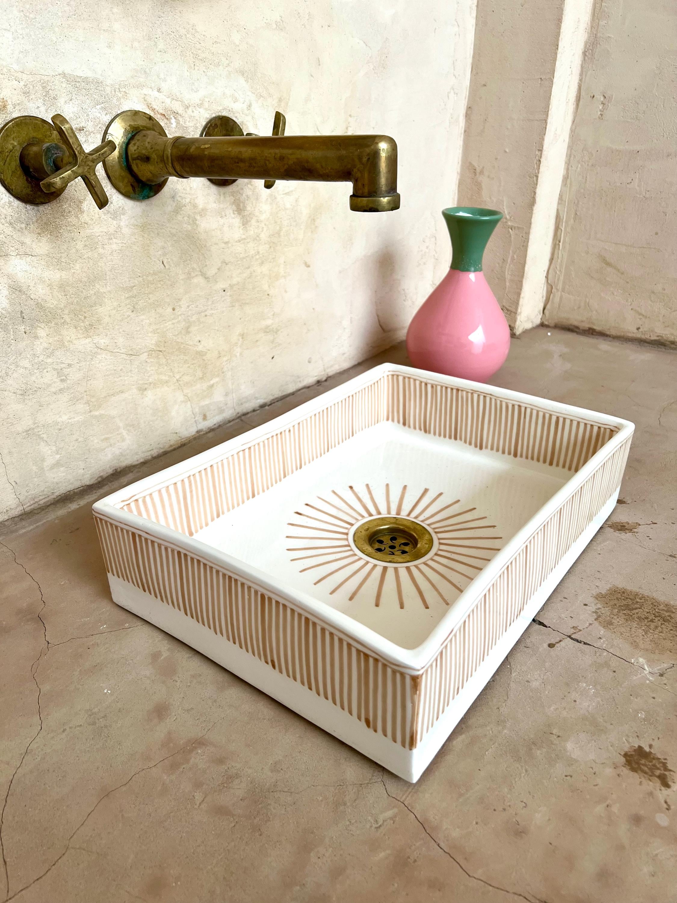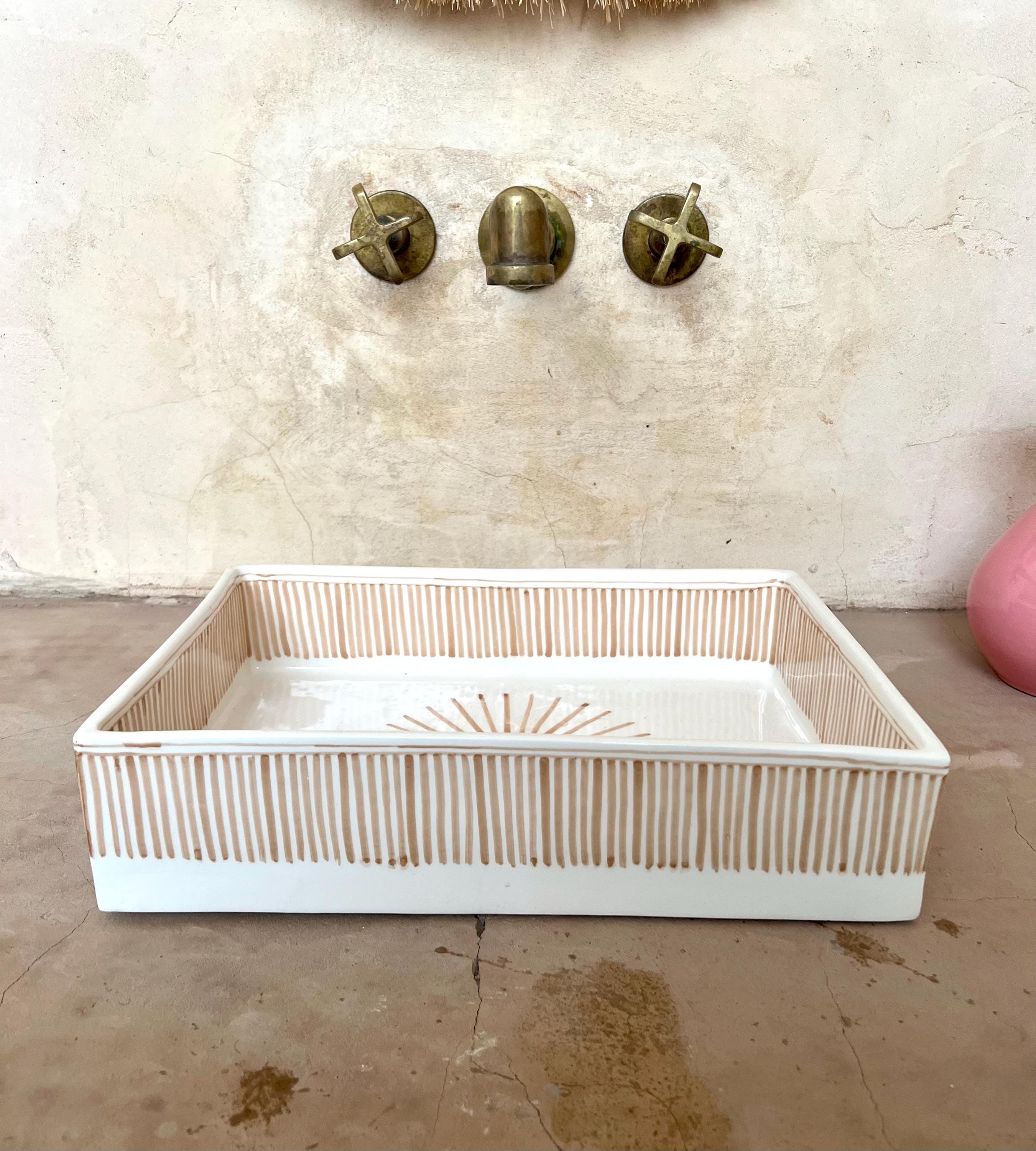 This beautiful Moroccan rectangular sink is handmade by skilled artisans using high-quality ceramic. Featuring traditional hand-painted designs and a smooth glazed finish, it is both durable and easy to clean. Perfect for kitchens, bathrooms, or powder rooms, it adds a unique touch of Moroccan charm to any space. The sink comes with both silver and copper drains included for free. If you need a different size, feel free to contact us.