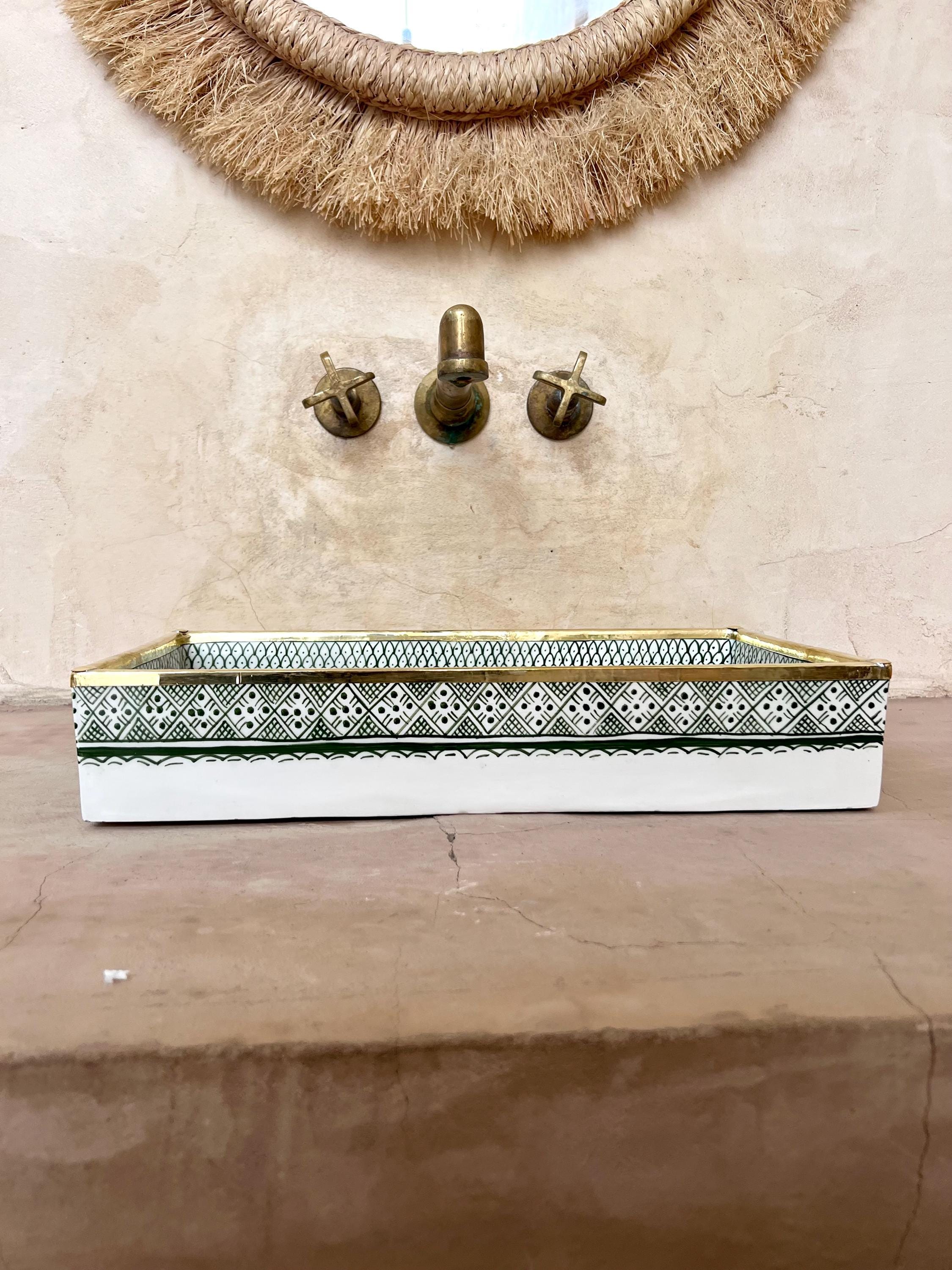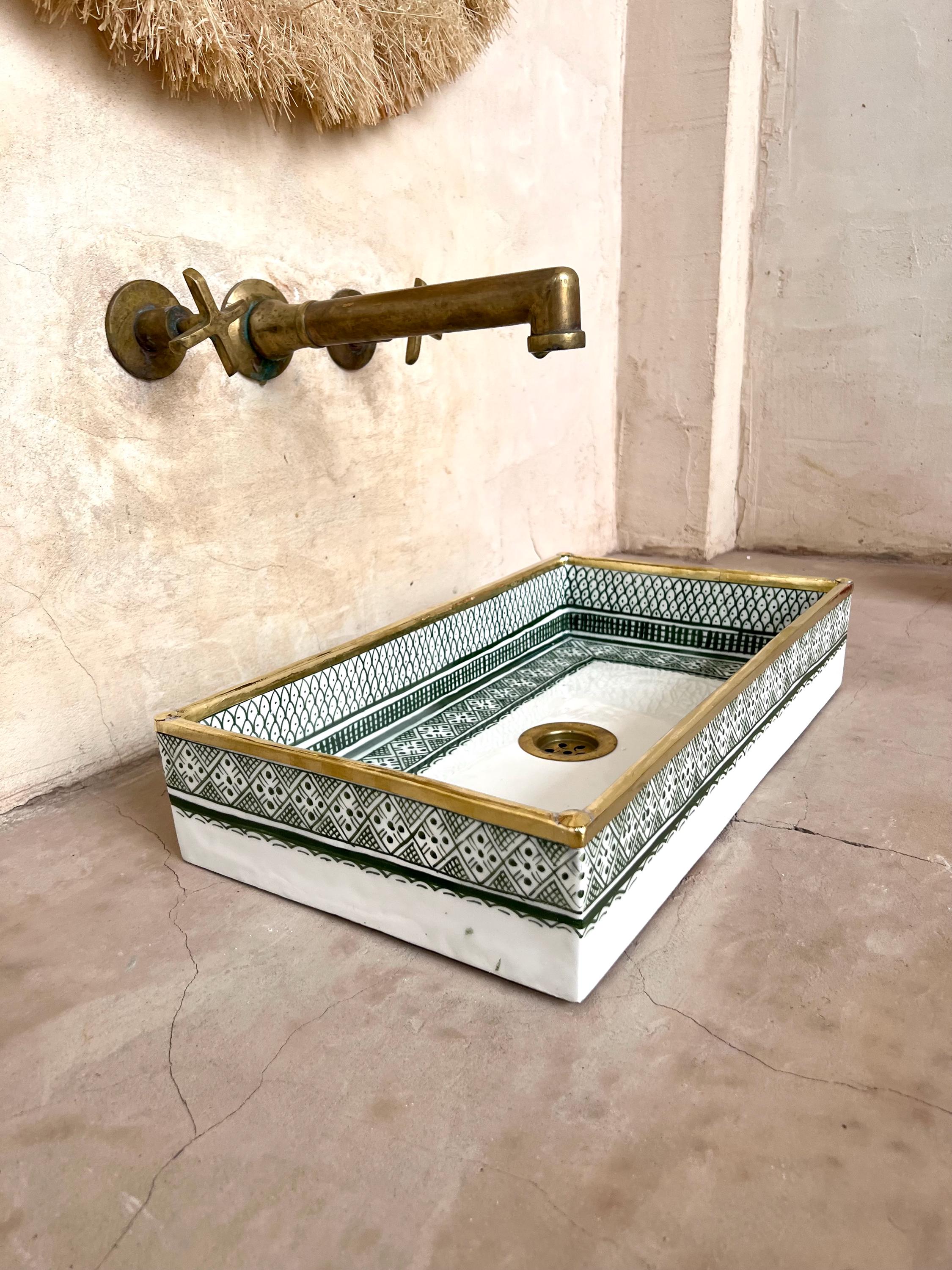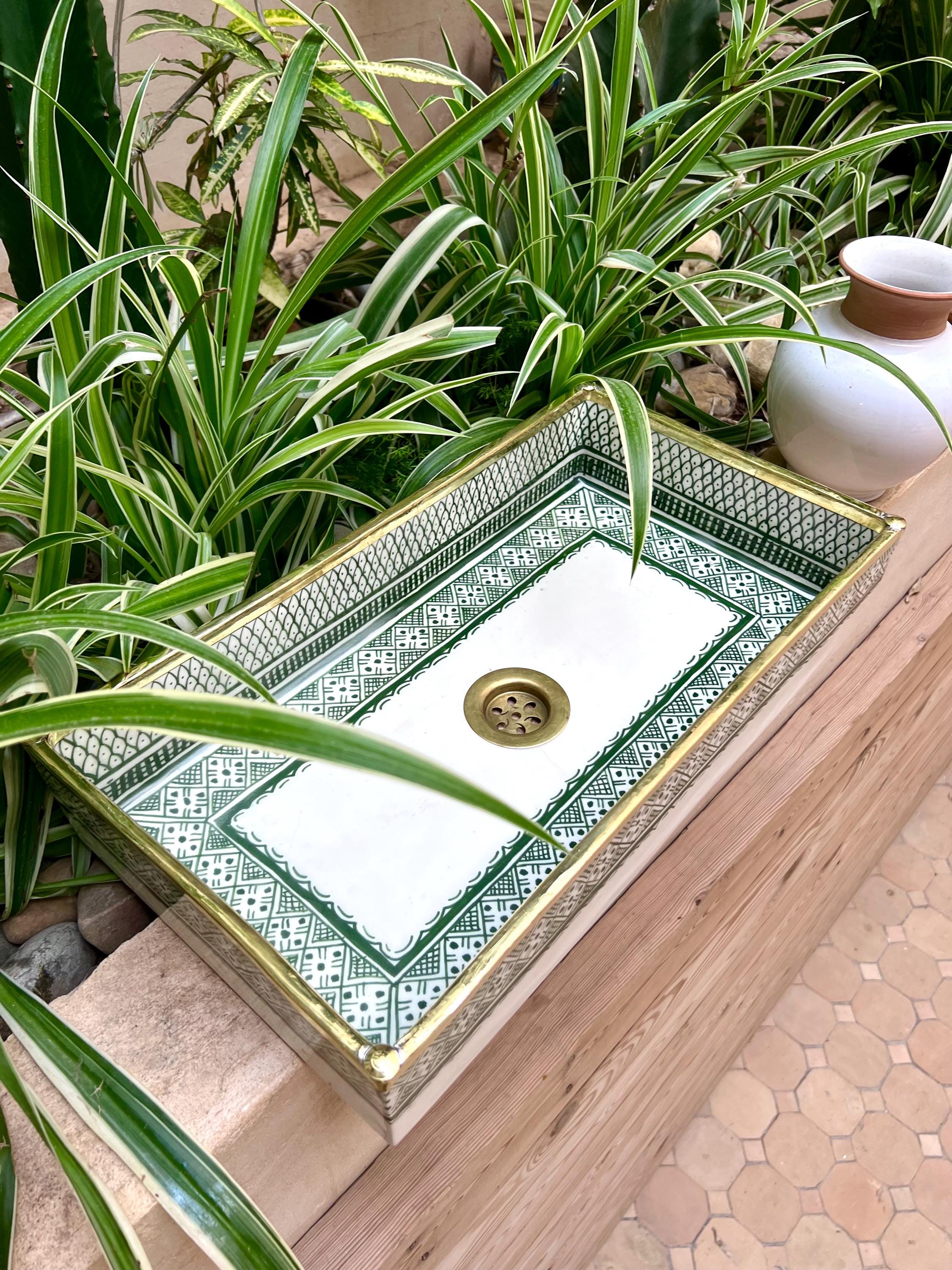 Rectangular Moroccan Ceramic Sink with Copper Rim This stunning handcrafted Moroccan washbasin features an elegant fish scale design in a rich green hue, complemented by a beautiful copper rim for a refined touch. Made from durable, natural materials, it is resistant to abrasion, discoloration, and frost, ensuring lasting beauty.