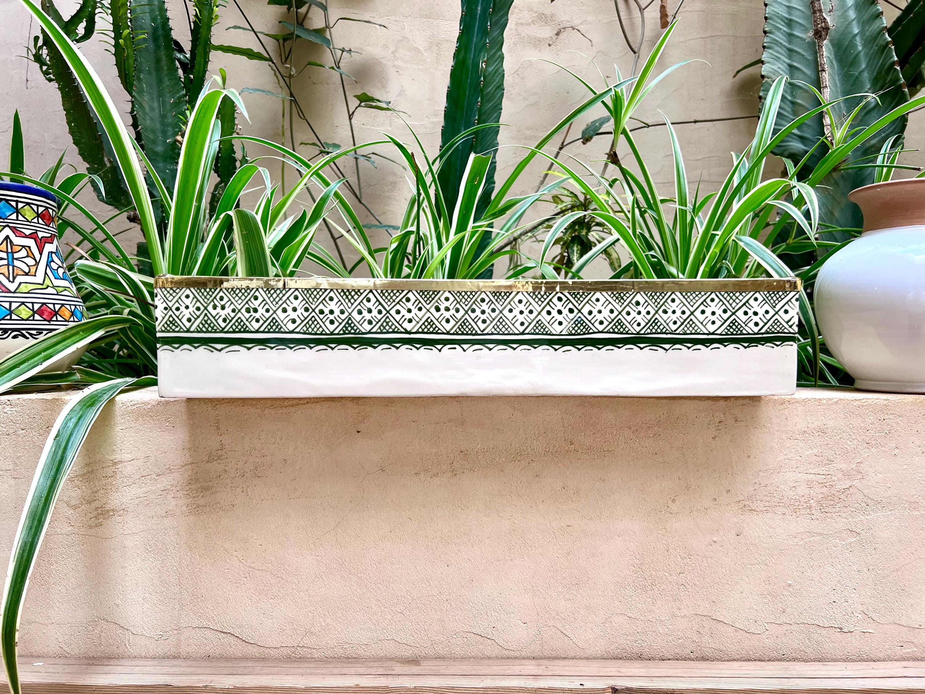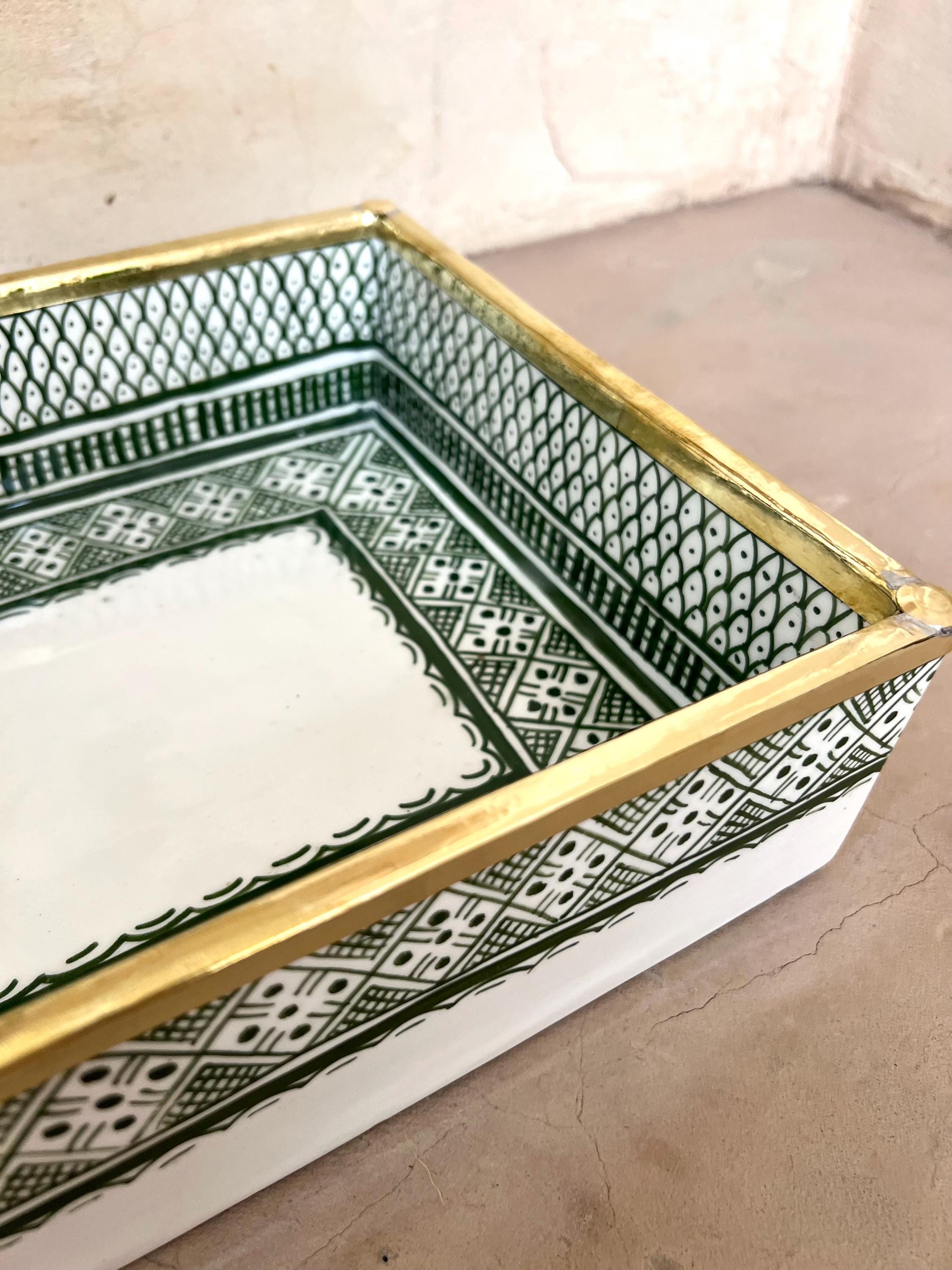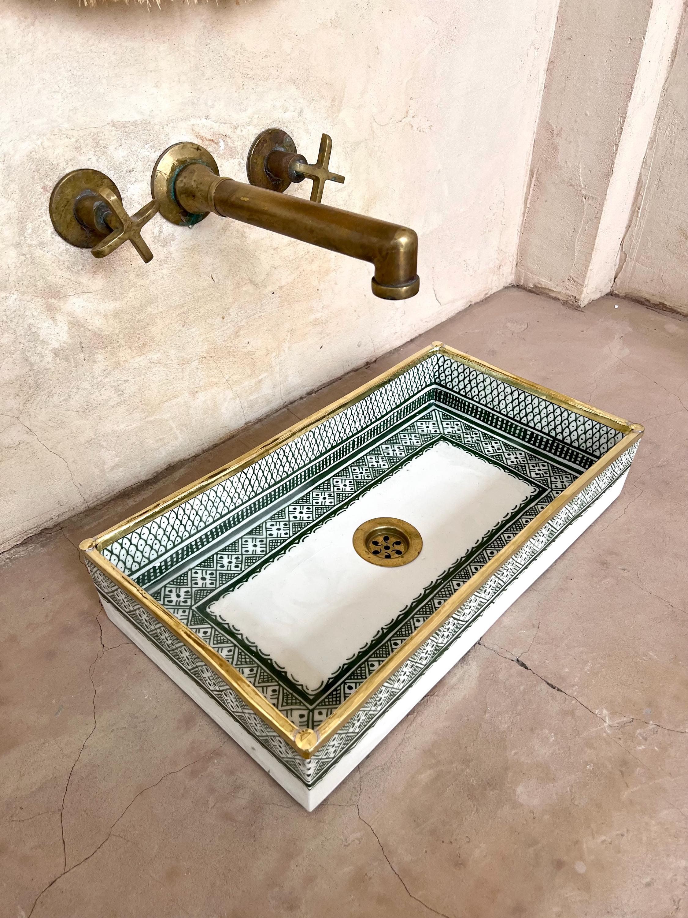 Rectangular Moroccan Ceramic Sink with Copper Rim This stunning handcrafted Moroccan washbasin features an elegant fish scale design in a rich green hue, complemented by a beautiful copper rim for a refined touch. Made from durable, natural materials, it is resistant to abrasion, discoloration, and frost, ensuring lasting beauty.