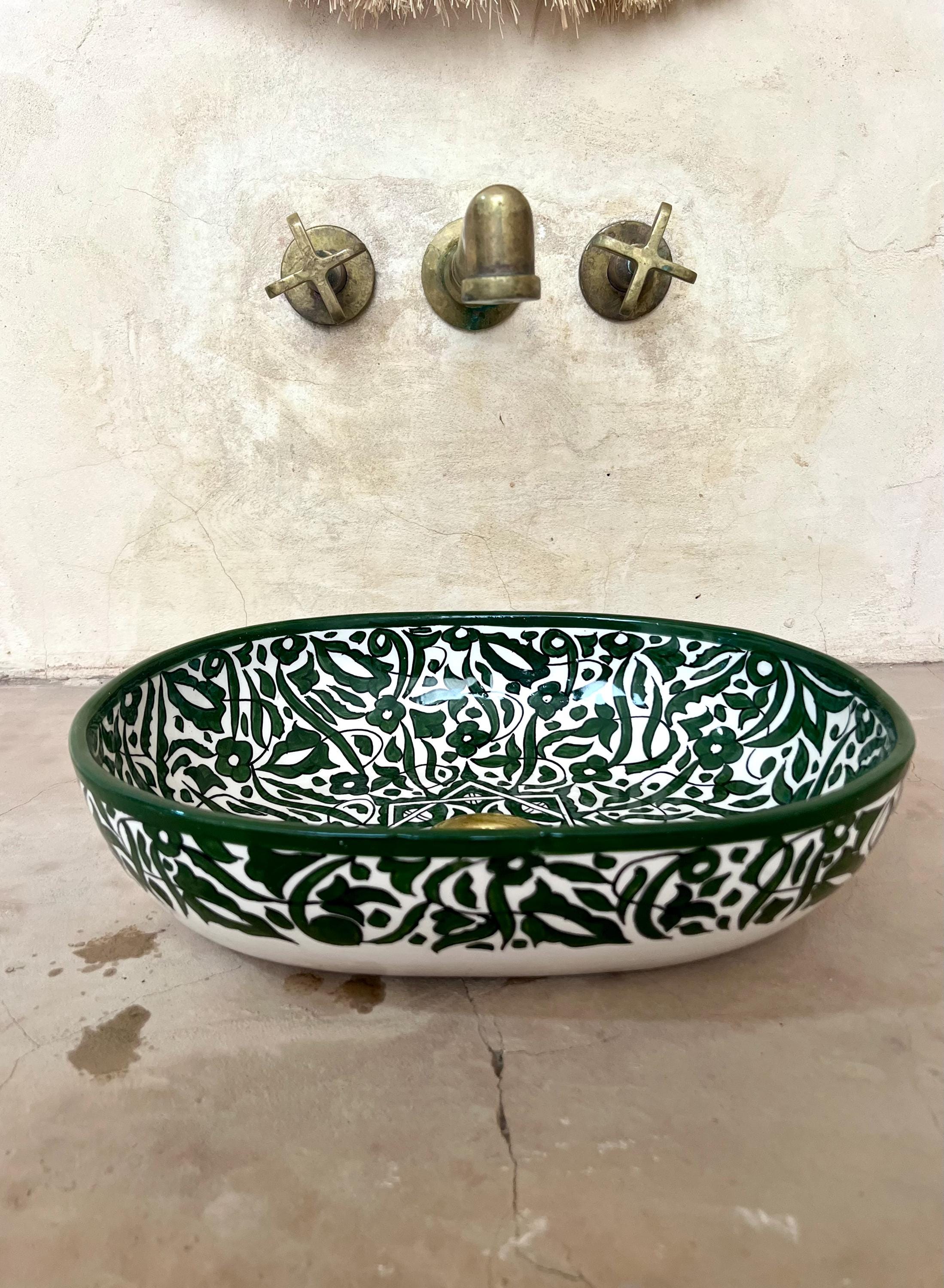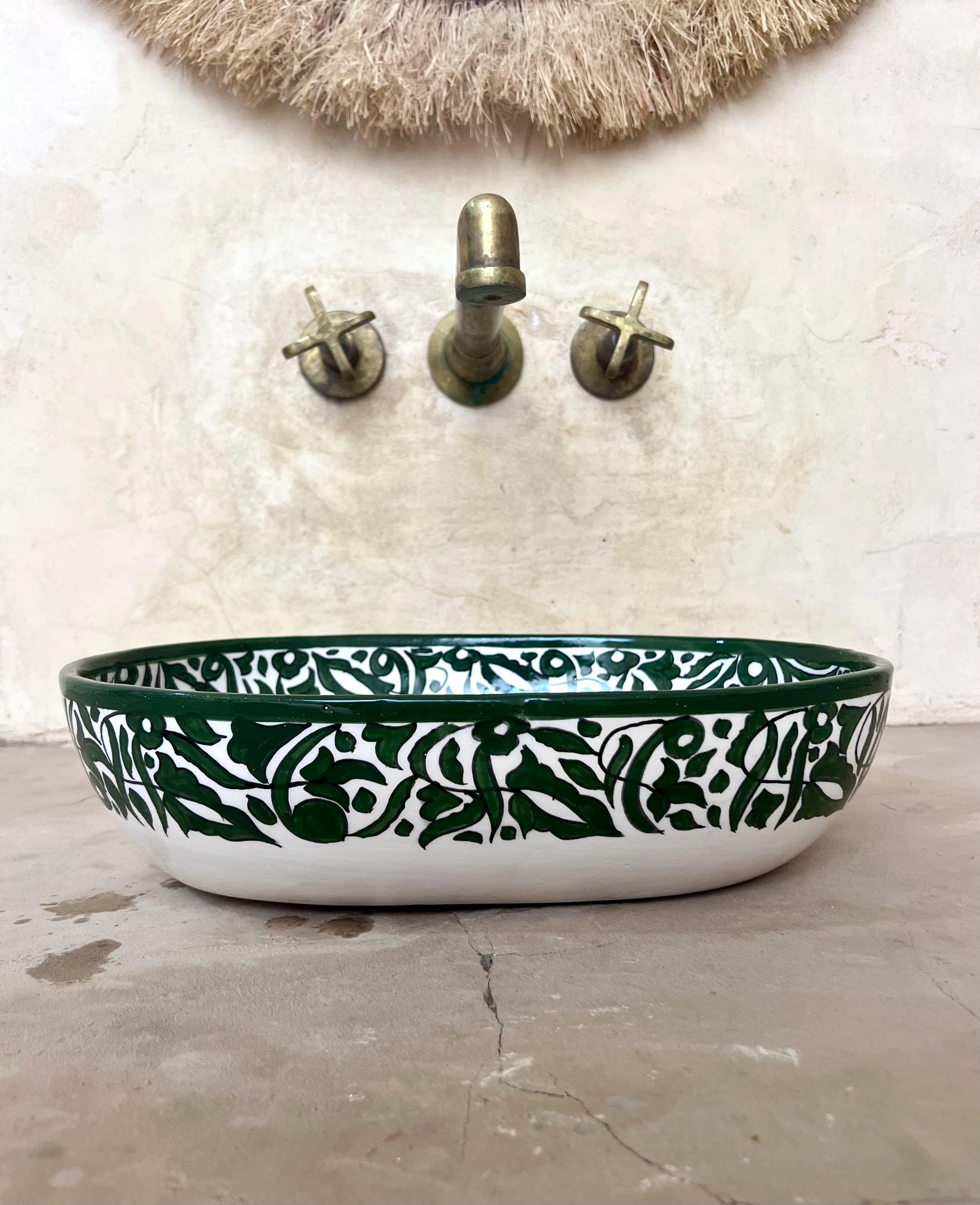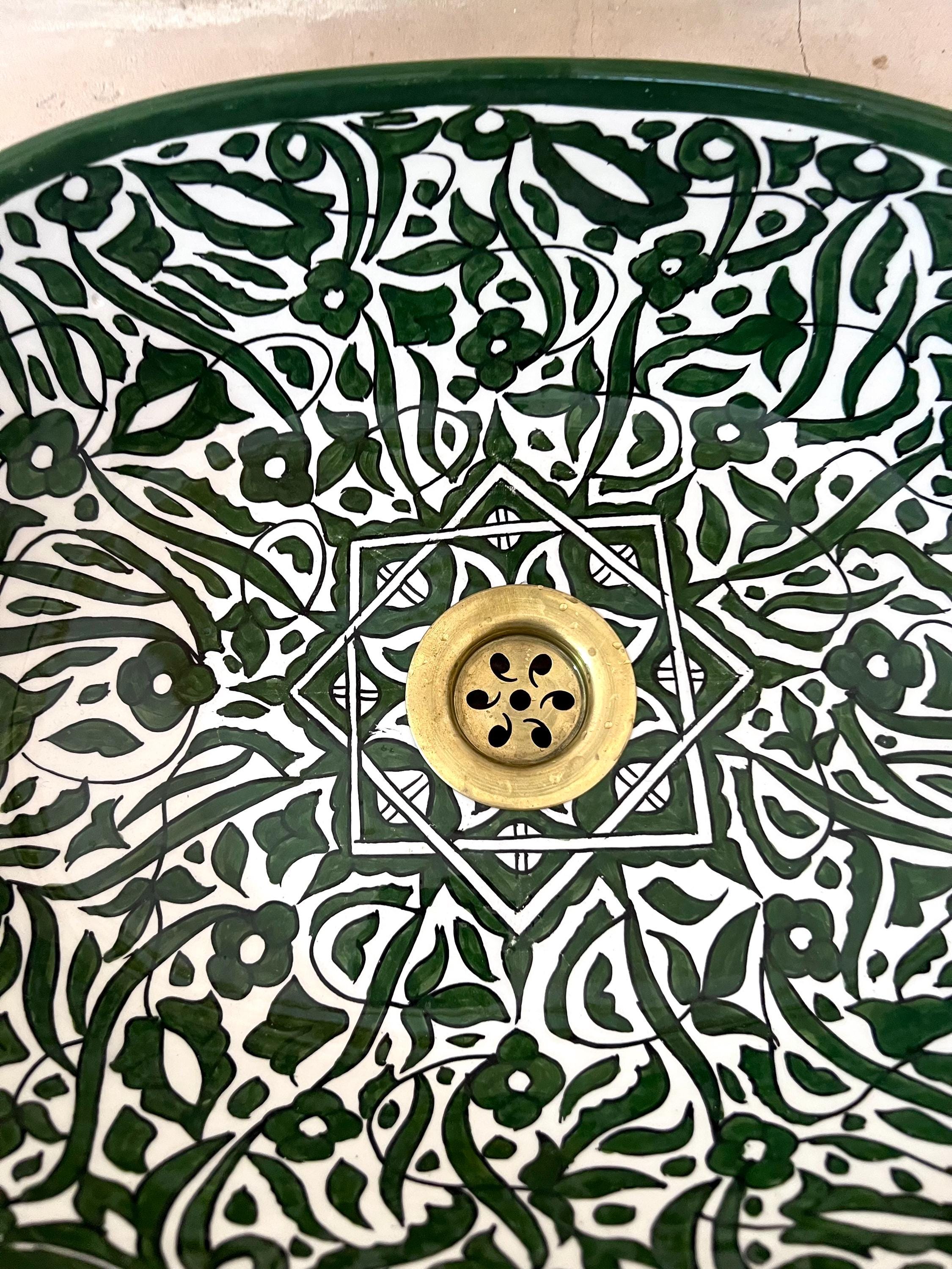 This beautiful Moroccan Oval ceramic sink is handcrafted by skilled artisans in Fes, made from high-quality clay, and features intricate hand-painted designs with a smooth glazed finish. Made from high-quality ceramic, it is durable, easy to clean, and perfect for bathrooms, kitchens, or powder rooms. Its timeless design adds a touch of Moroccan elegance to any space. The sink comes with both silver and copper drains included for free. Each piece is truly unique, and as a result, minor imperfections are to be expected. If you need a different size, feel free to contact us.
