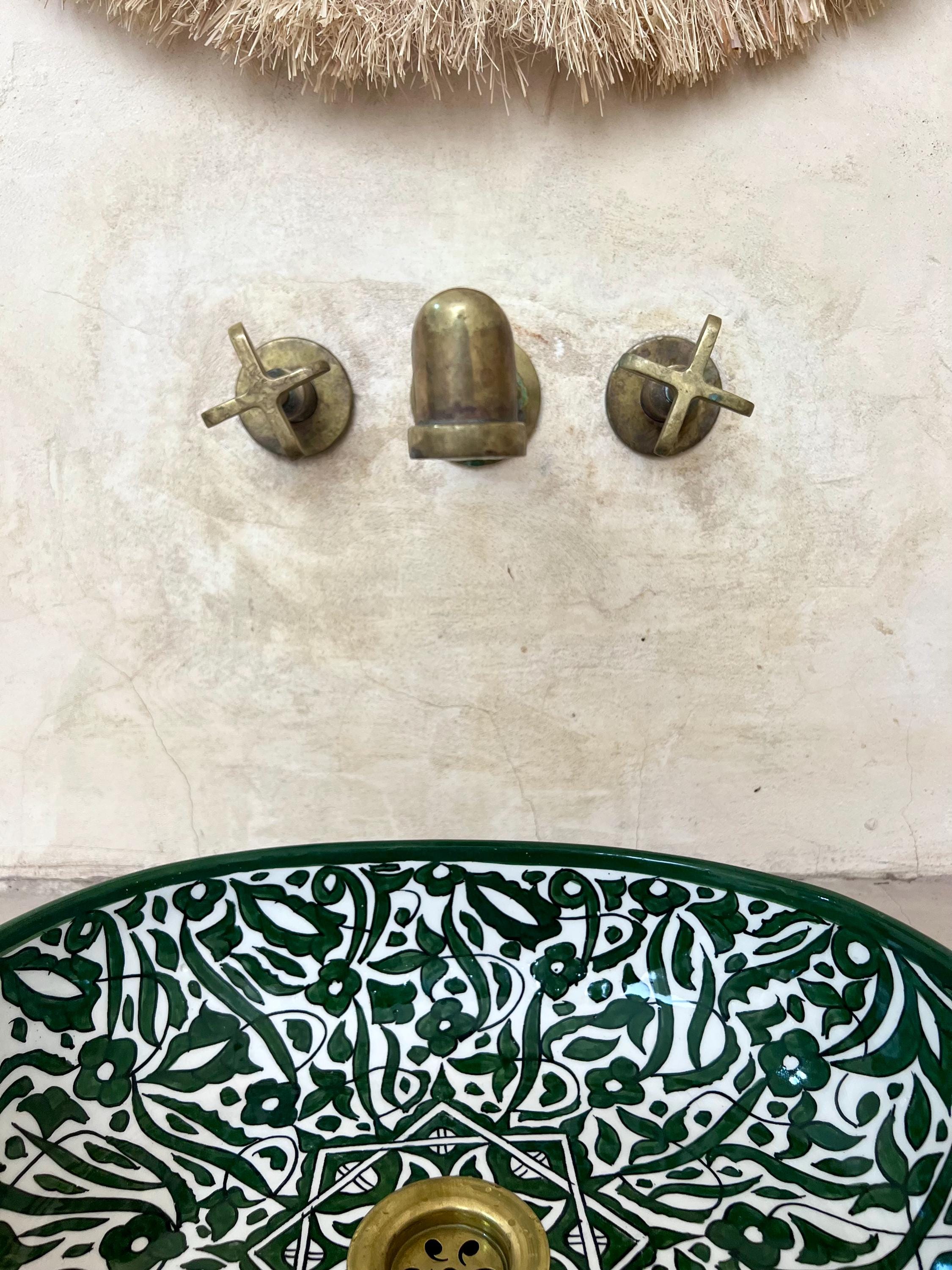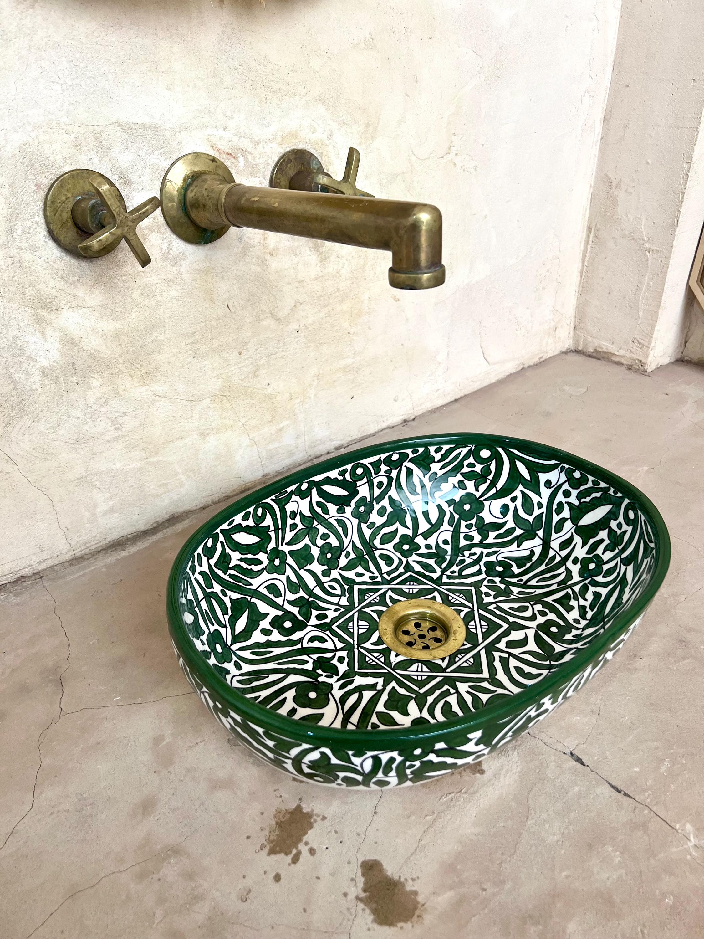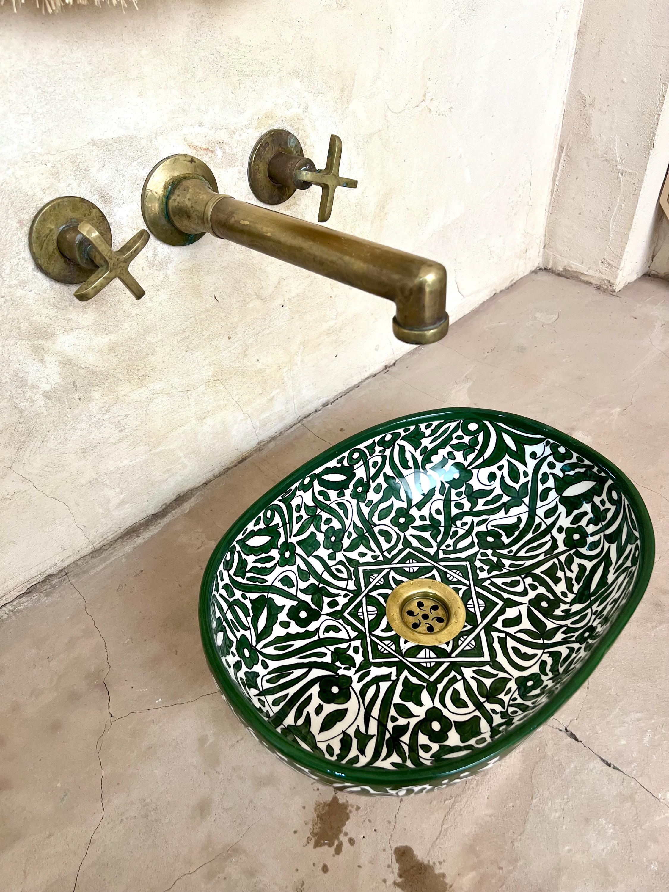 This beautiful Moroccan Oval ceramic sink is handcrafted by skilled artisans in Fes, made from high-quality clay, and features intricate hand-painted designs with a smooth glazed finish. Made from high-quality ceramic, it is durable, easy to clean, and perfect for bathrooms, kitchens, or powder rooms. Its timeless design adds a touch of Moroccan elegance to any space. The sink comes with both silver and copper drains included for free. Each piece is truly unique, and as a result, minor imperfections are to be expected. If you need a different size, feel free to contact us.