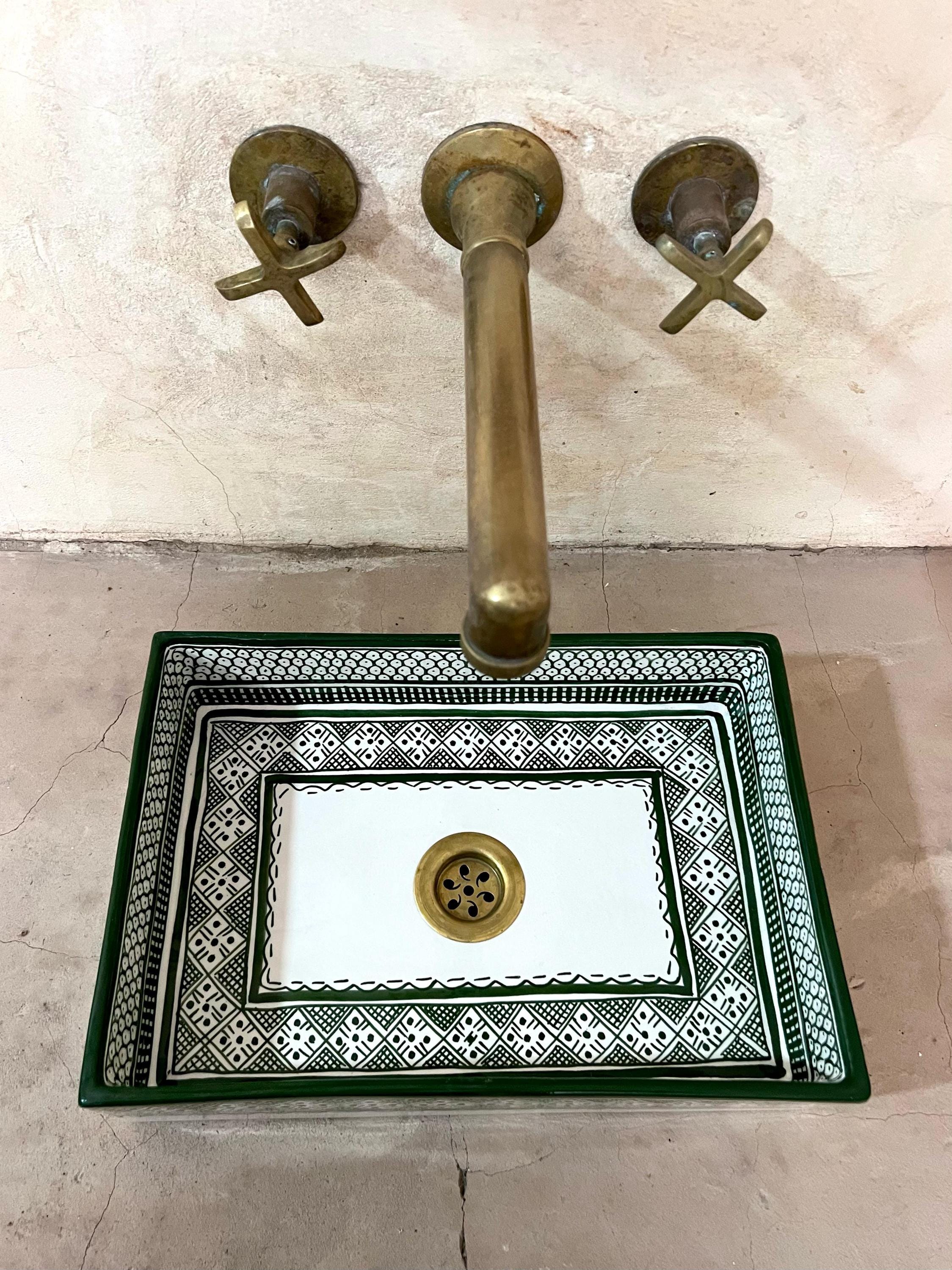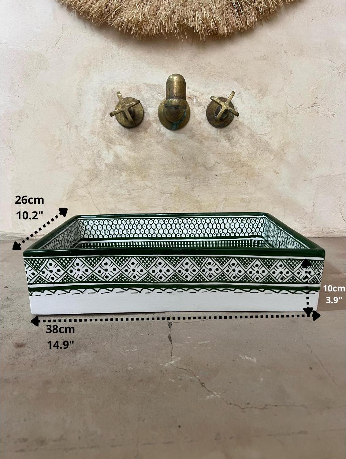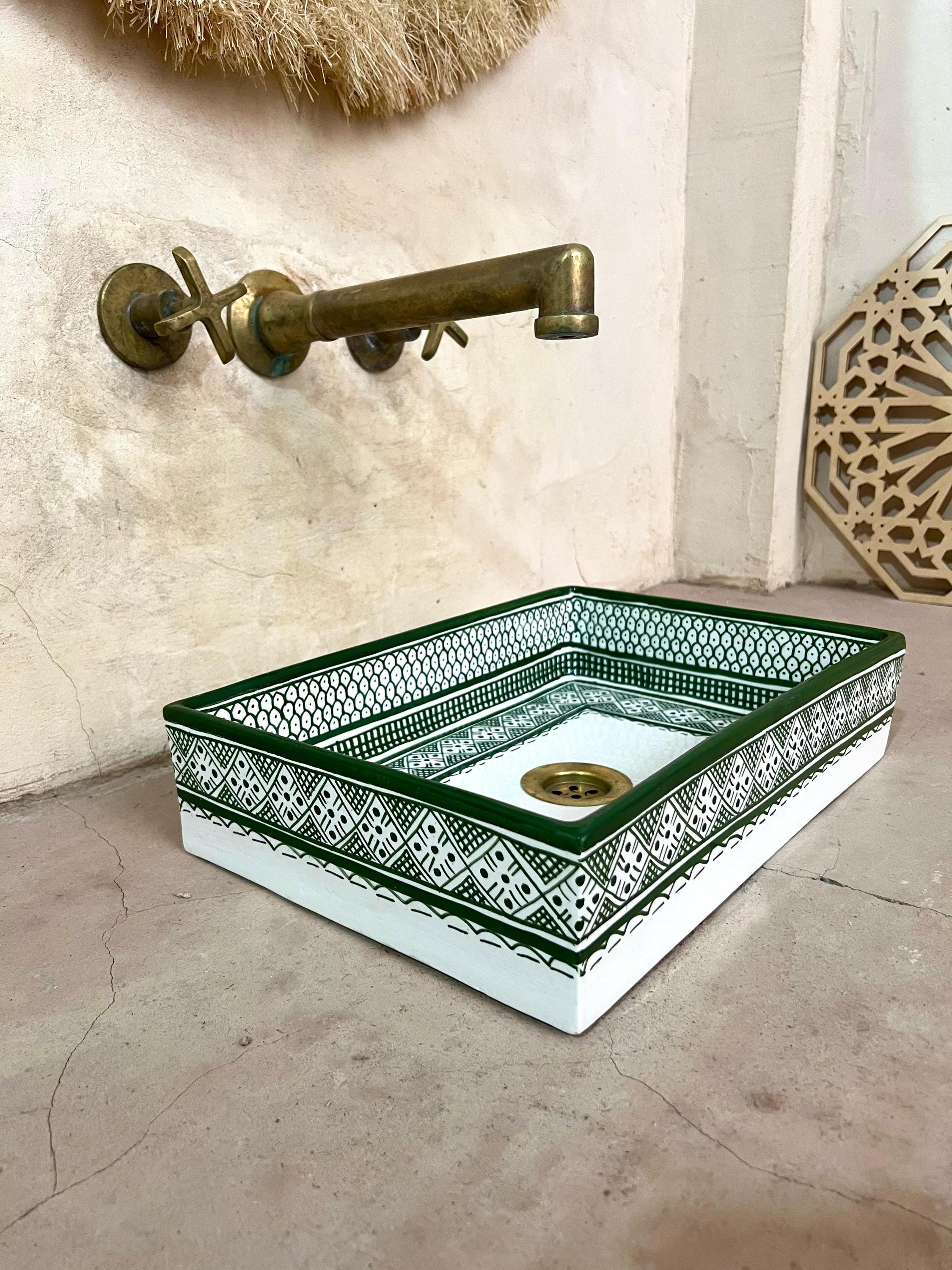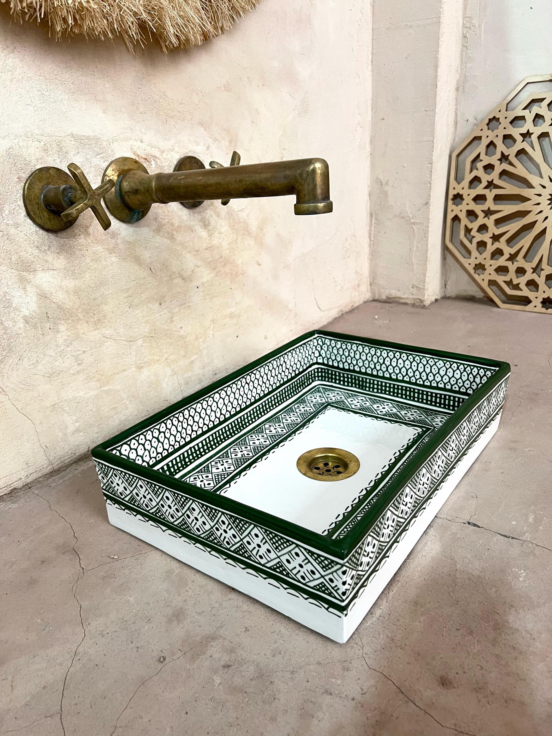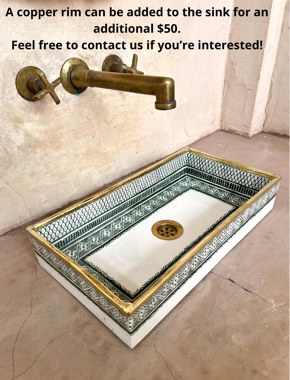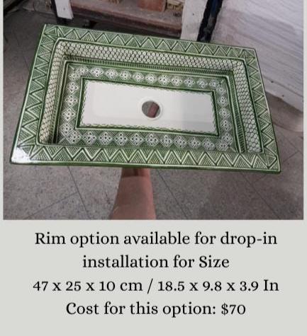 This beautiful Moroccan rectangular sink is handmade by skilled artisans using high-quality ceramic. Featuring traditional hand-painted designs and a smooth glazed finish, it is both durable and easy to clean. Perfect for kitchens, bathrooms, or powder rooms, it adds a unique touch of Moroccan charm to any space. The sink comes with both silver and copper drains included for free. If you need a different size, feel free to contact us.