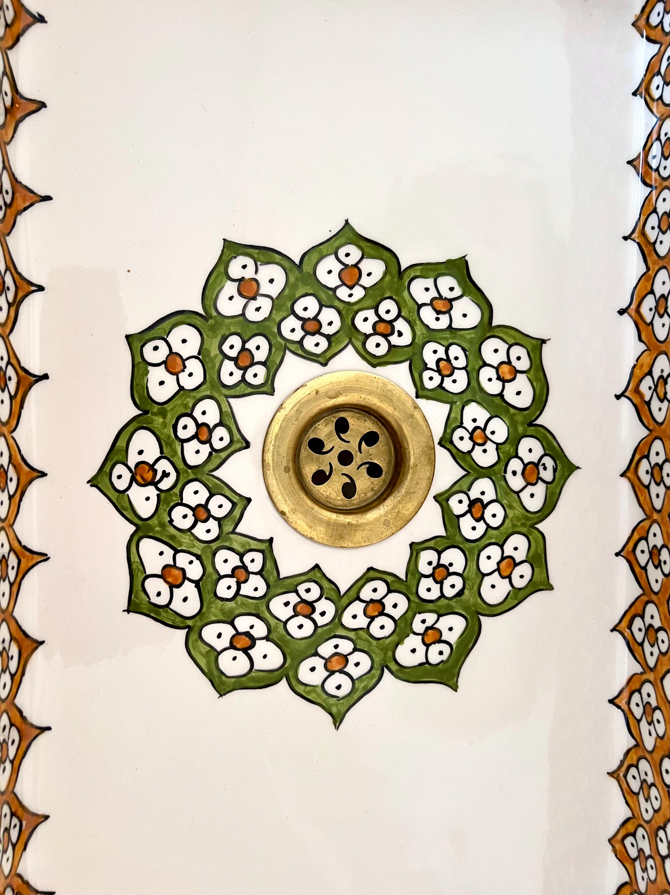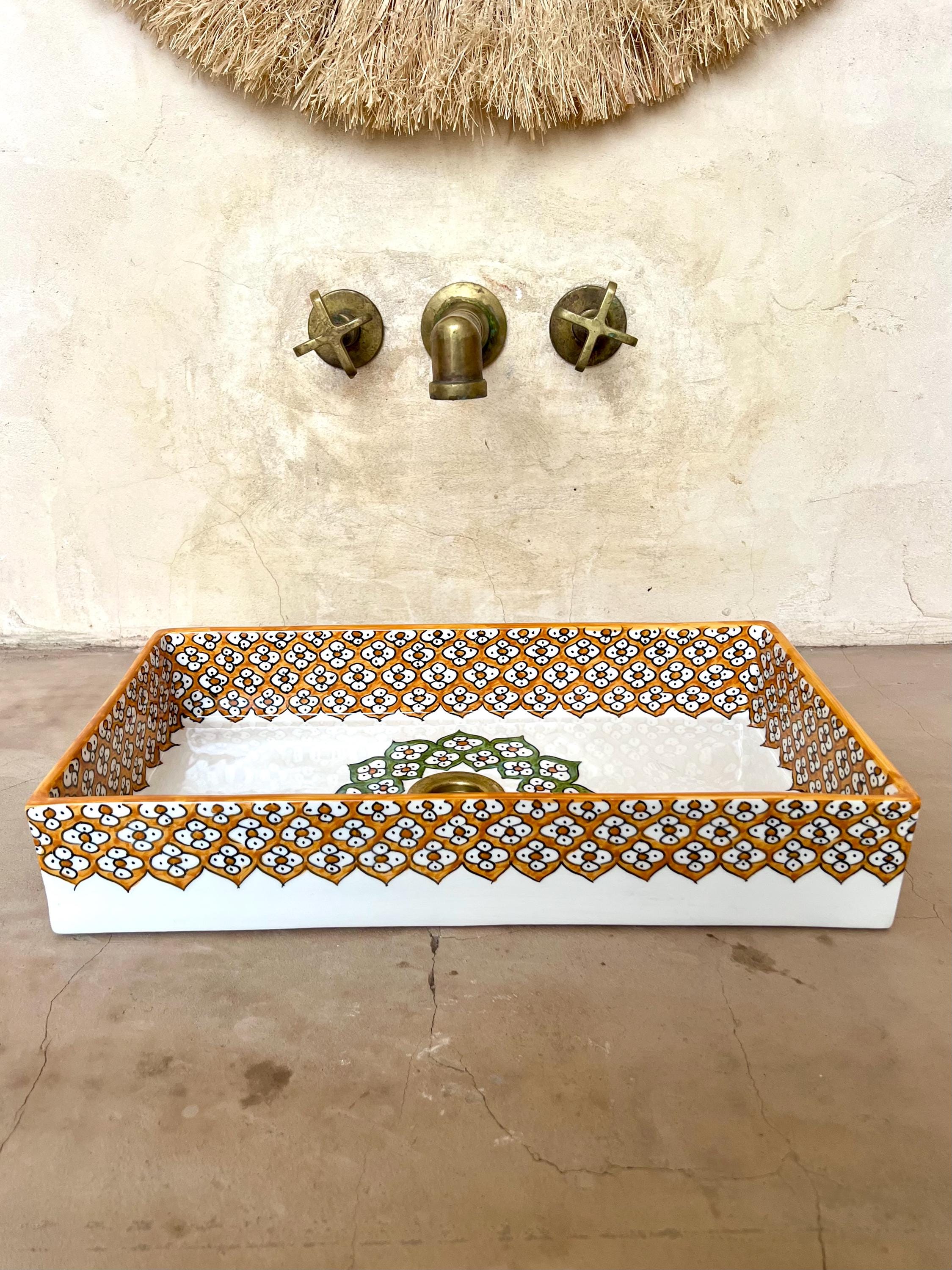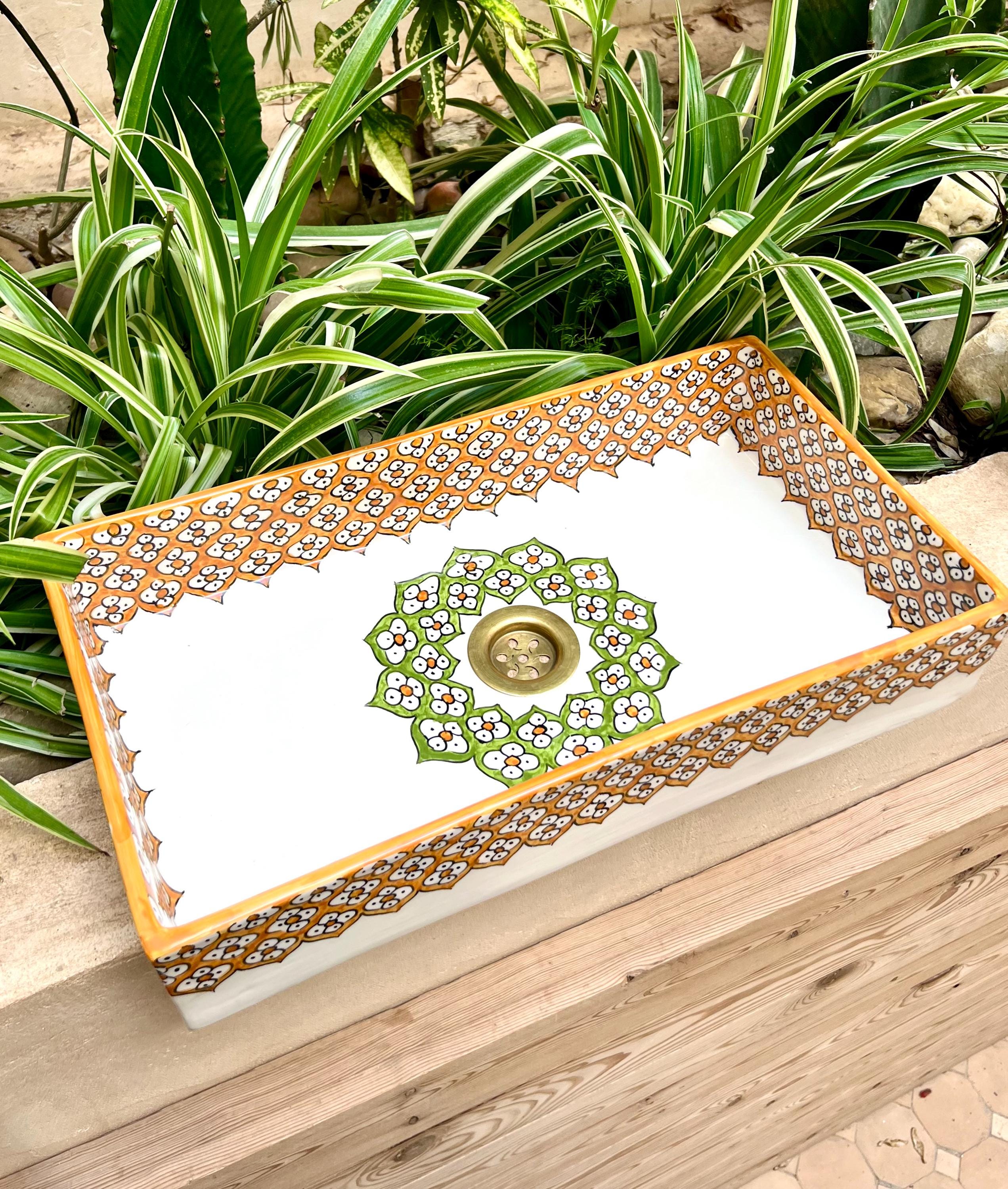 This beautiful Moroccan rectangular sink is handmade by skilled artisans using high-quality ceramic. Featuring traditional hand-painted designs and a smooth glazed finish, it is both durable and easy to clean. Perfect for kitchens, bathrooms, or powder rooms, it adds a unique touch of Moroccan charm to any space. The sink comes with both silver and copper drains included for free. If you need a different size, feel free to contact us.