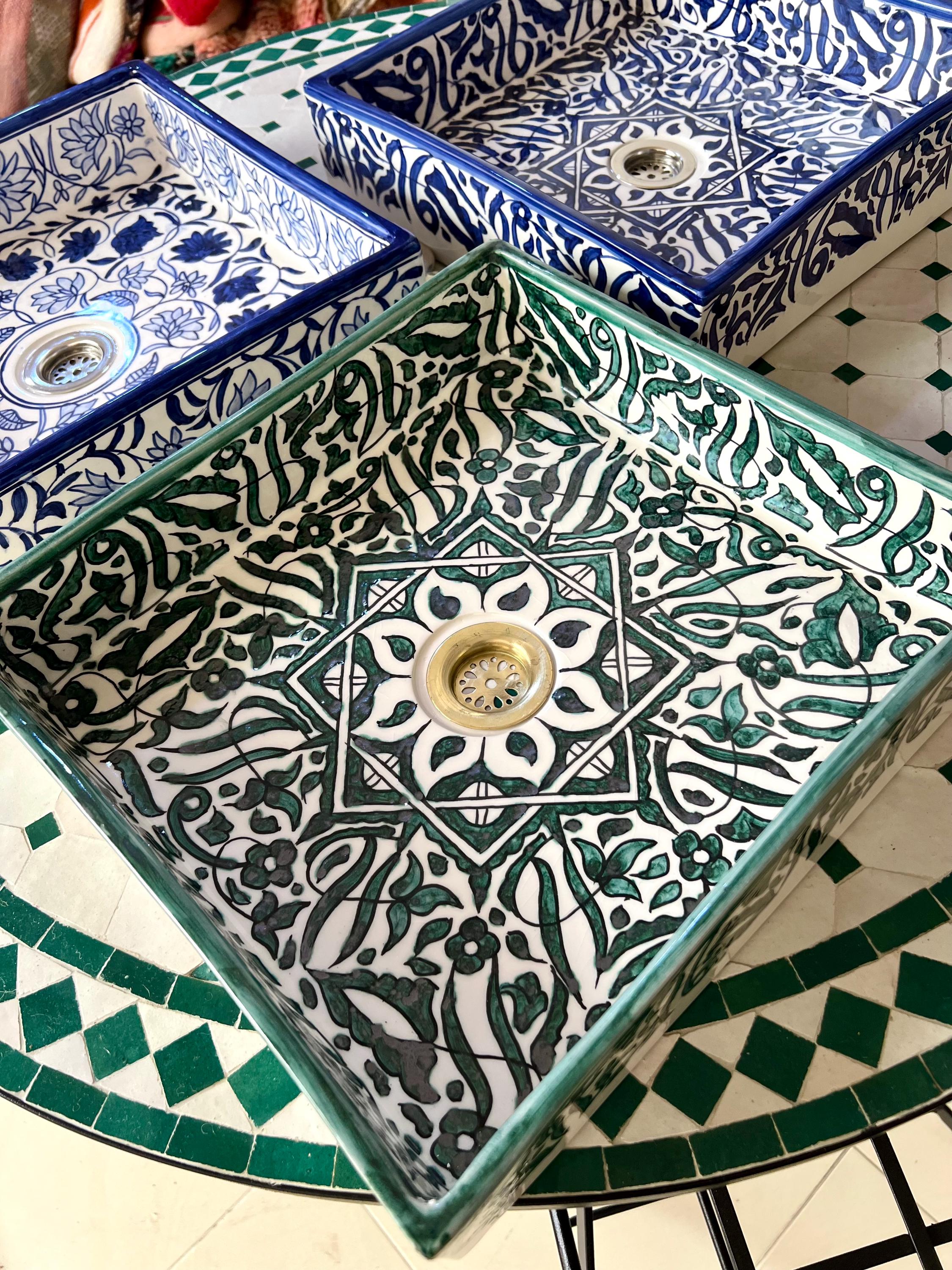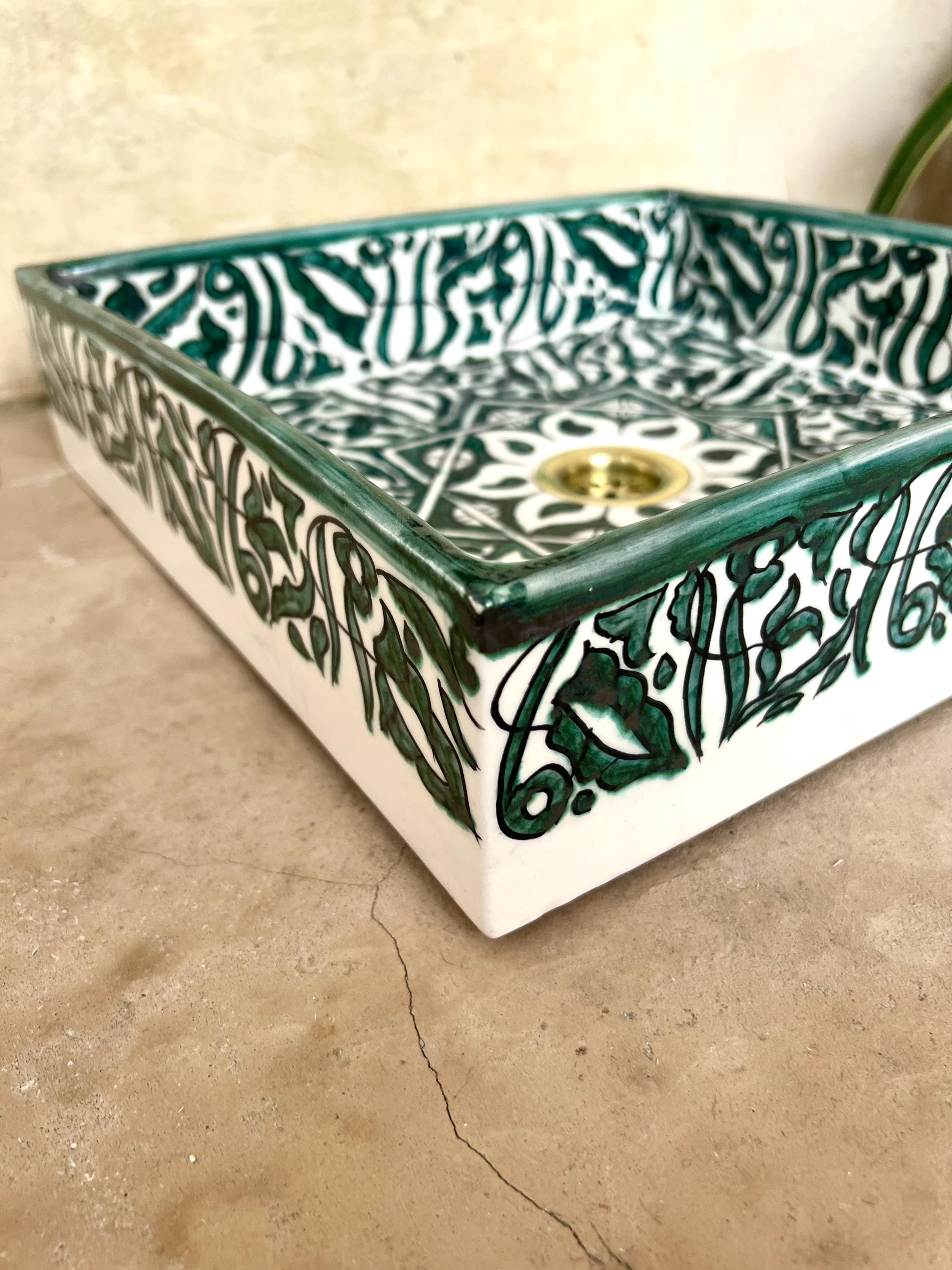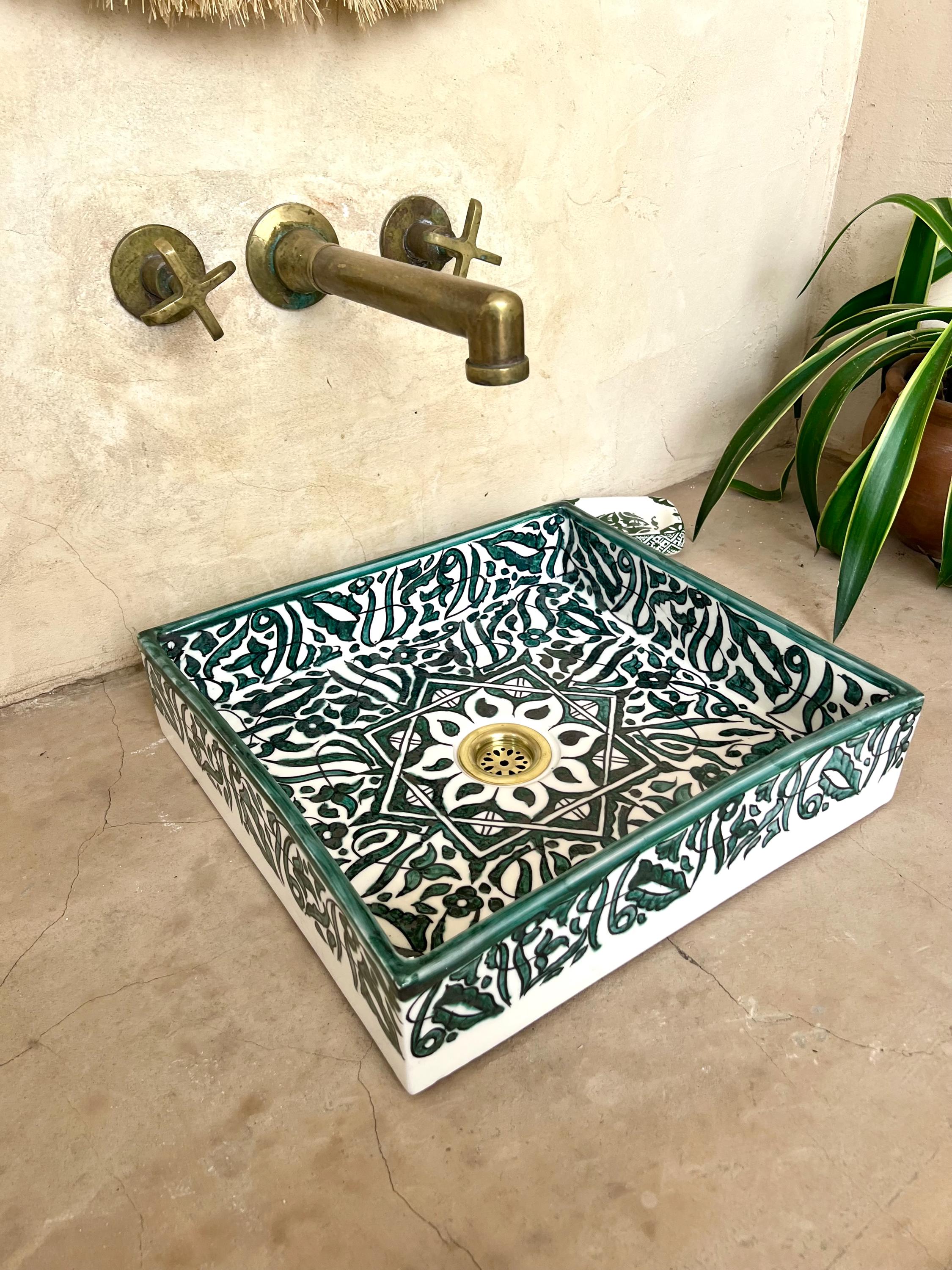 This beautiful Moroccan rectangular sink is handmade by skilled artisans using high-quality ceramic. Featuring traditional hand-painted designs and a smooth glazed finish, it is both durable and easy to clean. Perfect for kitchens, bathrooms, or powder rooms, it adds a unique touch of Moroccan charm to any space. The sink comes with both silver and copper drains included for free. If you need a different size, feel free to contact us.