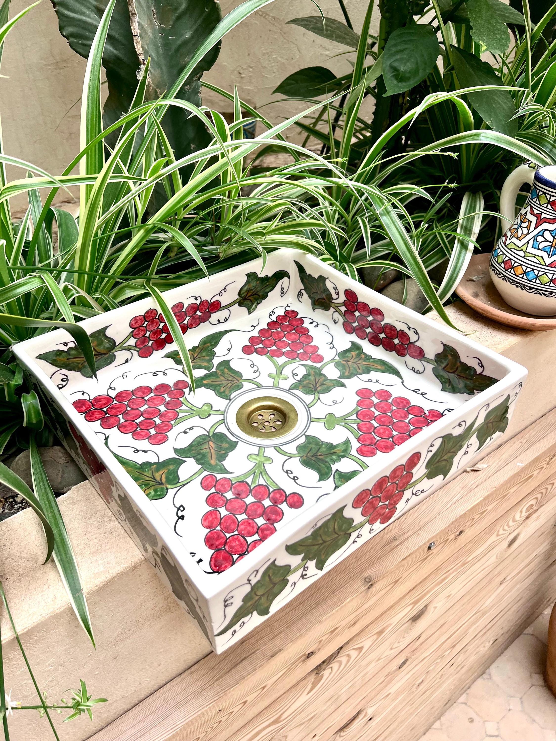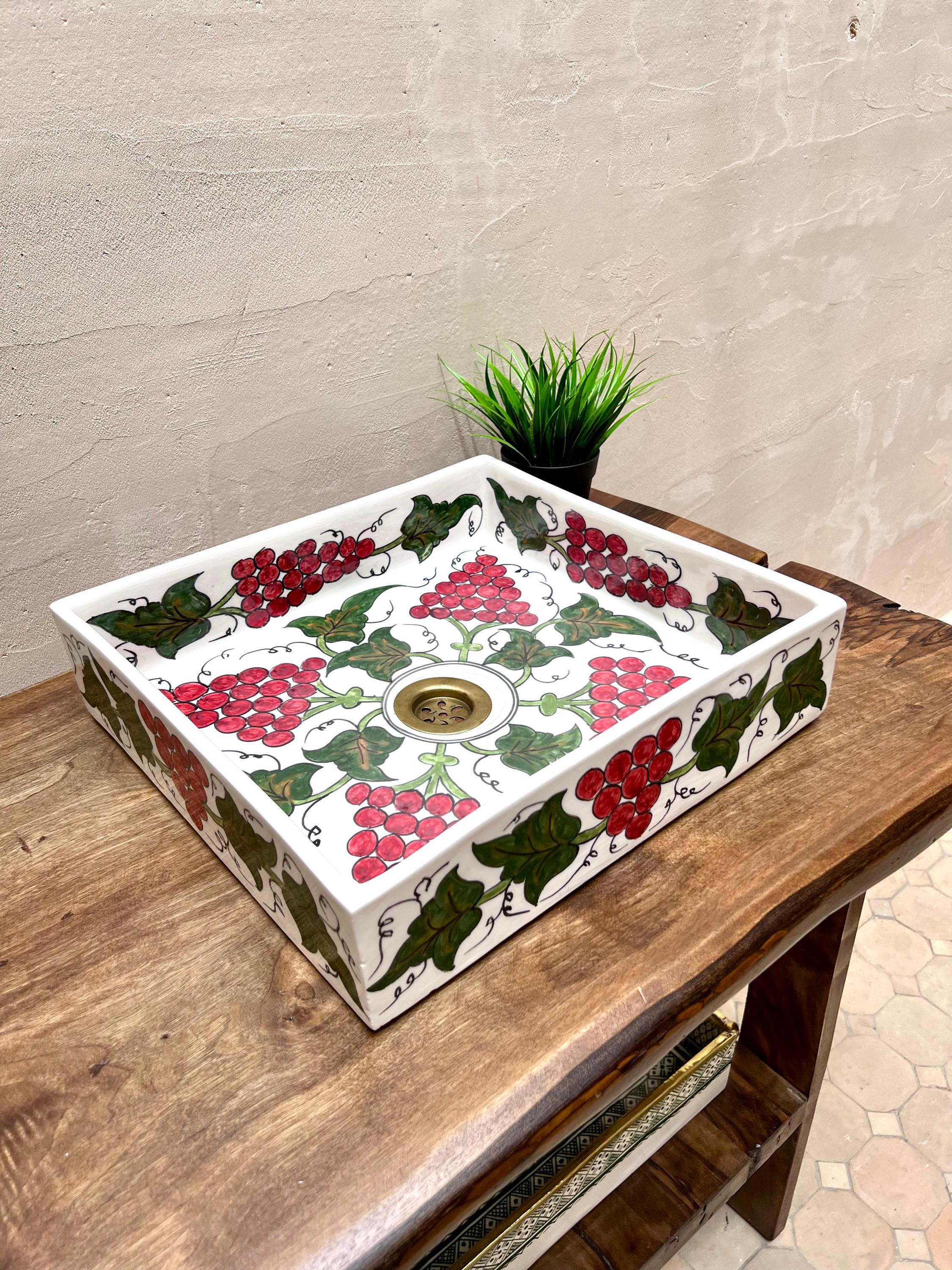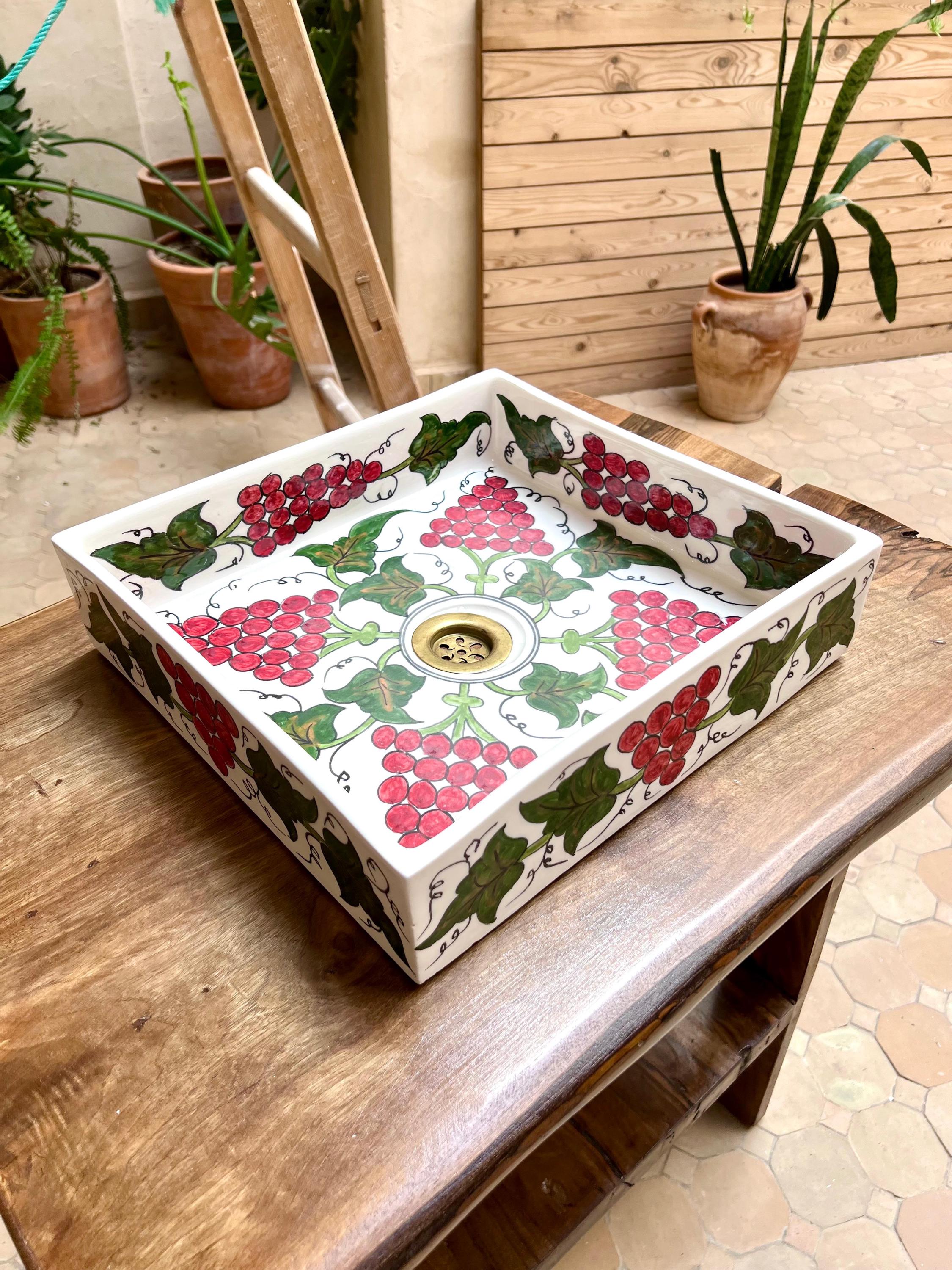 BohoDesign Artisanat – Exclusive Hand-Painted Flower Design Rectangular Sink Discover our exclusive BohoDesign artisanat rectangular sink, a masterpiece of hand-painted Moroccan craftsmanship. Carefully designed by skilled artisans, this one-of-a-kind sink features an intricate floral motif, blending bohemian charm with traditional artistry. Made from premium ceramic, its vibrant colors and detailed patterns bring warmth and elegance to any bathroom or kitchen. With its sleek rectangular shape, this sink is both a functional and artistic statement piece, perfect for those who appreciate authentic, handcrafted design. Elevate your space with a unique touch of Moroccan heritage.
