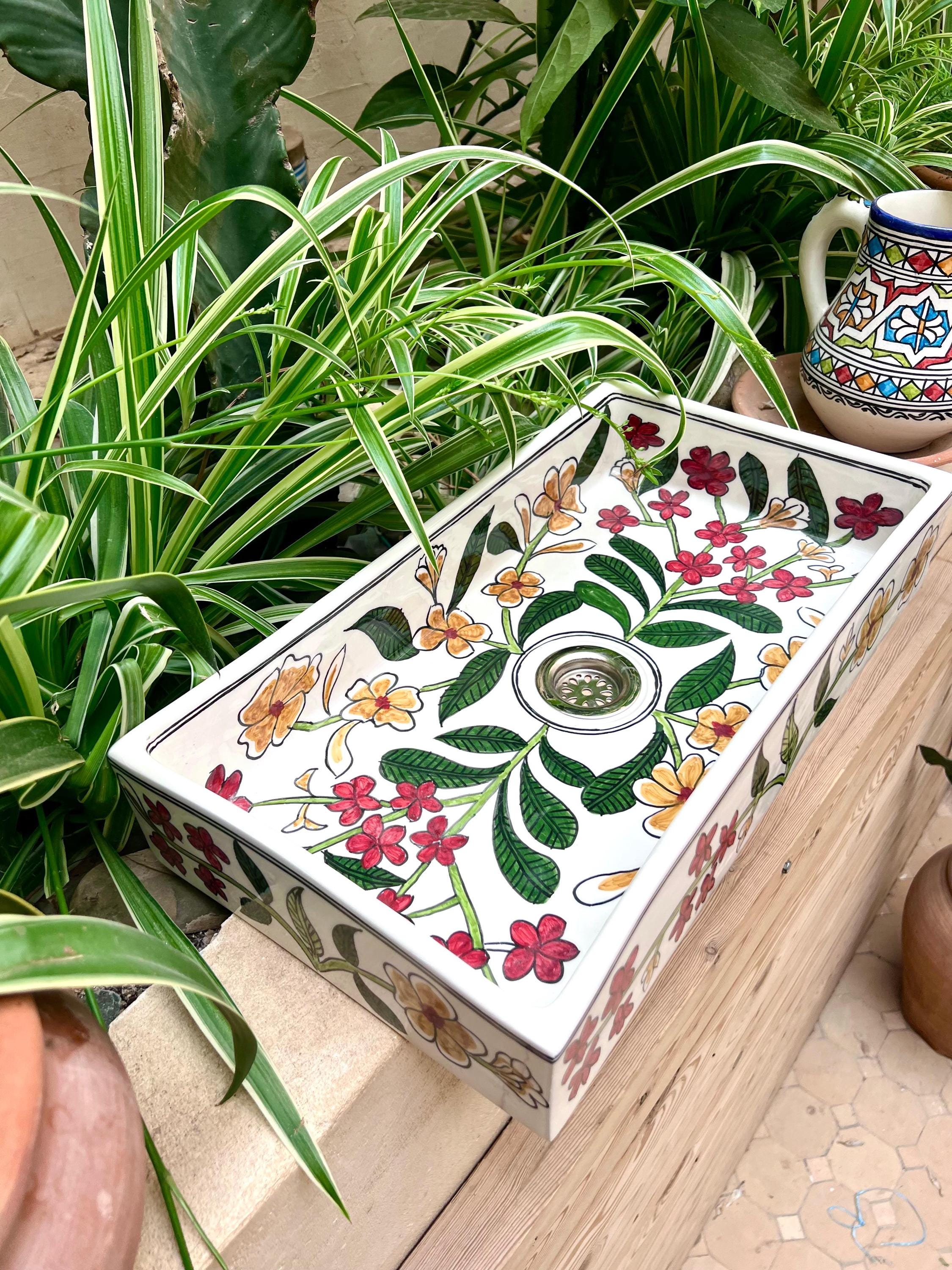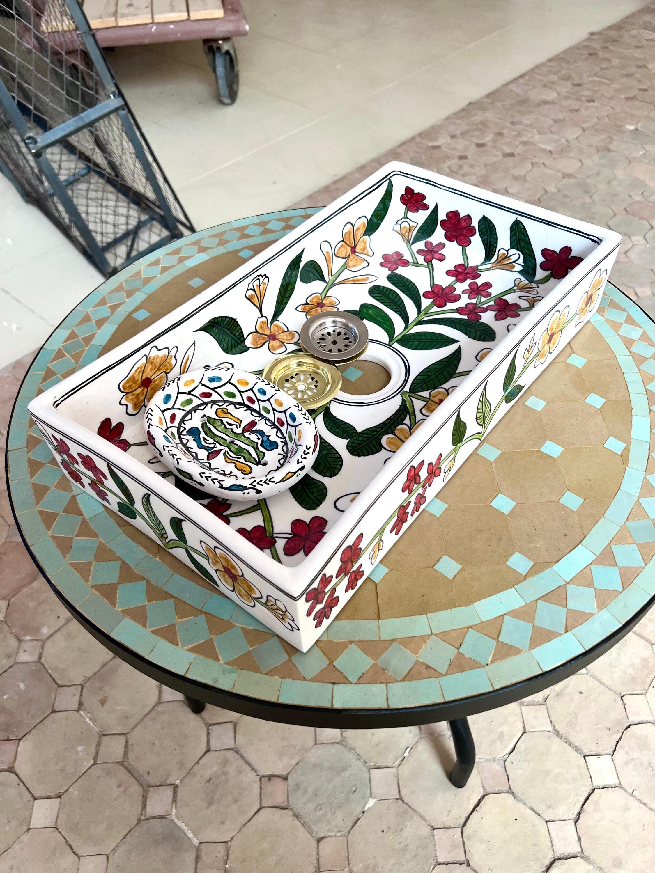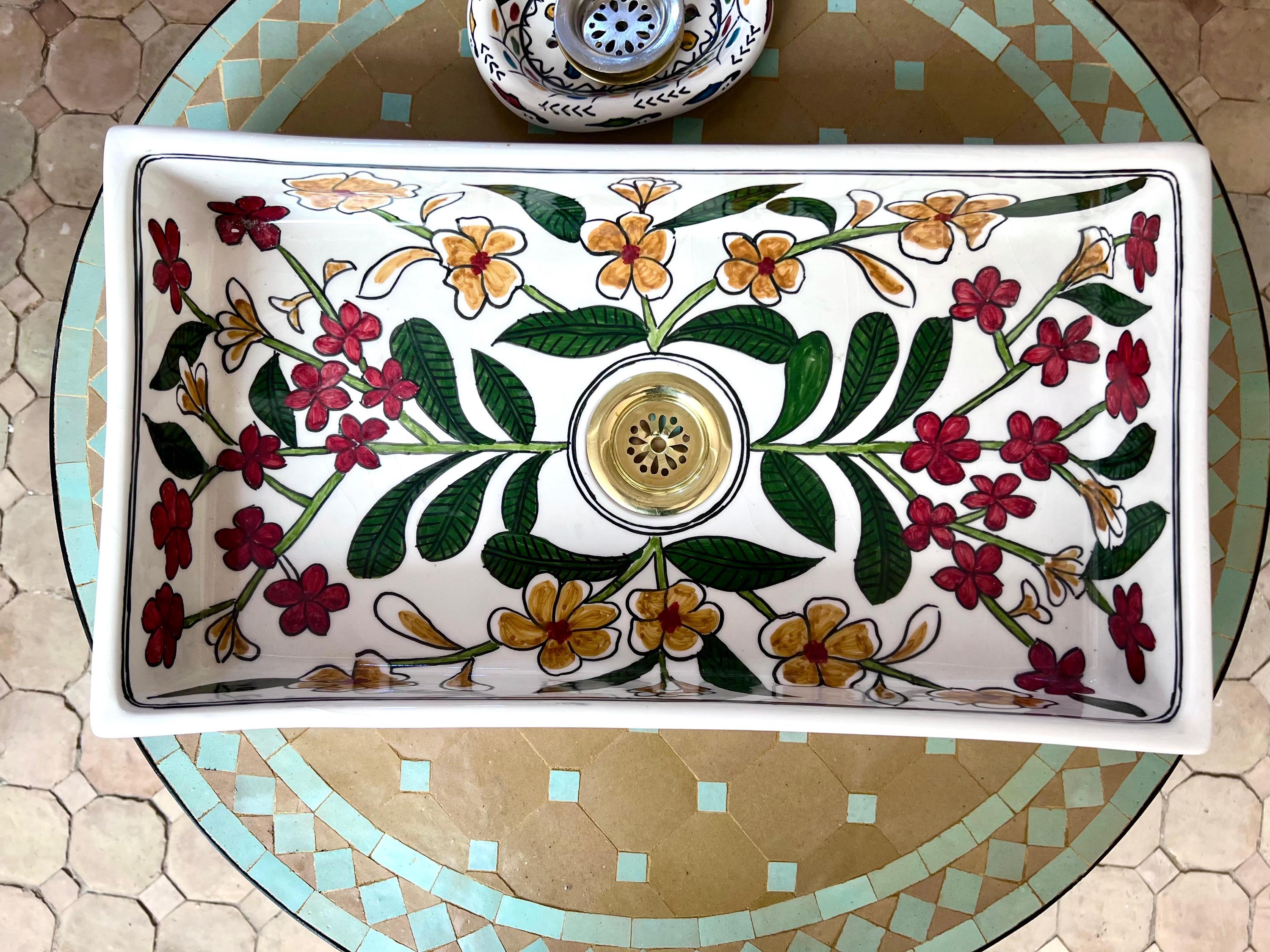 BohoDesign Artisanat – Exclusive Hand-Painted Flower Design Rectangular Sink Discover our exclusive BohoDesign artisanat rectangular sink, a masterpiece of hand-painted Moroccan craftsmanship. Carefully designed by skilled artisans, this one-of-a-kind sink features an intricate floral motif, blending bohemian charm with traditional artistry. Made from premium ceramic, its vibrant colors and detailed patterns bring warmth and elegance to any bathroom or kitchen. With its sleek rectangular shape, this sink is both a functional and artistic statement piece, perfect for those who appreciate authentic, handcrafted design. Elevate your space with a unique touch of Moroccan heritage.