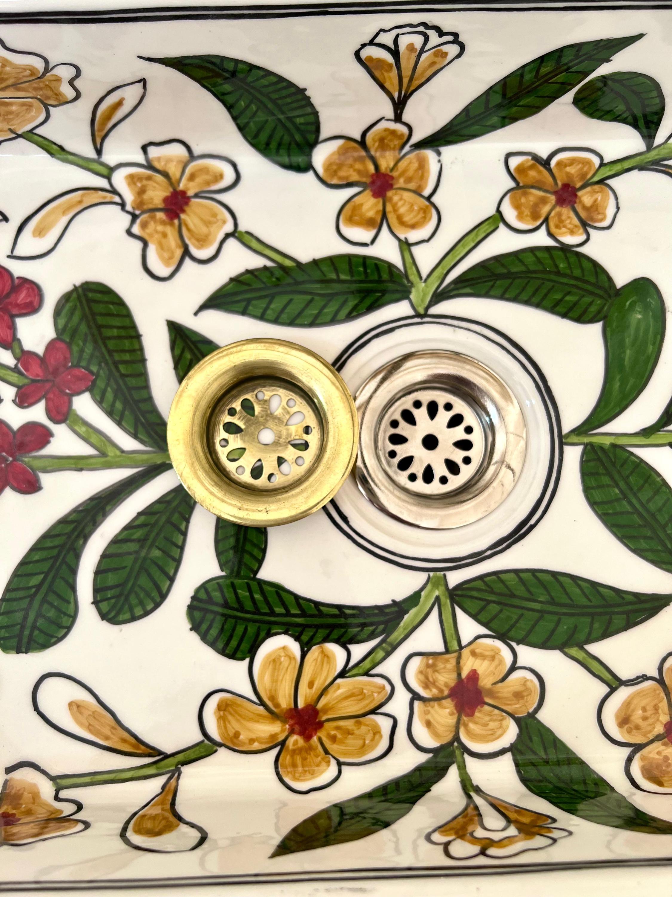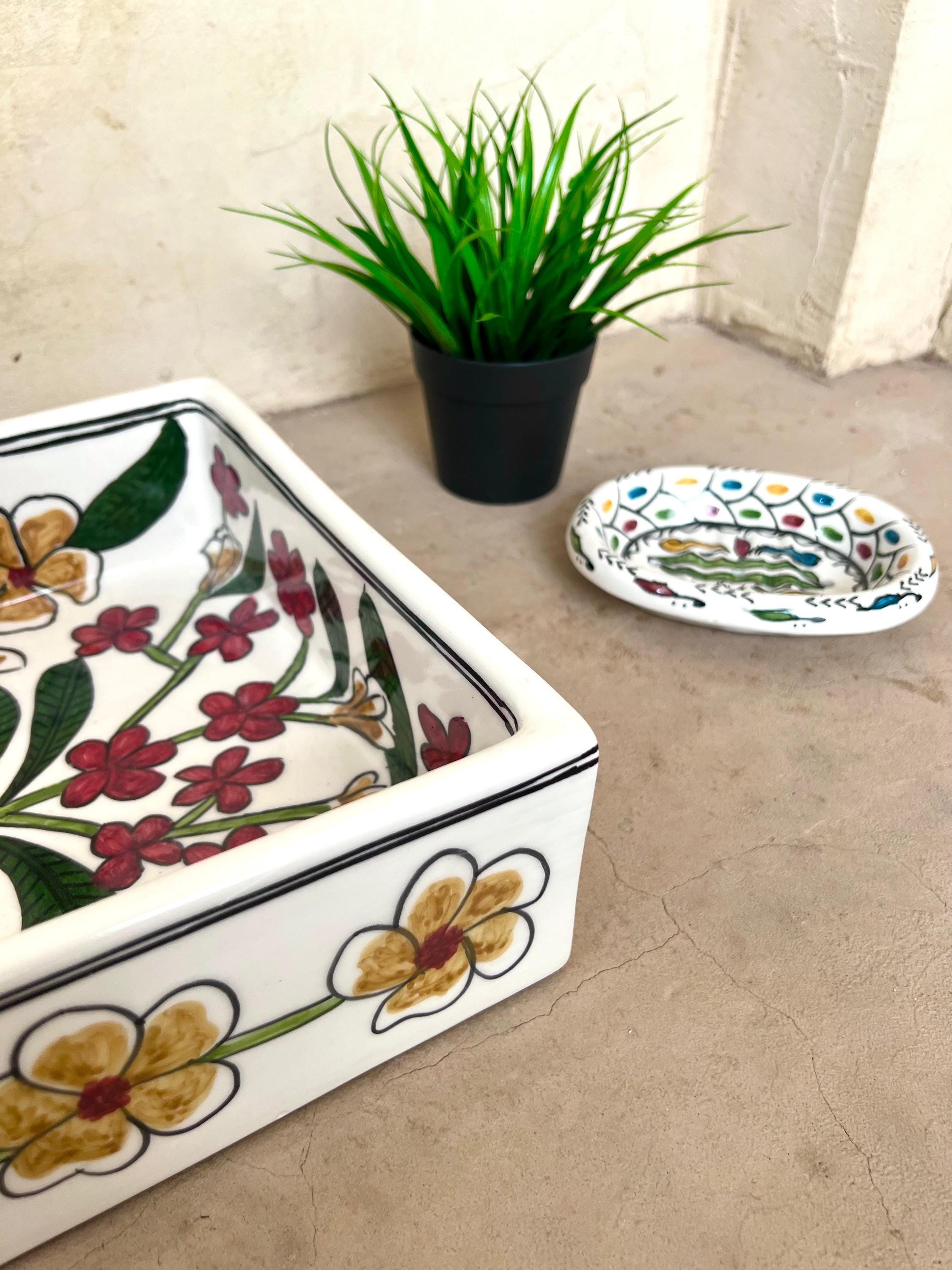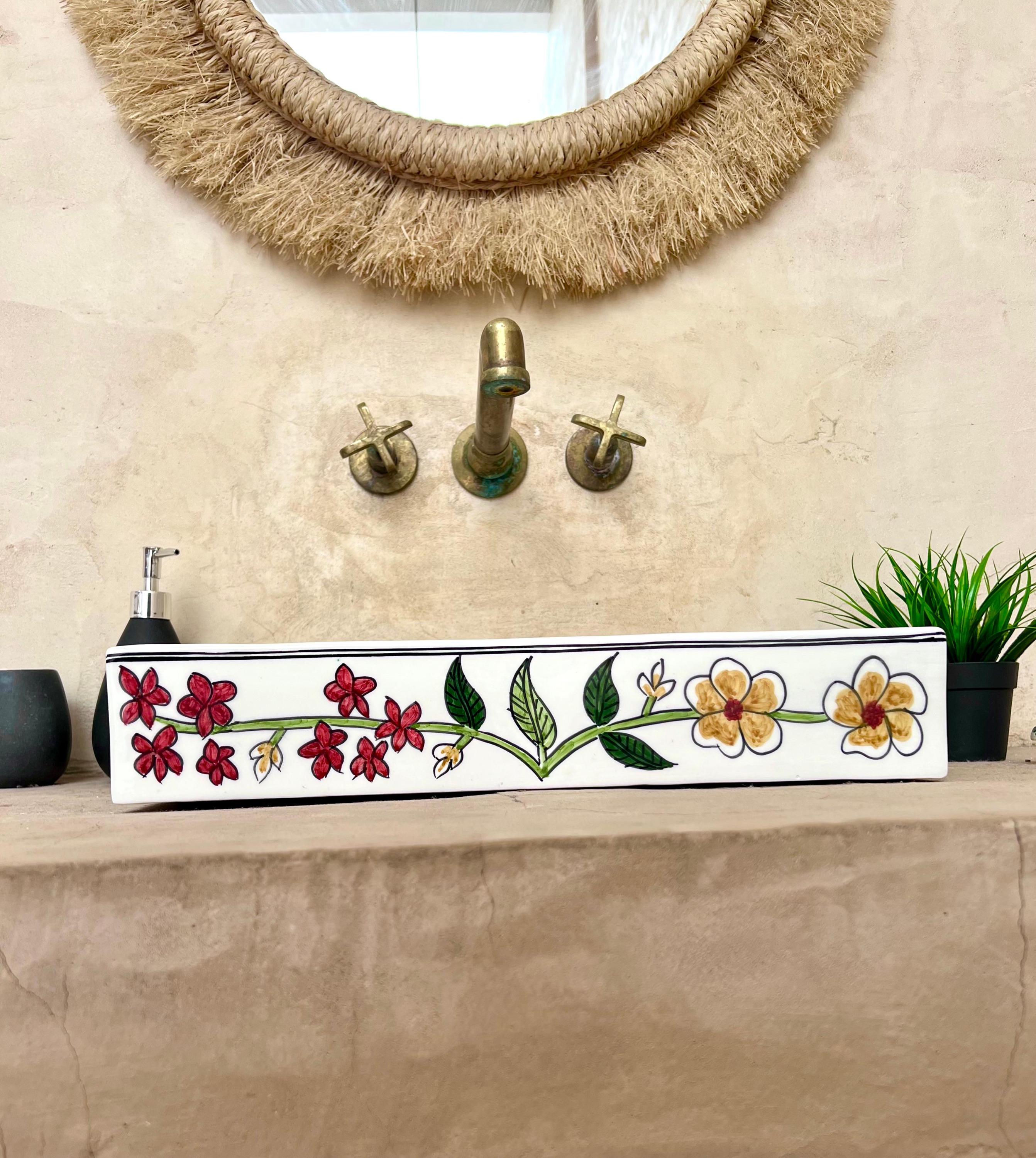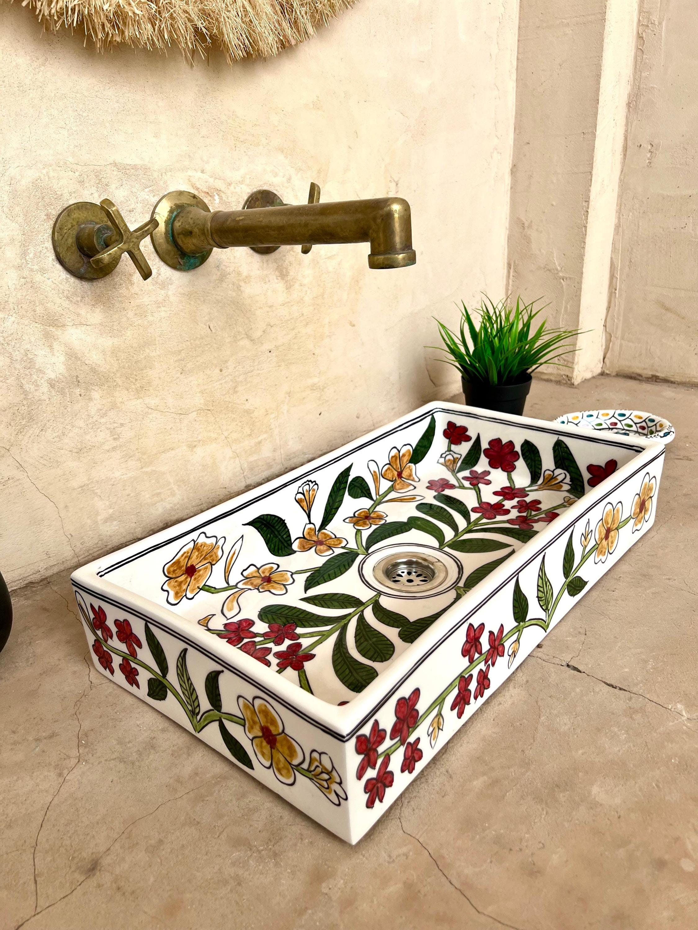 BohoDesign Artisanat – Exclusive Hand-Painted Flower Design Rectangular Sink Discover our exclusive BohoDesign artisanat rectangular sink, a masterpiece of hand-painted Moroccan craftsmanship. Carefully designed by skilled artisans, this one-of-a-kind sink features an intricate floral motif, blending bohemian charm with traditional artistry. Made from premium ceramic, its vibrant colors and detailed patterns bring warmth and elegance to any bathroom or kitchen. With its sleek rectangular shape, this sink is both a functional and artistic statement piece, perfect for those who appreciate authentic, handcrafted design. Elevate your space with a unique touch of Moroccan heritage.