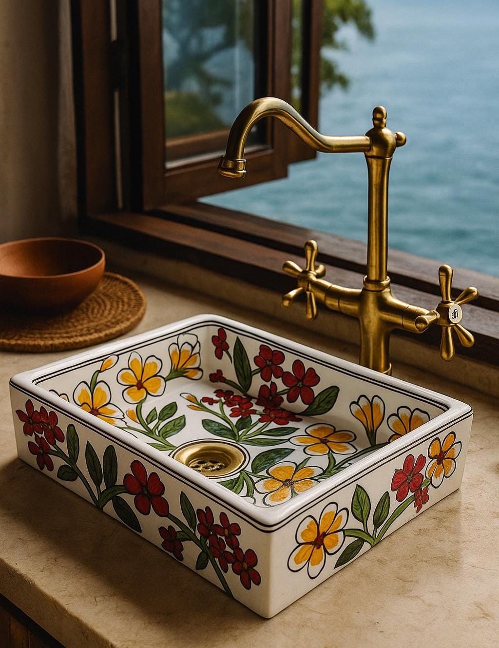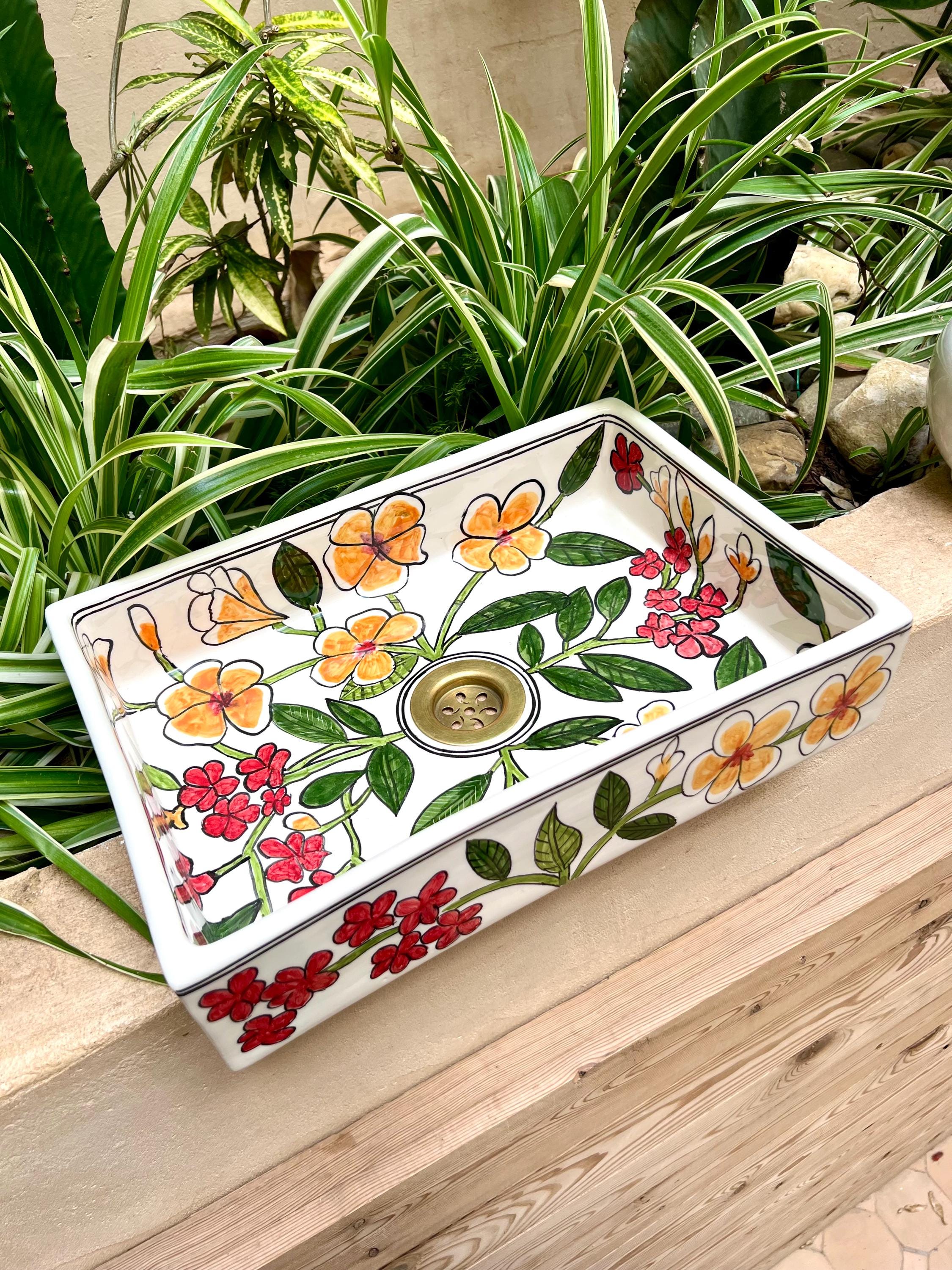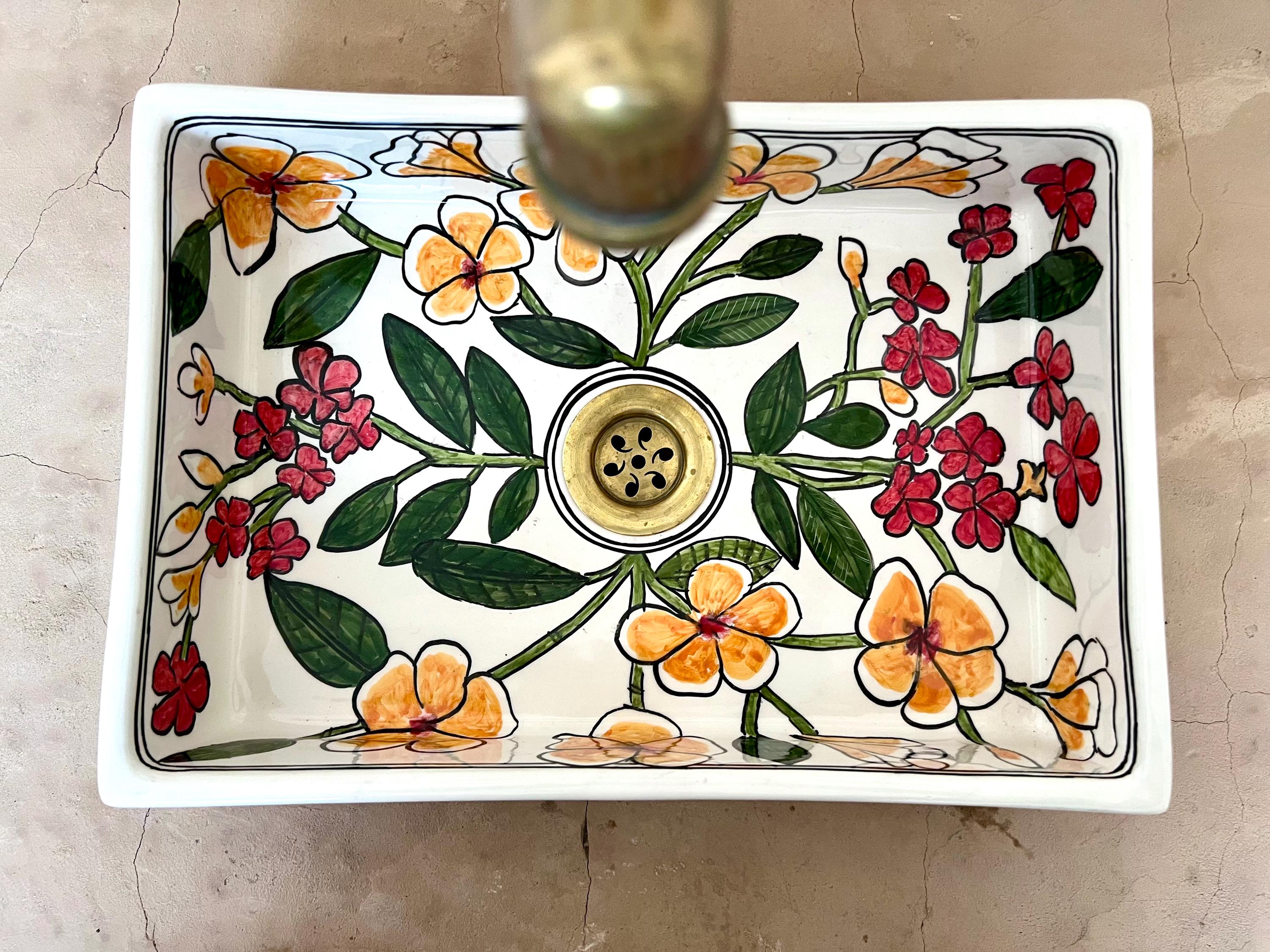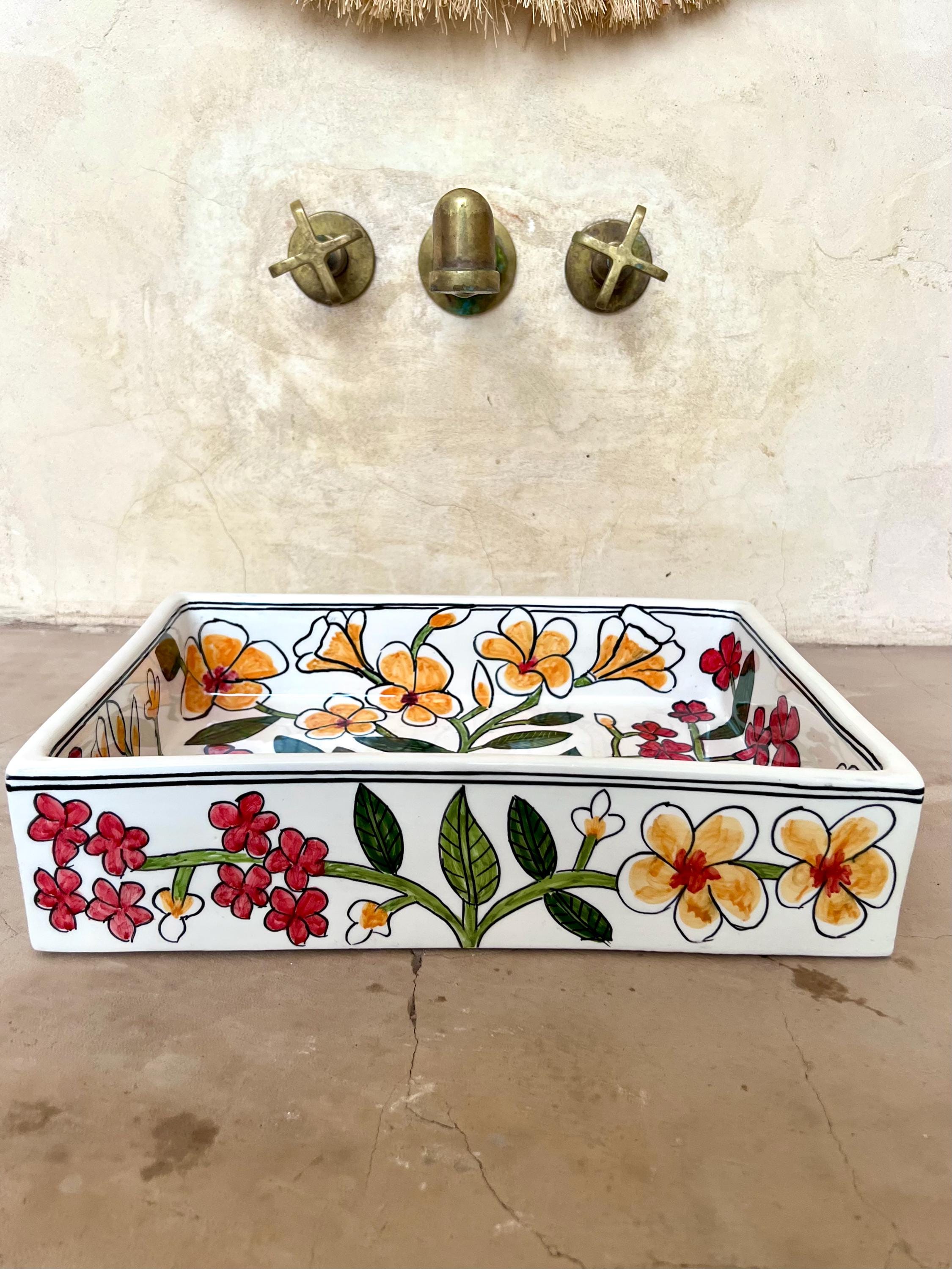 BohoDesign Artisanat – Exclusive Hand-Painted Flower Design Rectangular Sink Discover our exclusive BohoDesign artisanat rectangular sink, a masterpiece of hand-painted Moroccan craftsmanship. Carefully designed by skilled artisans, this one-of-a-kind sink features an intricate floral motif, blending bohemian charm with traditional artistry. Made from premium ceramic, its vibrant colors and detailed patterns bring warmth and elegance to any bathroom or kitchen. With its sleek rectangular shape, this sink is both a functional and artistic statement piece, perfect for those who appreciate authentic, handcrafted design. Elevate your space with a unique touch of Moroccan heritage.