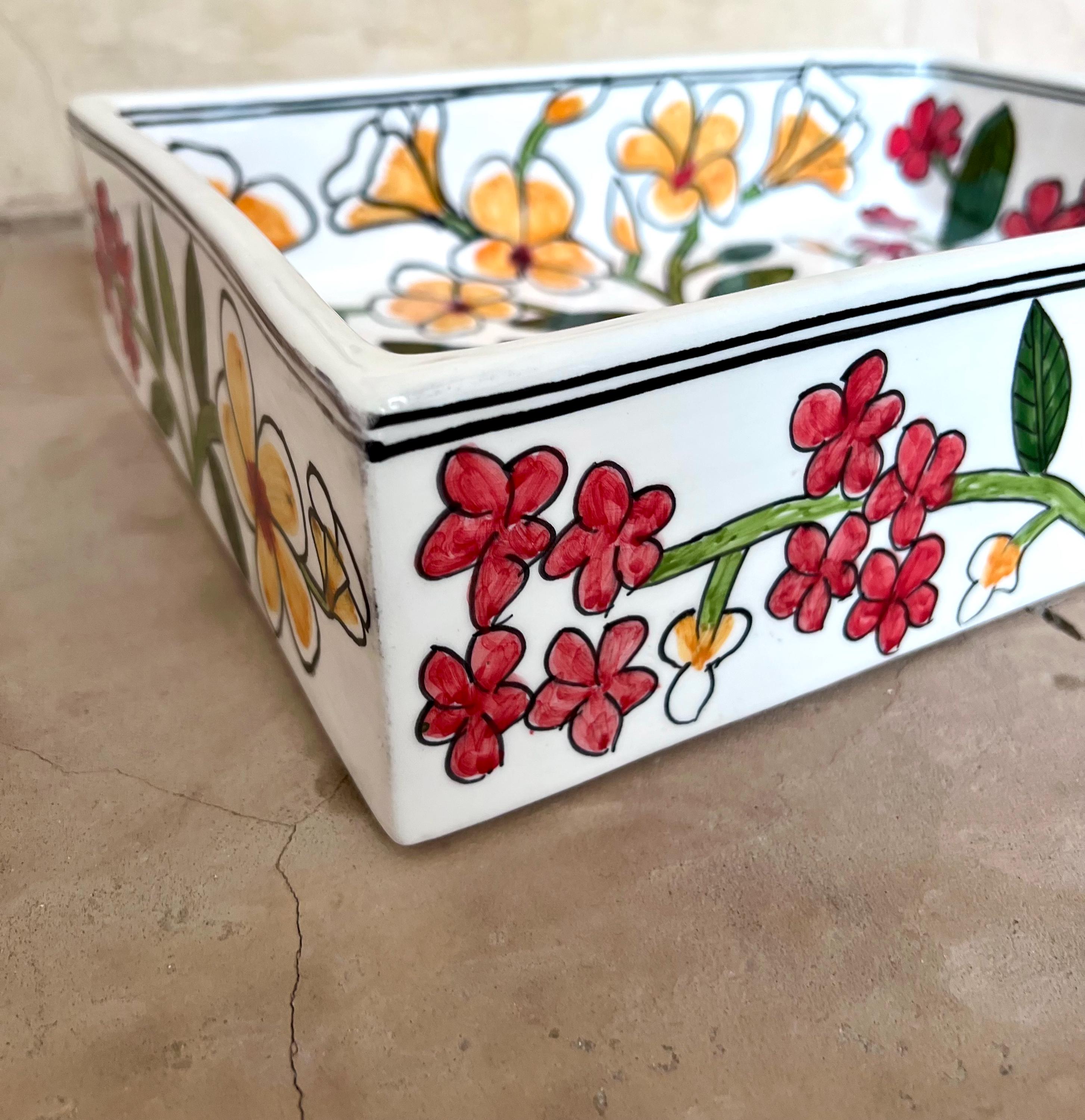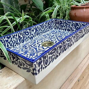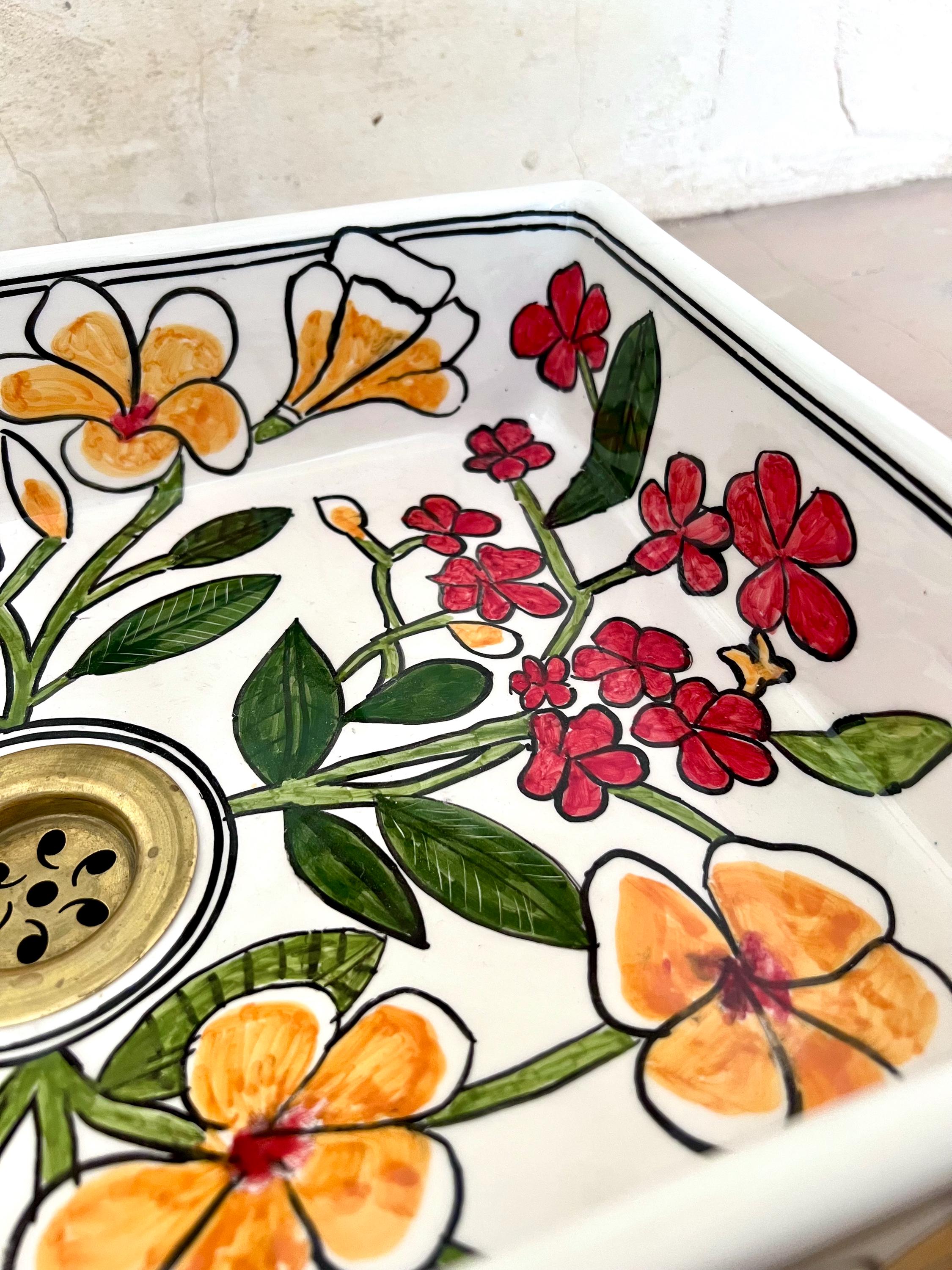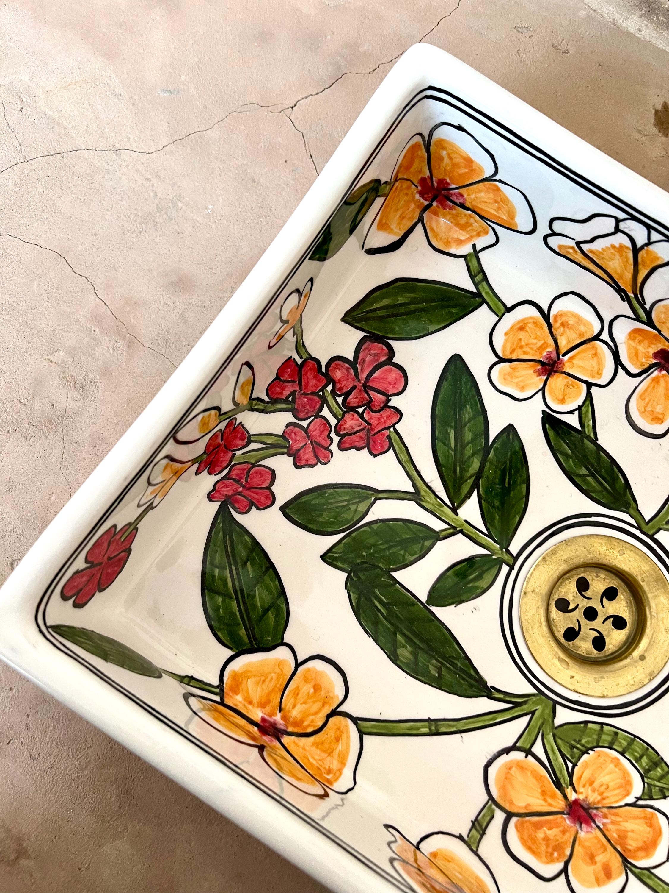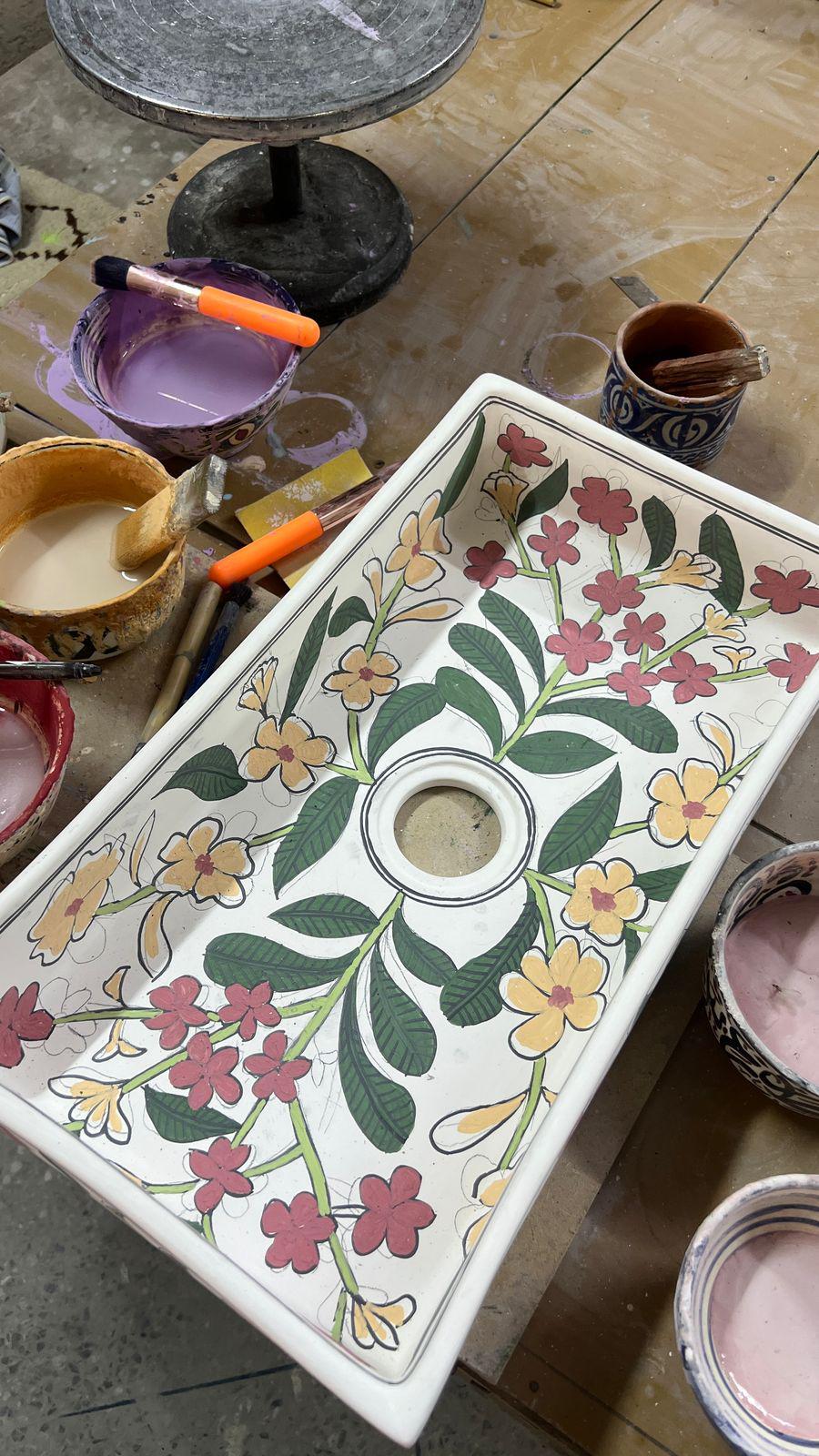 BohoDesign Artisanat – Exclusive Hand-Painted Flower Design Rectangular Sink Discover our exclusive BohoDesign artisanat rectangular sink, a masterpiece of hand-painted Moroccan craftsmanship. Carefully designed by skilled artisans, this one-of-a-kind sink features an intricate floral motif, blending bohemian charm with traditional artistry. Made from premium ceramic, its vibrant colors and detailed patterns bring warmth and elegance to any bathroom or kitchen. With its sleek rectangular shape, this sink is both a functional and artistic statement piece, perfect for those who appreciate authentic, handcrafted design. Elevate your space with a unique touch of Moroccan heritage.