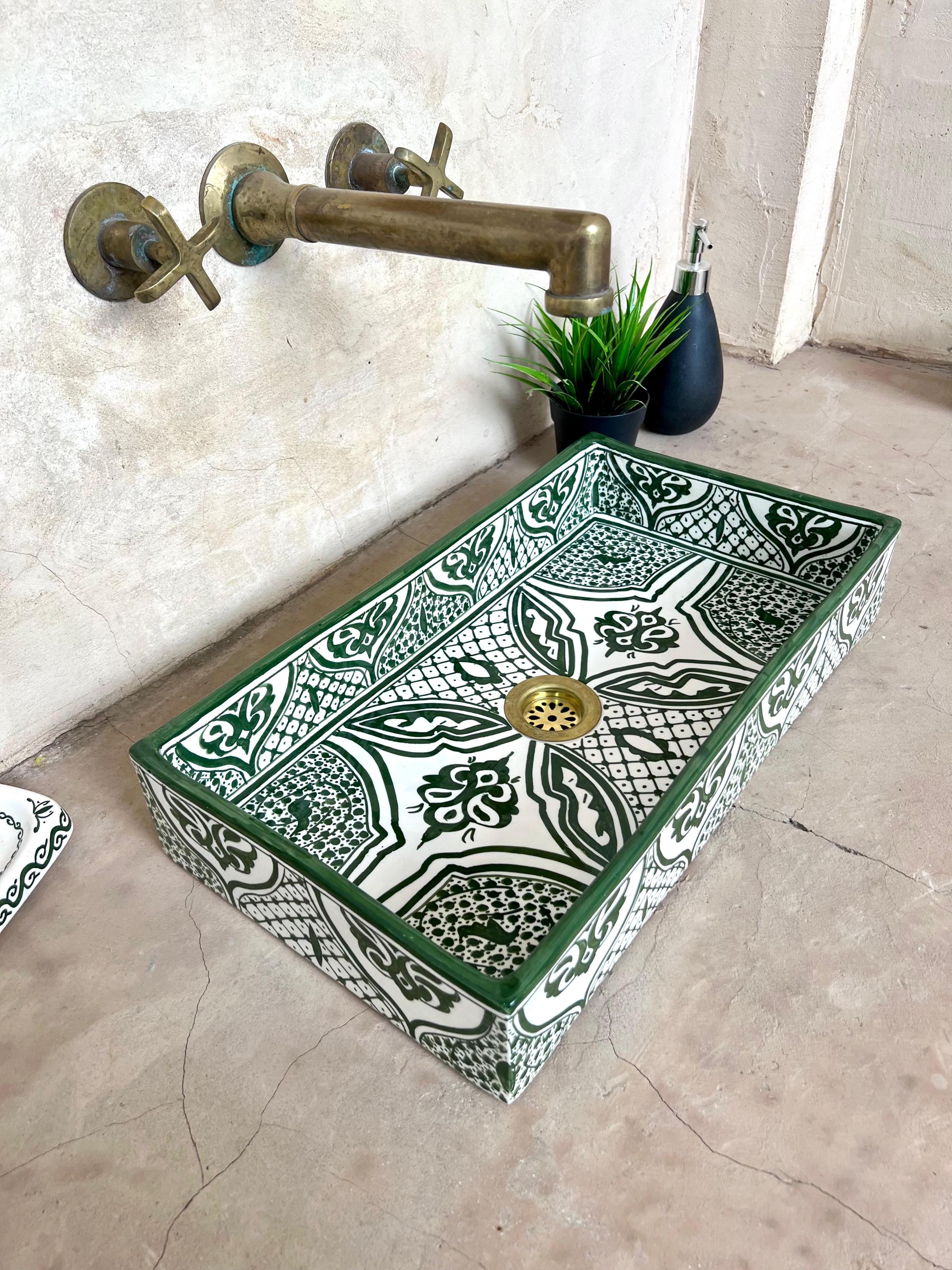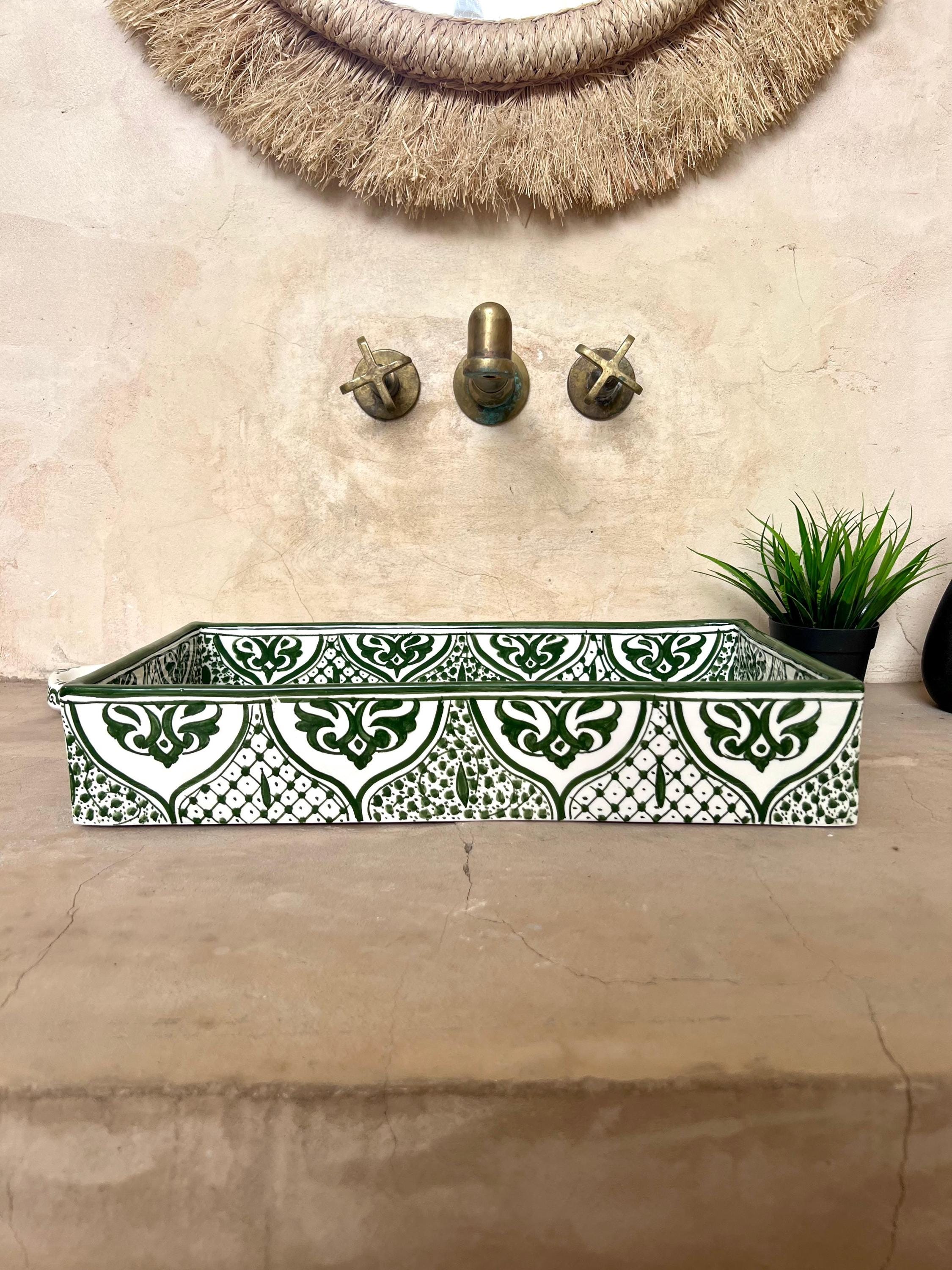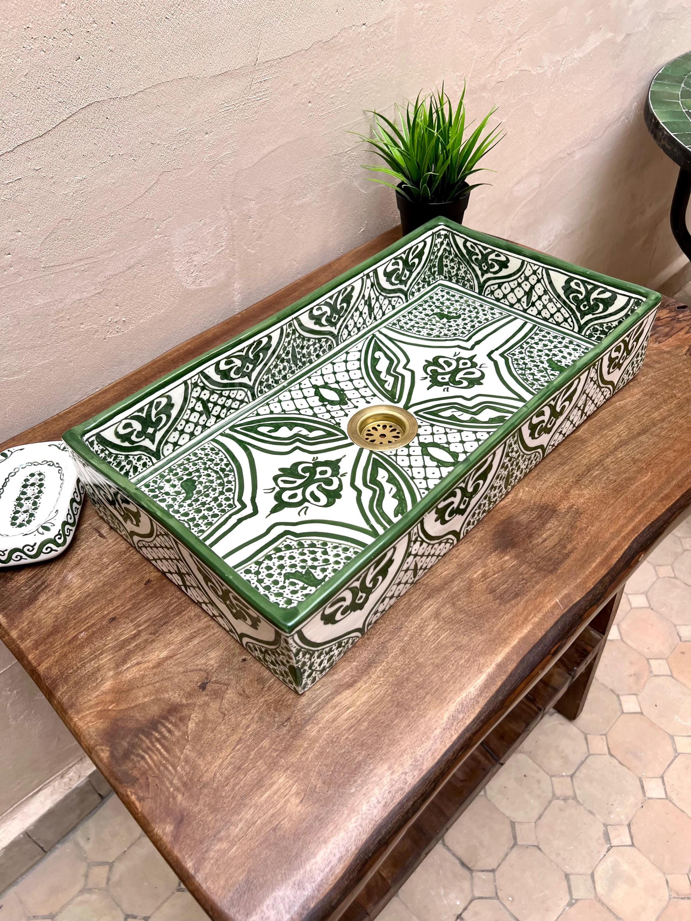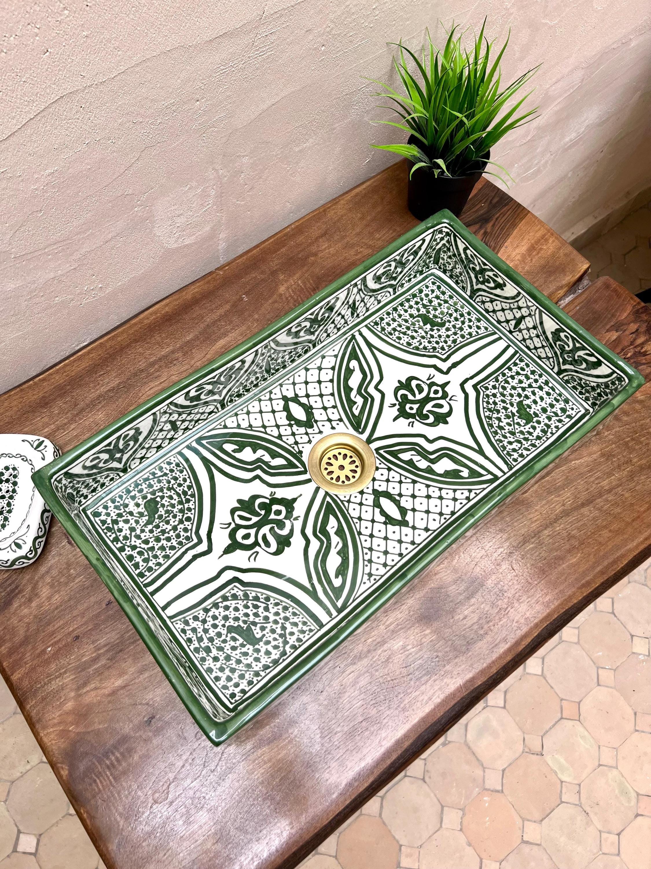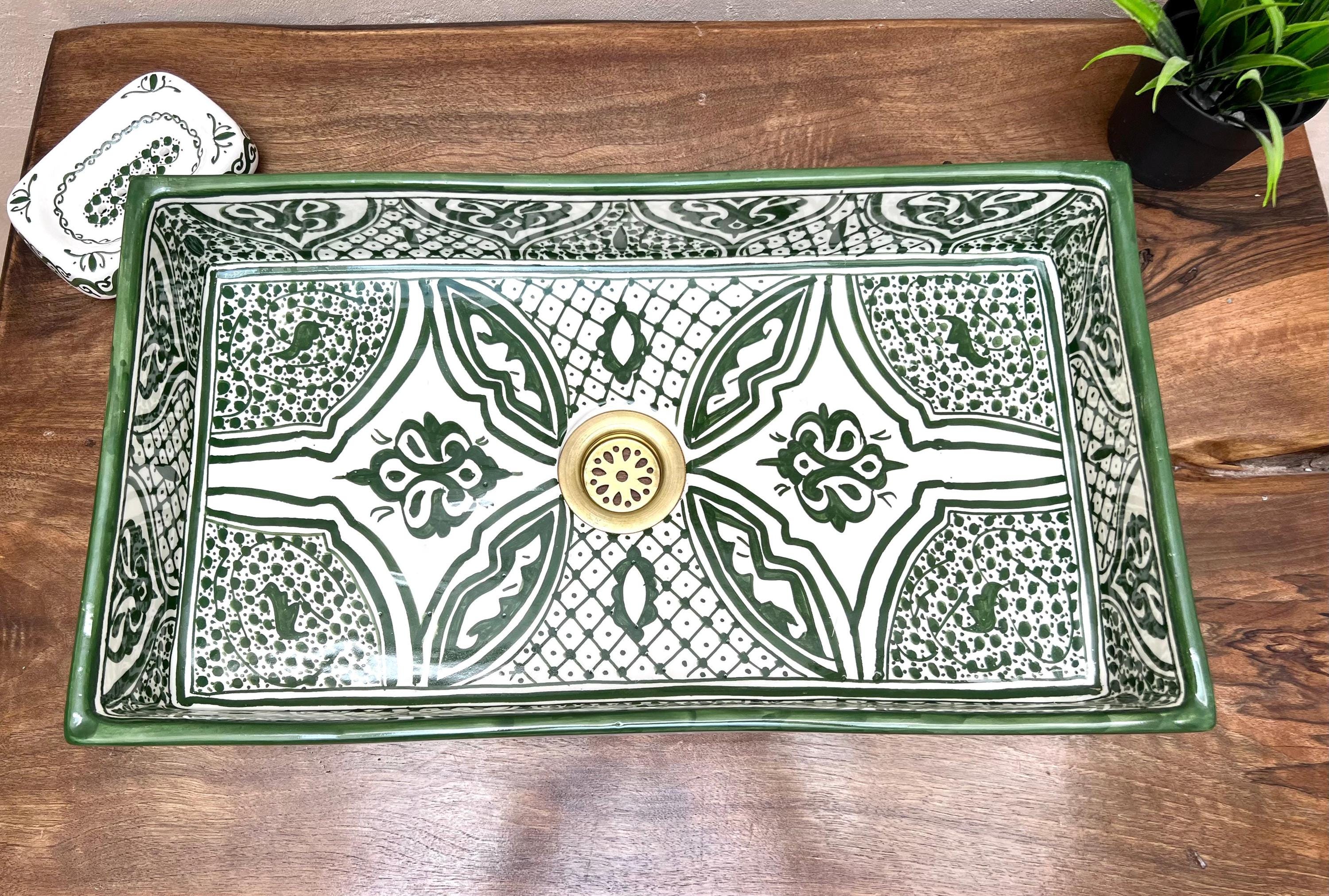 Handmade Moroccan Ceramic Sink: Rectangular Orchid Design, Olive Green, Free Drain