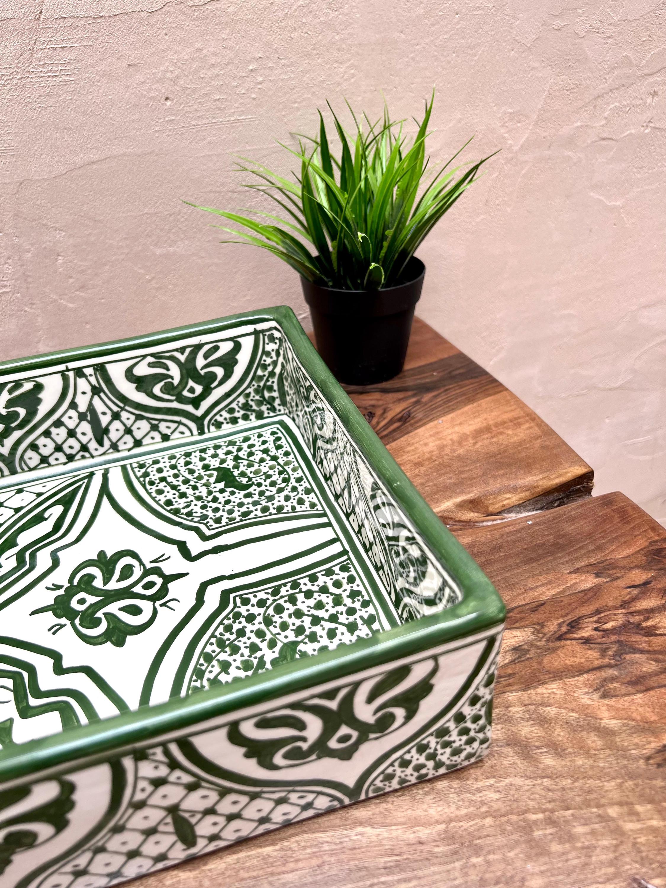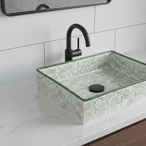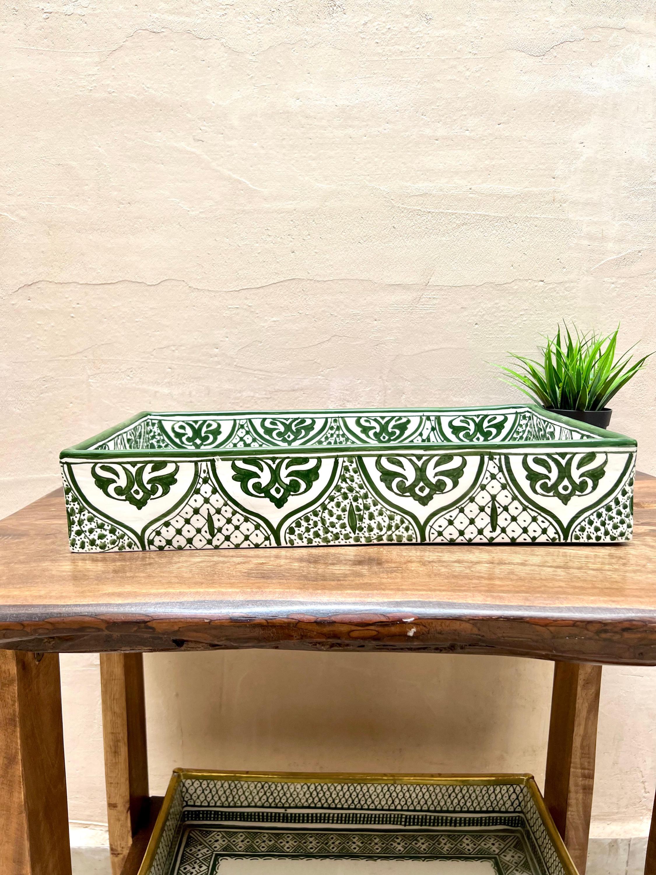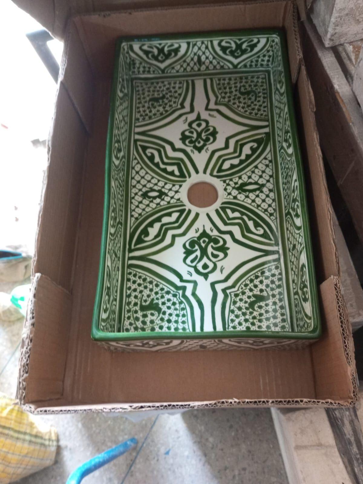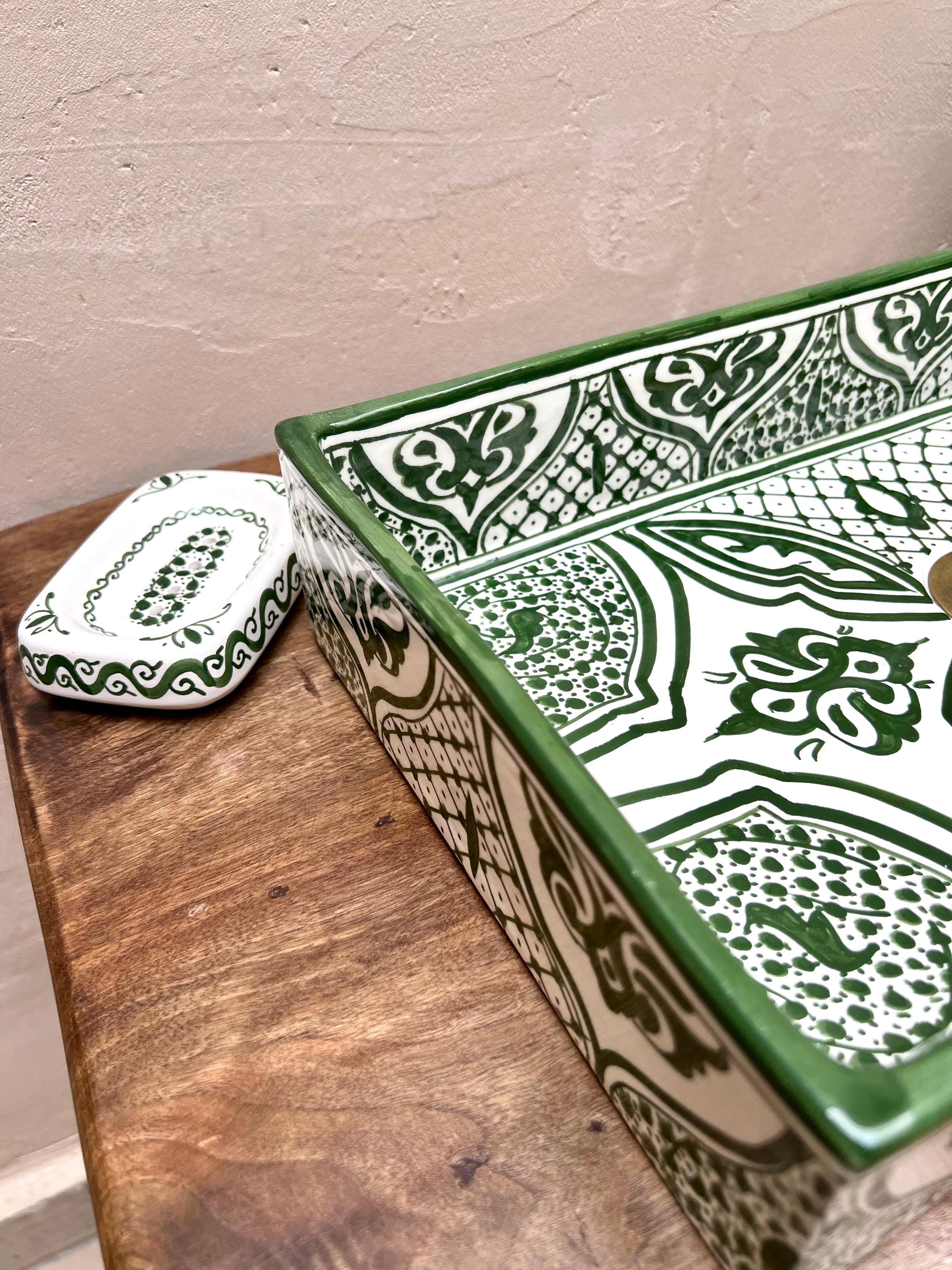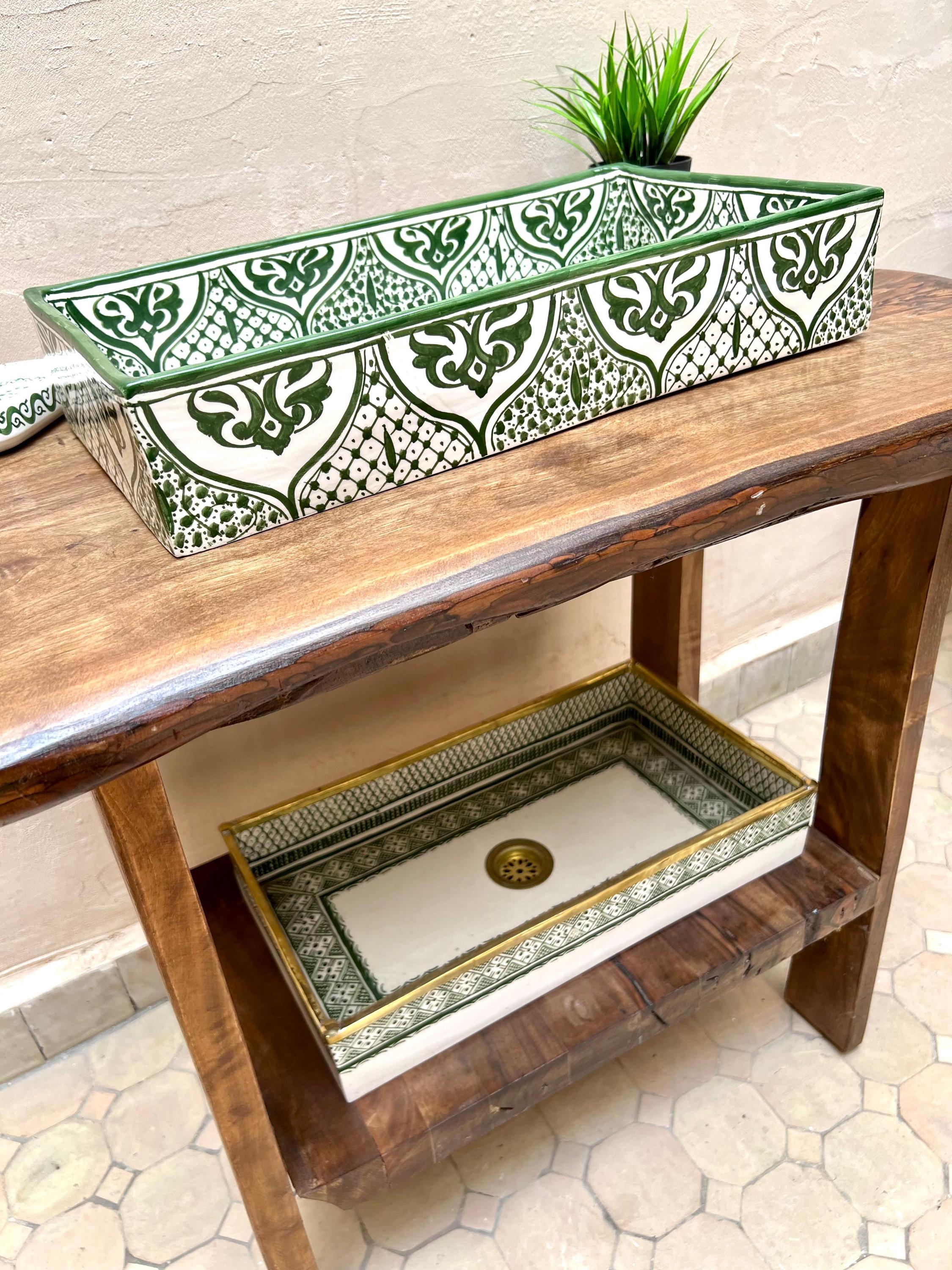 Handmade Moroccan Ceramic Sink: Rectangular Orchid Design, Olive Green, Free Drain