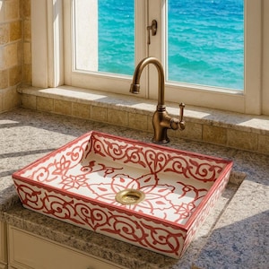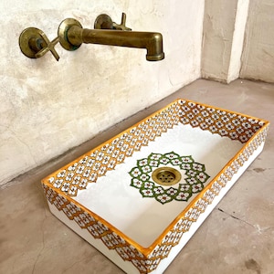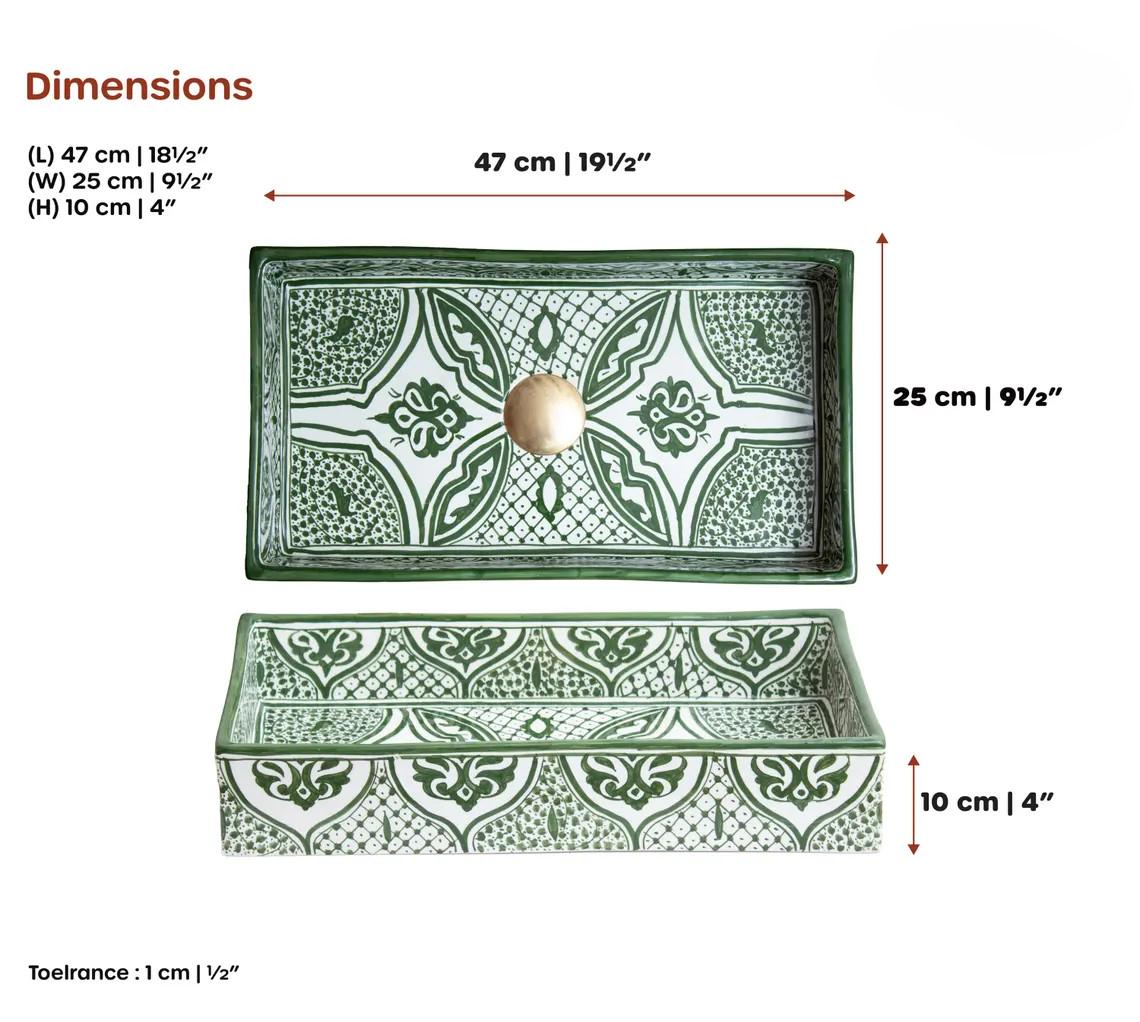 This beautiful Moroccan rectangular sink is handmade by skilled artisans using high-quality ceramic. Featuring traditional hand-painted designs and a smooth glazed finish, it is both durable and easy to clean. Perfect for kitchens, bathrooms, or powder rooms, it adds a unique touch of Moroccan charm to any space. The sink comes with both silver and copper drains included for free. If you need a different size, feel free to contact us.