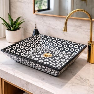 This beautiful Moroccan rectangular sink is handmade by skilled artisans using high-quality ceramic. Featuring traditional hand-painted designs and a smooth glazed finish, it is both durable and easy to clean. Perfect for kitchens, bathrooms, or powder rooms, it adds a unique touch of Moroccan charm to any space. The sink comes with both silver and copper drains included for free. If you need a different size, feel free to contact us.