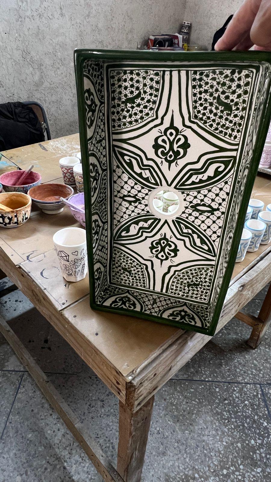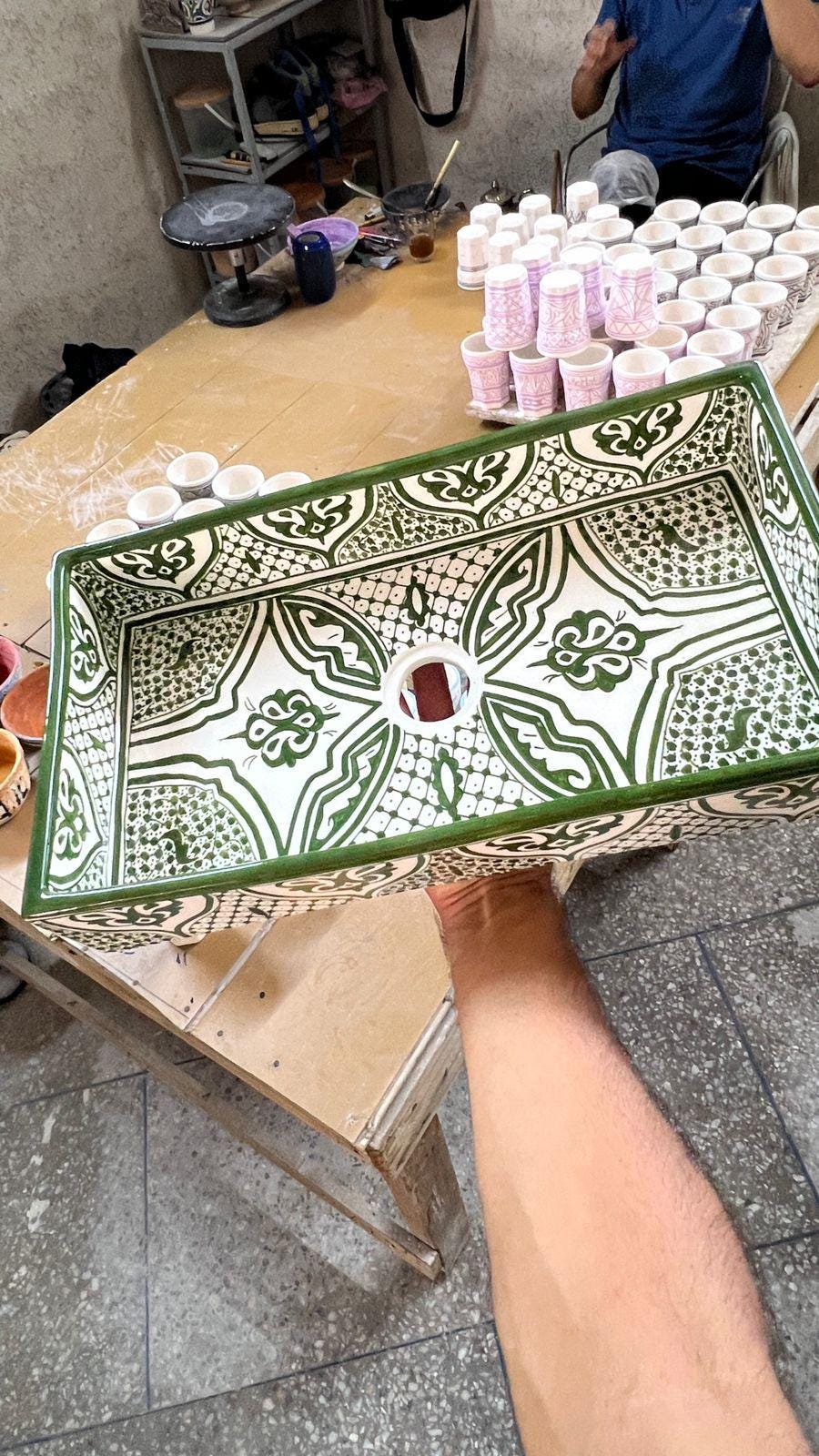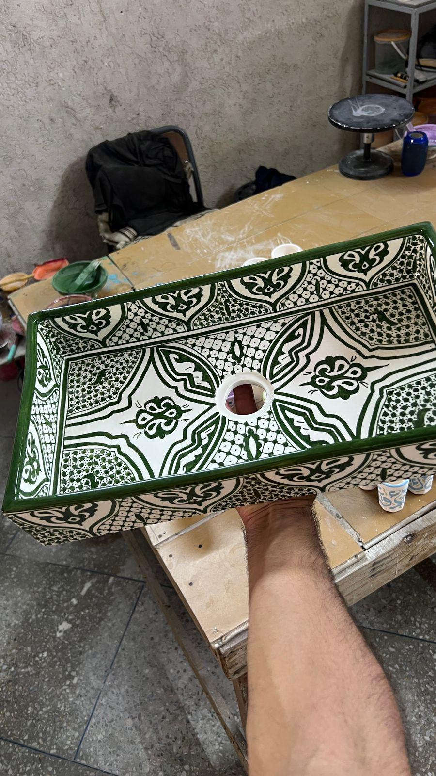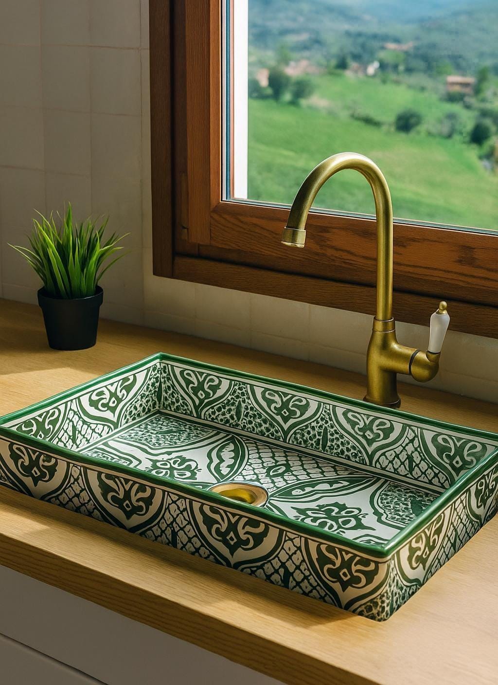 Handmade Moroccan Ceramic Sink: Rectangular Orchid Design, Olive Green, Free Drain