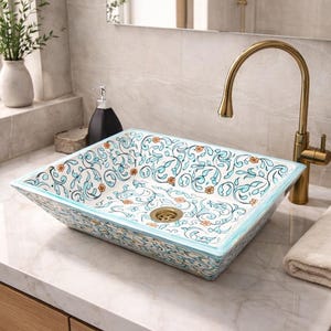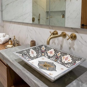 This beautiful Moroccan rectangular sink is handmade by skilled artisans using high-quality ceramic. Featuring traditional hand-painted designs and a smooth glazed finish, it is both durable and easy to clean. Perfect for kitchens, bathrooms, or powder rooms, it adds a unique touch of Moroccan charm to any space. The sink comes with both silver and copper drains included for free. If you need a different size, feel free to contact us.