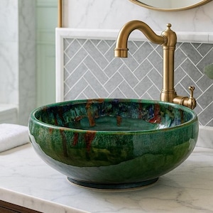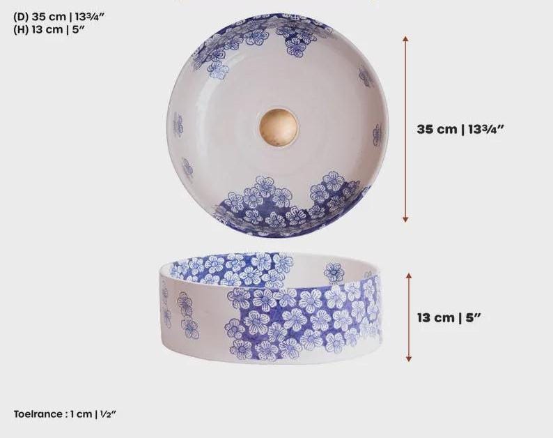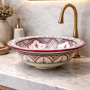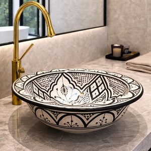 This beautiful Moroccan round ceramic sink is handcrafted by skilled artisans in Fes, made from high-quality clay, and features intricate hand-painted designs with a smooth glazed finish. Made from high-quality ceramic, it is durable, easy to clean, and perfect for bathrooms, kitchens, or powder rooms. Its timeless design adds a touch of Moroccan elegance to any space. The sink comes with both silver and copper drains included for free. Each piece is truly unique, and as a result, minor imperfections are to be expected. If you need a different size, feel free to contact us.