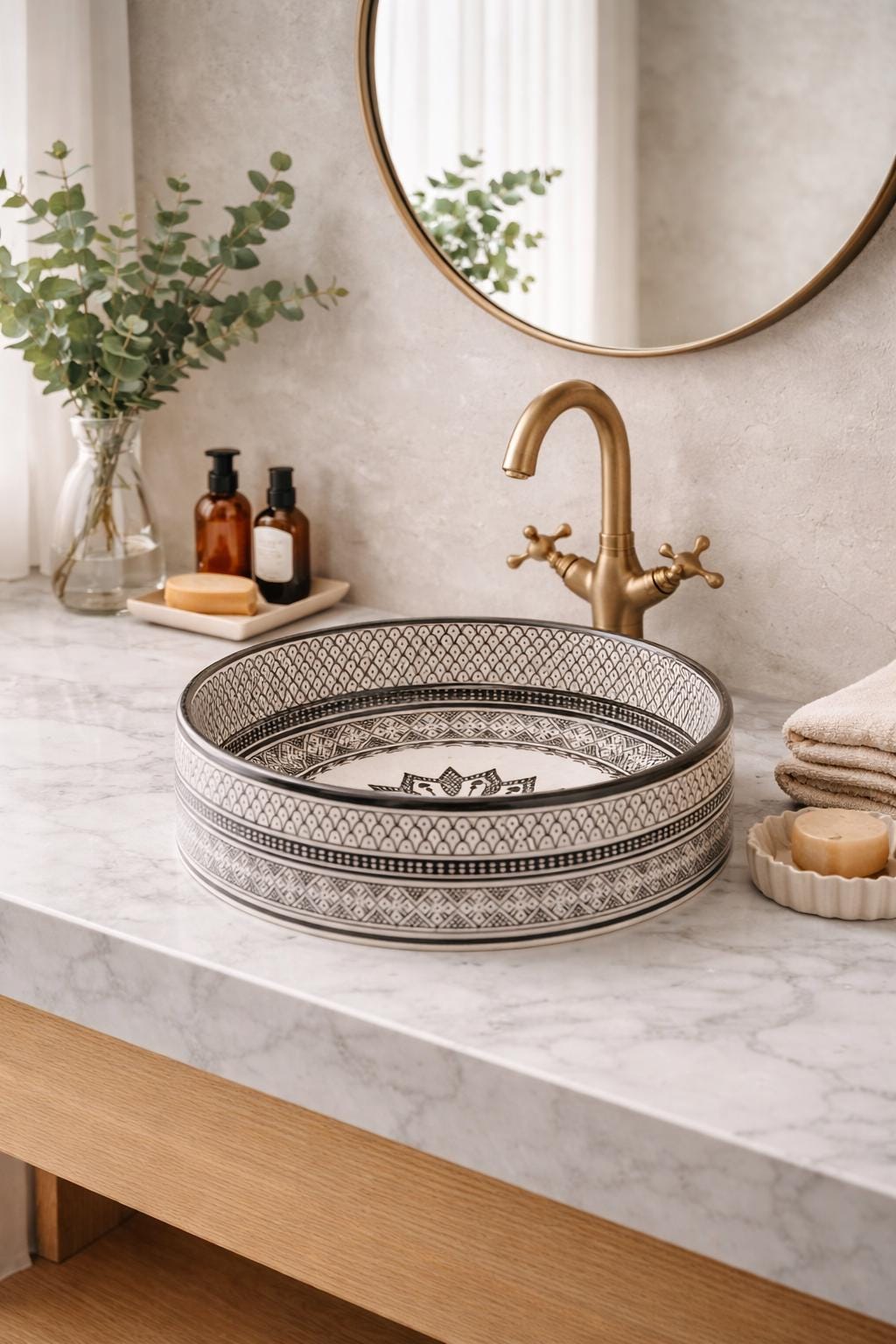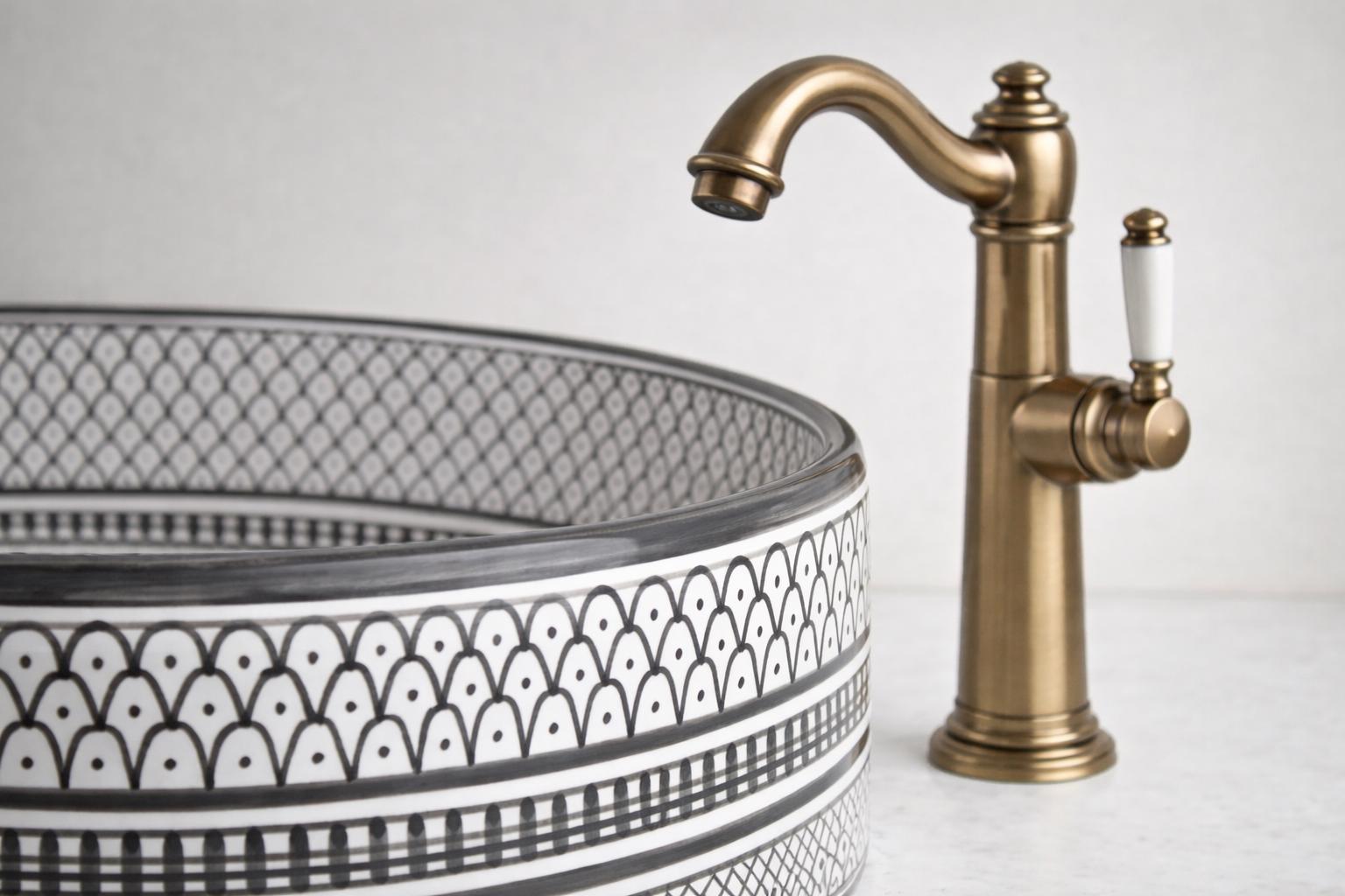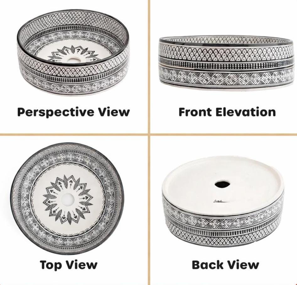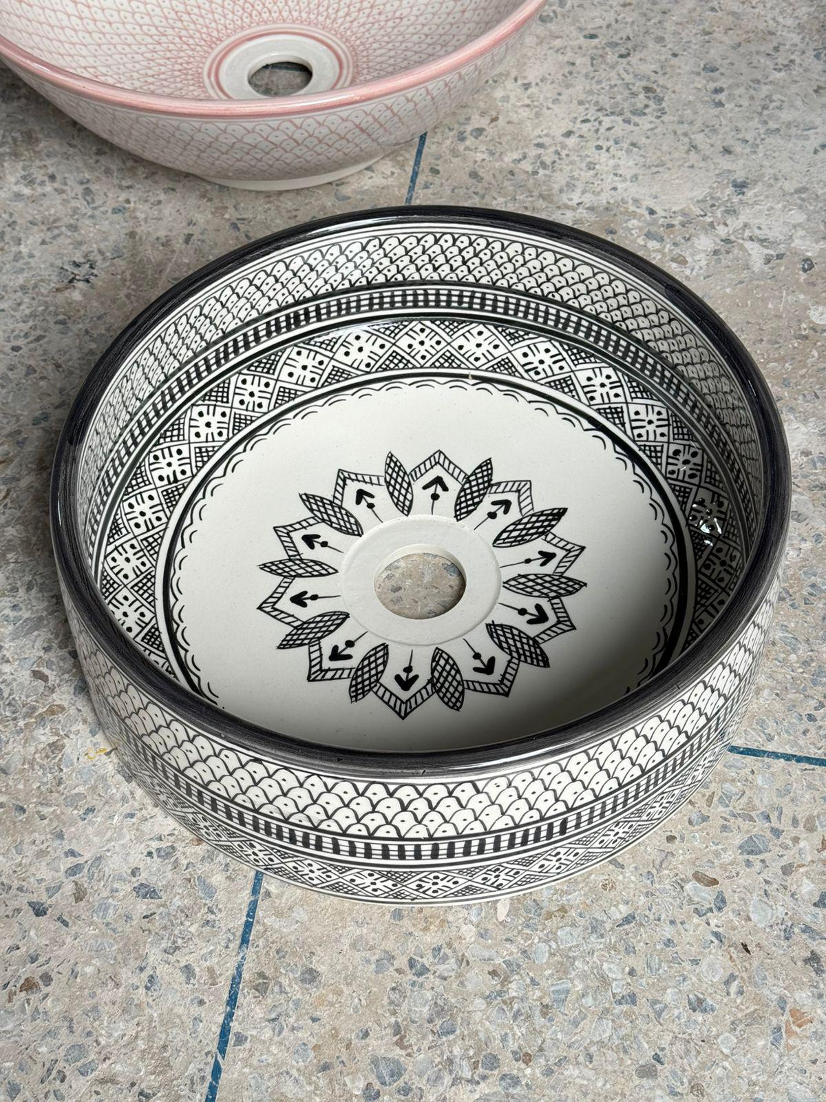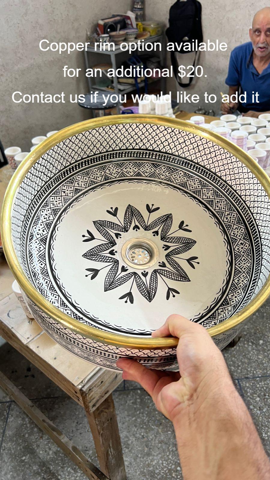 This beautiful Moroccan round ceramic sink is handcrafted by skilled artisans in Fes, made from high-quality clay, and features intricate hand-painted designs with a smooth glazed finish. Made from high-quality ceramic, it is durable, easy to clean, and perfect for bathrooms, kitchens, or powder rooms. Its timeless design adds a touch of Moroccan elegance to any space. The sink comes with both silver and copper drains included for free. Each piece is truly unique, and as a result, minor imperfections are to be expected. If you need a different size, feel free to contact us.