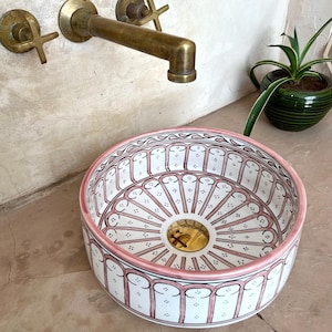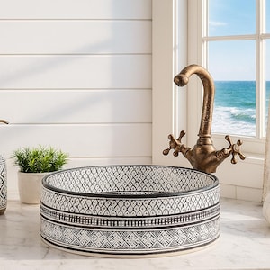 This beautiful Moroccan round ceramic sink is handcrafted by skilled artisans in Fes, made from high-quality clay, and features intricate hand-painted designs with a smooth glazed finish. Made from high-quality ceramic, it is durable, easy to clean, and perfect for bathrooms, kitchens, or powder rooms. Its timeless design adds a touch of Moroccan elegance to any space. The sink comes with both silver and copper drains included for free. Each piece is truly unique, and as a result, minor imperfections are to be expected. If you need a different size, feel free to contact us.