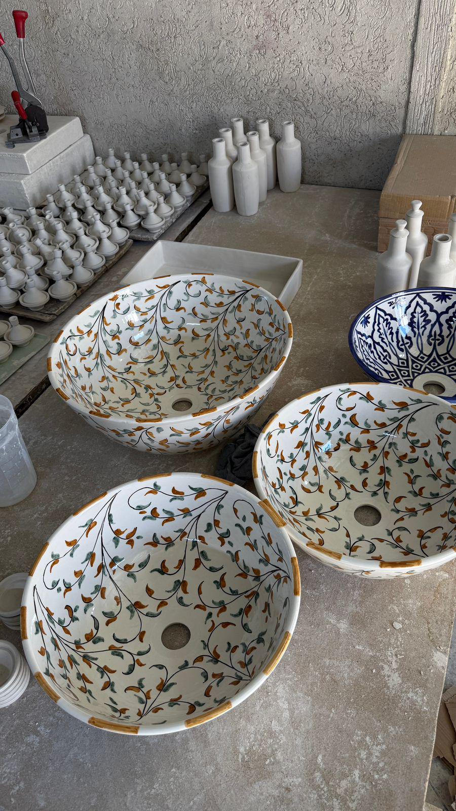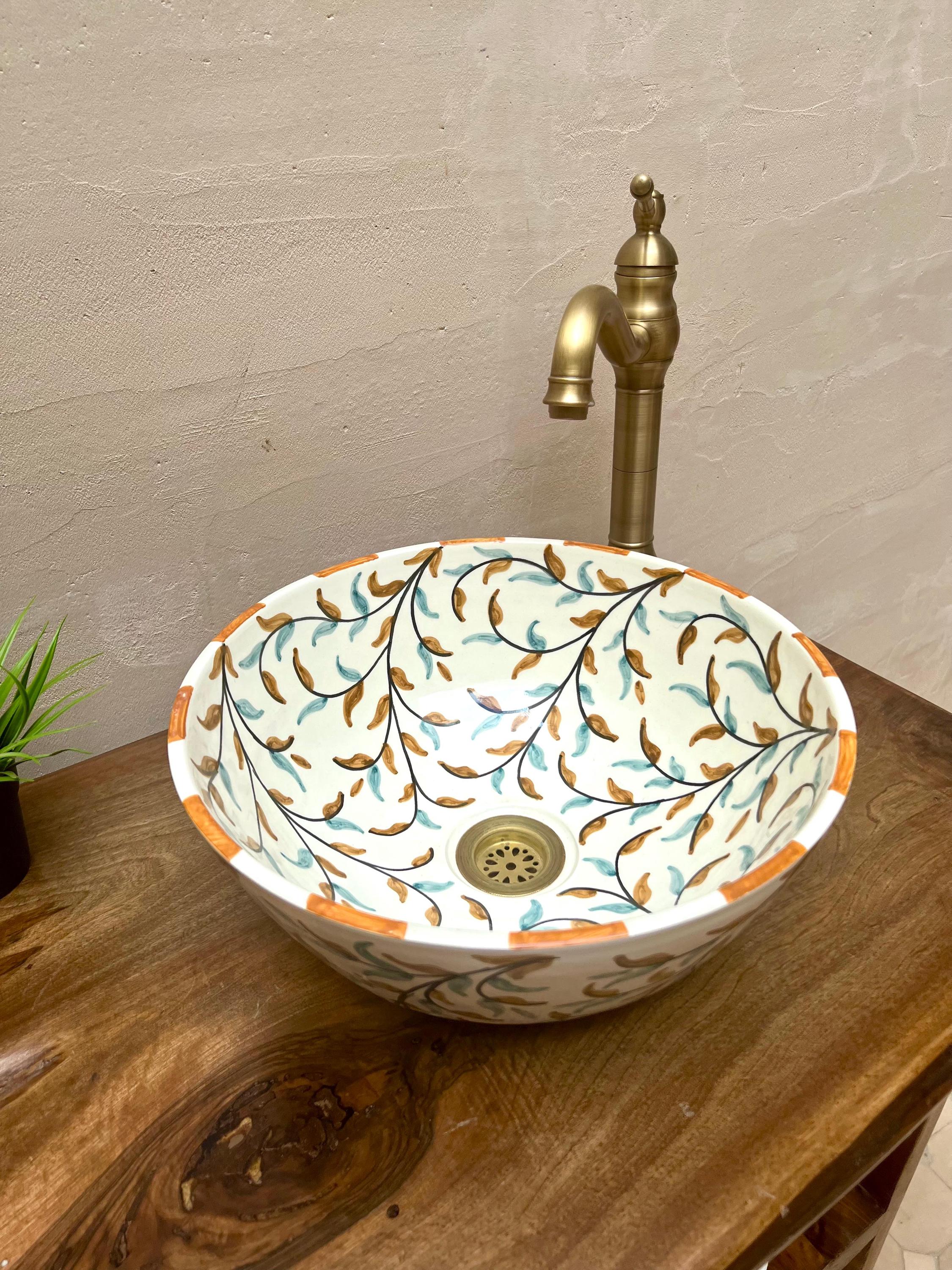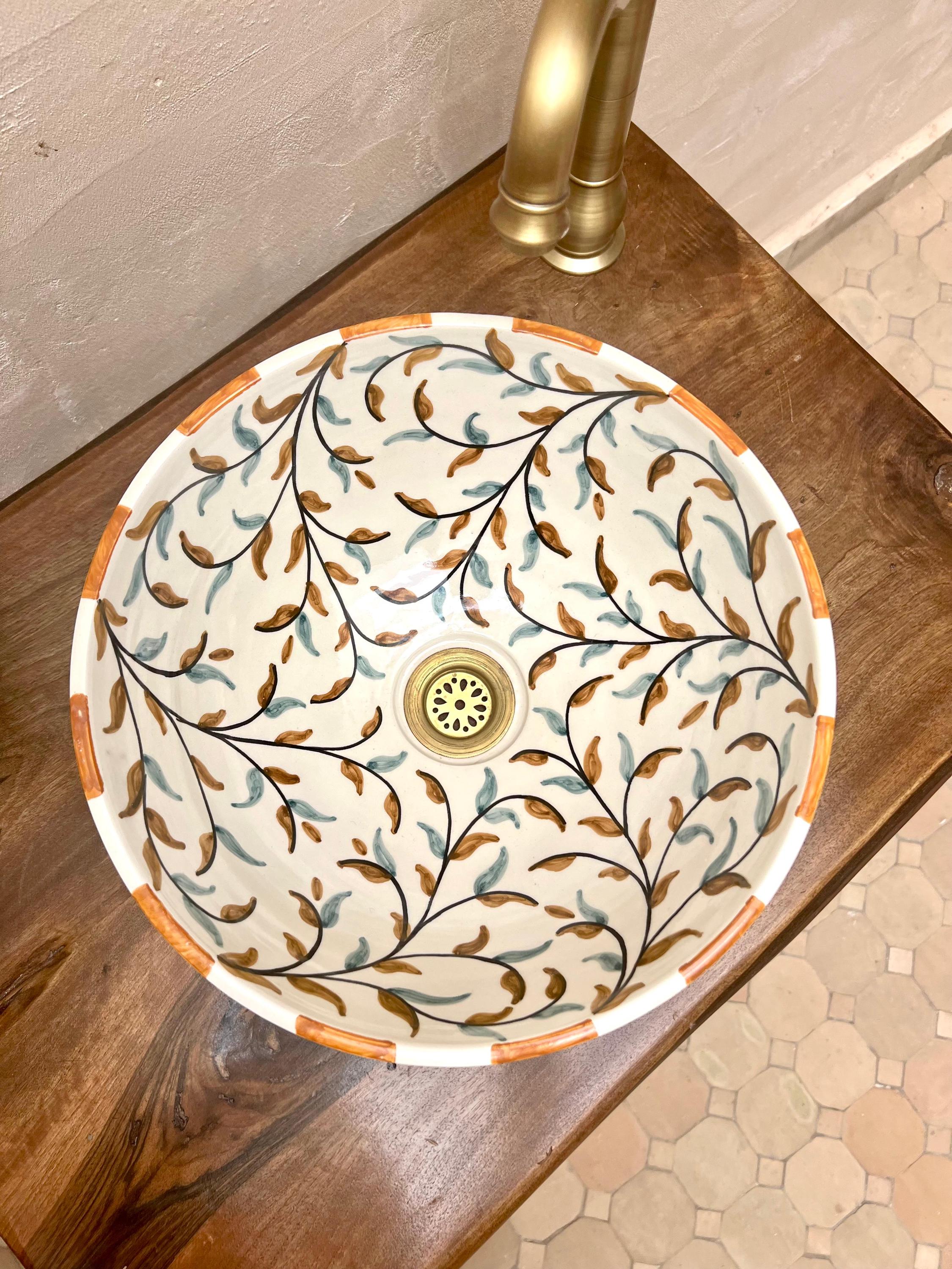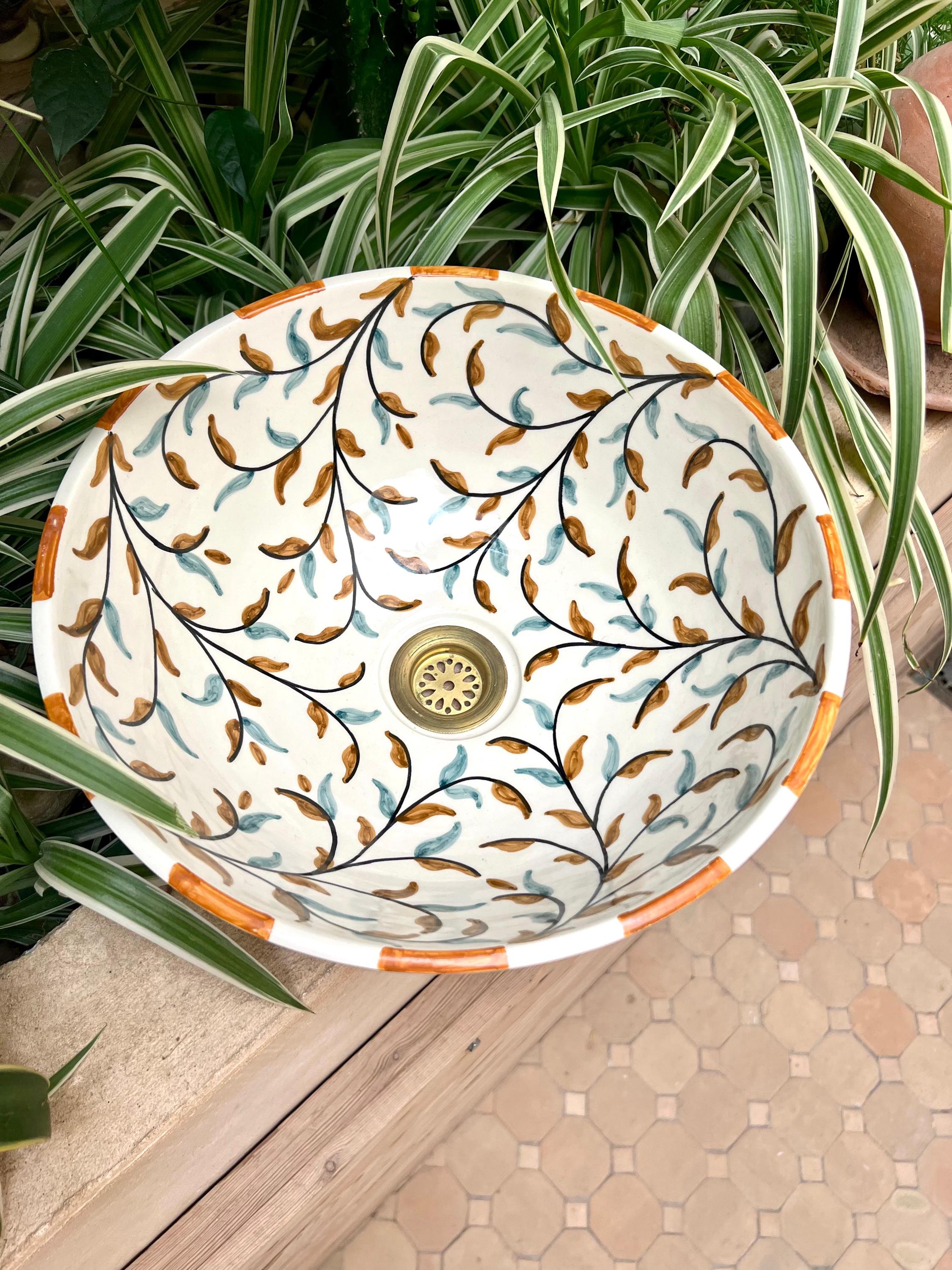 Handmade Moroccan Ceramic Sink: Soft Beige Leaf Design