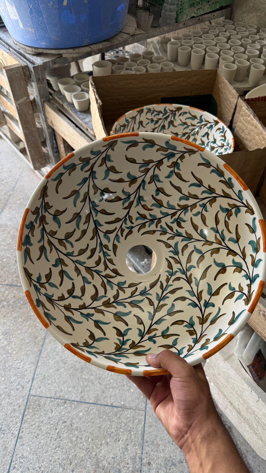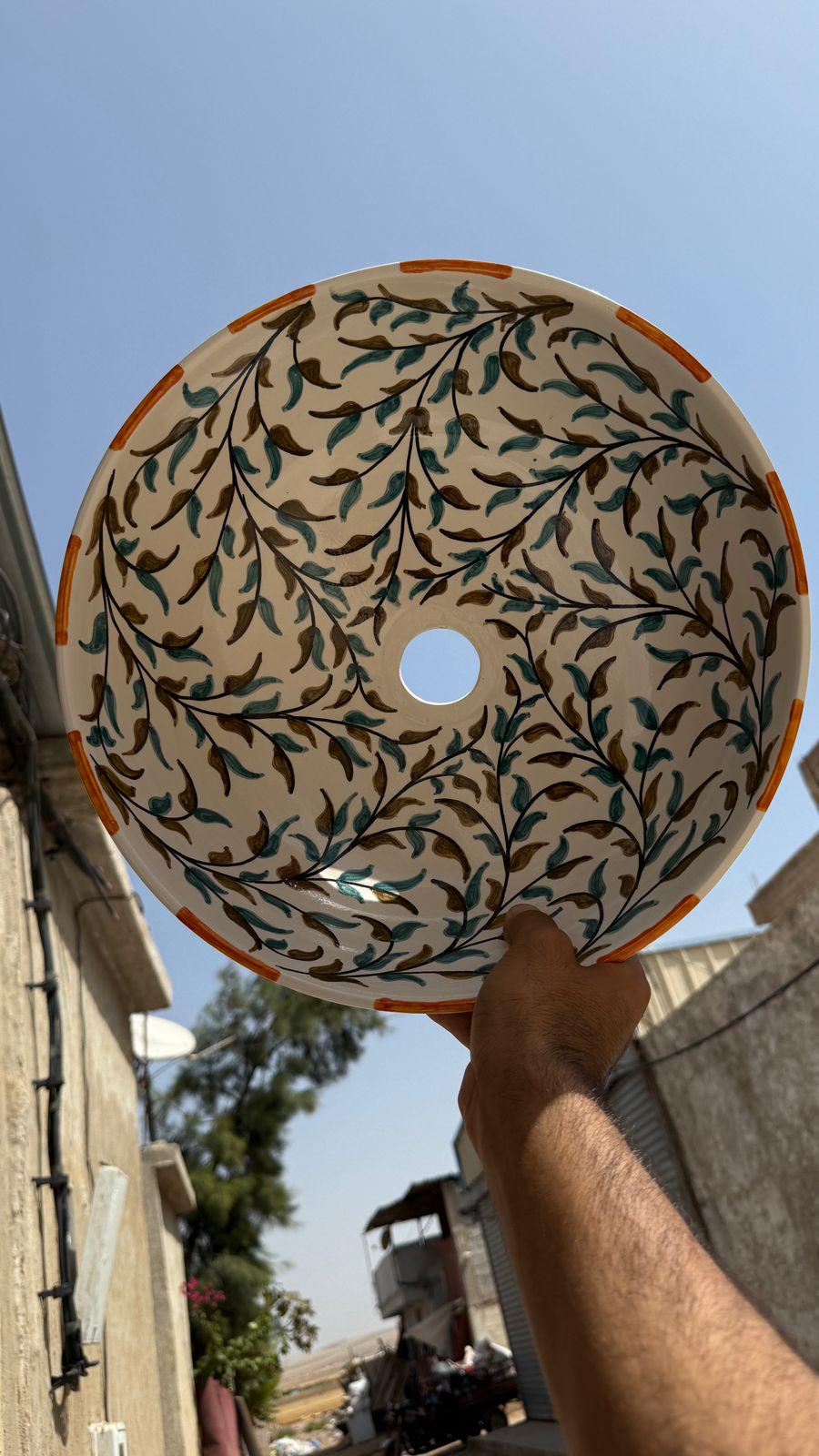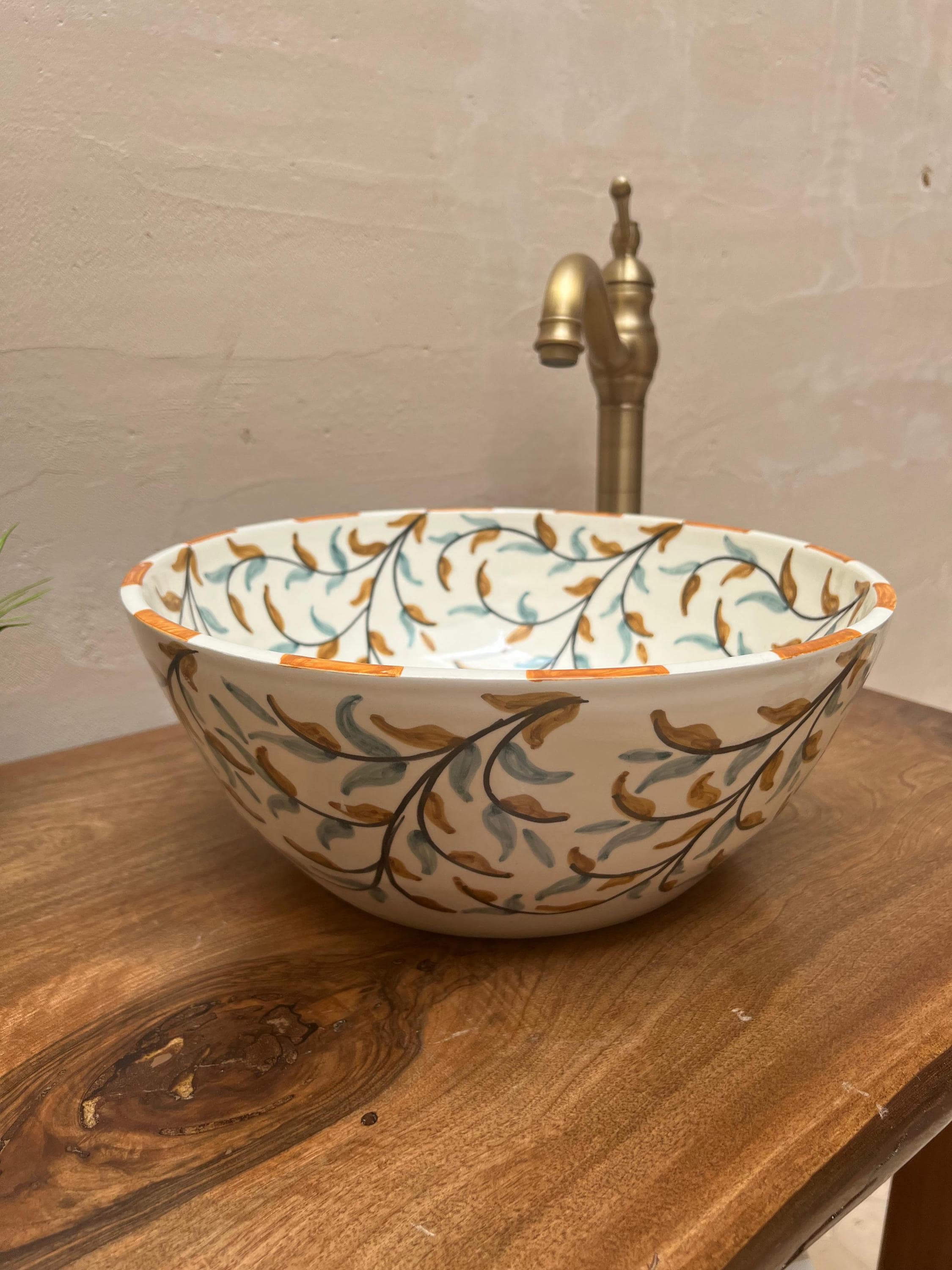 Handmade Moroccan Ceramic Sink: Soft Beige Leaf Design