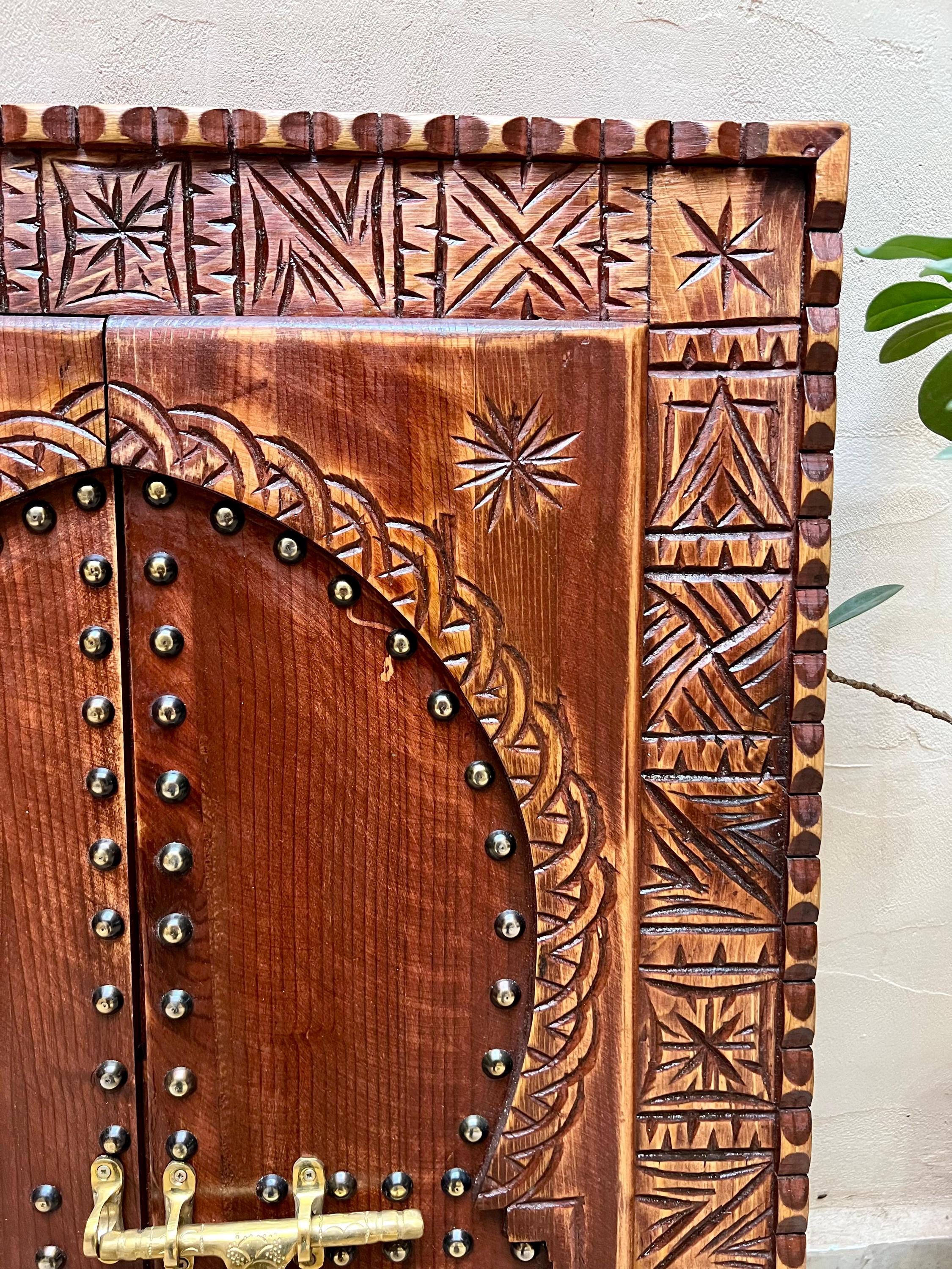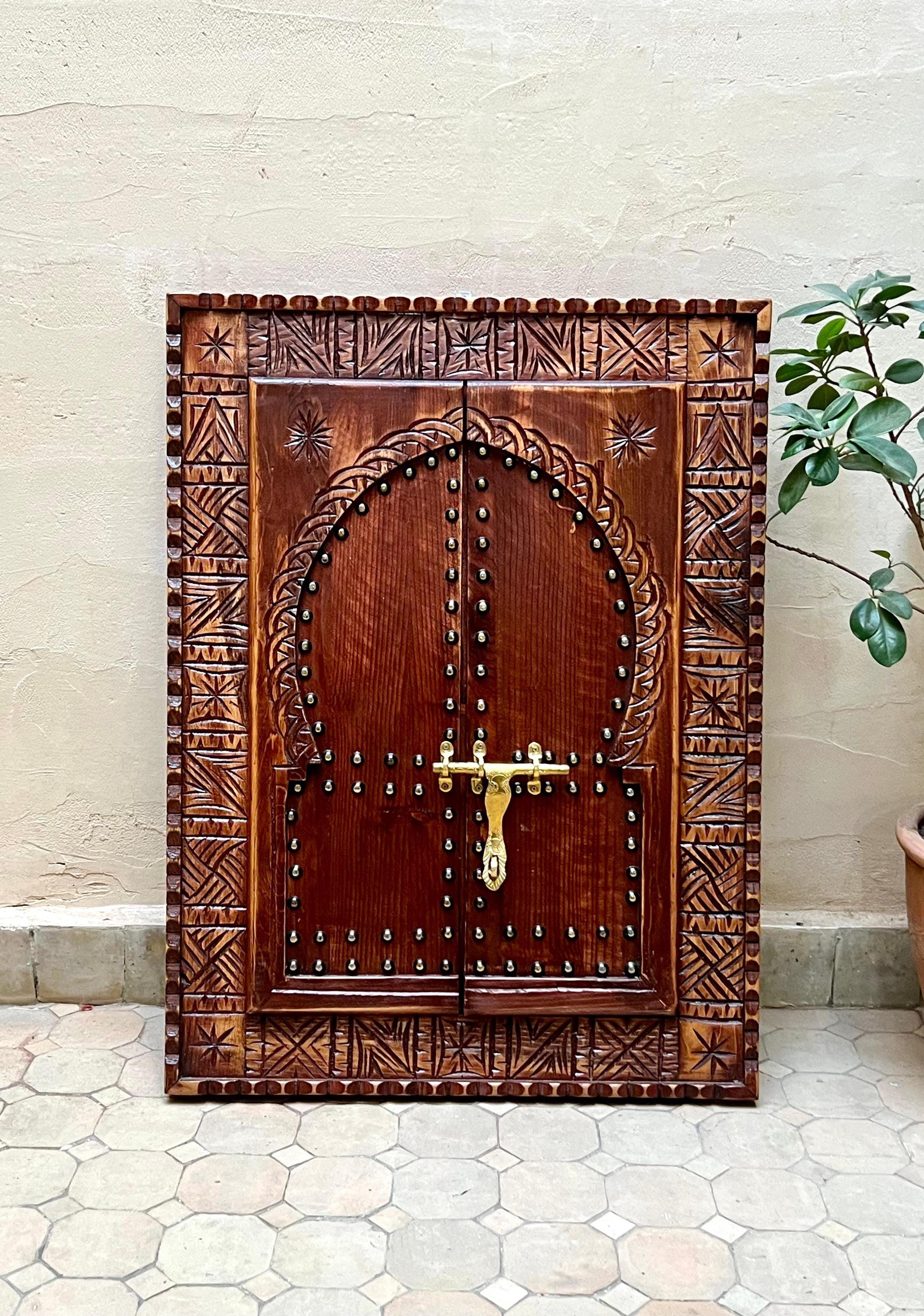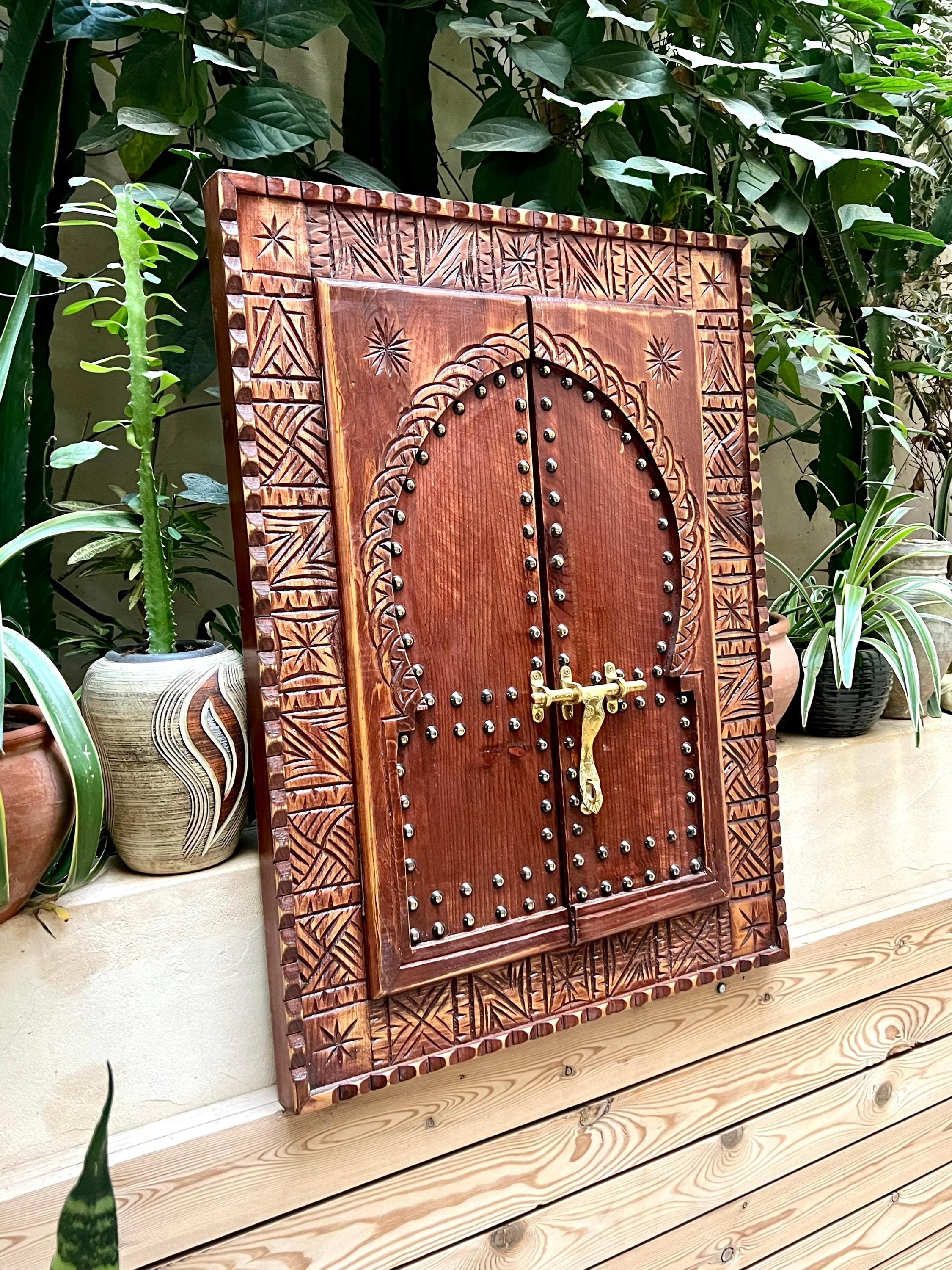 Bring an authentic touch of Moroccan craftsmanship into your home with this handmade cedar wood window frame, intricately carved and decorated by skilled artisans. Featuring a classic Moorish arched door design with brass studs, this unique piece is both functional and decorative. • Available in 3 Sizes: • Small: 45 x 35 cm (17.7” x 13.7”) • Medium: 50 x 60 cm (19.6” x 23.6”) • Large: 60 x 80 cm (23.6” x 31.5”) • 3 Color Options: Natural Cedar, Walnut Brown, or Dark Mahogany (custom colors available upon request) • Functional Design: The doors open at the center, offering the possibility to customize the inside with: • A mirror • A photo frame • A decorative art piece • Or leave it as is, for a rustic, authentic look • Ready to Hang: Comes with a hook on the back for easy wall mounting. • Customizable: Personal engraving or special size requests are available upon order.