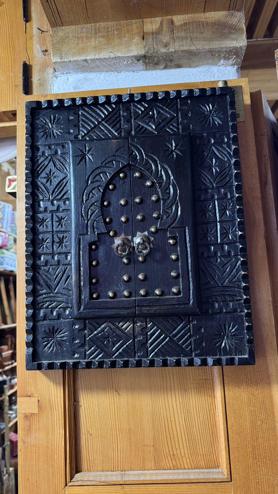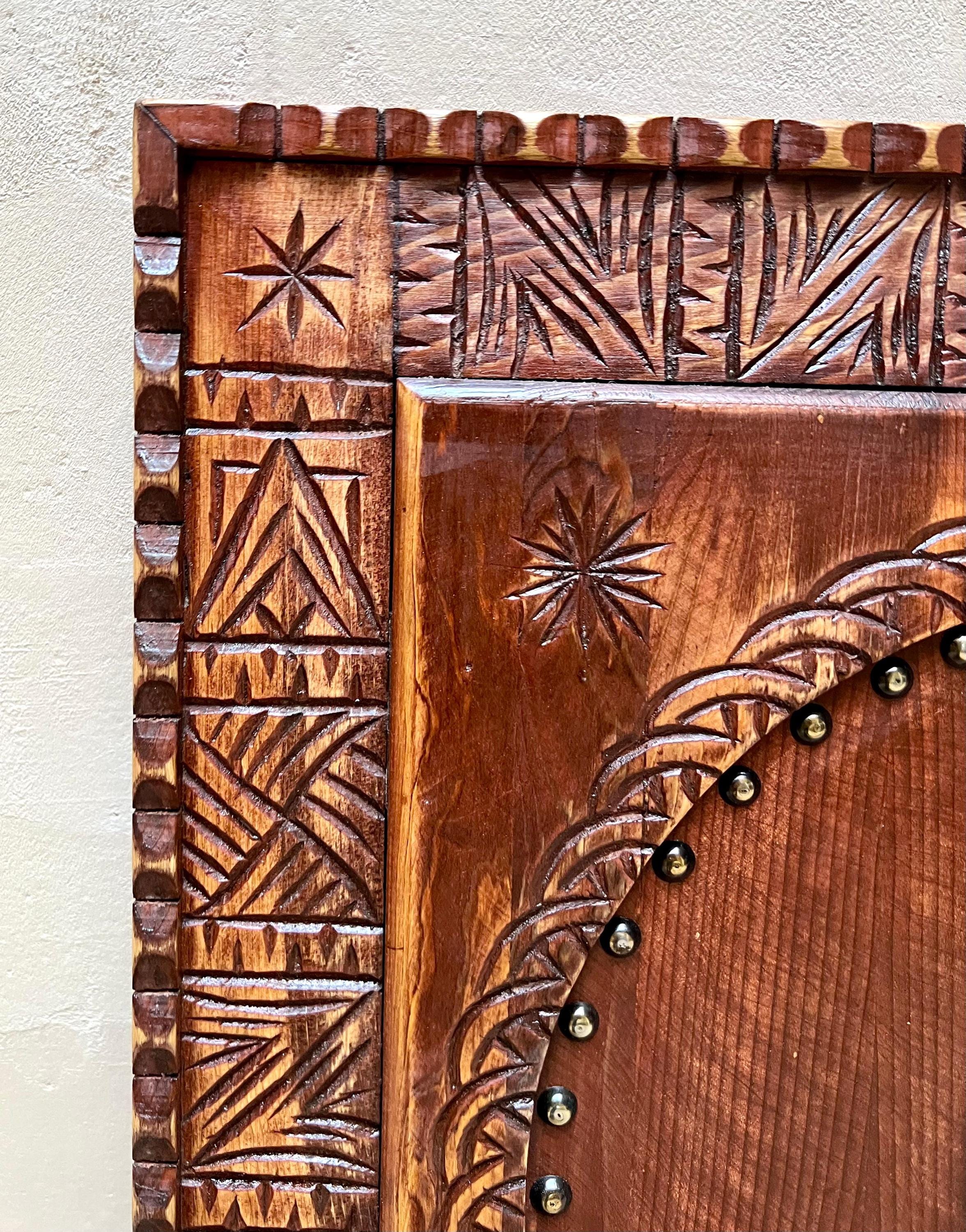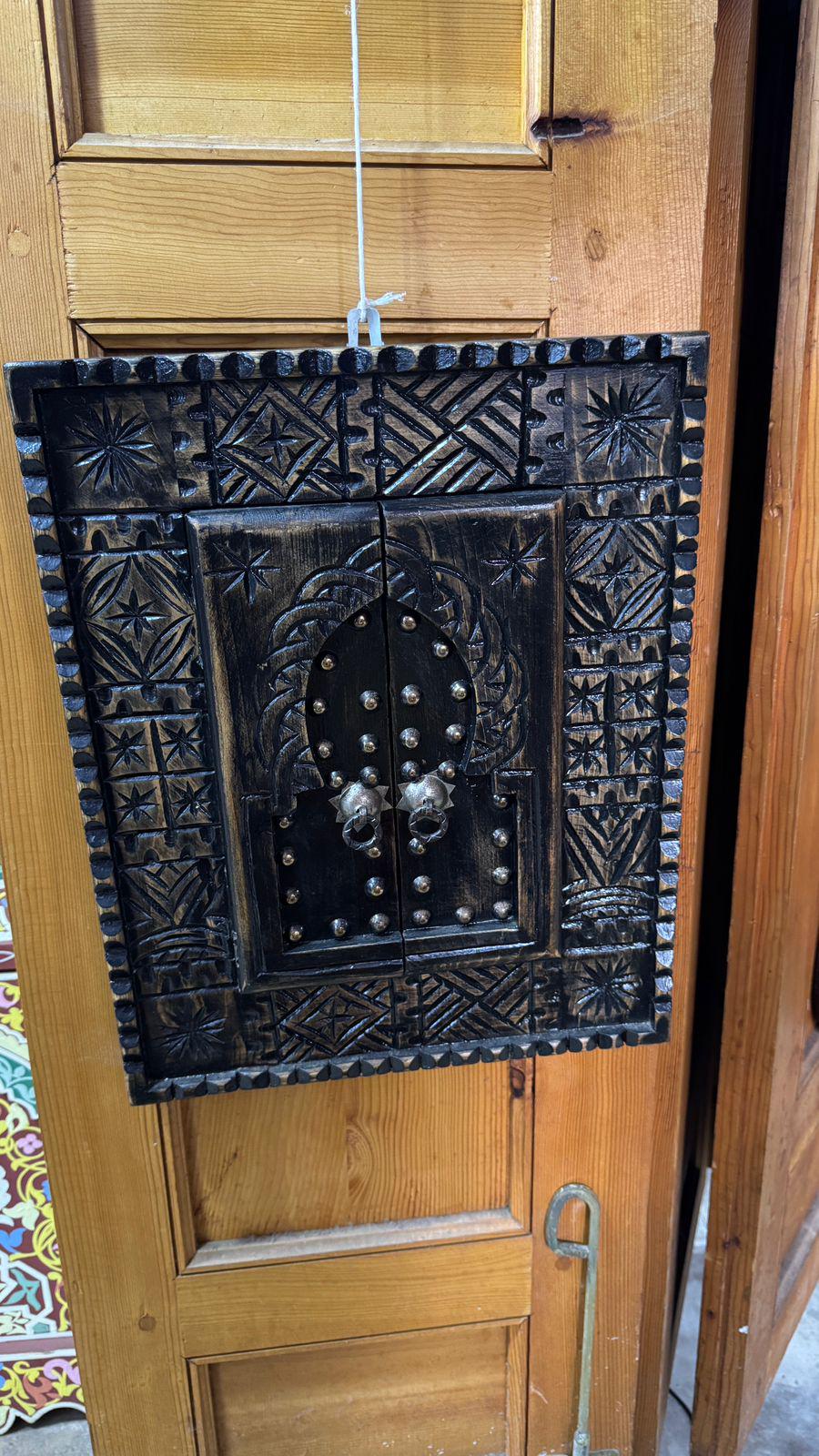 Bring an authentic touch of Moroccan craftsmanship into your home with this handmade cedar wood window frame, intricately carved and decorated by skilled artisans. Featuring a classic Moorish arched door design with brass studs, this unique piece is both functional and decorative. • Available in 3 Sizes: • Small: 45 x 35 cm (17.7” x 13.7”) • Medium: 50 x 60 cm (19.6” x 23.6”) • Large: 60 x 80 cm (23.6” x 31.5”) • 3 Color Options: Natural Cedar, Walnut Brown, or Dark Mahogany (custom colors available upon request) • Functional Design: The doors open at the center, offering the possibility to customize the inside with: • A mirror • A photo frame • A decorative art piece • Or leave it as is, for a rustic, authentic look • Ready to Hang: Comes with a hook on the back for easy wall mounting. • Customizable: Personal engraving or special size requests are available upon order.